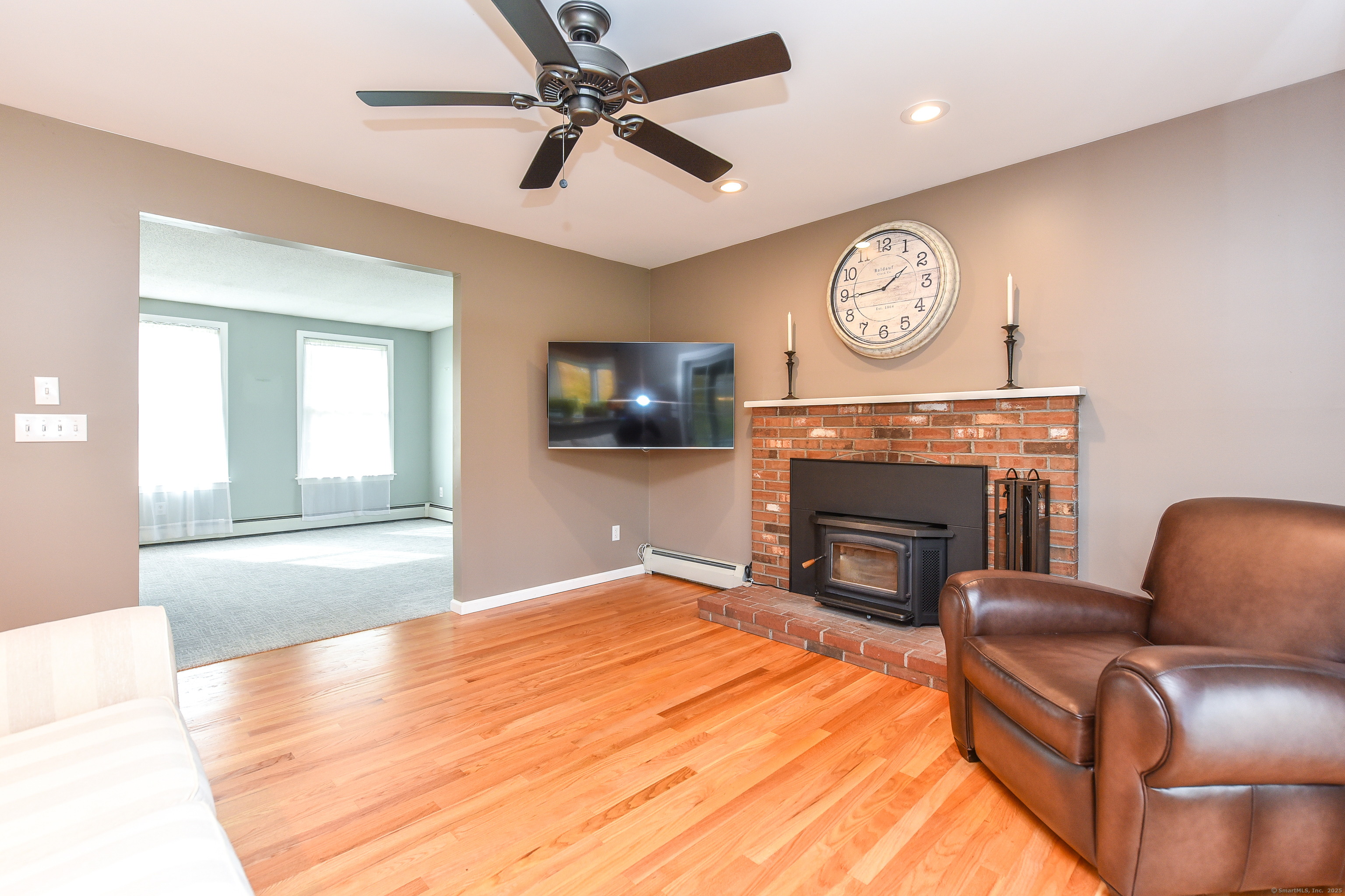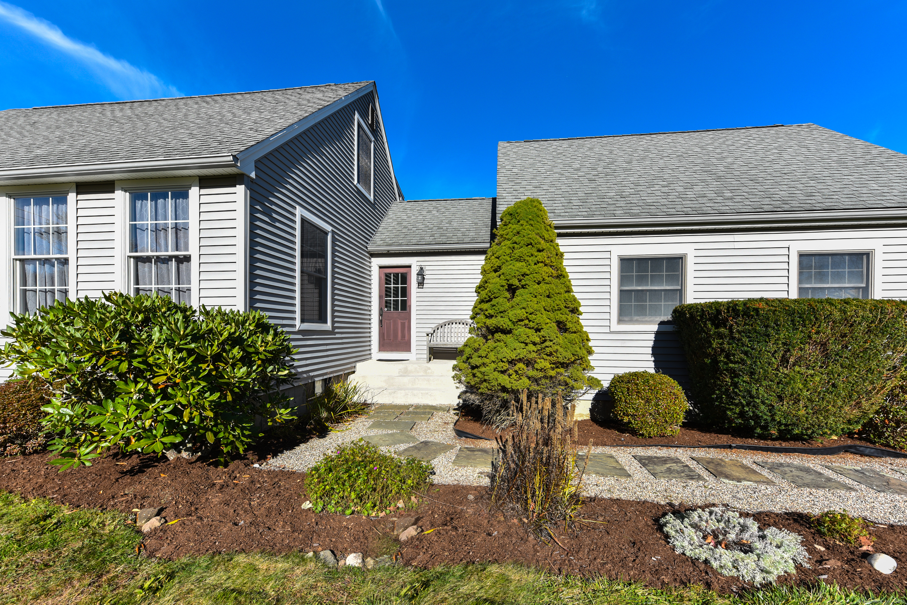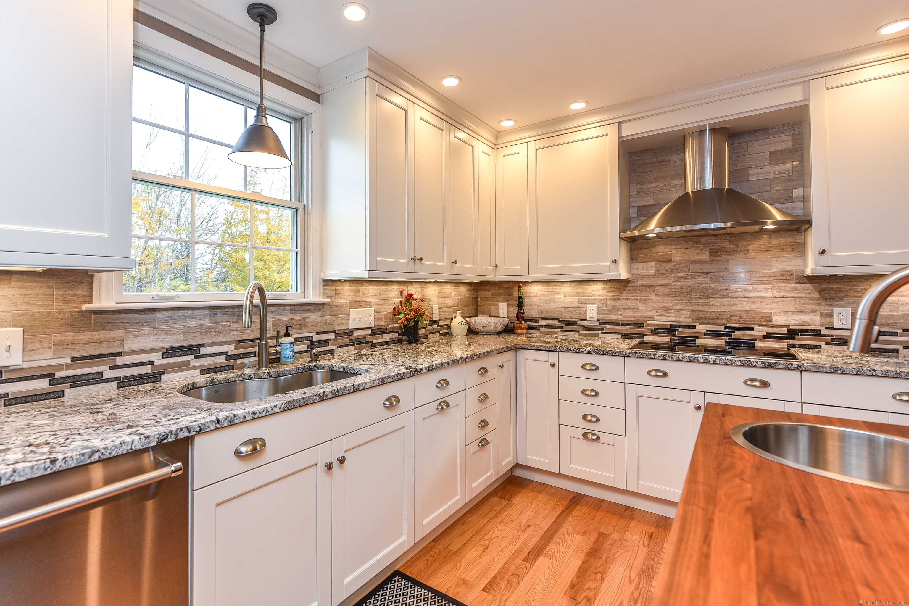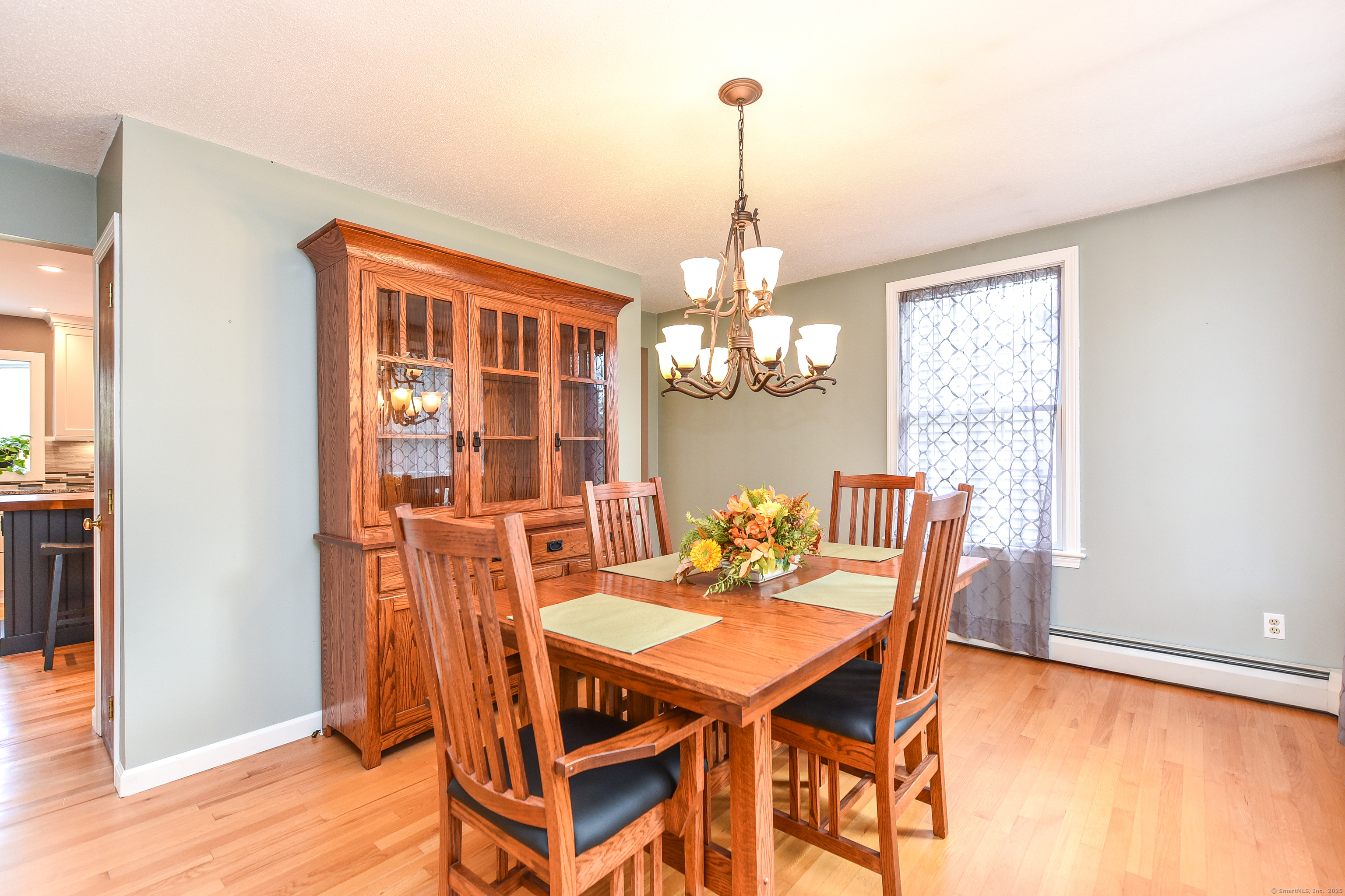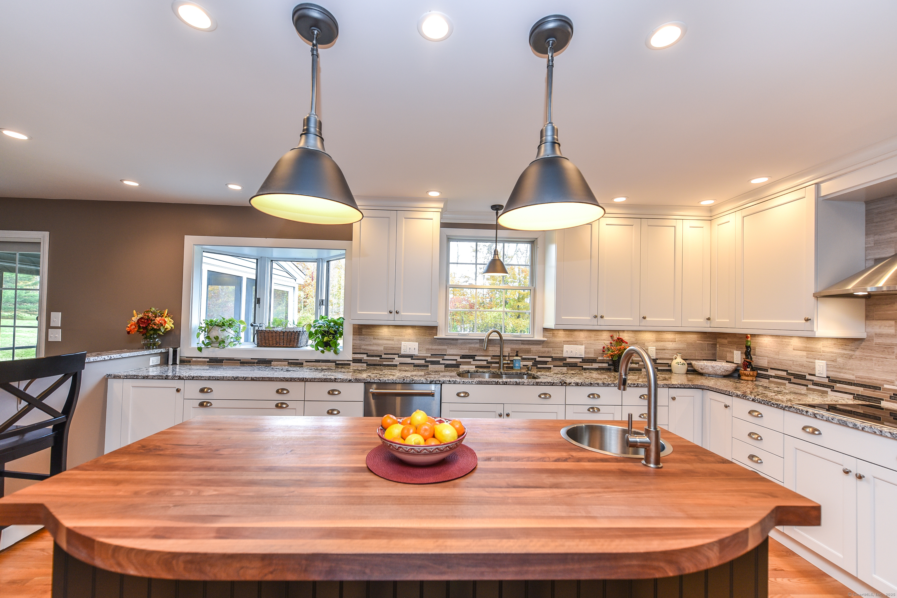 Beautifully maintained Cape set on a wide, open .93-acre lot with a private tree-lined backdrop offering both sun and seclusion. This updated home features a stunning custom kitchen with granite countertops, butcher block island, stainless appliances, tile backsplash, and abundant cabinetry, opening into a bright dining area with hardwood floors. The family room is open to the kitchen with a wood-burning stove insert for added warmth and comfort. Sliders lead to a screened porch overlooking the expansive backyard and is perfect for outdoor dining. The upper level offers three well-sized bedrooms and an updated full bath, while the main floor includes a convenient half bath and laundry. Additional highlights include a 2-car attached garage, garden shed/outbuilding for storage or hobby space, generator-ready panel, thermopane windows, and excellent natural light throughout. The grounds are beautifully manicured, ideal for gardening, play, or outdoor entertaining. Located in a peaceful rural setting with easy access to Barkhamsted recreation areas, reservoirs, and major routes. Move-in ready and a wonderful blend of comfort, space, and New England character.