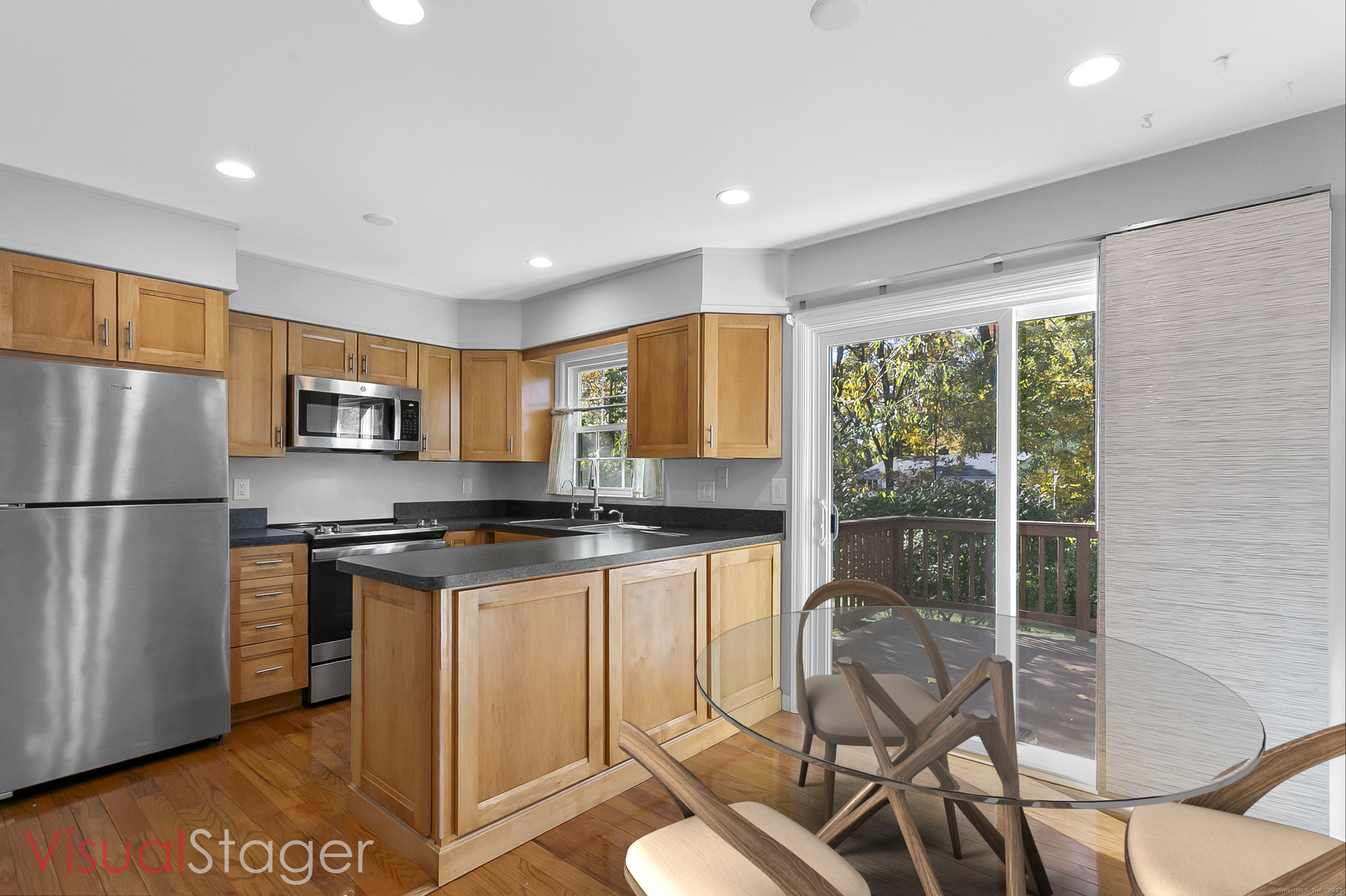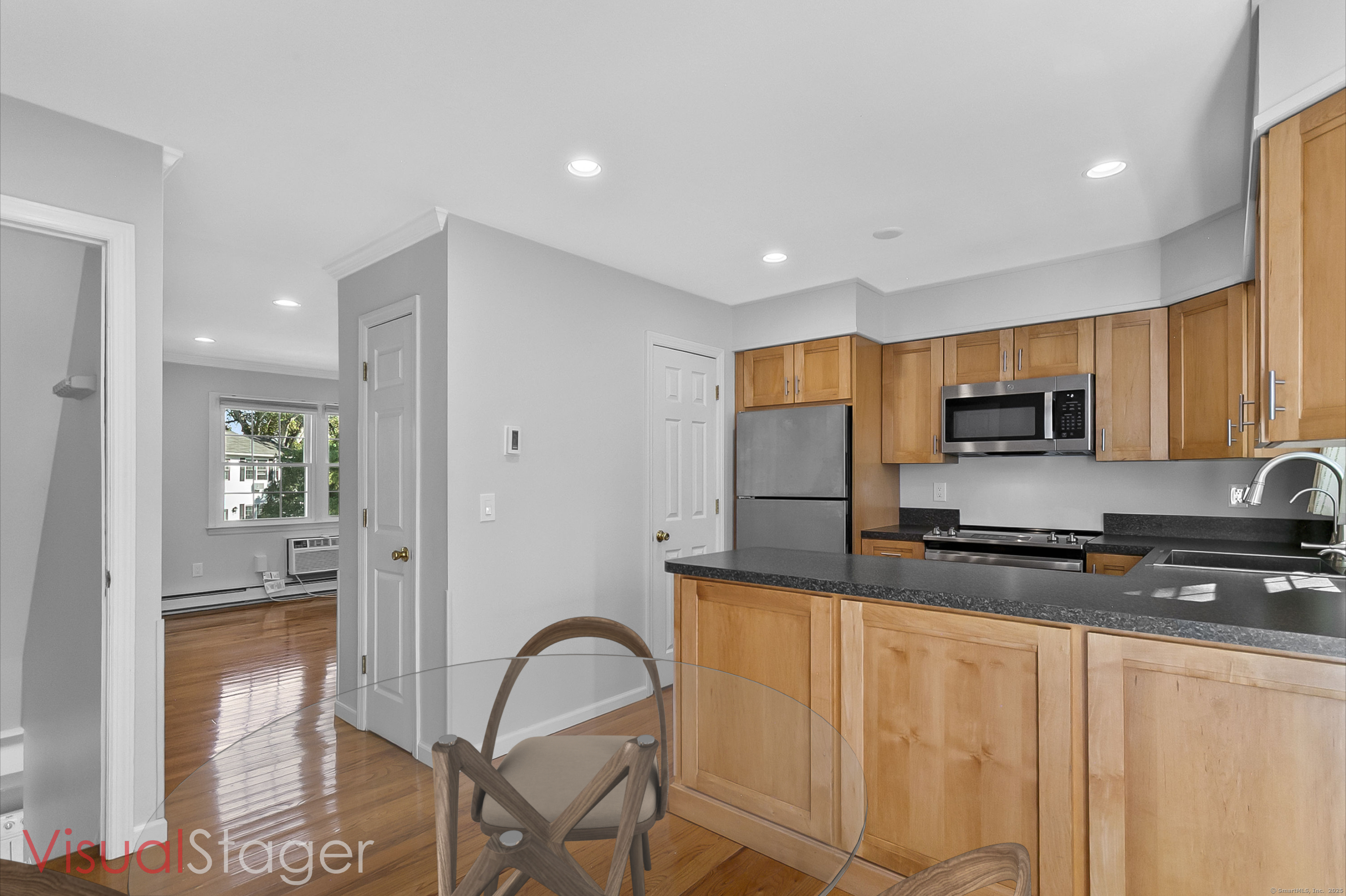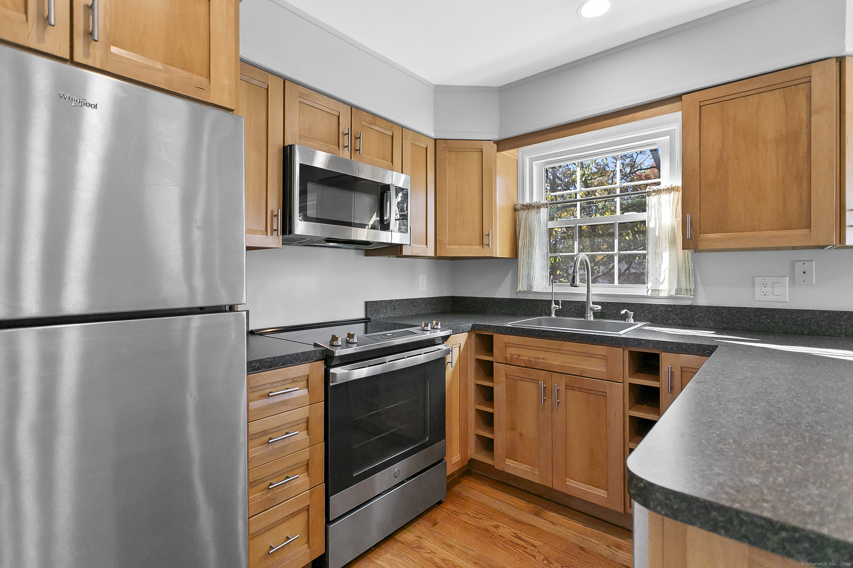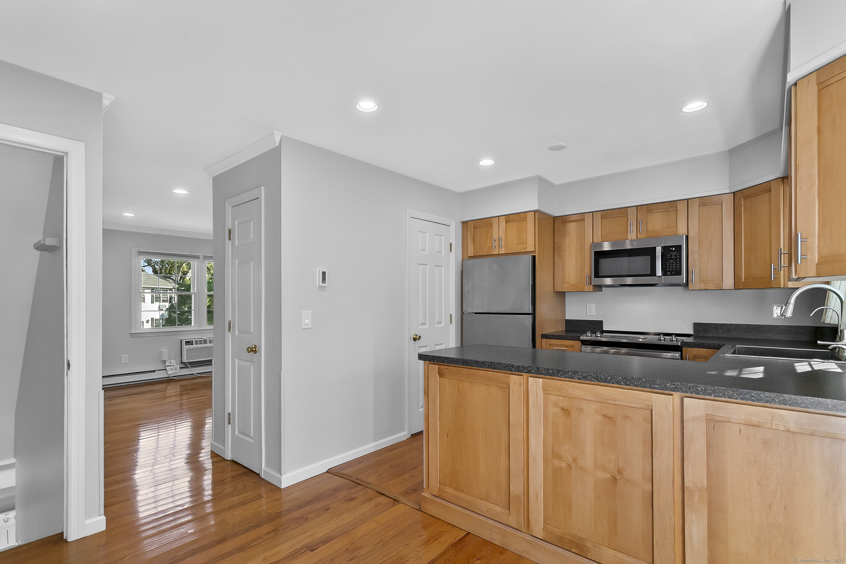 Welcome to 12 Camelot Drive, Unit B1 in desirable Norwalk. This lovely townhouse in a well maintained complex is tucked away in a peaceful residential neighborhood, and offers the space, layout and features for what a savy buyer is looking for today. Perched on a hill, the end unit features a renovated eat-in kitchen with shaker style cabinets and newer stainless steel appliances that lead to a large deck to enjoy all of your outdoor entertaining needs and lovely backyard. Living room with gleaming hardwood floors and a half bath complete the first floor. Upstairs boasts two bedrooms and a renovated full bath. Need to work from home? An additional room, accessed thru the attached garage can accommodate your remote needs or use it as a media or playroom. Washer/dryer add to the perfection. Enjoy the community pool during the summer. This home combines comfort, convenience, and a serene setting. Make your home ownership dreams a reality and move right in!