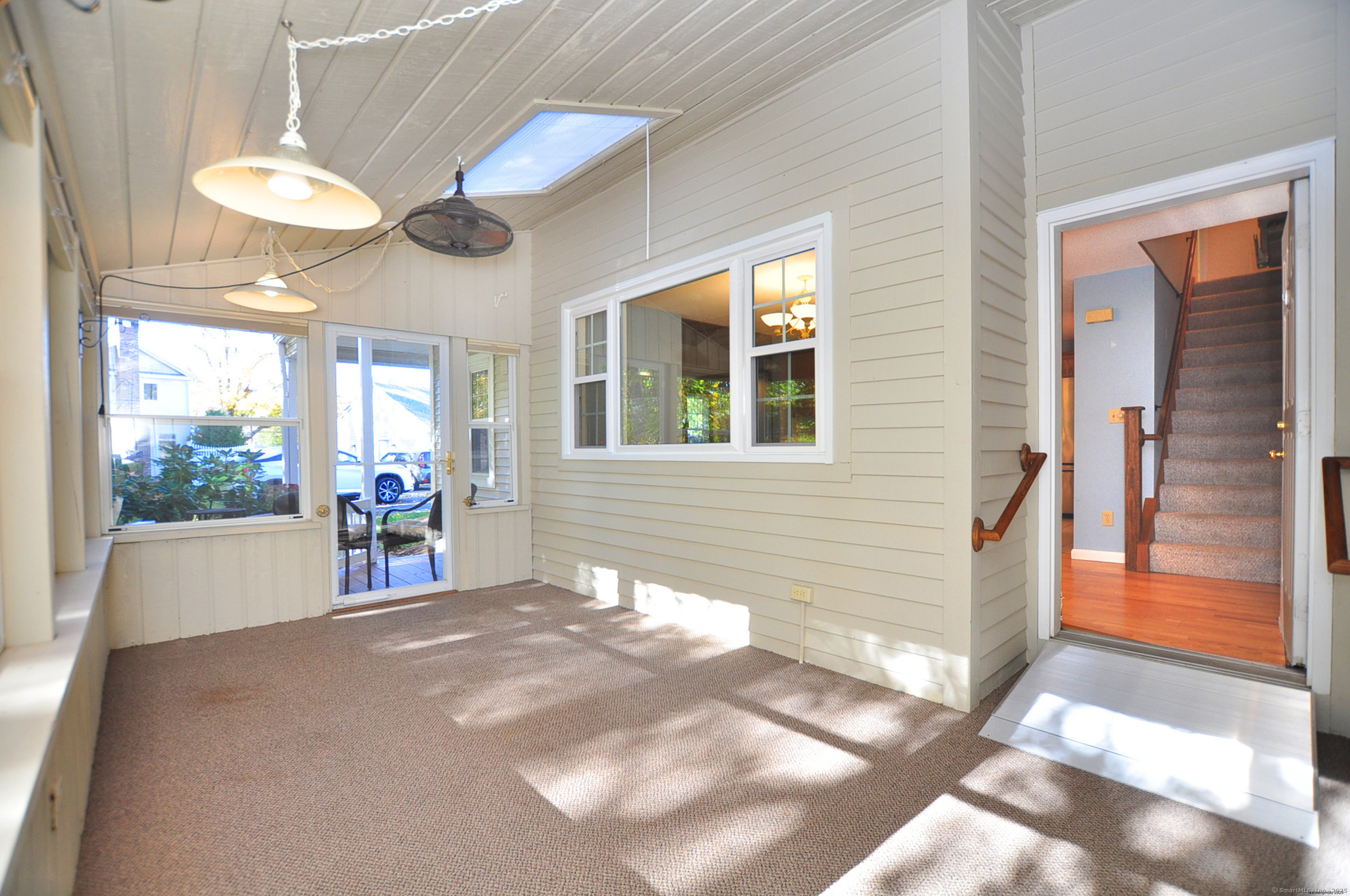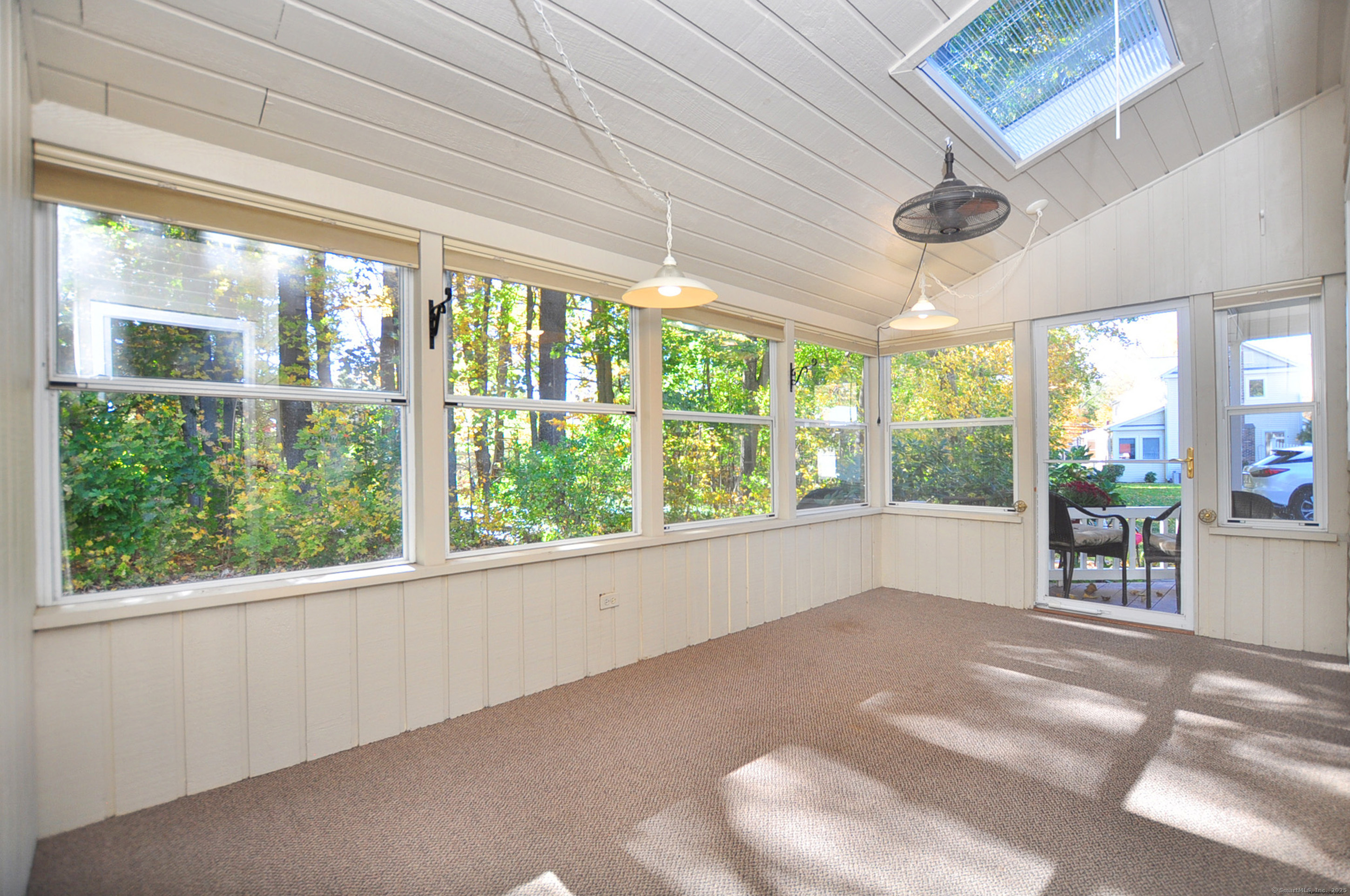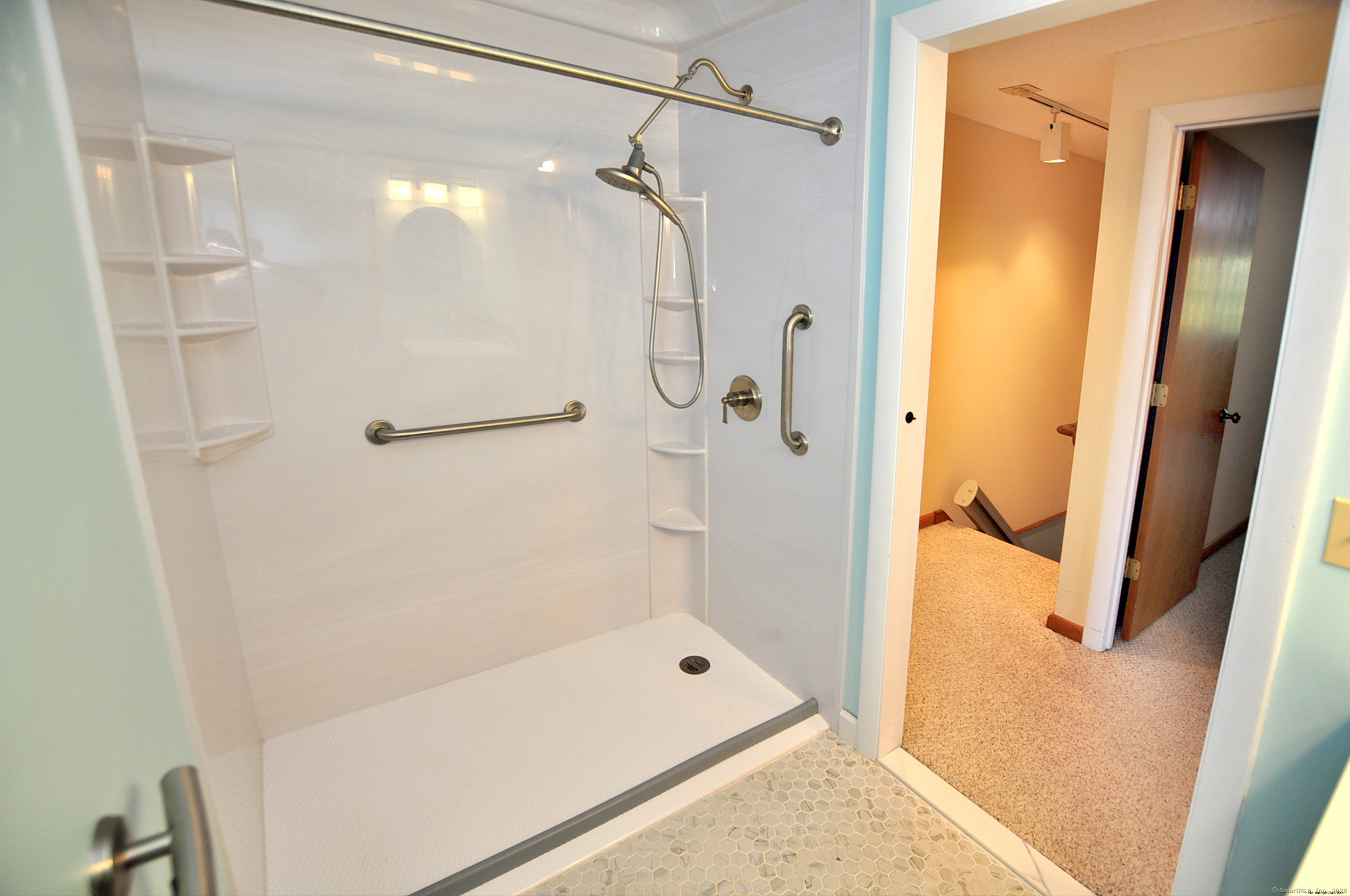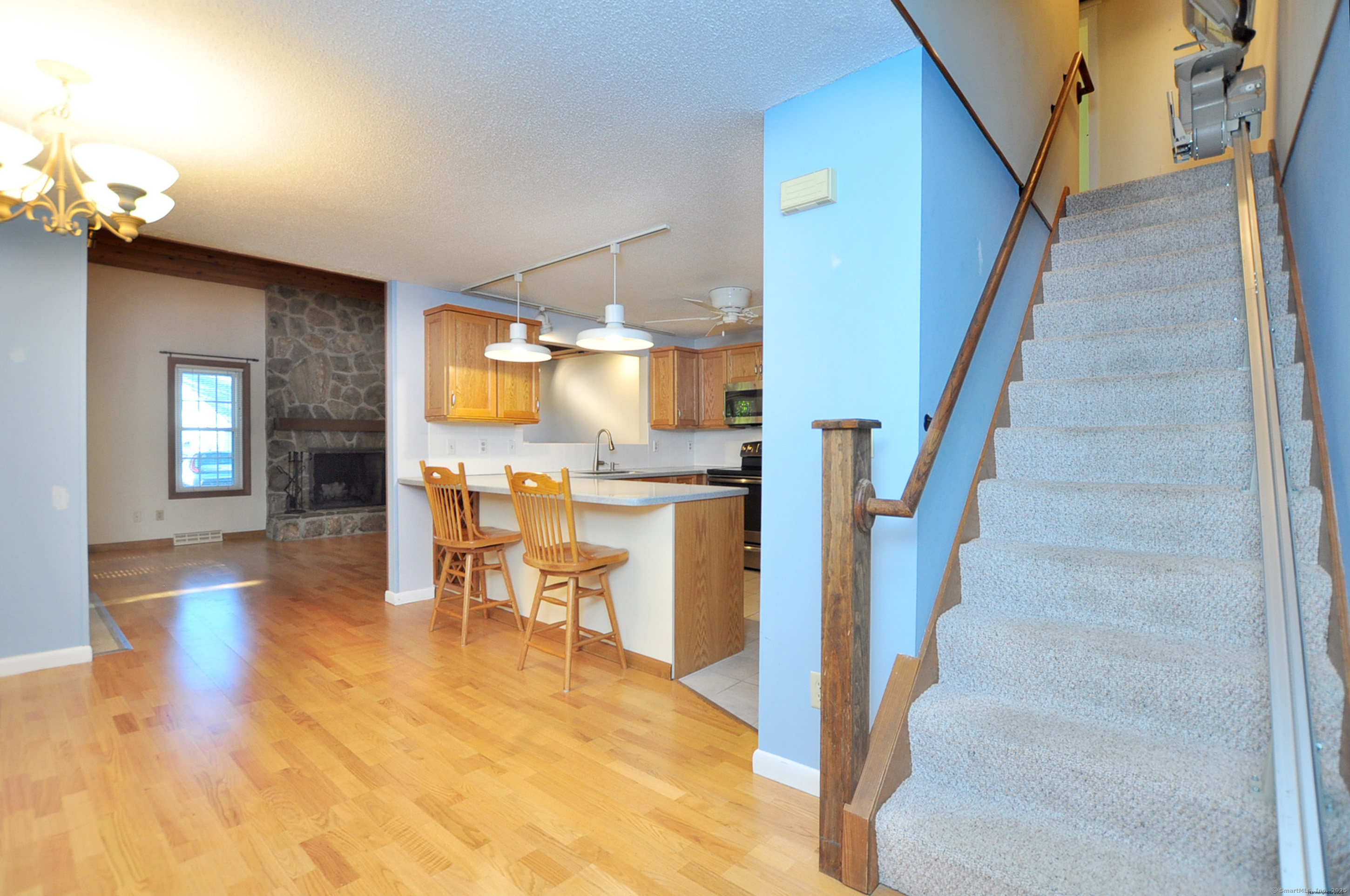 Move right in and be settled before the holidays! This beautifully maintained 2-bedroom, 21/2-bath townhouse offers the perfect blend of comfort, convenience, & care-free living. Enjoy an open floor plan featuring an updated eat-in kitchen with breakfast bar that opens to a spacious great room with fireplace & skylights, filling the space with natural light. Relax in the three-season screened porch overlooking a peaceful, tree-lined setting-perfect for morning coffee or evening unwinding. All bathrooms have been tastefully updated, with the second-floor guest bath featuring a roll-in shower for easy accessibility. The finished lower level offers versatile living space with built-ins, ideal for a family room, office, or guest area. Accessibility features include a mobility ramp in the garage, two Freedom/Lifeway mobility chair lifts (one to the upper level and one to the lower level), & grab bars for added support. Major updates provide peace of mind, including a new 275-gallon oil tank (2018), new furnace (2019), new A/C system (2019), and a new oil-fired hot water heater (2024). Additional improvements include replacement windows and a remodeled half bath. The attached one-car garage provides added convenience and storage. Located within walking distance to Granby Center, the post office, CVS, shopping, restaurants, Starbucks, & Salmon Brook Park-plus easy access to the YMCA, Stop & Shop, Rails to Trails, McLean Game Refuge, Bradley International Airport, & more.