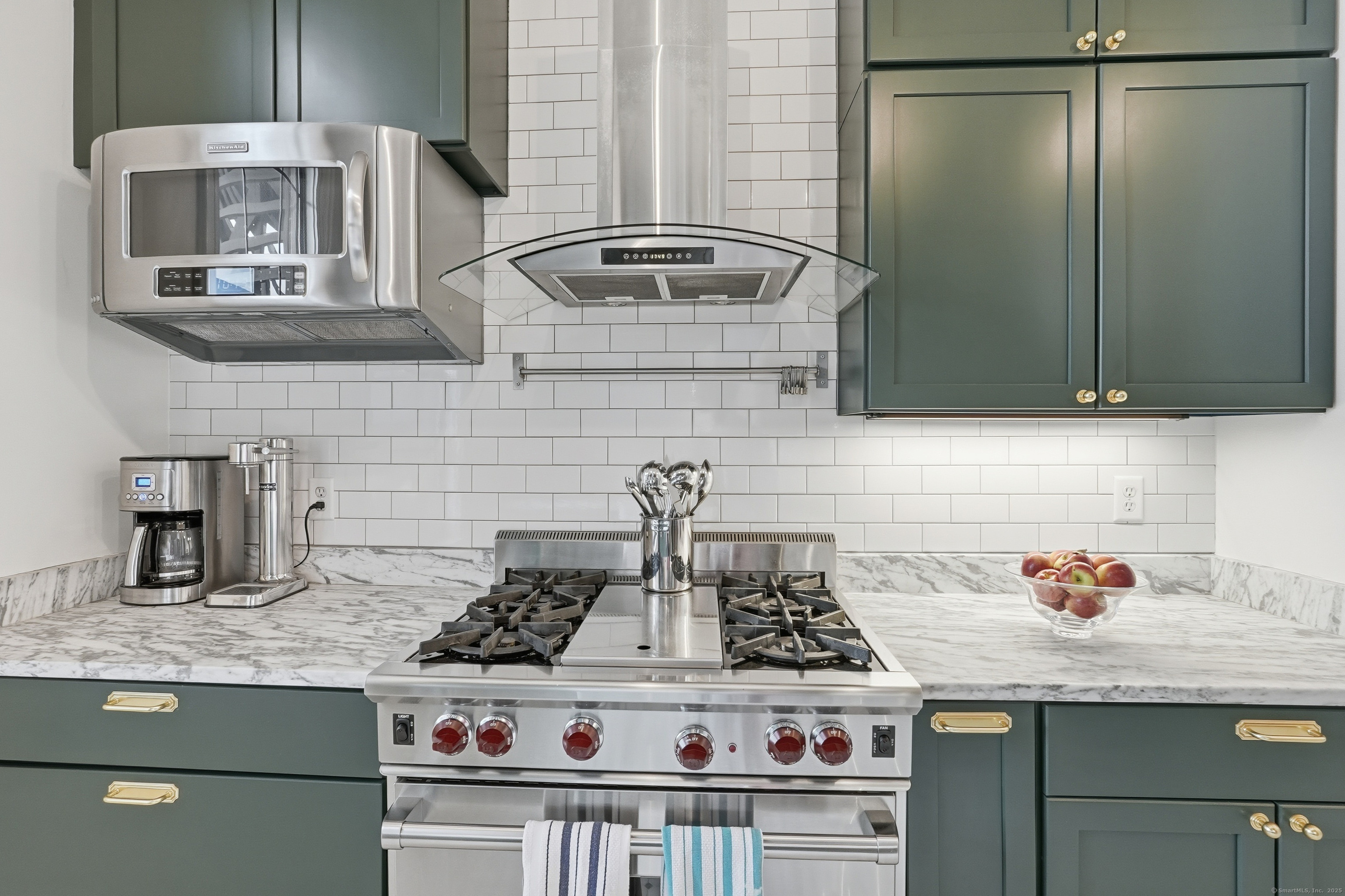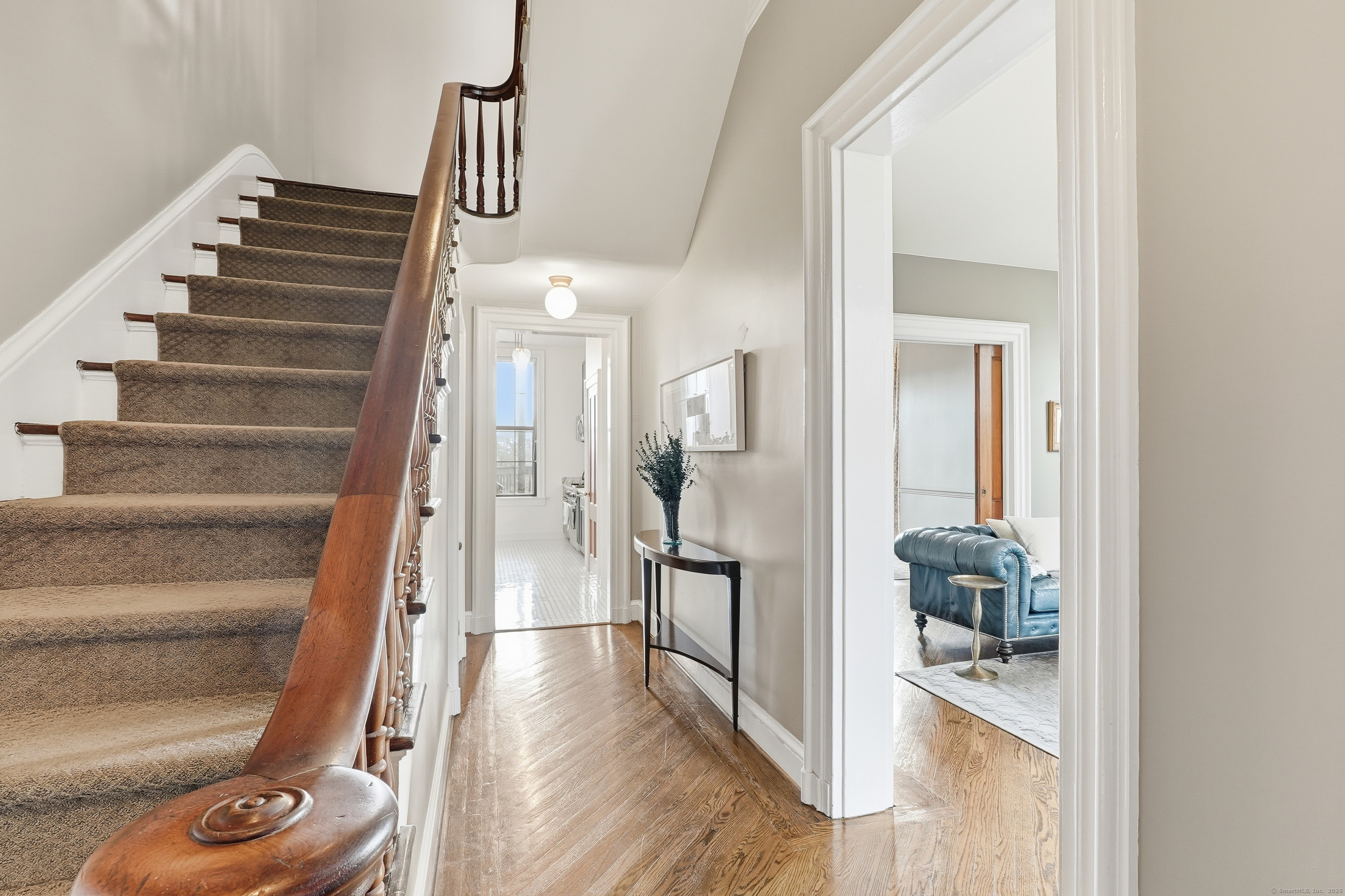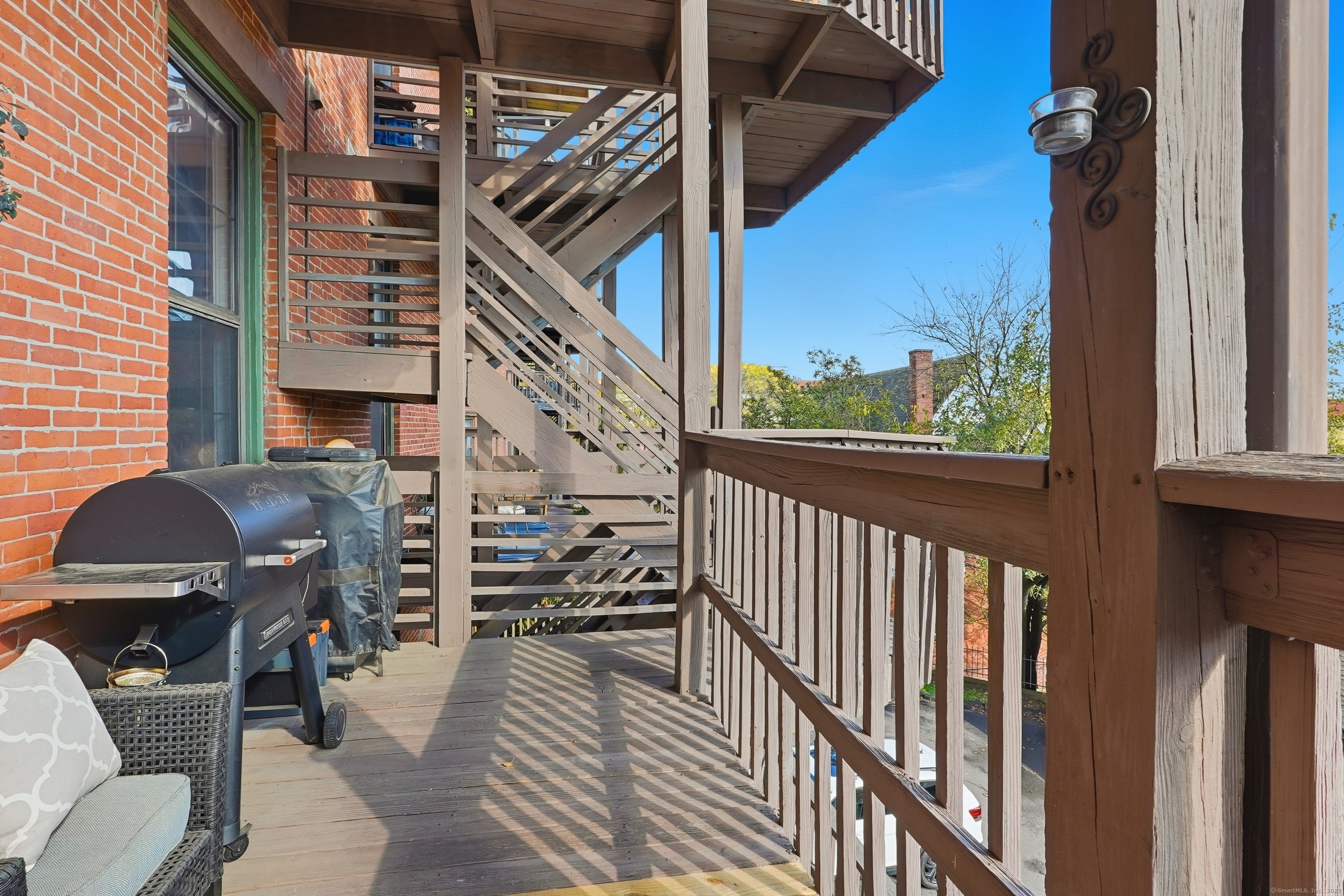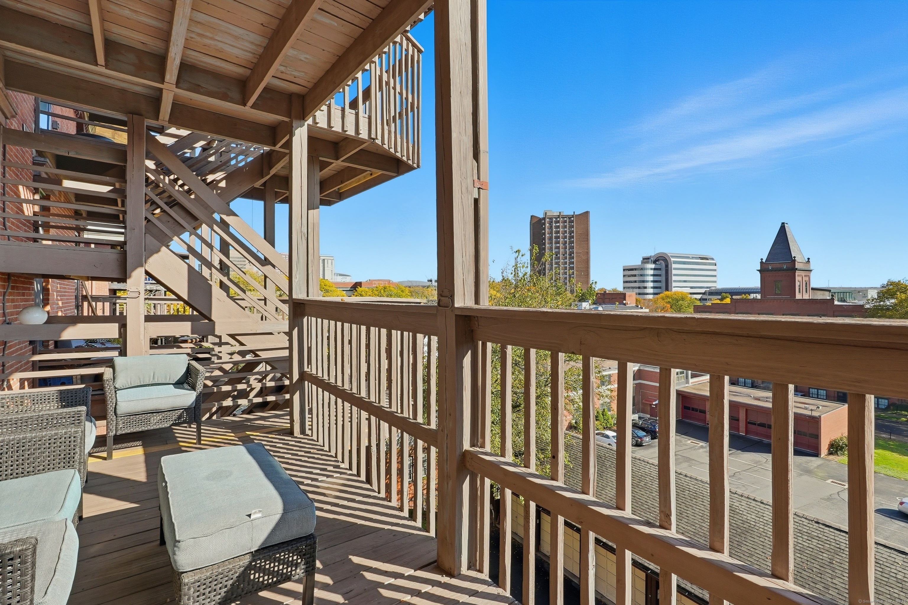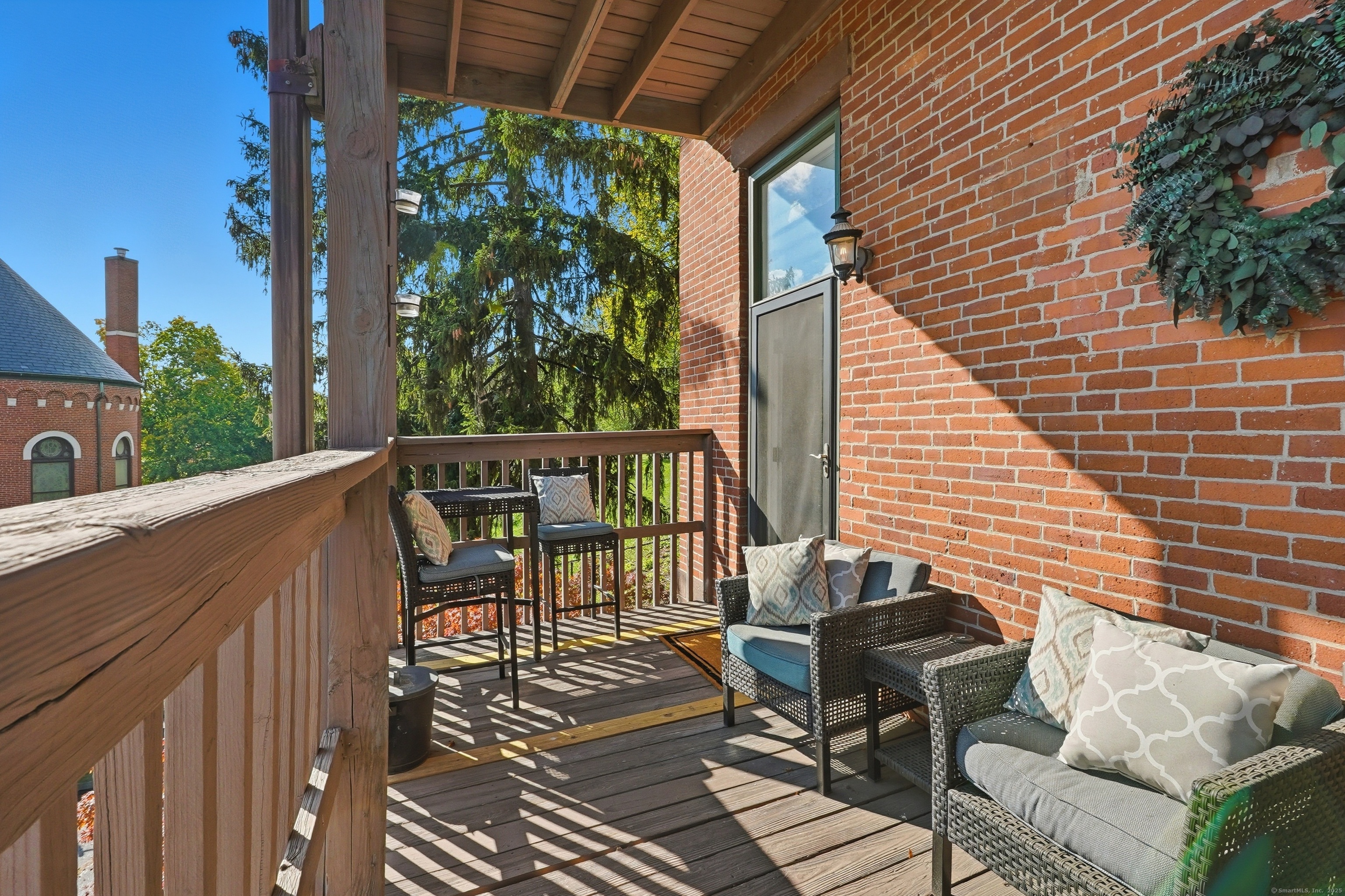Private Entrance to Your Own Brownstone on Historic Charter Oak Place! Welcome to one of only five units in the distinguished Fenn-Eaton House, nestled in the heart of downtown Hartford. This gracious townhome offers the perfect blend of historic character and modern comfort-all within walking distance to the city's top attractions. Catch a Yard Goats game, dine at the Capitol Grille, enjoy a Broadway show at The Bushnell, picnic or ice skate in Bushnell Park, or take a sunset stroll along the riverfront path-it's all just steps from your door. Inside, you'll be charmed by the period details of yesteryear paired with today's modern conveniences. Beautiful original wide oak pocket doors with classic brass hardware elegantly separate the living and dining rooms, offering both openness and intimacy for entertaining. The remodeled kitchen is a chef's dream, featuring a 6-burner Wolf range, deep pantry closet, farmhouse sink, and quality finishes throughout.Upstairs, the Primary bedroom has a remodeled bathroom, private balcony and walk-in dressing area. Laundry is located in the second full bath. This Brownstone also boasts of one of the larger storage units in the basement and a one car garage. Views from the balcony and covered porch make outdoor dining and entertaining a Must!