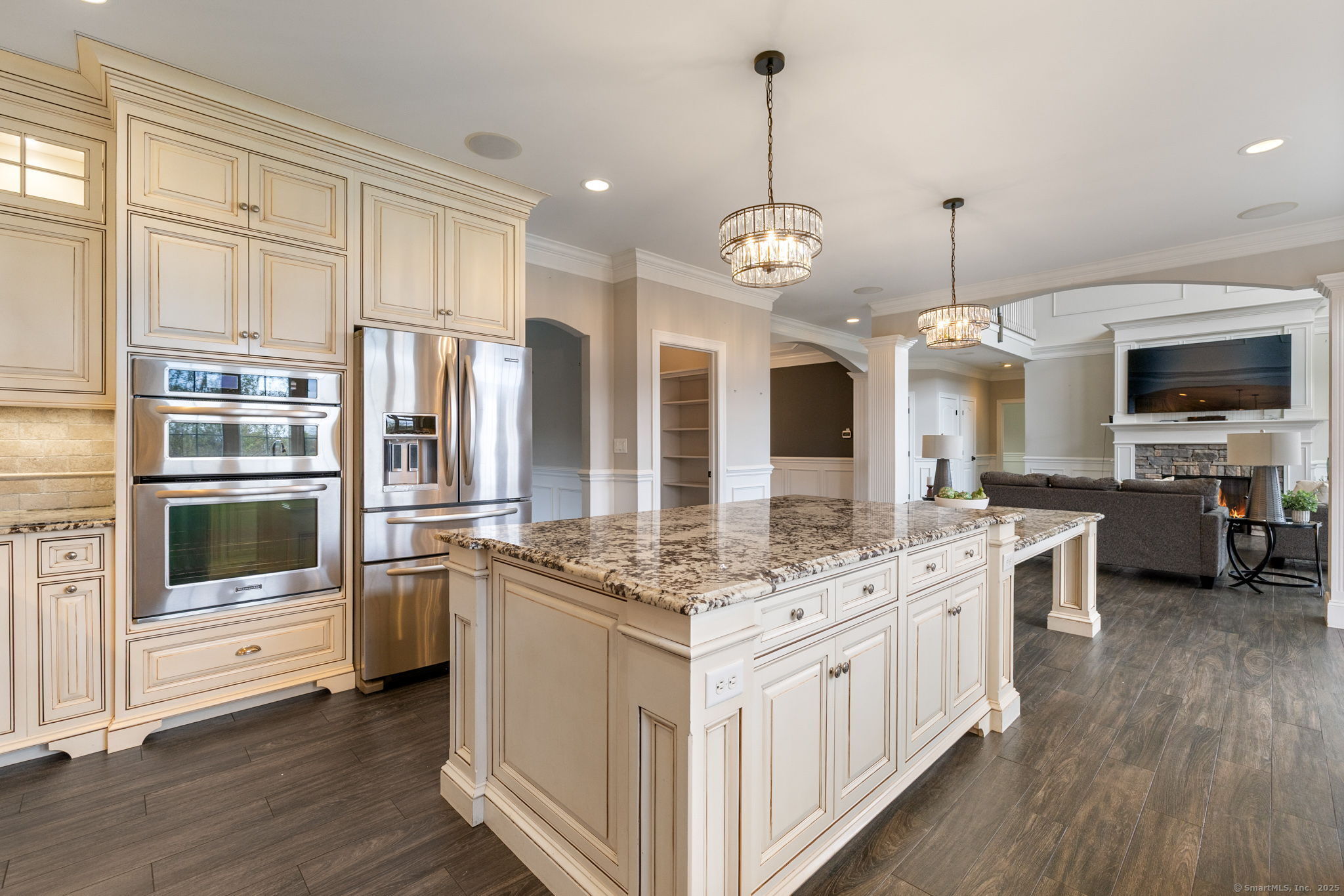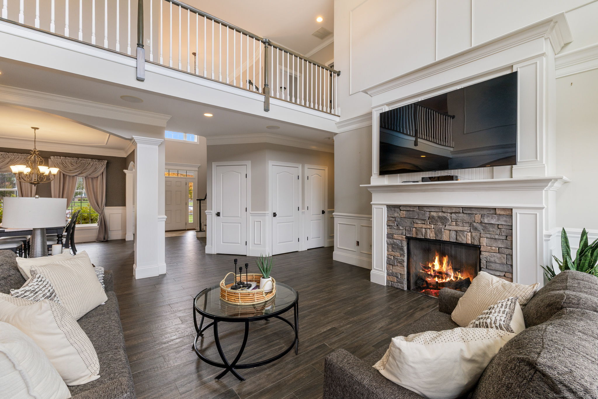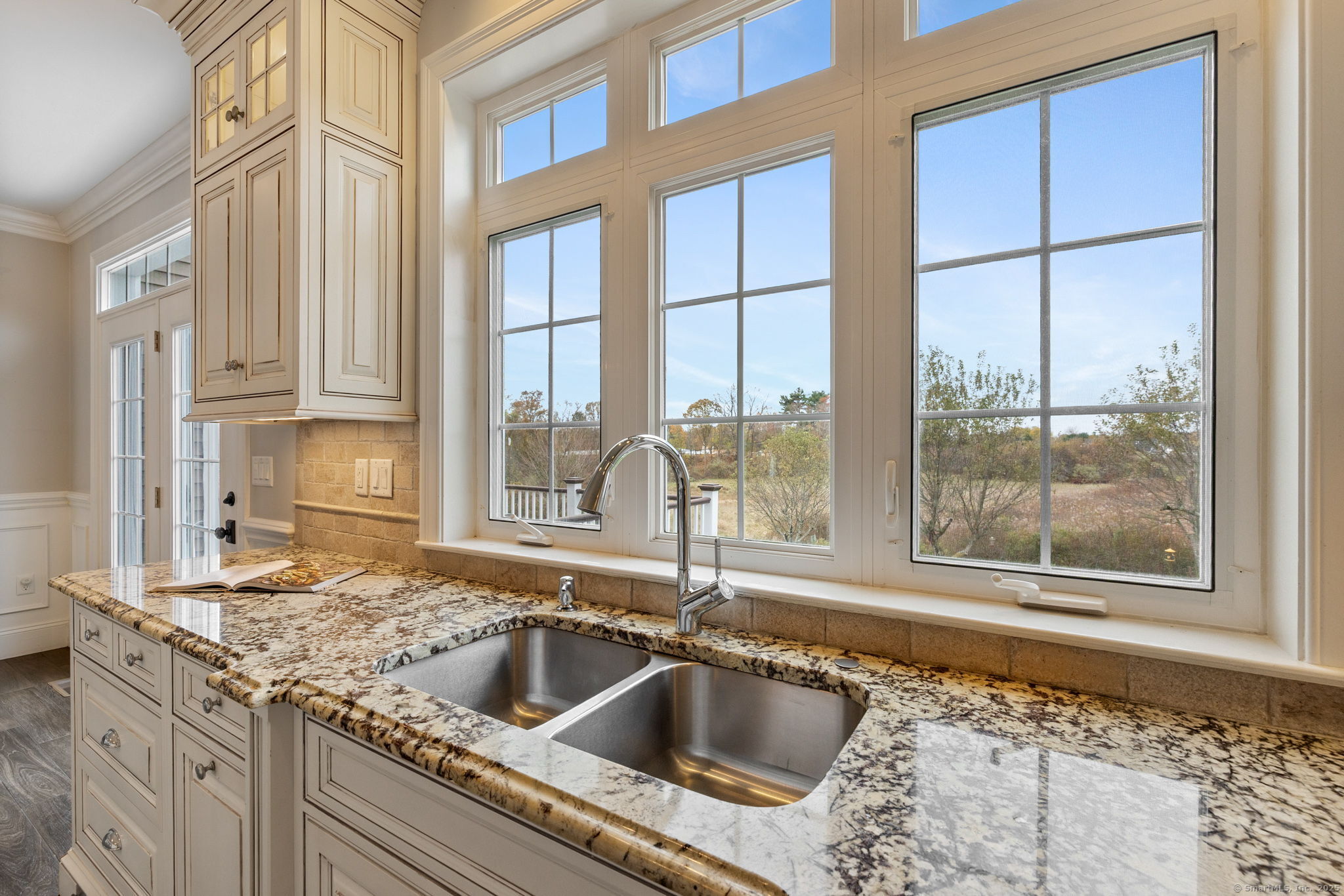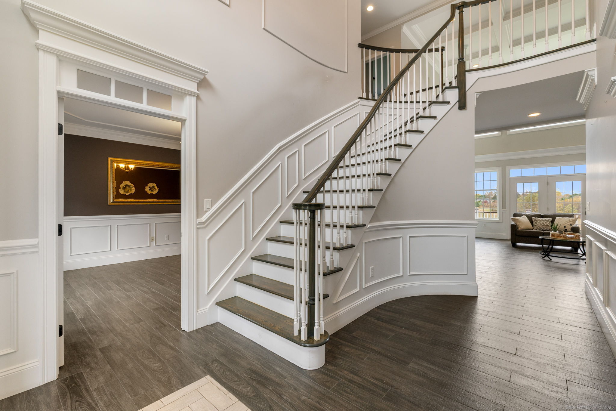 Why build when this 12-year-young custom colonial is completely move-in ready. Nestled on a quiet cul-de-sac among prestigious homes off Flanders Road, this spectacular 5 bedroom, 3.5 bath home offers refined craftsmanship and top-of-the-line finishes throughout. The elegant two-story foyer opens to a warm, light-filled layout with 9' ceilings, Italian porcelain flooring, extensive crown molding, chair rail, wainscoting, and custom archways. The gourmet kitchen is a dream-double-stacked beaded cabinetry with inset doors, granite counters, large island with seating, 6-burner gas cooktop, walk-in pantry, and a sunny dining area. The kitchen opens to a breathtaking great room with a 24' coffered ceiling, custom stone fireplace, and a wall of windows overlooking peaceful pastoral views. A formal dining room, private office or 6th bedroom for guests, and mudroom complete the main level. Upstairs, the luxurious primary suite features a sitting area, tray ceiling, walk-in dressing room, and spa bath with marble vanities, soaking tub, and glass shower. Additional bedrooms include an en-suite and a shared full bath, plus a convenient upper-level laundry with new washer and dryer 2025. Outdoor living includes a 14'x26' Azek deck with motorized awning, covered patio, irrigation system, and space for a future pool. Walkout lower level with 9' ceilings and full-size windows. Natural gas, city water/sewer, central vacuum, whole-house audio. Turnkey and exceptional!