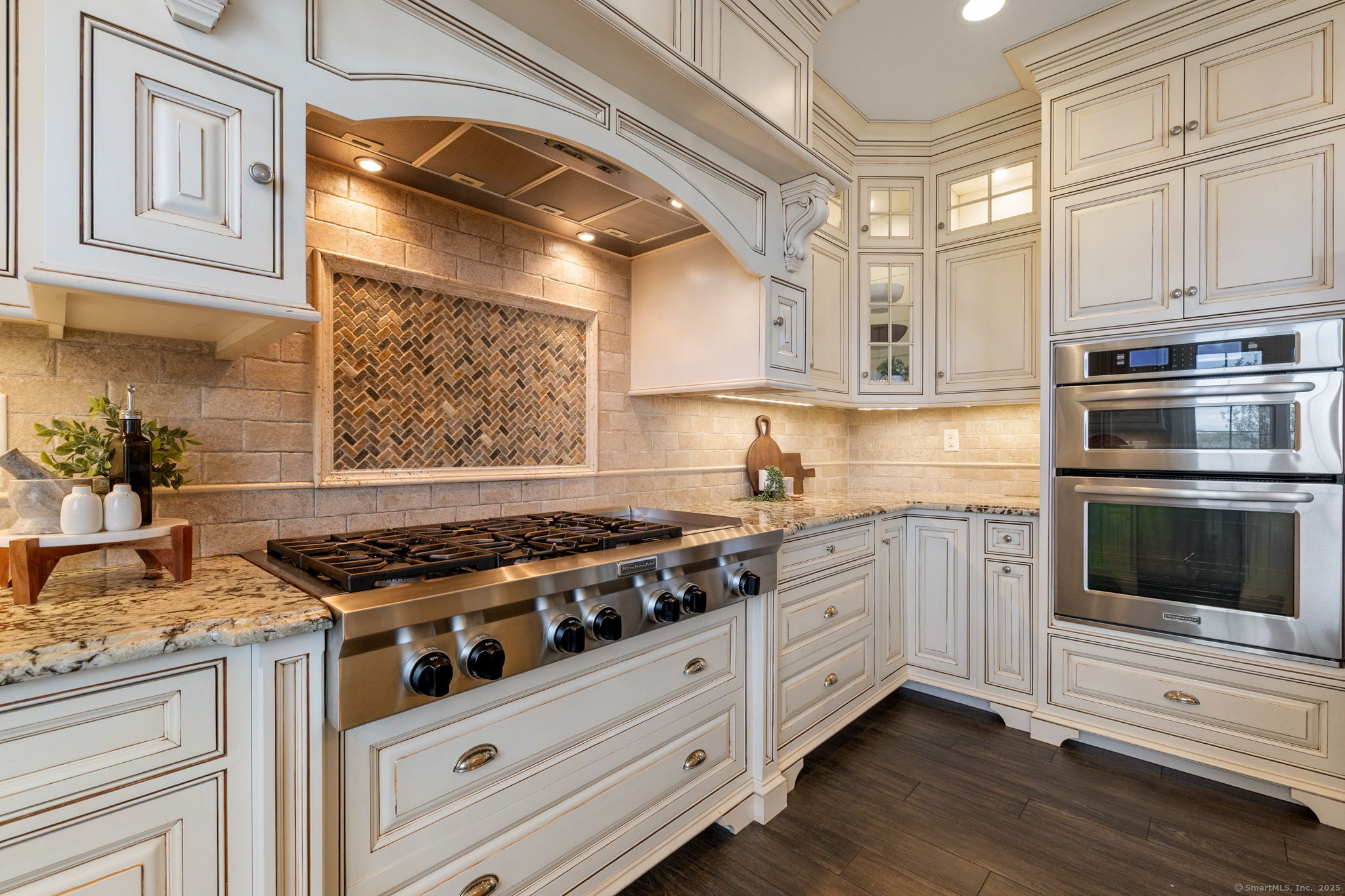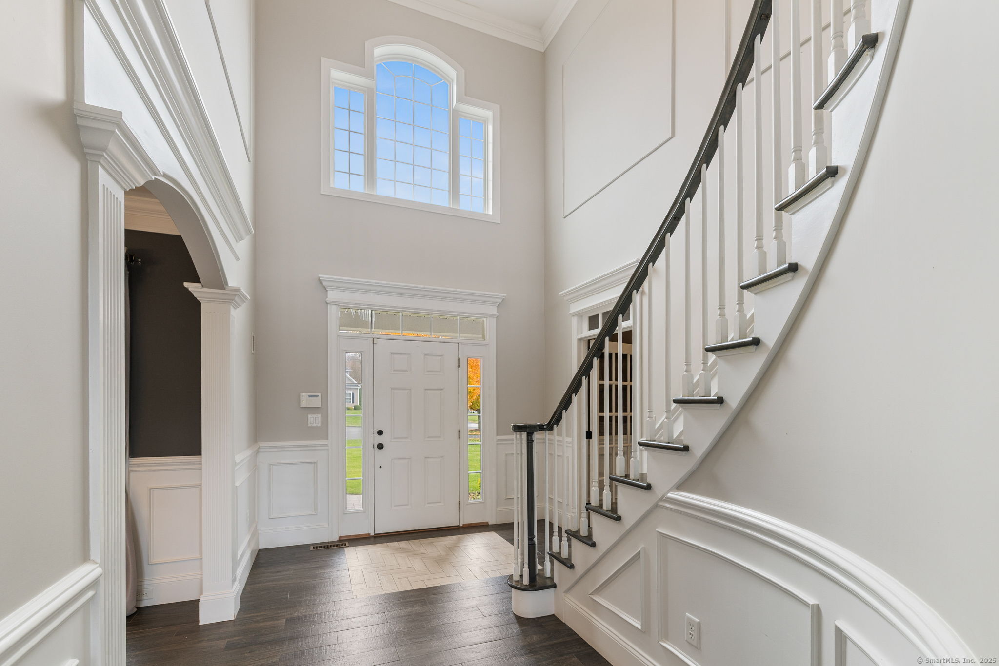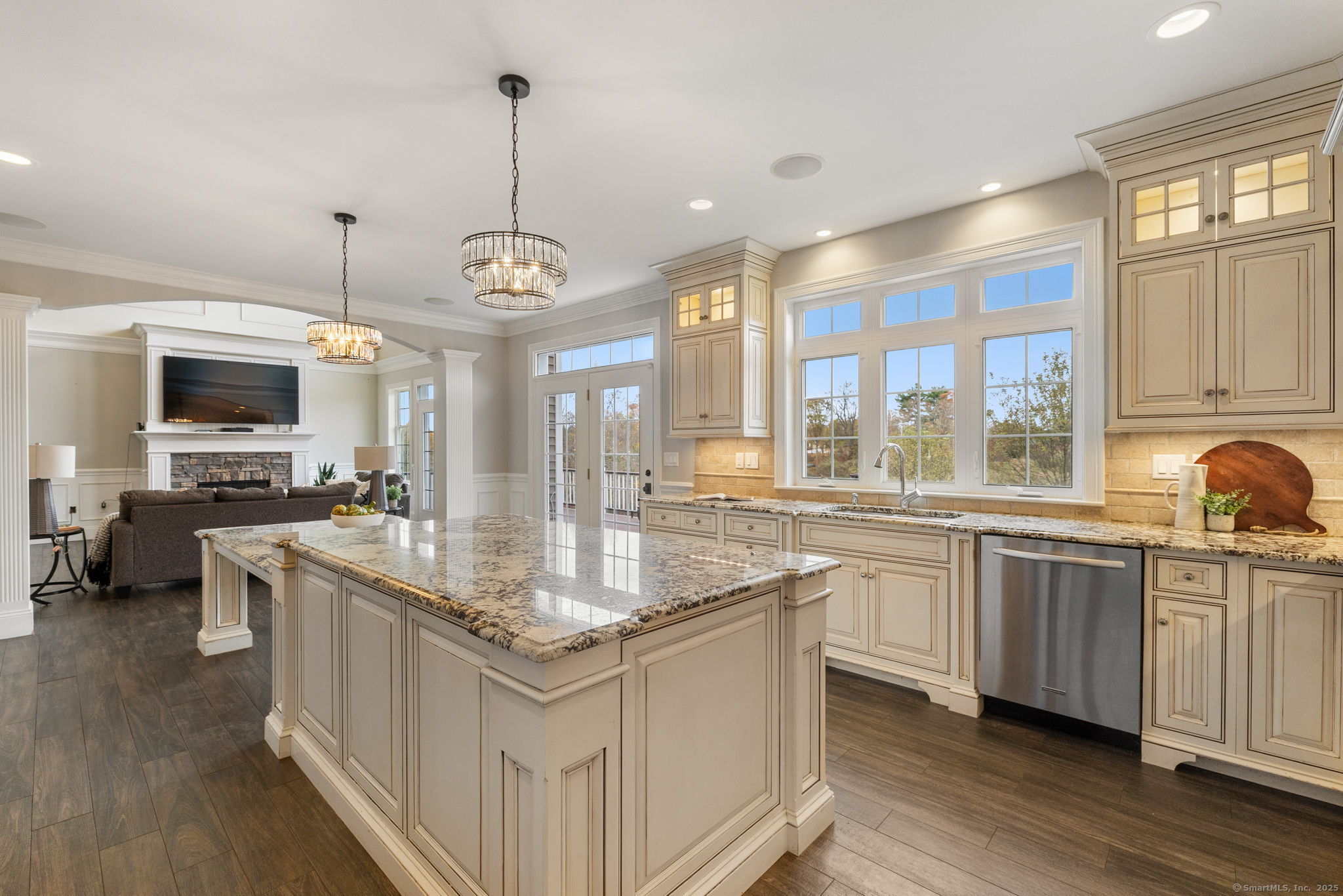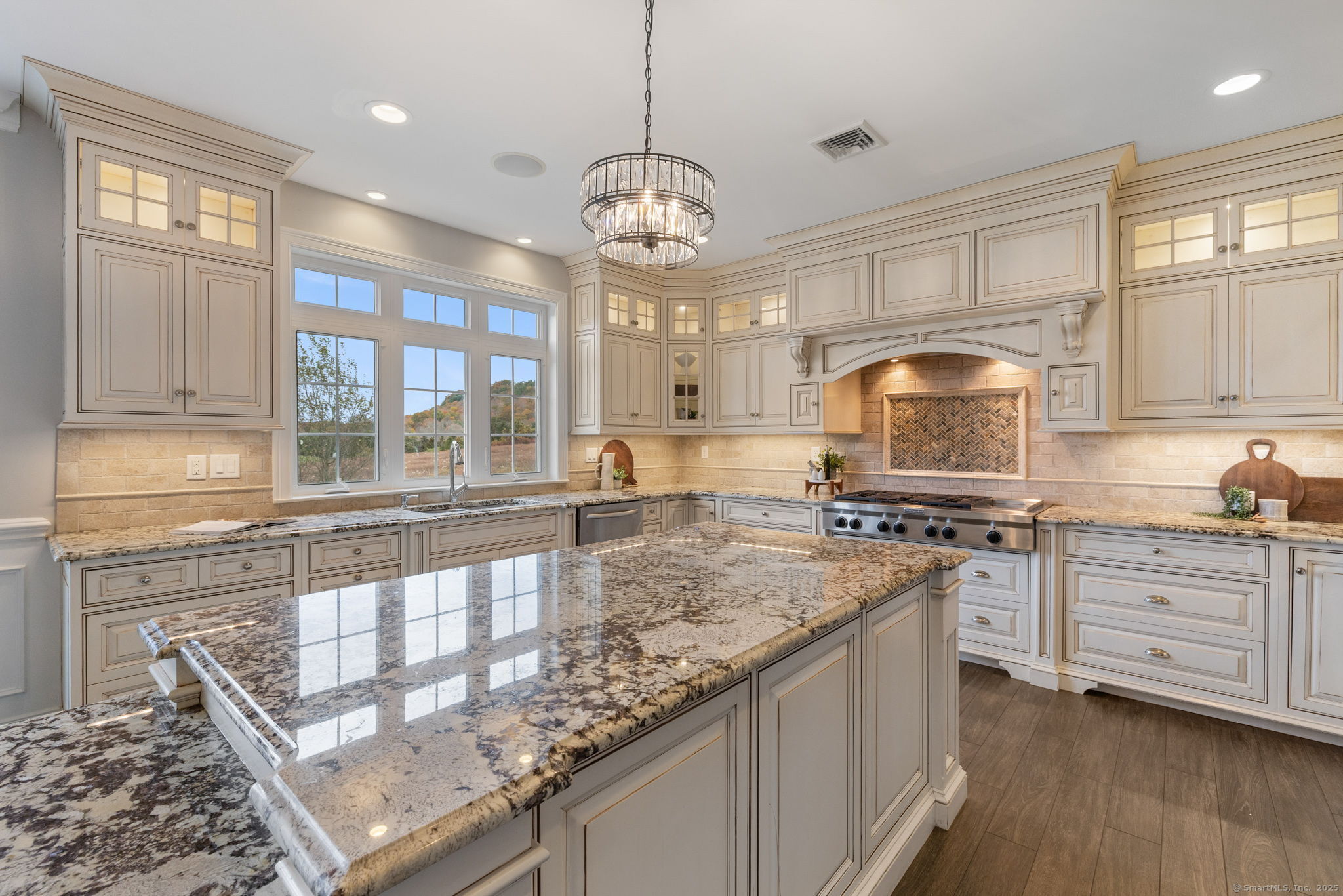 Why build when this 12-year-young custom colonial is completely move-in ready. Nestled on a quiet cul-de-sac among prestigious homes off Flanders Road, this spectacular 5 bedroom, 3.5 bath home offers refined craftsmanship and top-of-the-line finishes throughout. The elegant two-story foyer opens to a warm, light-filled layout with 9' ceilings, Italian porcelain flooring, extensive crown molding, chair rail, wainscoting, and custom archways. The gourmet kitchen is a dream-double-stacked beaded cabinetry with inset doors, granite counters, large island with seating, 6-burner gas cooktop, walk-in pantry, and a sunny dining area. The kitchen opens to a breathtaking great room with a 24' coffered ceiling, custom stone fireplace, and a wall of windows overlooking peaceful pastoral views. A formal dining room, private office or 6th bedroom for guests, and mudroom complete the main level. Upstairs, the luxurious primary suite features a sitting area, tray ceiling, walk-in dressing room, and spa bath with marble vanities, soaking tub, and glass shower. Additional bedrooms include an en-suite and a shared full bath, plus a convenient upper-level laundry with new washer and dryer 2025. Outdoor living includes a 14'x26' Azek deck with motorized awning, covered patio, irrigation system, and space for a future pool. Walkout lower level with 9' ceilings and full-size windows. Natural gas, city water/sewer, central vacuum, whole-house audio. Turnkey and exceptional!