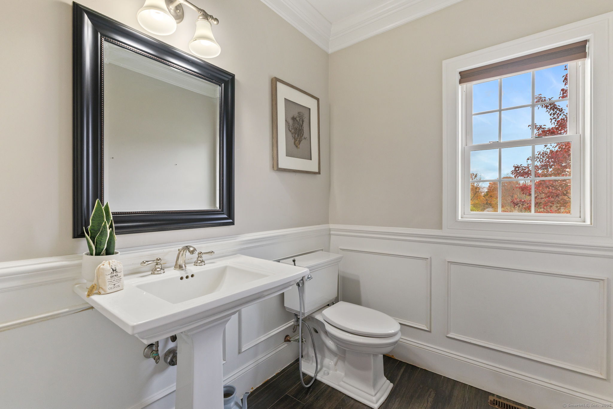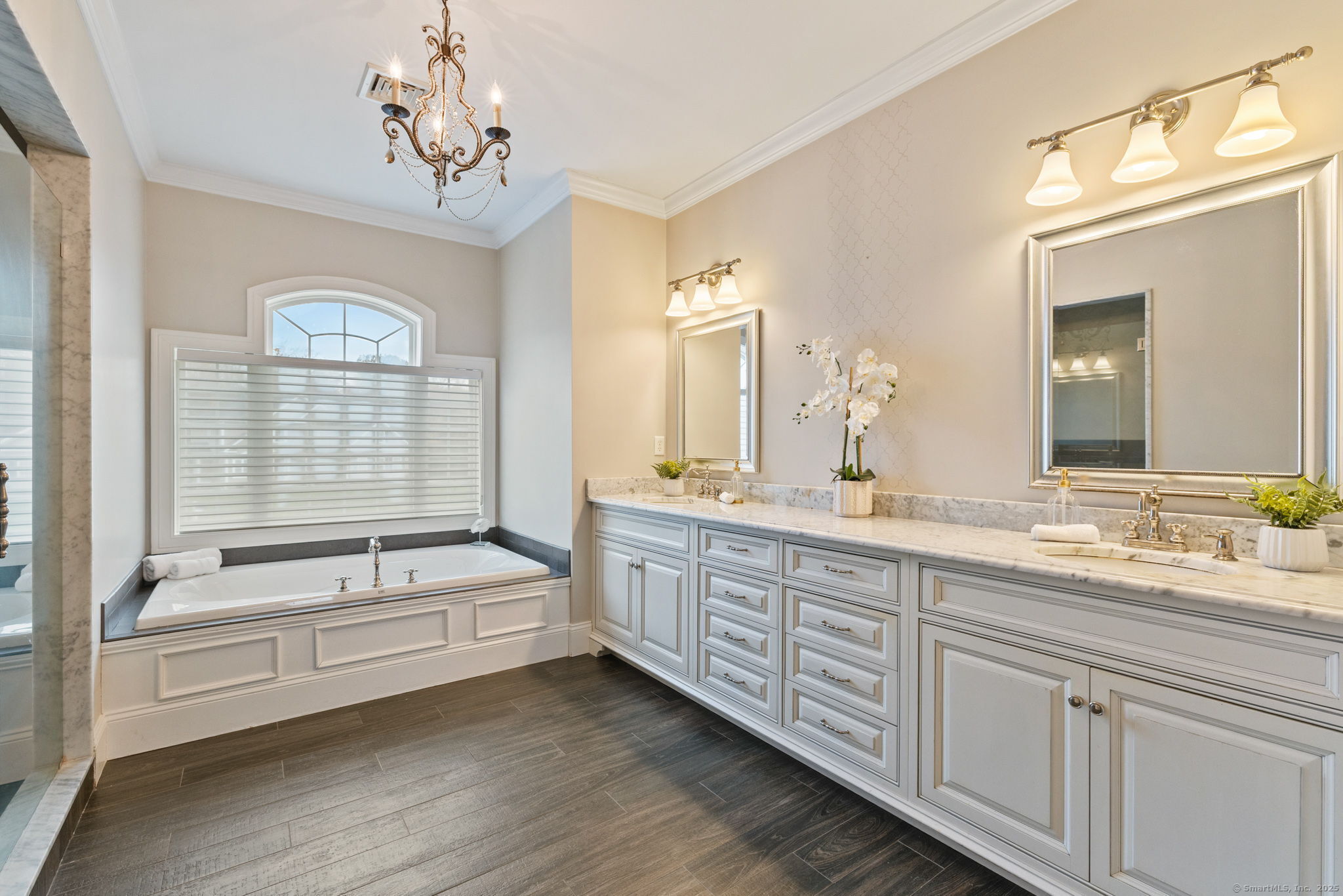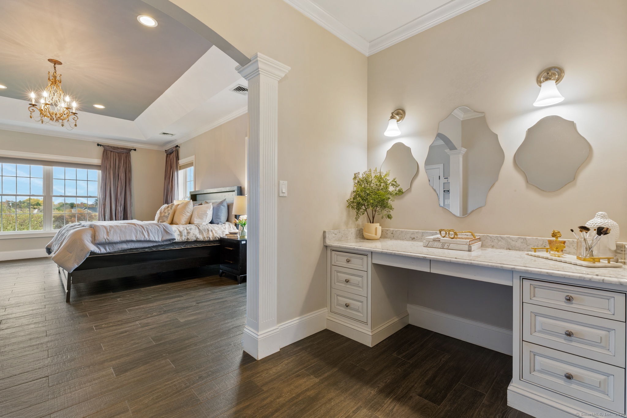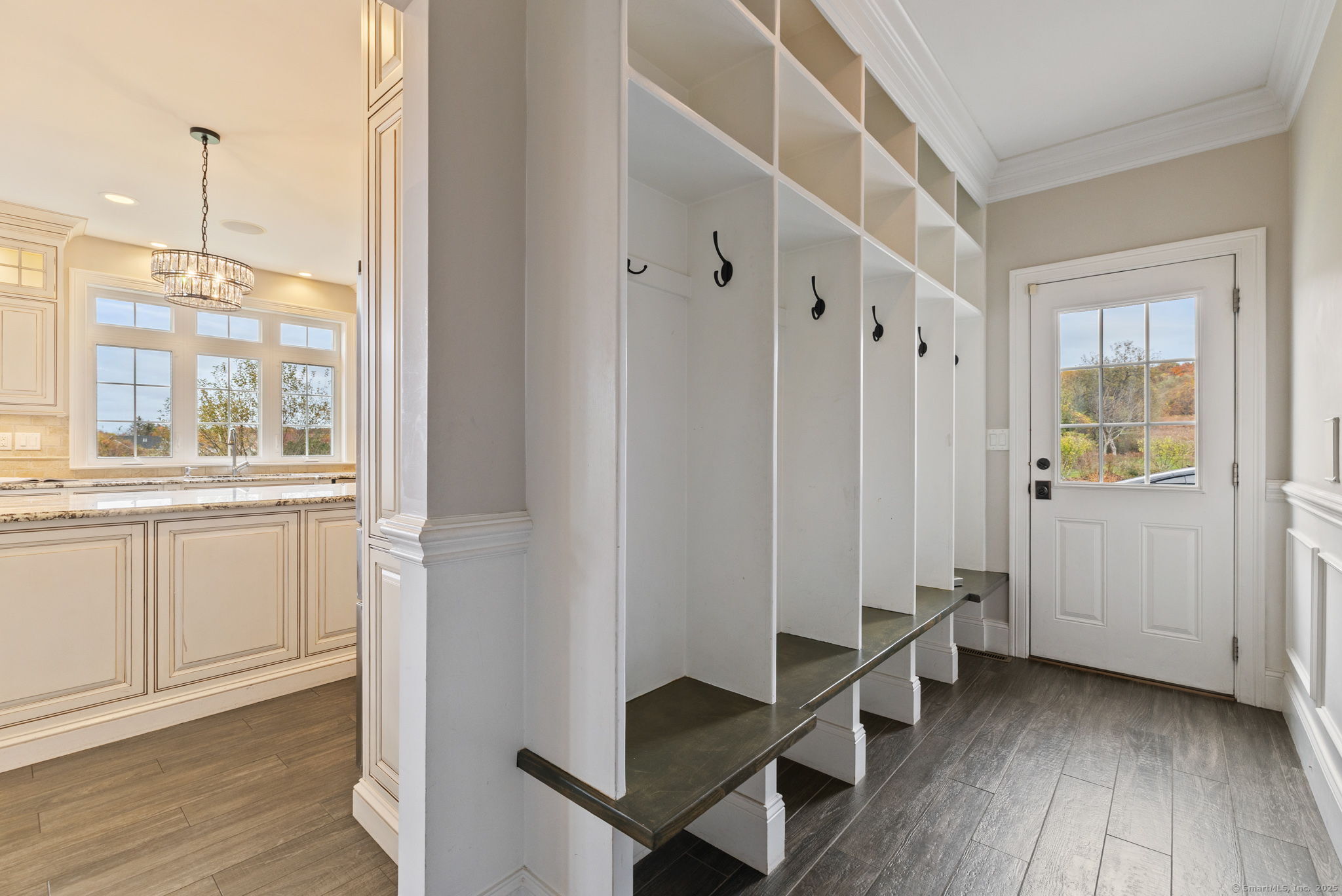 Why build when this 12-year-young custom colonial is completely move-in ready. Nestled on a quiet cul-de-sac among prestigious homes off Flanders Road, this spectacular 5 bedroom, 3.5 bath home offers refined craftsmanship and top-of-the-line finishes throughout. The elegant two-story foyer opens to a warm, light-filled layout with 9' ceilings, Italian porcelain flooring, extensive crown molding, chair rail, wainscoting, and custom archways. The gourmet kitchen is a dream-double-stacked beaded cabinetry with inset doors, granite counters, large island with seating, 6-burner gas cooktop, walk-in pantry, and a sunny dining area. The kitchen opens to a breathtaking great room with a 24' coffered ceiling, custom stone fireplace, and a wall of windows overlooking peaceful pastoral views. A formal dining room, private office or 6th bedroom for guests, and mudroom complete the main level. Upstairs, the luxurious primary suite features a sitting area, tray ceiling, walk-in dressing room, and spa bath with marble vanities, soaking tub, and glass shower. Additional bedrooms include an en-suite and a shared full bath, plus a convenient upper-level laundry with new washer and dryer 2025. Outdoor living includes a 14'x26' Azek deck with motorized awning, covered patio, irrigation system, and space for a future pool. Walkout lower level with 9' ceilings and full-size windows. Natural gas, city water/sewer, central vacuum, whole-house audio. Turnkey and exceptional!