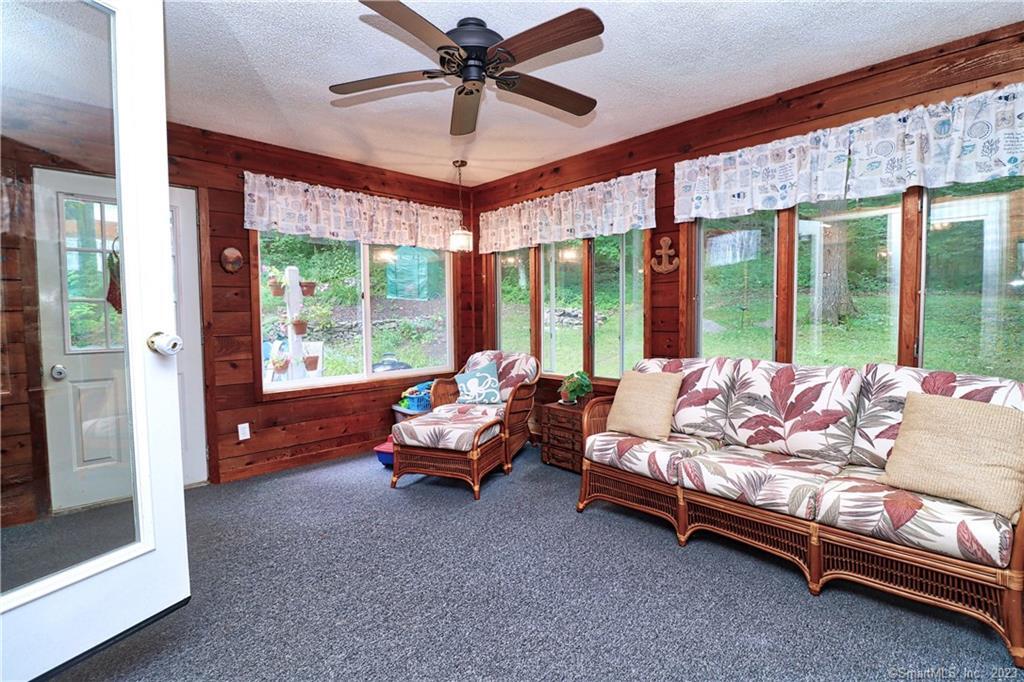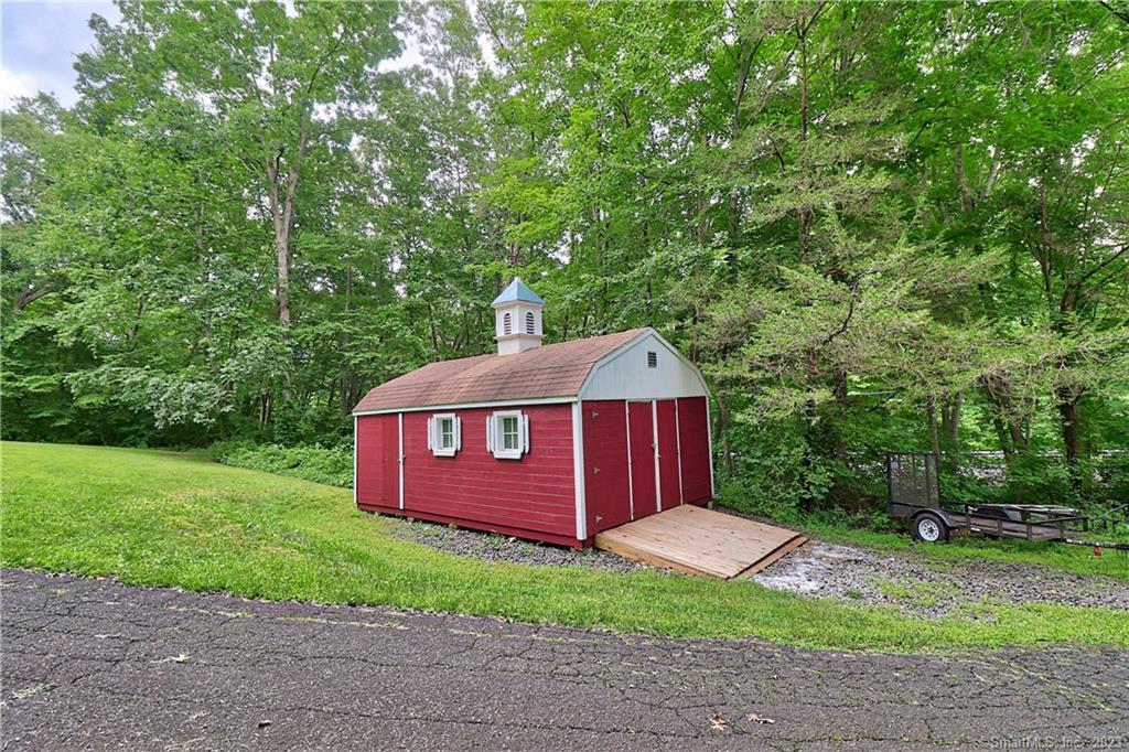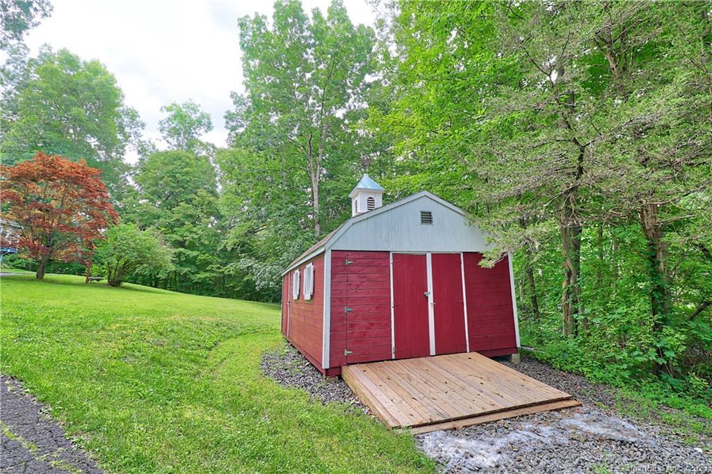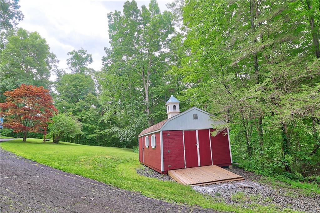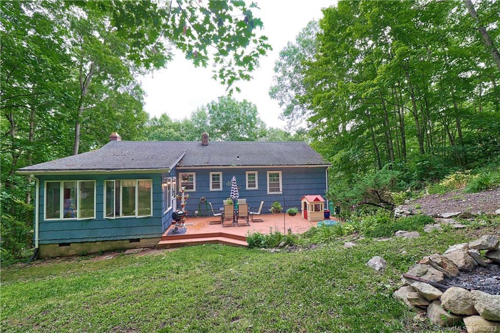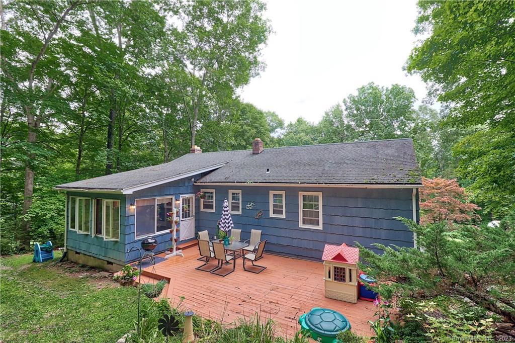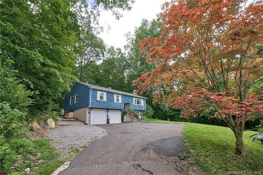 Welcome to 369 Strongtown Rd. This Southbury Raised Ranch sits atop a scenic lot of almost 2 acres, surrounded by majestic trees and offering the ultimate privacy! As you enter the foyer and walk up to the living room, you will see the attractive wood burning fireplace which will keep you warm and cozy in winter and lots of natural light streaming in through the picture window. Directly behind this room is the open concept kitchen and dining room, which has been very tastefully updated with oak cabinets, granite countertops, tile backsplash, two ceiling fans, and stainless-steel appliances. The kitchen is a chef's dream with so much work and counter space - there is room for your entire family to cook together and create meals and memories. French doors lead you directly from the dining room into a three-season enclosed porch with rustic wood walls, lots of windows and access to the back deck. The deck is perfect for picnics and relaxation! The main floor also includes an updated bathroom with tile surrounding the shower, glass doors and a tile floor. There are two bedrooms with good sized closets and the primary bedroom. The primary features a half bath and a walk-in closet. On the lower level you will find a finished, family/recreation room with a newer wood burning stove and laundry hook-ups in the unfinished utility room. The two-car garage rounds out the lower level. Outside, a red barn-style shed offers additional storage and is large enough to accommodat