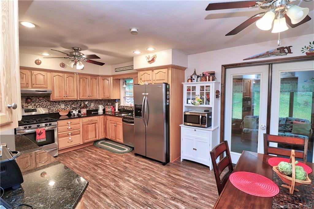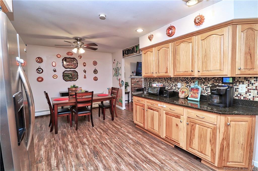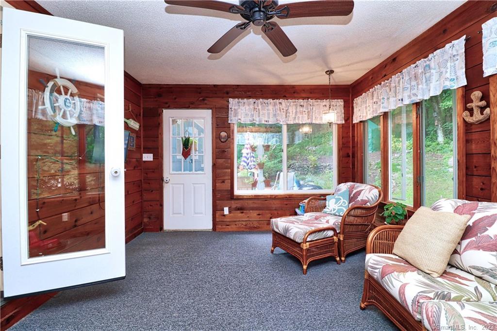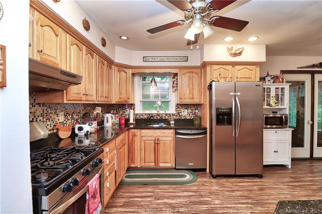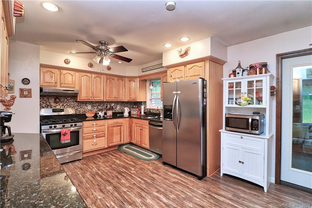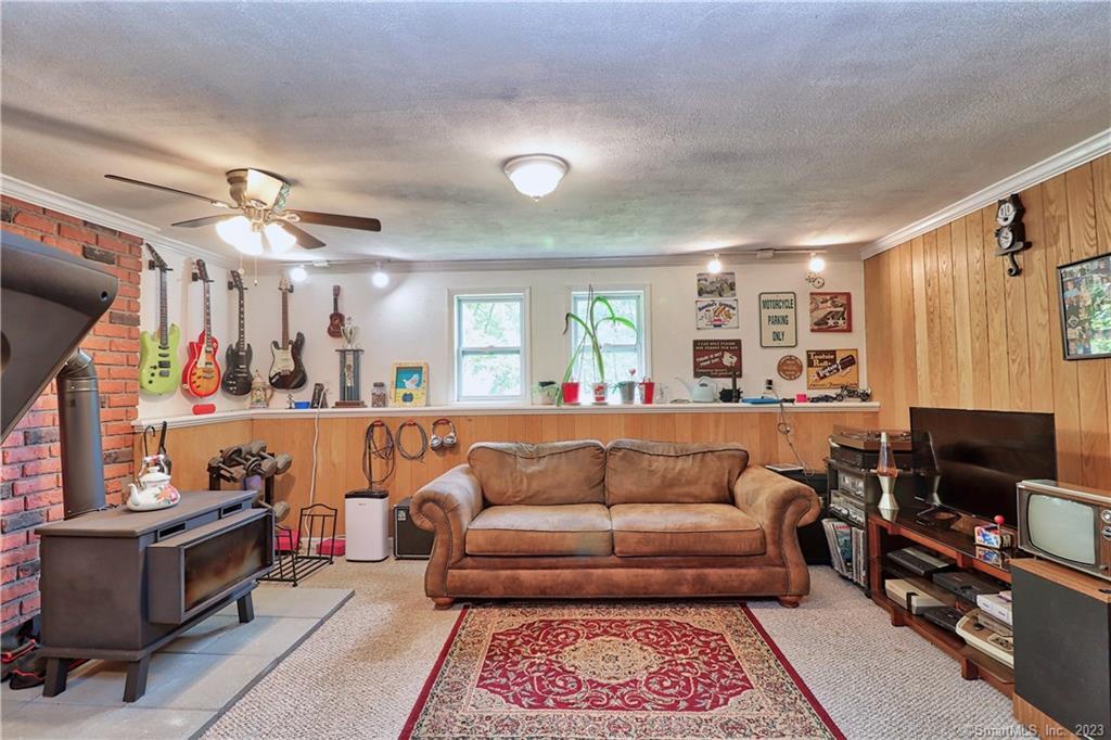 Welcome to 369 Strongtown Rd. This Southbury Raised Ranch sits atop a scenic lot of almost 2 acres, surrounded by majestic trees and offering the ultimate privacy! As you enter the foyer and walk up to the living room, you will see the attractive wood burning fireplace which will keep you warm and cozy in winter and lots of natural light streaming in through the picture window. Directly behind this room is the open concept kitchen and dining room, which has been very tastefully updated with oak cabinets, granite countertops, tile backsplash, two ceiling fans, and stainless-steel appliances. The kitchen is a chef's dream with so much work and counter space - there is room for your entire family to cook together and create meals and memories. French doors lead you directly from the dining room into a three-season enclosed porch with rustic wood walls, lots of windows and access to the back deck. The deck is perfect for picnics and relaxation! The main floor also includes an updated bathroom with tile surrounding the shower, glass doors and a tile floor. There are two bedrooms with good sized closets and the primary bedroom. The primary features a half bath and a walk-in closet. On the lower level you will find a finished, family/recreation room with a newer wood burning stove and laundry hook-ups in the unfinished utility room. The two-car garage rounds out the lower level. Outside, a red barn-style shed offers additional storage and is large enough to accommodat