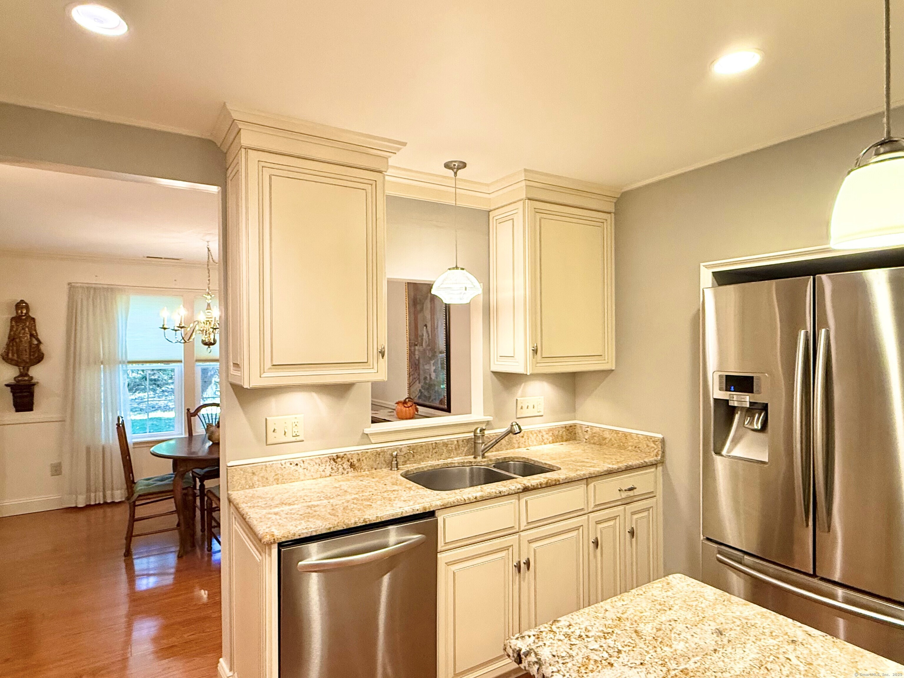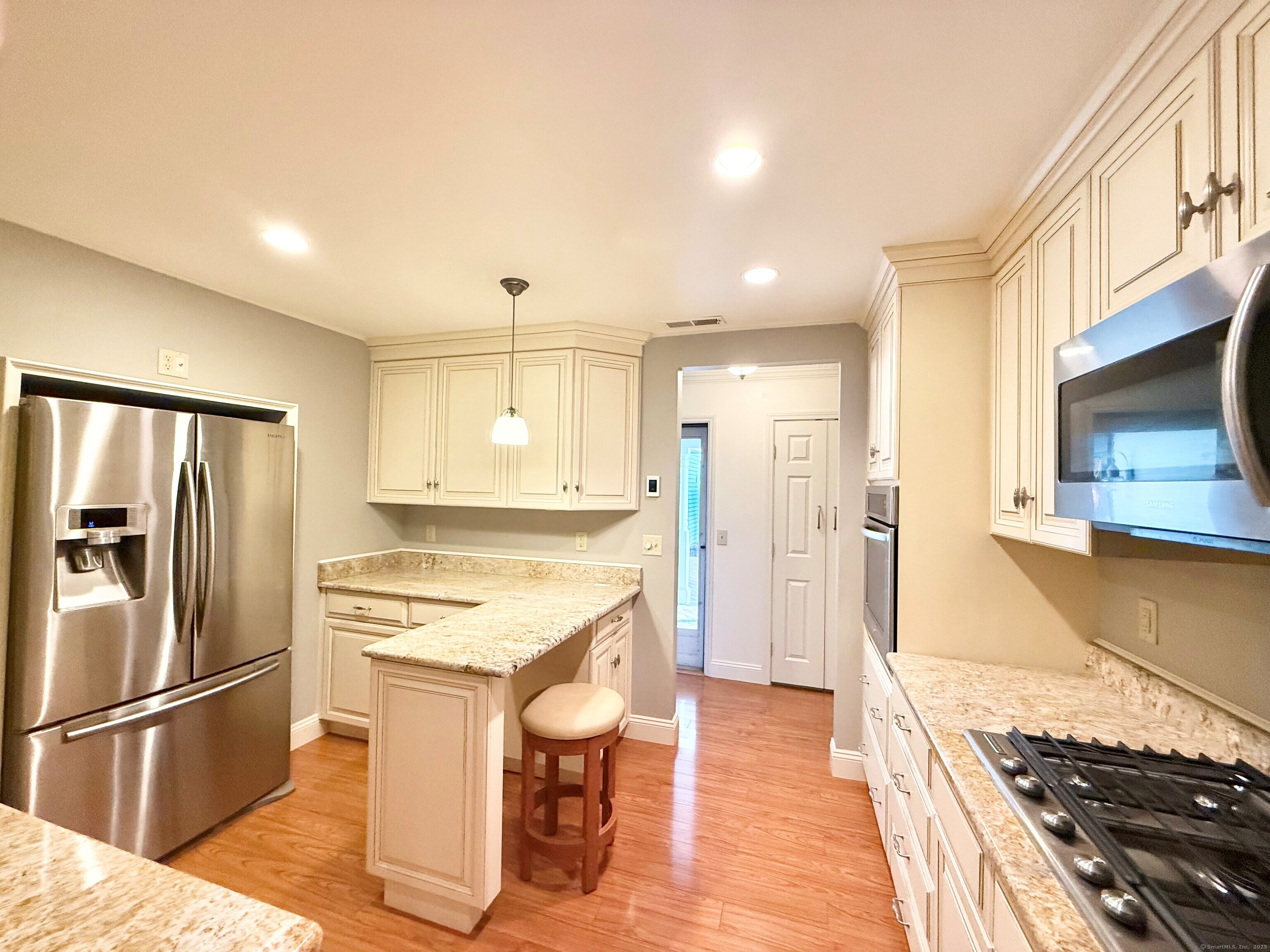 Very rare opportunity "Butler Model " ranch style condo offers a true, one level living space with absolutely no stairs - including the adjoining 2 car garage. Located in the highly desirable Trumbull Town Commons, this 2 bedroom, 2 bath condo offers a most convenience location in a meticulously maintained community. The inviting living room, offers a wood burning fireplace with sliding doors that leads to a patio with a private garden like retreat. A nice size den offers versatile space for a home office or exercise room. The primary suite offers a large walk-in closet with a full updated bath. The second bedroom, also features a walk-in closet and access to the second full updated bath. The stylish kitchen, with newer stainless steel appliances and walk - in pantry , flows into a large sunny dining room. If you are looking for one level, with absolutely no stairs, this might be your new home. Easy access to the pool, restaurants, highway, shopping. HIGHEST AND BEST BY TUESDAY 10/28 BY NOON.
