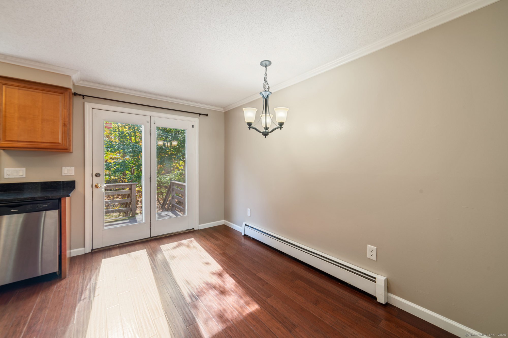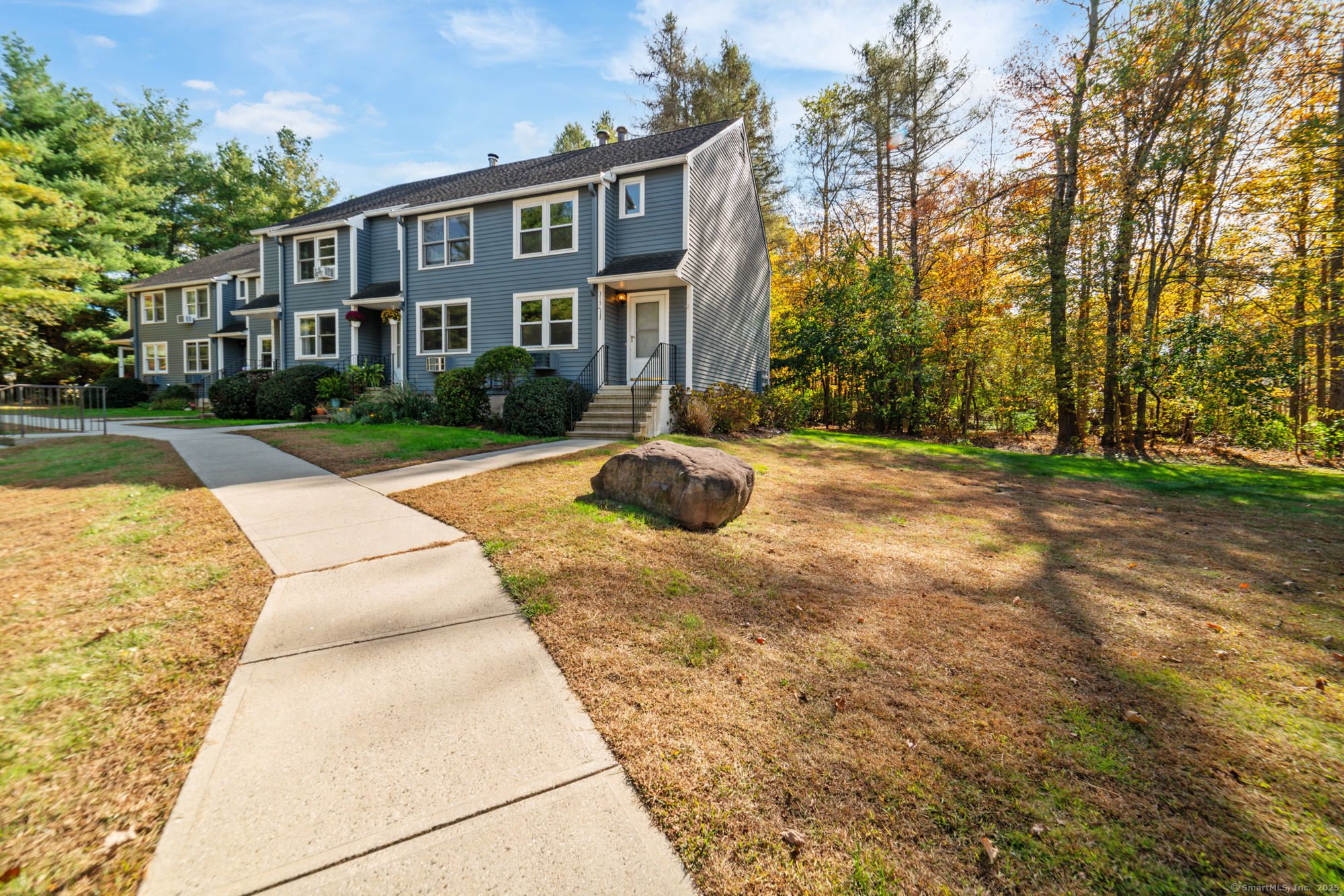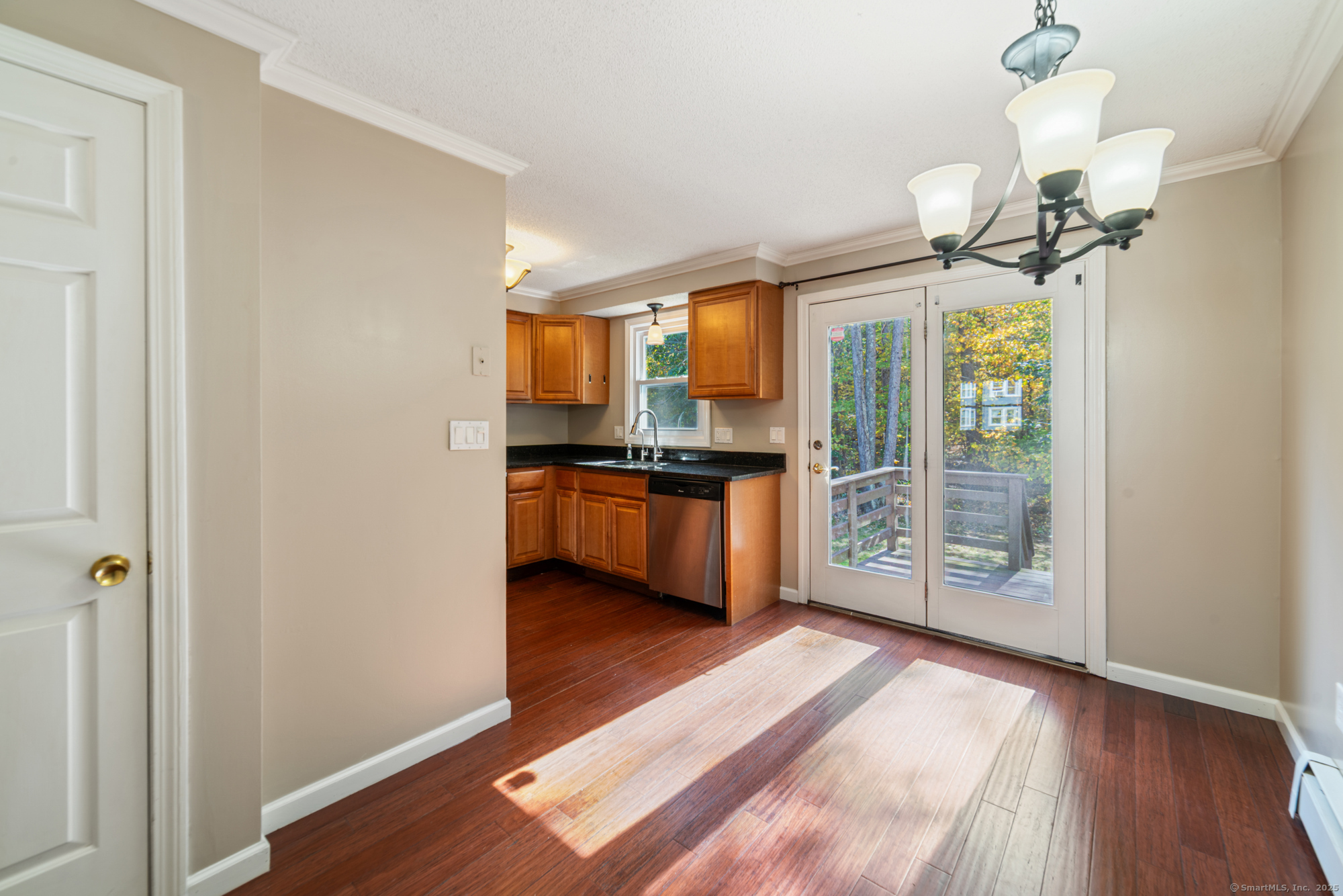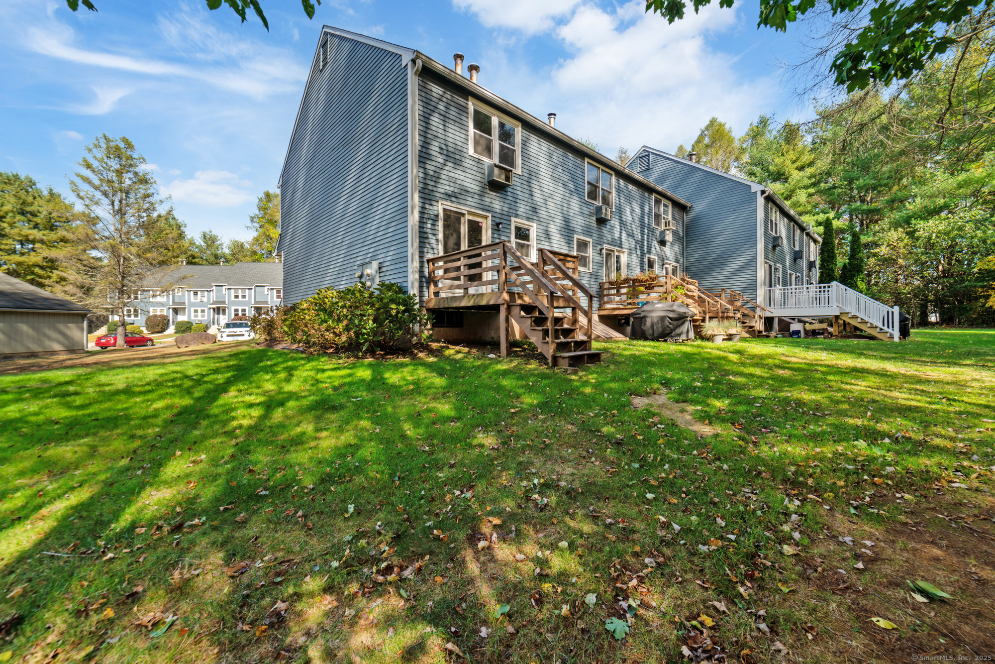 Welcome to this well-maintained end-unit condo located in a beautiful community. The main level features a large living room, recently updated eat-in kitchen equipped with stainless steel appliances, granite countertops, and a half bath. Upstairs you'll find two spacious bedrooms and an updated full bath. The home features hardwood floors throughout. Step outside to your private rear deck overlooking peaceful wooded views, perfect for outdoor dining or relaxation. Fully finished basement provides additional living space, ideal for a home office, media room, or guest suite. This unit also includes a garage and new boiler. Enjoy the community's amenities, including a clubhouse, swimming pool, and basketball court. Don't miss out on this turnkey opportunity!