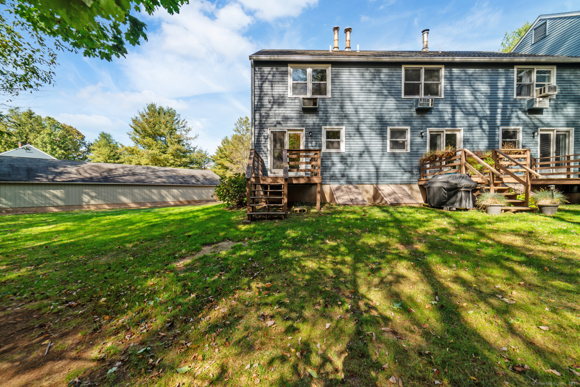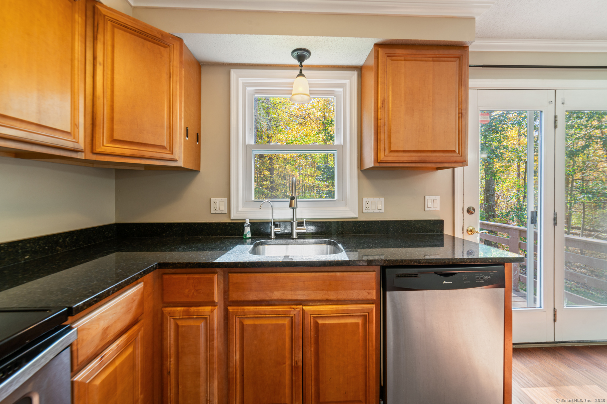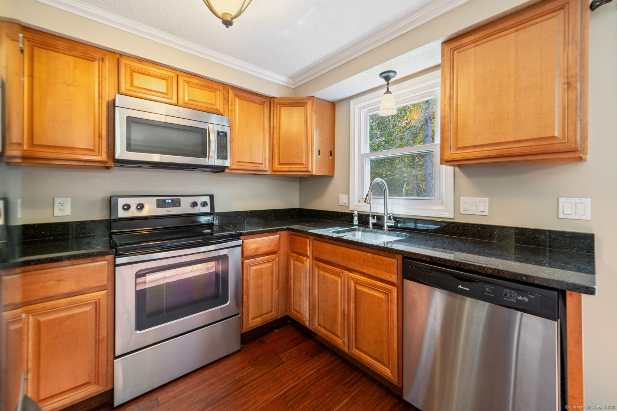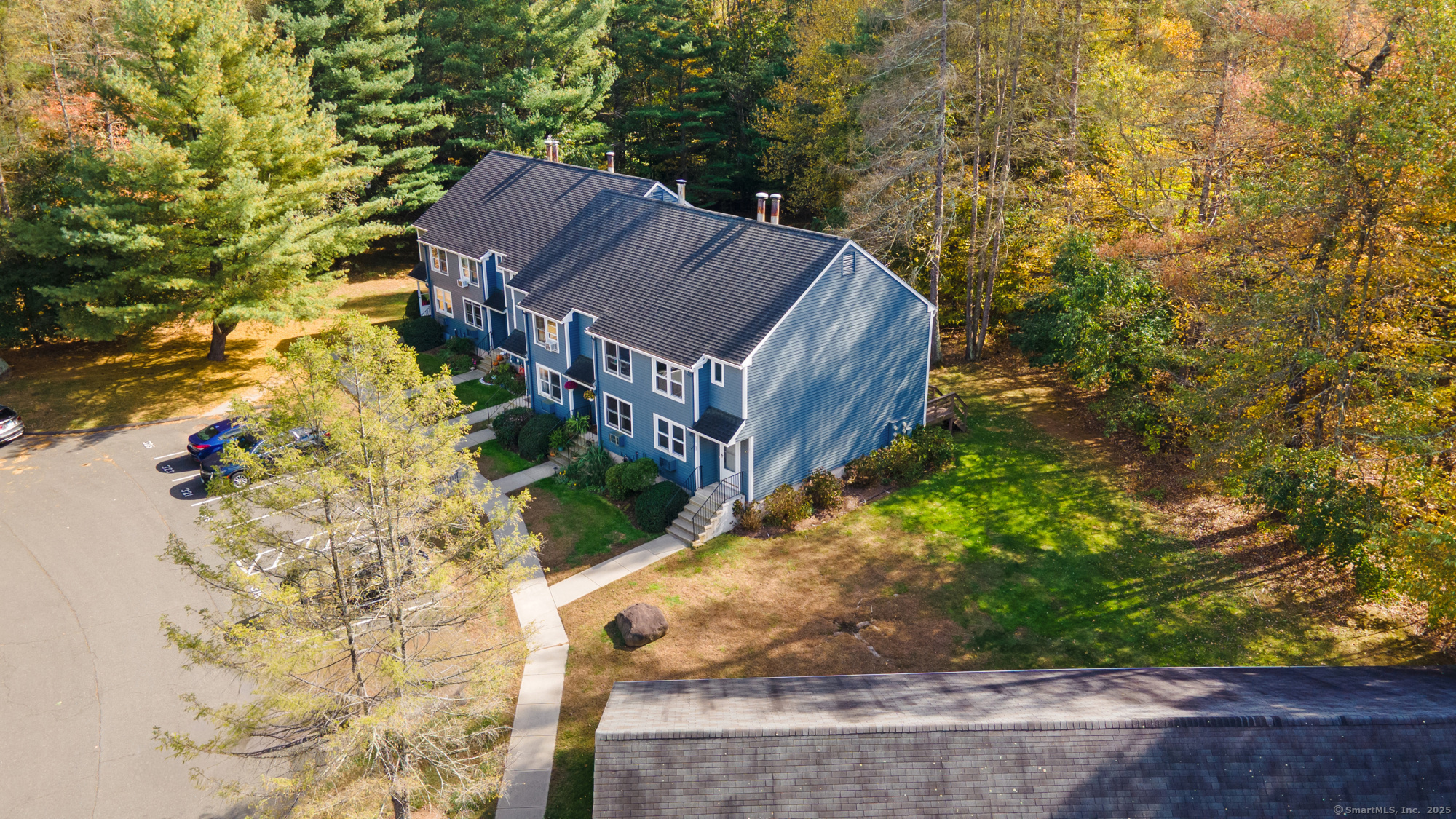 Welcome to this well-maintained end-unit condo located in a beautiful community. The main level features a large living room, recently updated eat-in kitchen equipped with stainless steel appliances, granite countertops, and a half bath. Upstairs you'll find two spacious bedrooms and an updated full bath. The home features hardwood floors throughout. Step outside to your private rear deck overlooking peaceful wooded views, perfect for outdoor dining or relaxation. Fully finished basement provides additional living space, ideal for a home office, media room, or guest suite. This unit also includes a garage and new boiler. Enjoy the community's amenities, including a clubhouse, swimming pool, and basketball court. Don't miss out on this turnkey opportunity!