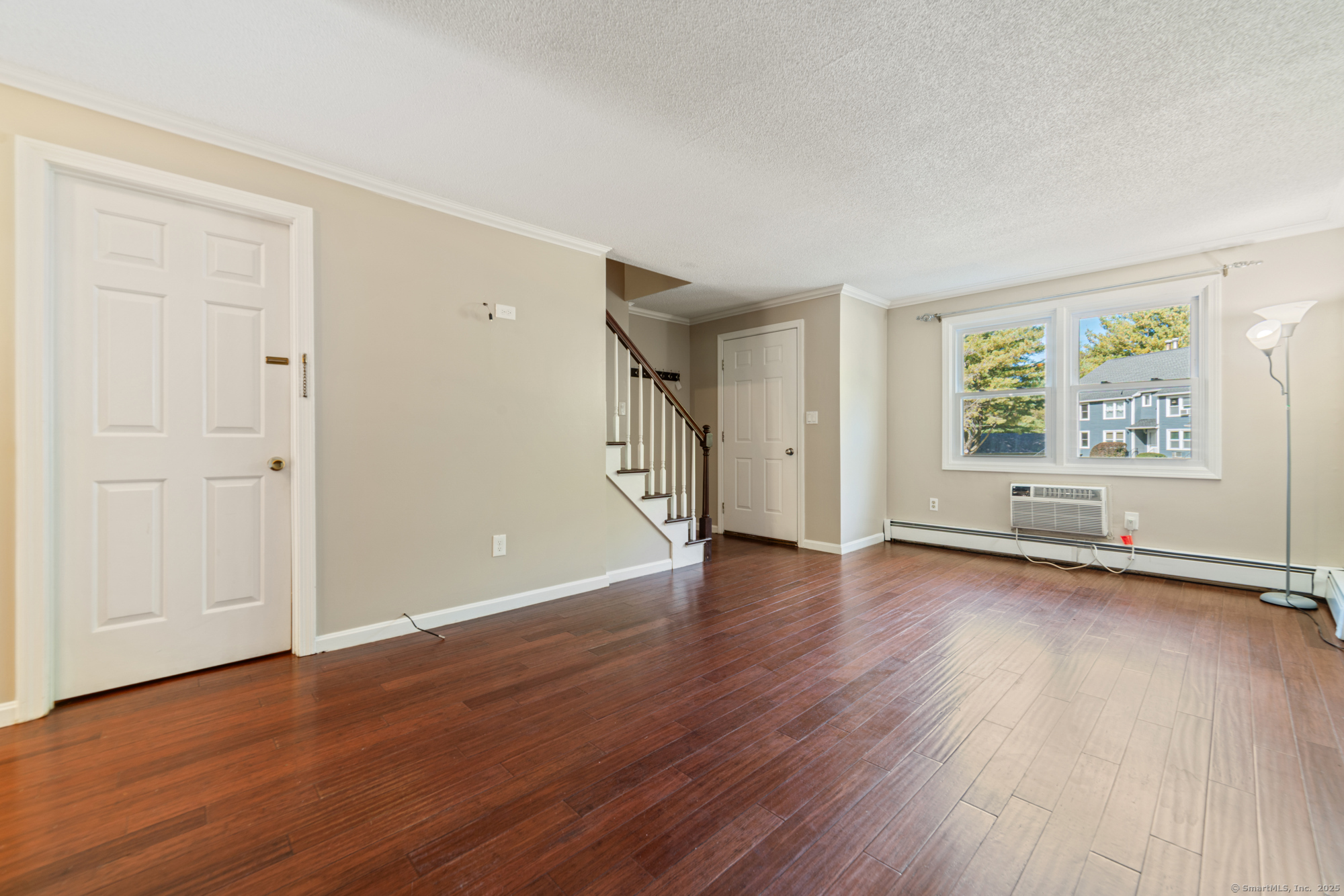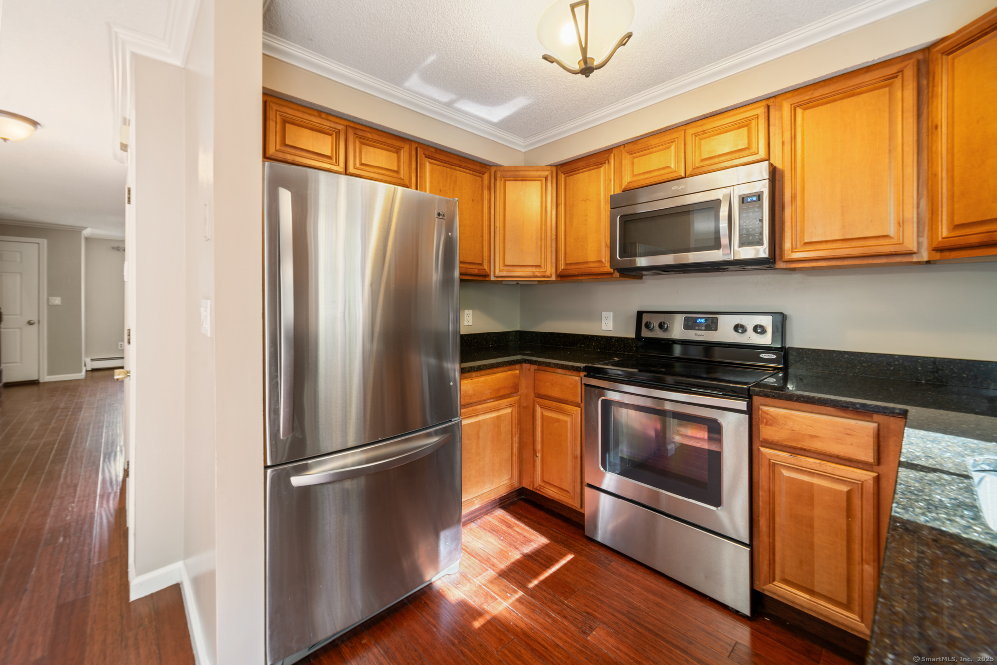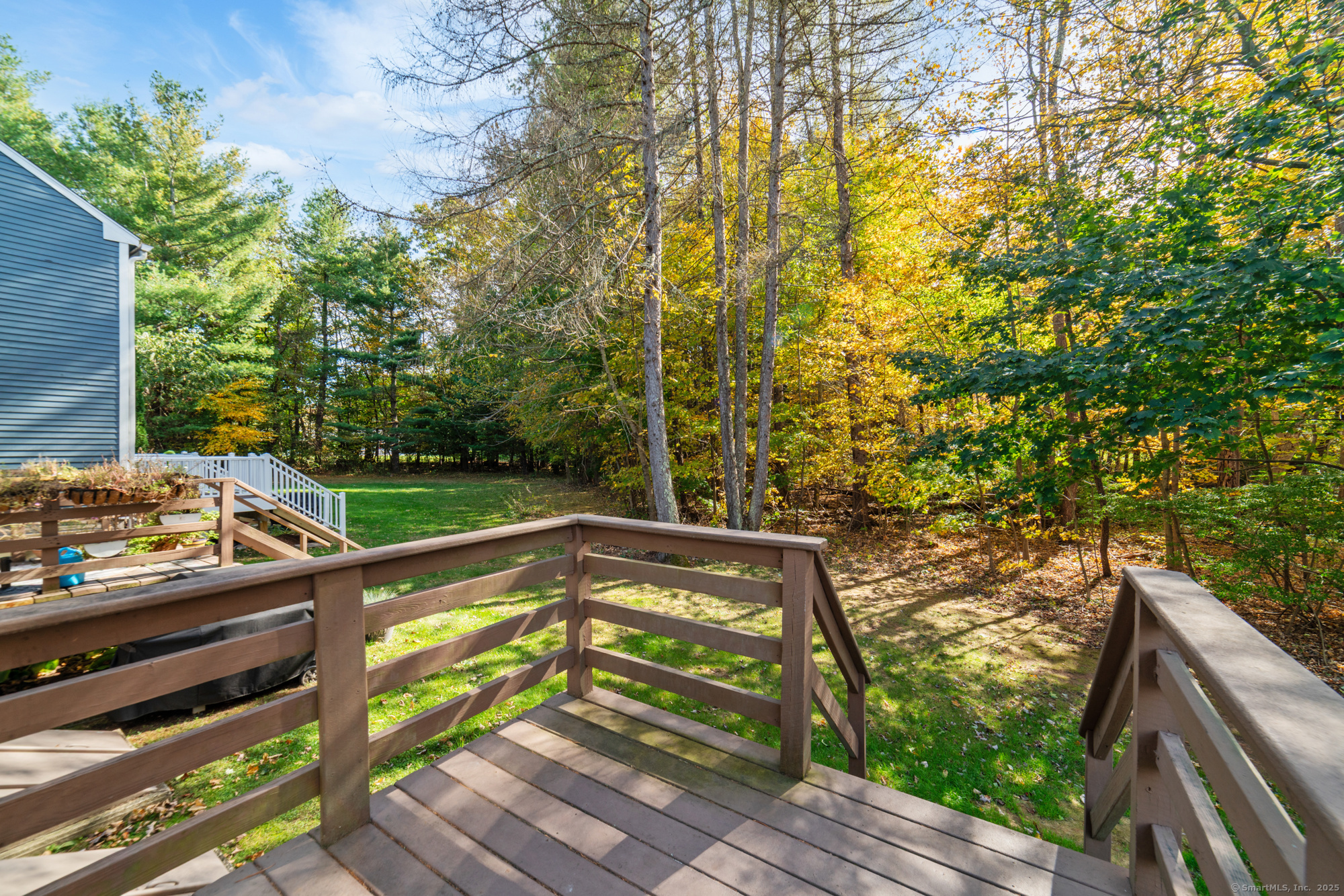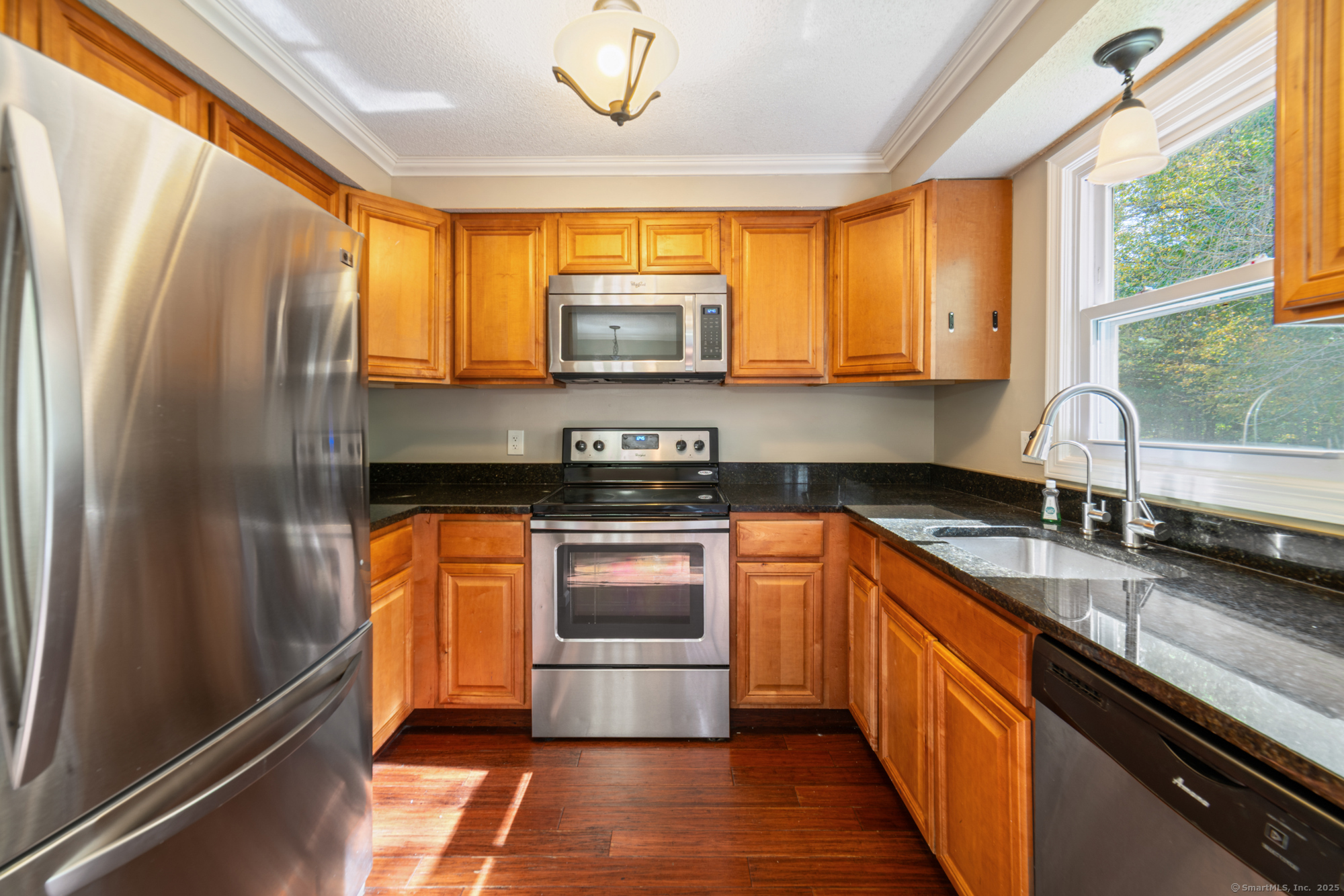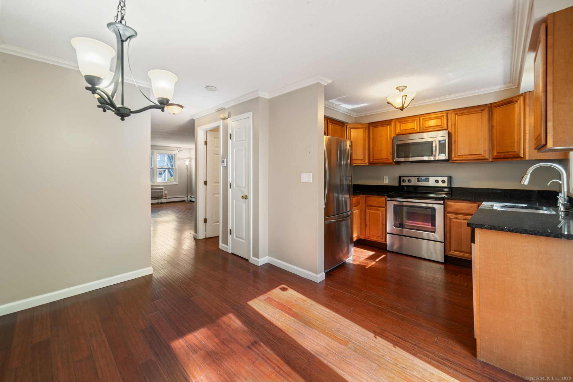 Welcome to this well-maintained end-unit condo located in a beautiful community. The main level features a large living room, recently updated eat-in kitchen equipped with stainless steel appliances, granite countertops, and a half bath. Upstairs you'll find two spacious bedrooms and an updated full bath. The home features hardwood floors throughout. Step outside to your private rear deck overlooking peaceful wooded views, perfect for outdoor dining or relaxation. Fully finished basement provides additional living space, ideal for a home office, media room, or guest suite. This unit also includes a garage and new boiler. Enjoy the community's amenities, including a clubhouse, swimming pool, and basketball court. Don't miss out on this turnkey opportunity!