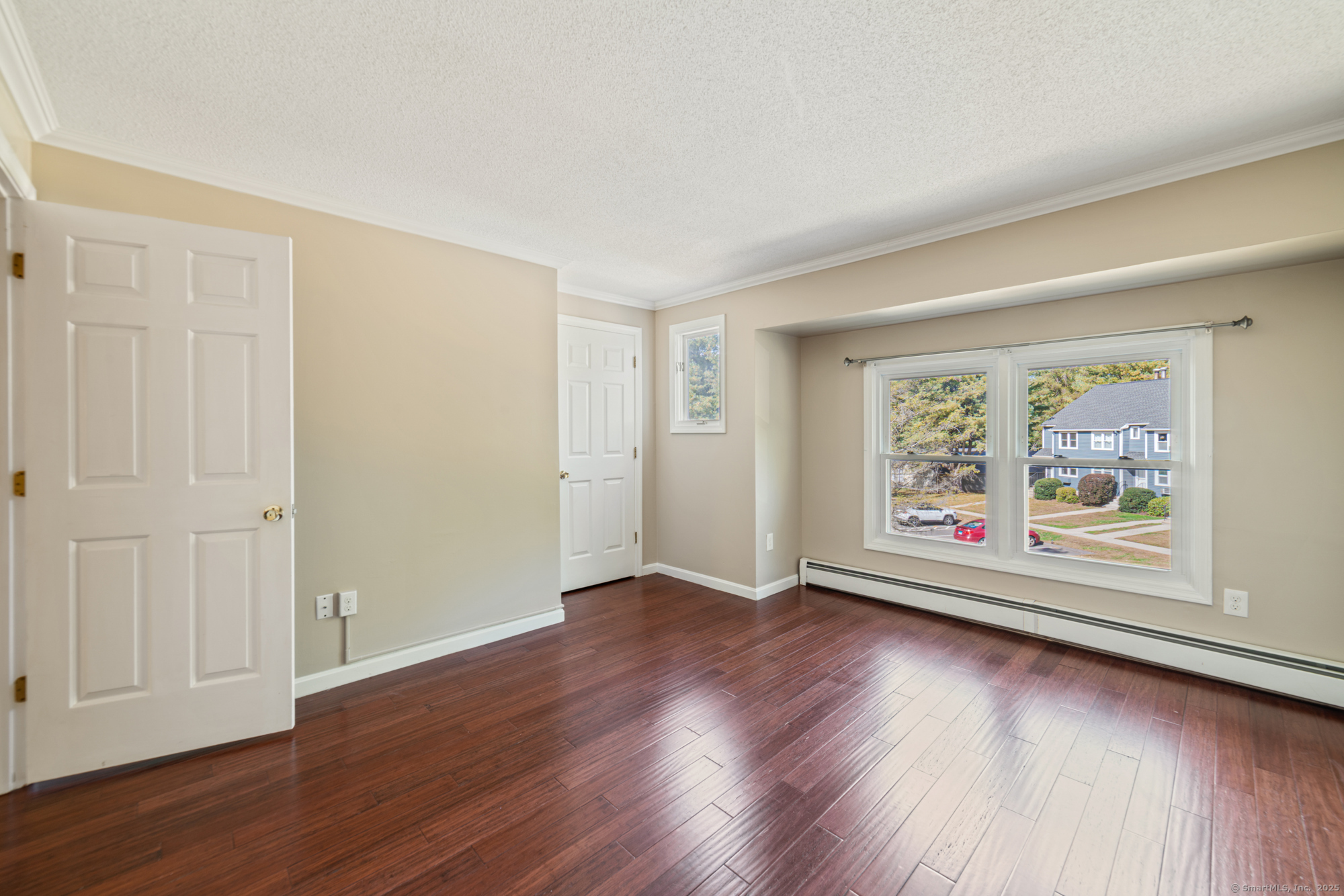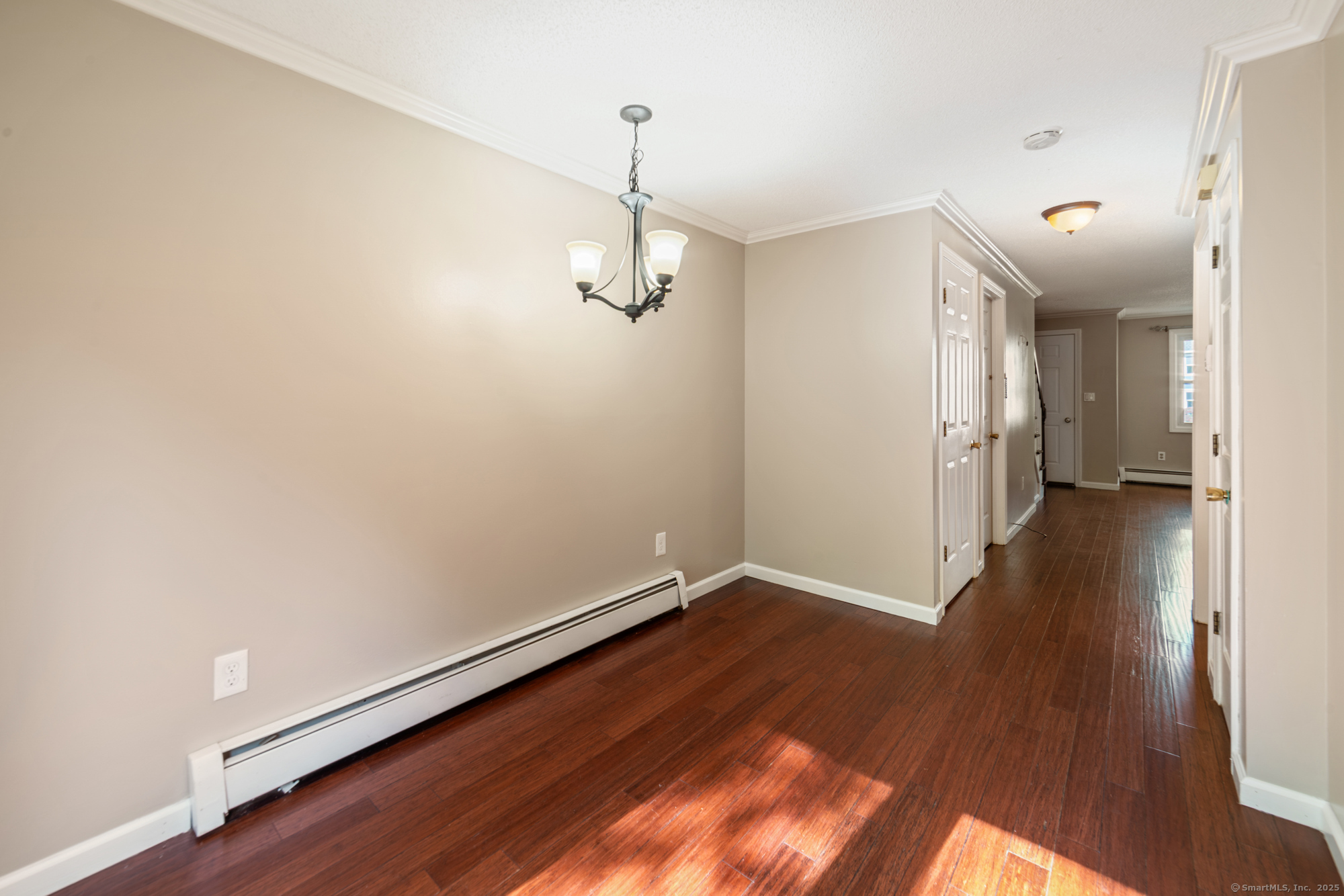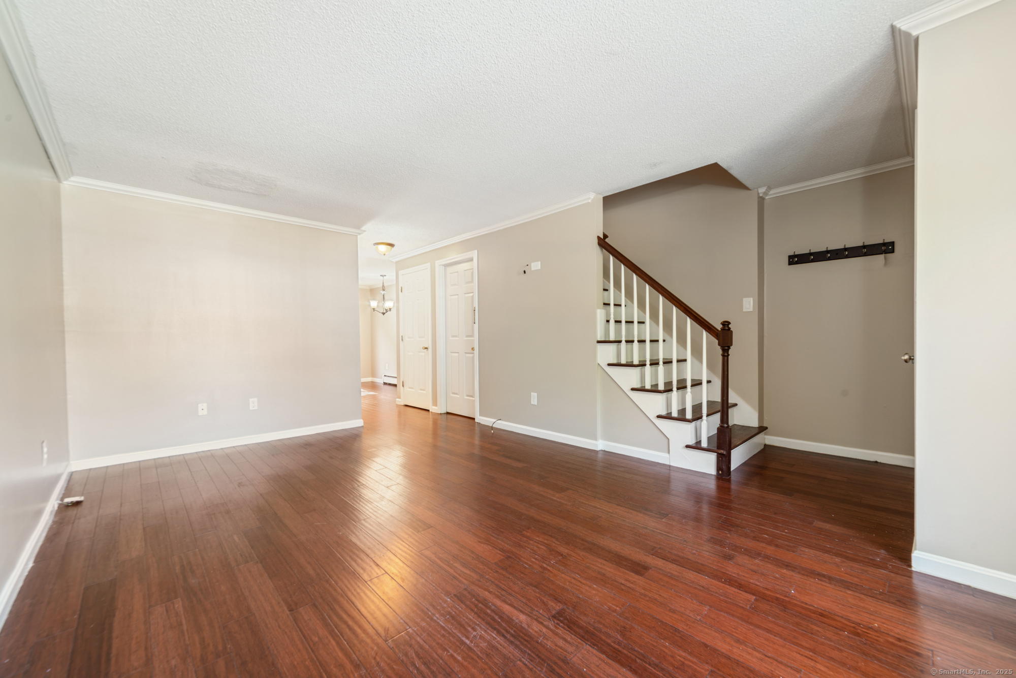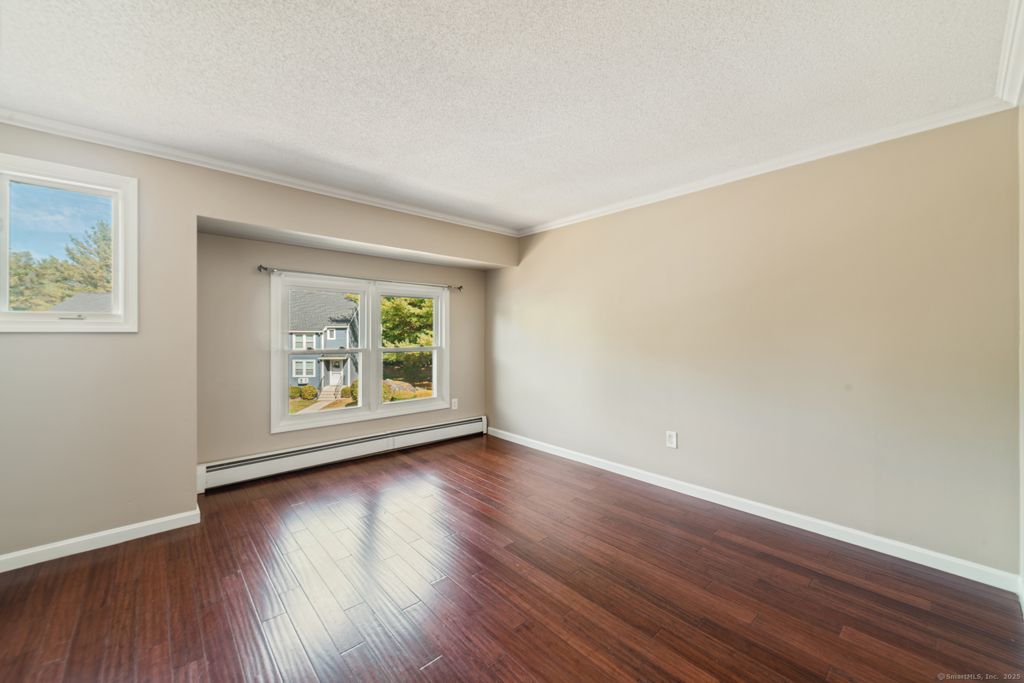 Welcome to this well-maintained end-unit condo located in a beautiful community. The main level features a large living room, recently updated eat-in kitchen equipped with stainless steel appliances, granite countertops, and a half bath. Upstairs you'll find two spacious bedrooms and an updated full bath. The home features hardwood floors throughout. Step outside to your private rear deck overlooking peaceful wooded views, perfect for outdoor dining or relaxation. Fully finished basement provides additional living space, ideal for a home office, media room, or guest suite. This unit also includes a garage and new boiler. Enjoy the community's amenities, including a clubhouse, swimming pool, and basketball court. Don't miss out on this turnkey opportunity!