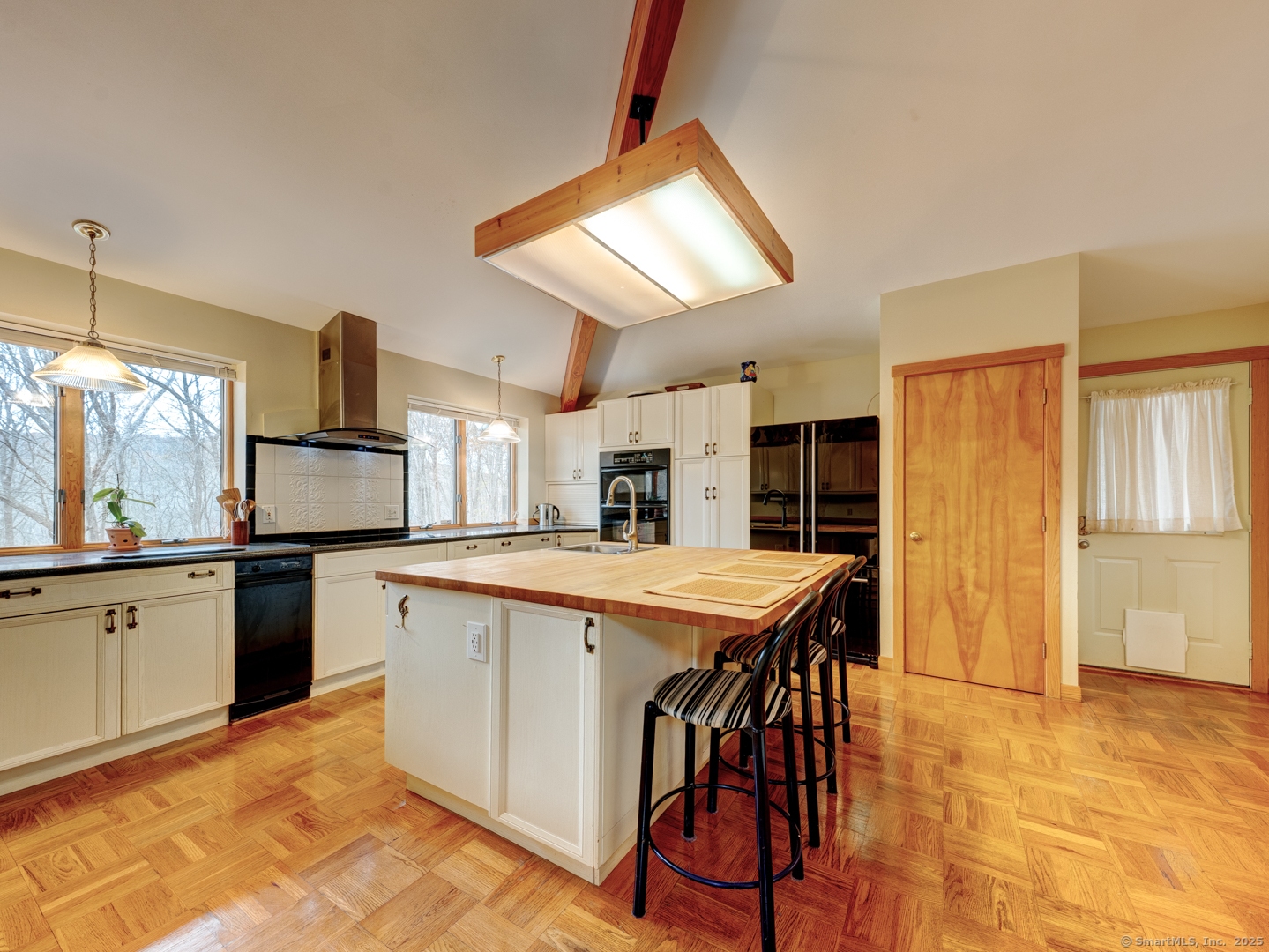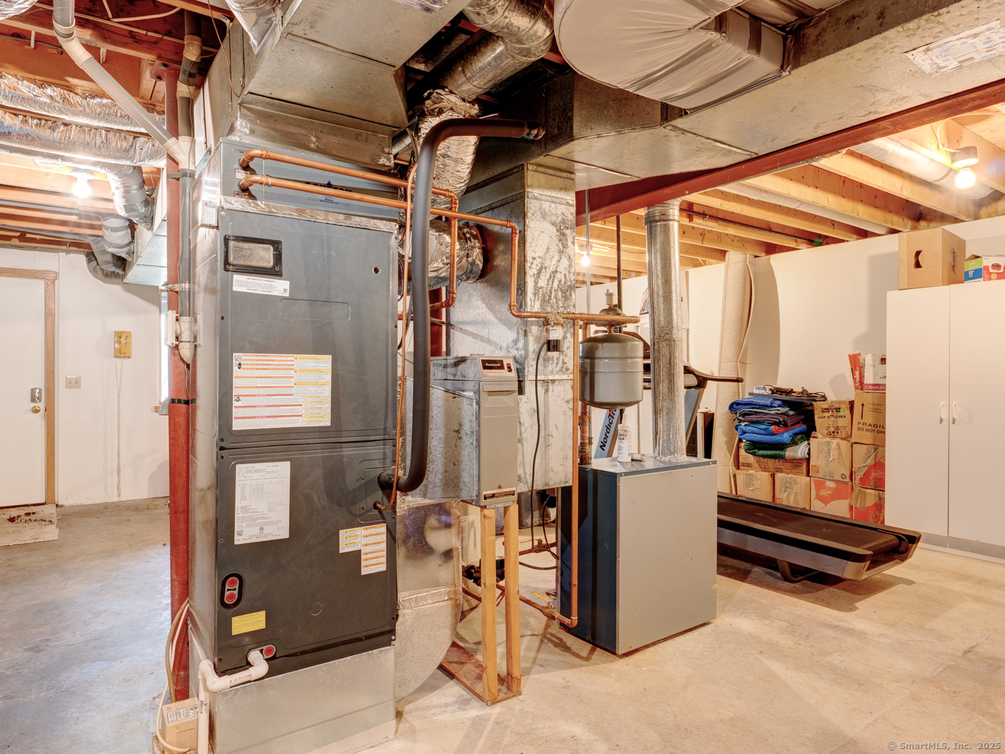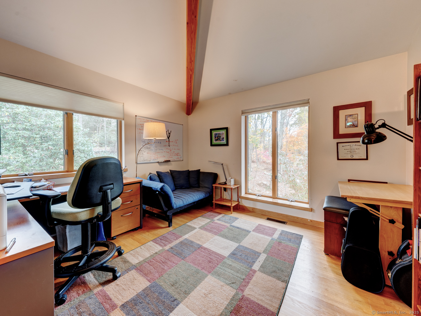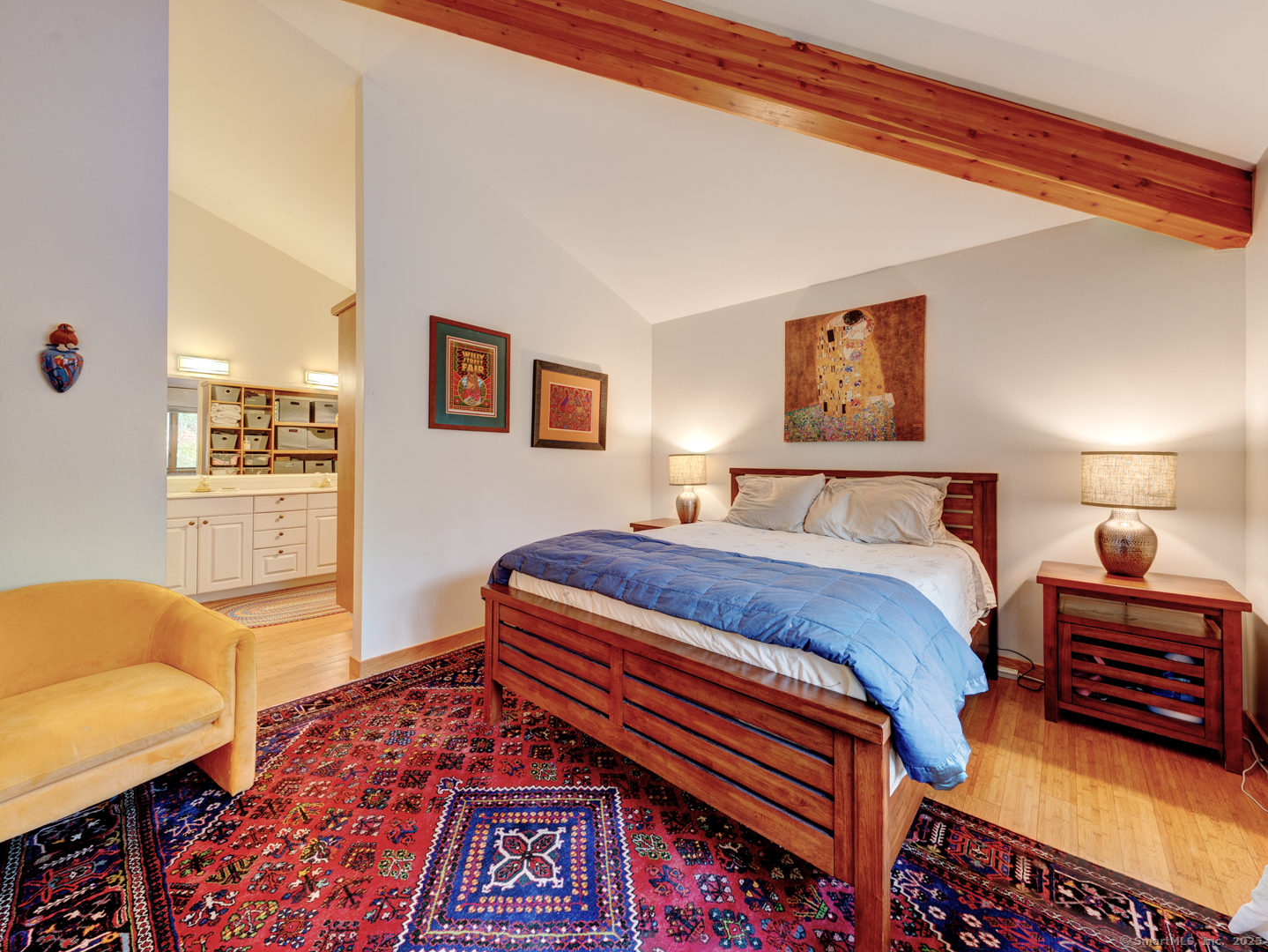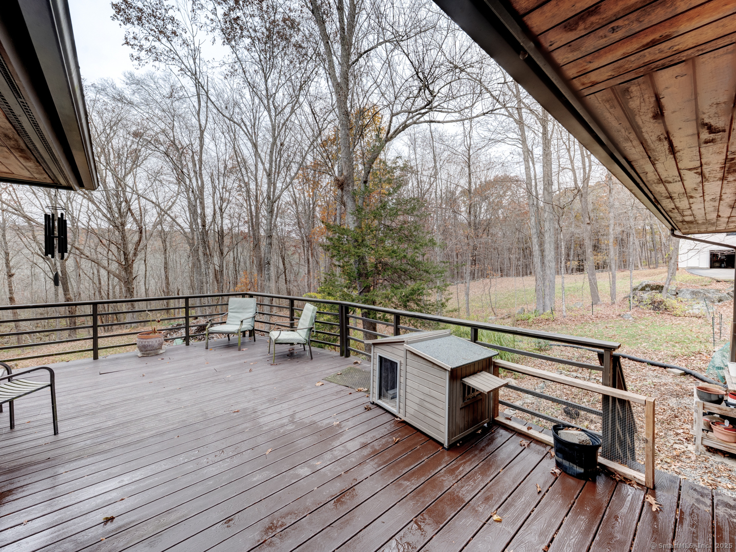 WOW is sure to be the first thing you say when you enter this unique Post and Beam Contemporary home with passive solar.& Over 2700 s.f. of heated living space. Next, you won't know where to look first. The soaring ceilings w/ exposed beams, the family room, w/ it's wall of windows and newly refinished wood floors, large enough to have 2 separate living areas, the central area has enough space to add a living room and the dining room has sliders to the wrap around Trex deck. The master suite has a custom walk-in closet, a master bath with both shower and jetted tub. The huge kitchen is a cooks dream with an induction cooktop, double wall oven, and an oversized island with sink and storage, a door leads to the wrap around Trex deck & 2 car garage.plus a separate laundry room. Don't miss the half bath and another room with many uses, currently an office, and that's just the upstairs living area. Downstairs are 3 additional nice sized bedrooms each with it's own French Door leading to a koi pond & small waterfall. There's another full bath here as well. The unfinished area allows for more expansion if needed and has a door leading to the back yard.. House boasts a newer heat pump and an air handler allowing you to regulate fresh air intake and humidity plus a whole house generator & central vac. Post and beam construction allows for extra insulation throughout. There's a gazebo, chicken coop and garden area in the back yard. The roof was new in 2017. Close to amenities, UConn