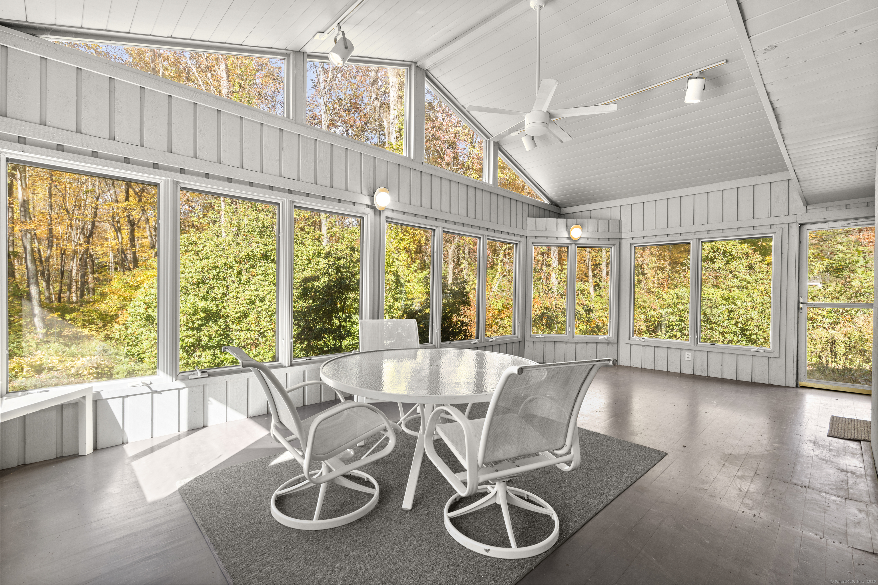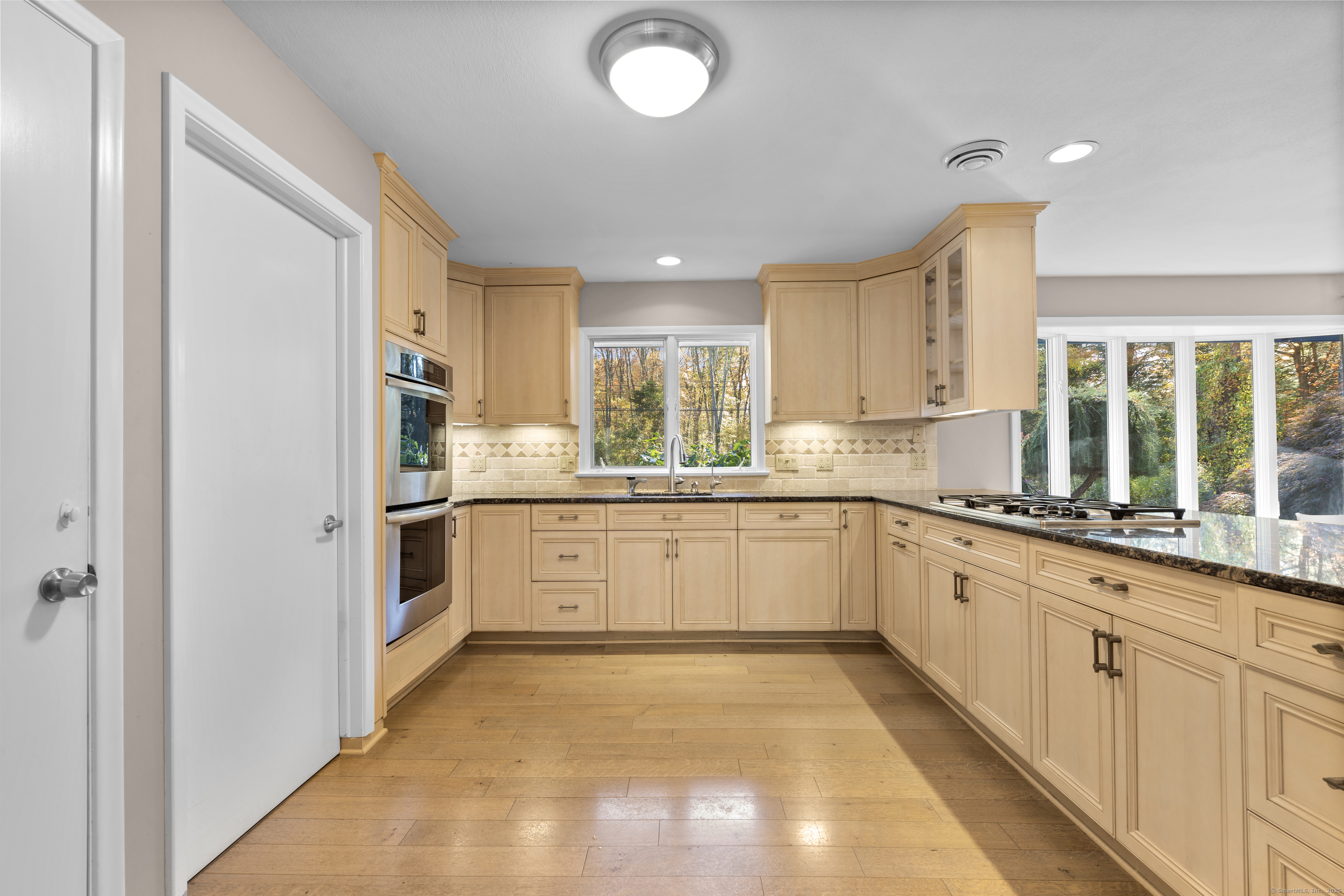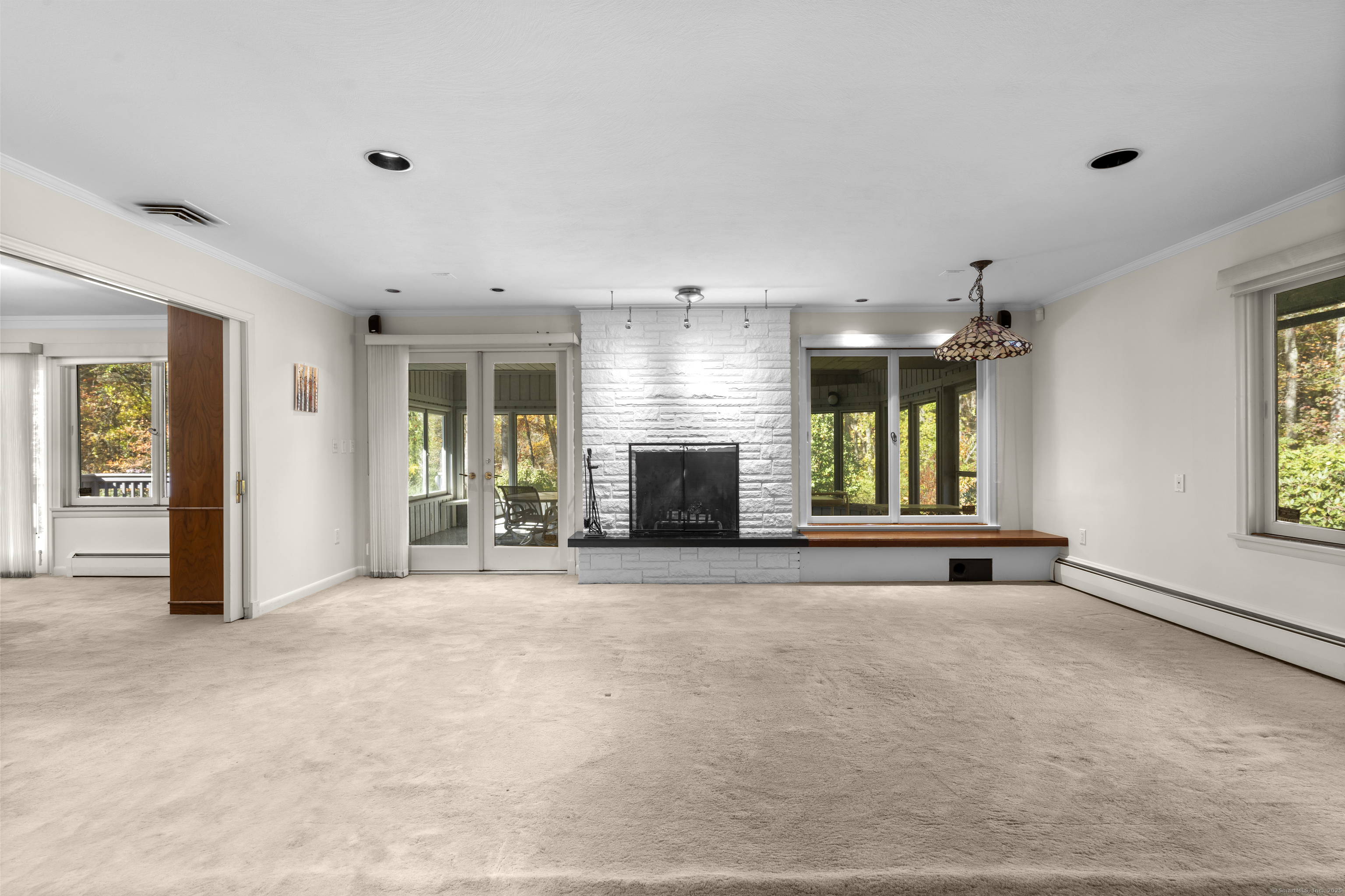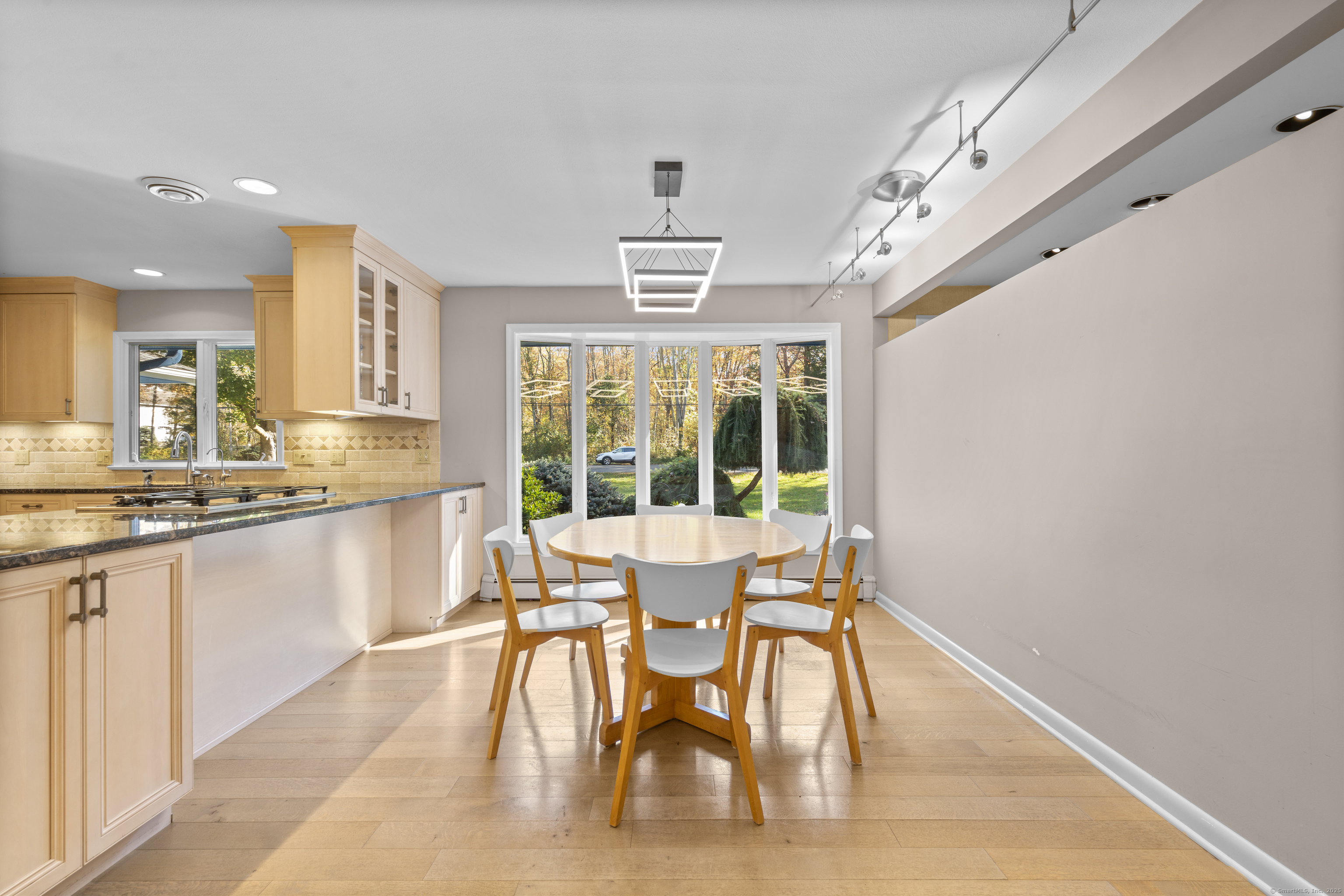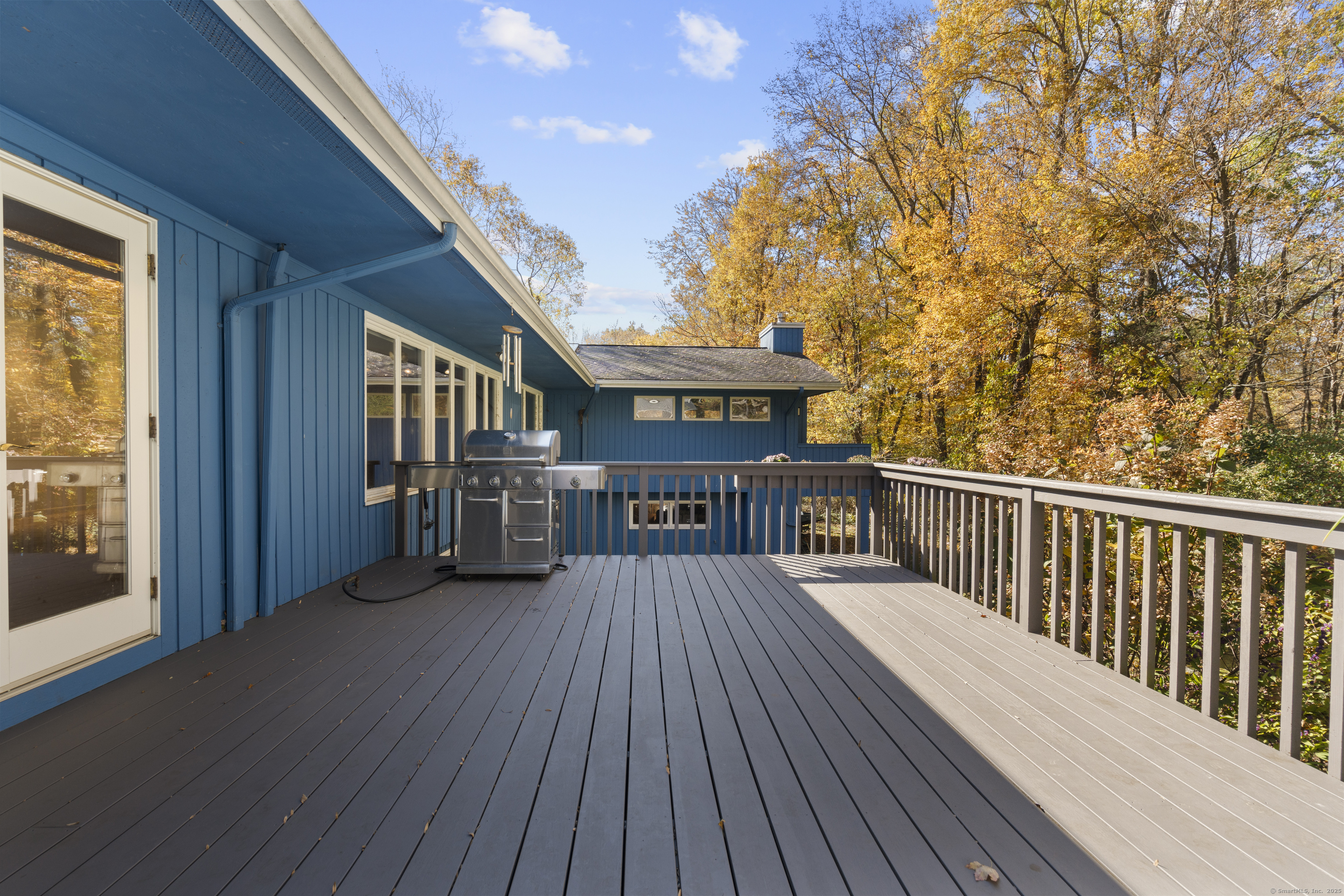 One-Level Living at Its Finest! Discover this expanded 3,522 sq. ft. ranch offering 10 rooms, 4 bedrooms, and 3.5 baths, perfectly sited on a serene 1.4-acre lot at the end of a peaceful cul-de-sac. Generously sized living spaces include an open-concept living and dining area that flows seamlessly into a family room with a fireplace and adjacent powder room-ideal for both casual gatherings and elegant entertaining. From the family room, double doors open to a three-season porch with cathedral ceilings and a large deck overlooking professionally designed gardens. Relax by the koi pond while enjoying tranquil views of Race Brook. Bathed in natural light, the fully updated eat-in kitchen features granite countertops, a breakfast bar, high-end appliances, and abundant custom cabinetry. The primary suite is a private retreat with cathedral ceilings, a luxurious updated ensuite bath, dressing area, gas fireplace, and its own private deck-making every morning a joy. A spacious study with garden views can be accessed from either the suite or the main hallway. Three additional bedrooms, a full bath, and a laundry room complete the main level. The lower walk-out level offers an additional 1,035 sq. ft. of finished living space, including full-height windows, a full bath, and two large walk-in cedar closets-perfect for a guest suite, media room, or home gym. Additional features include multi-zone heating, two-car garage with a Tesla charging station and whole house generator.