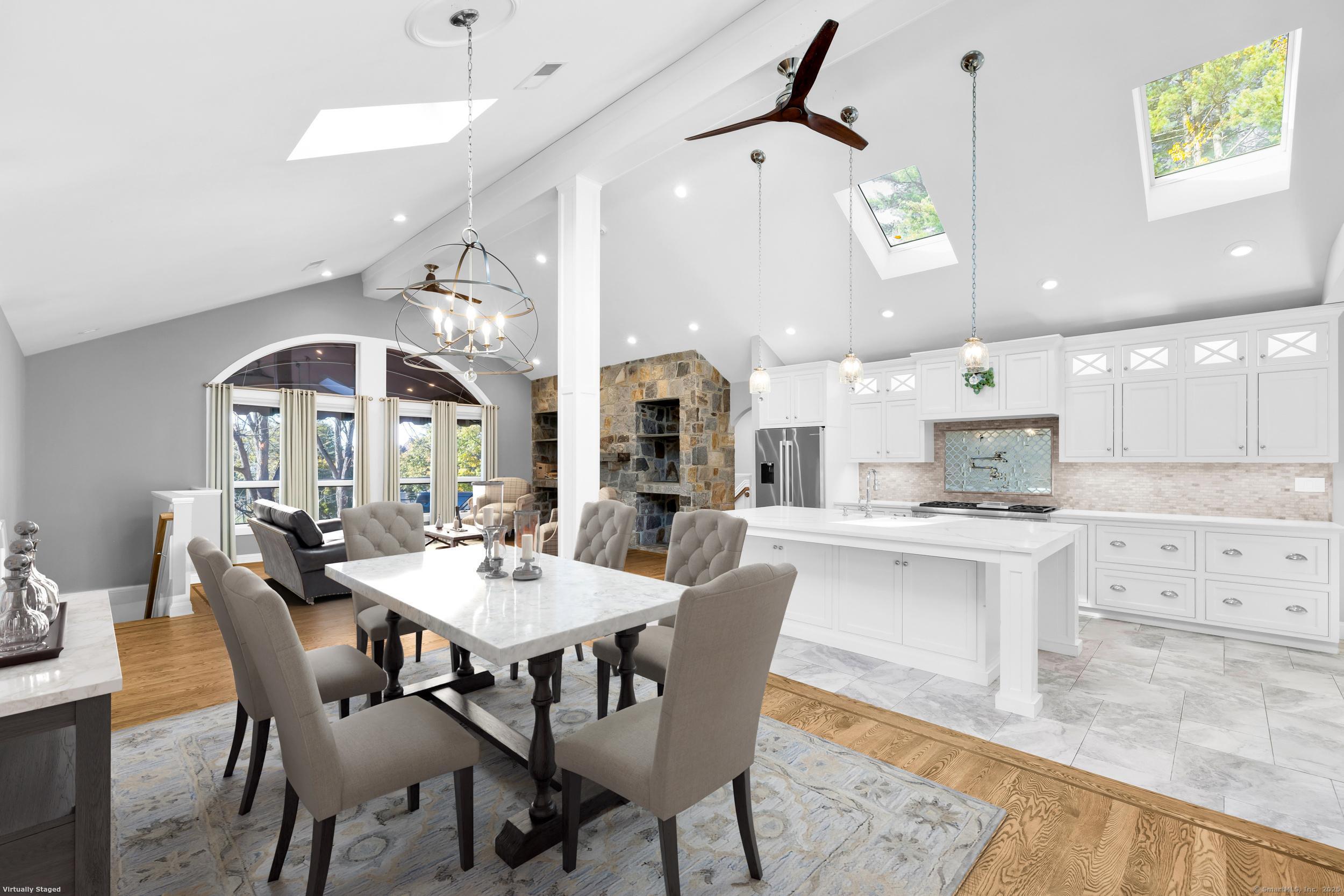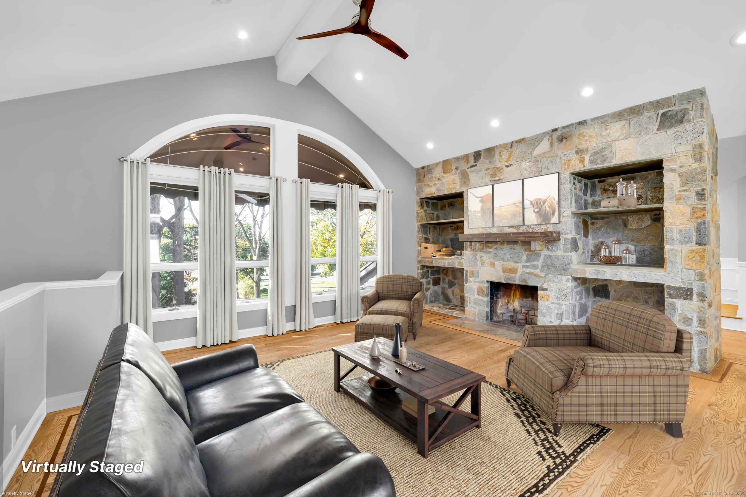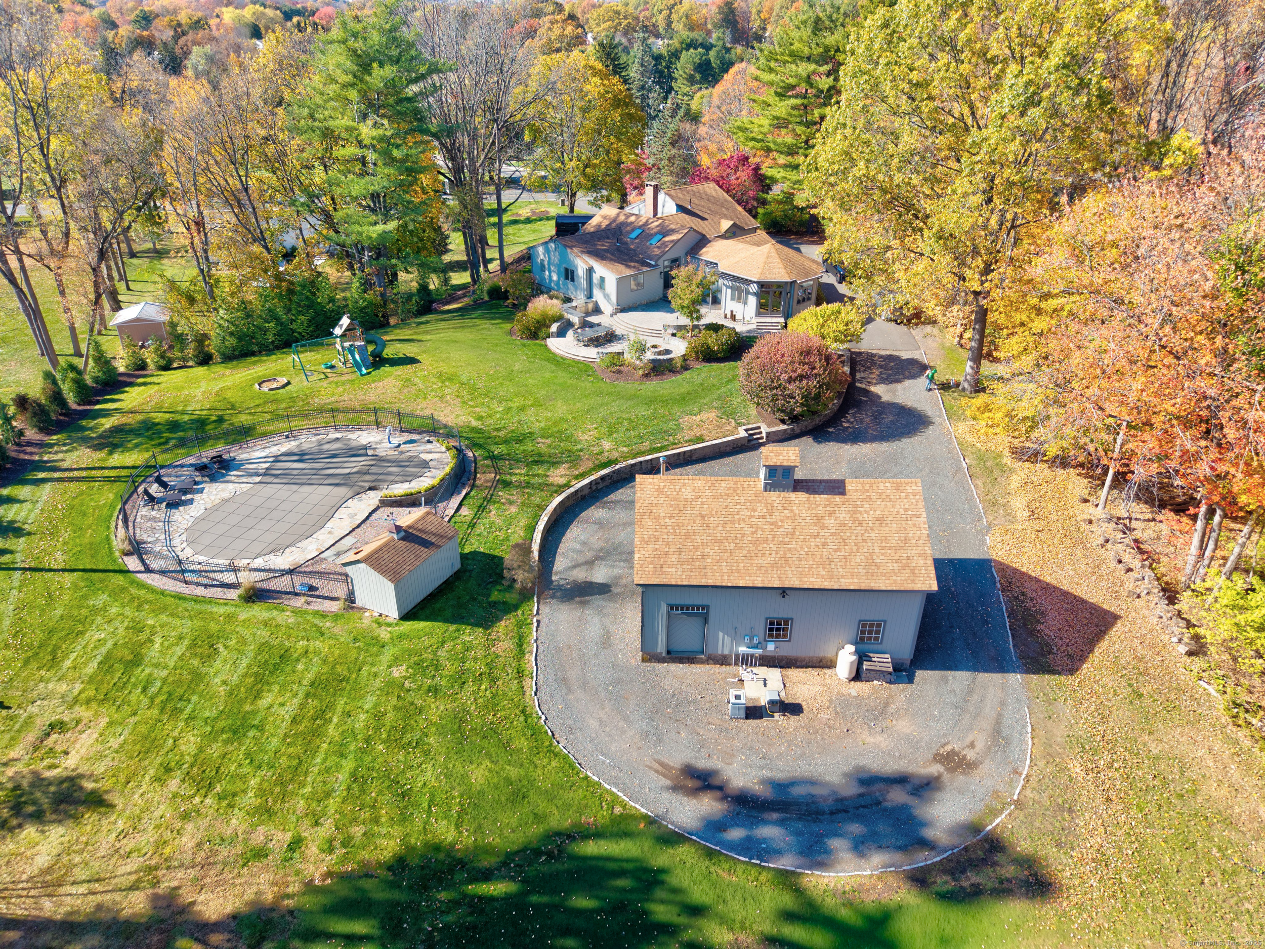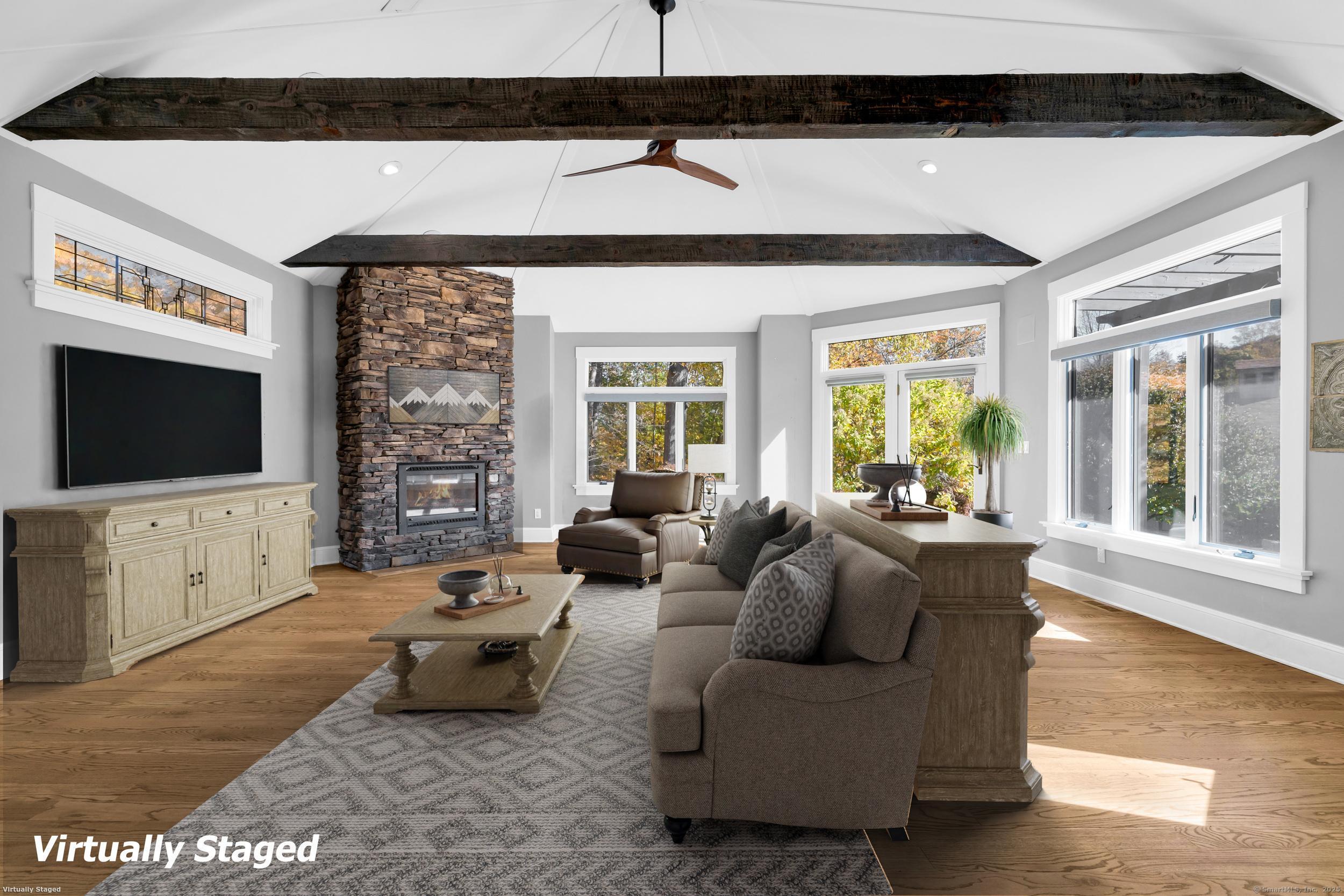 Welcome to a Home that feels like a Private Retreat. Fully renovated kitchen and baths, stone patio with built-in outdoor grill & stone fire pit, heated, salt water, in-ground pool & hot tub. This home blends warmth with modern comfort. Lutron lighting throughout sets the perfect mood, while professional landscaping with stone masonry leads you to the resort-style backyard. Enter through the lower level to a cozy living space with gas fireplace, two bedrooms, and a full bath-ideal for guests or a home office setup. Upstairs, the heart of the home, features an open kitchen, dining, and family area with cathedral ceilings. The kitchen has a farmhouse sink, pot filler, and dual Thermador gas/electric range with steam oven. A second family room with gas fireplace adds additional comfort. A step up leads to the serene primary suite, complete with custom walk-in closet, steam shower, and clawfoot tub. Two additional bedrooms and another full bath sit just off the main living area. The living room offers cathedral ceilings, wood beams, recessed lighting, Sonos surround sound, and direct access to the patio and pool-perfect for entertaining. An additional barn provides endless potential for storage, studio, workshop, or personal retreat. Backing up to Patterson Elementary, the setting feels private, peaceful, and convenient.