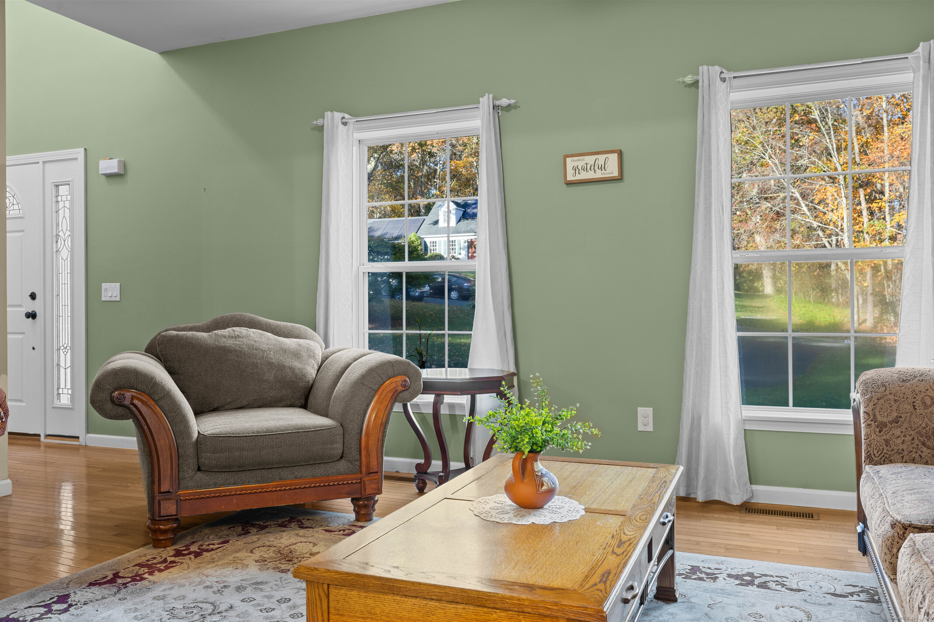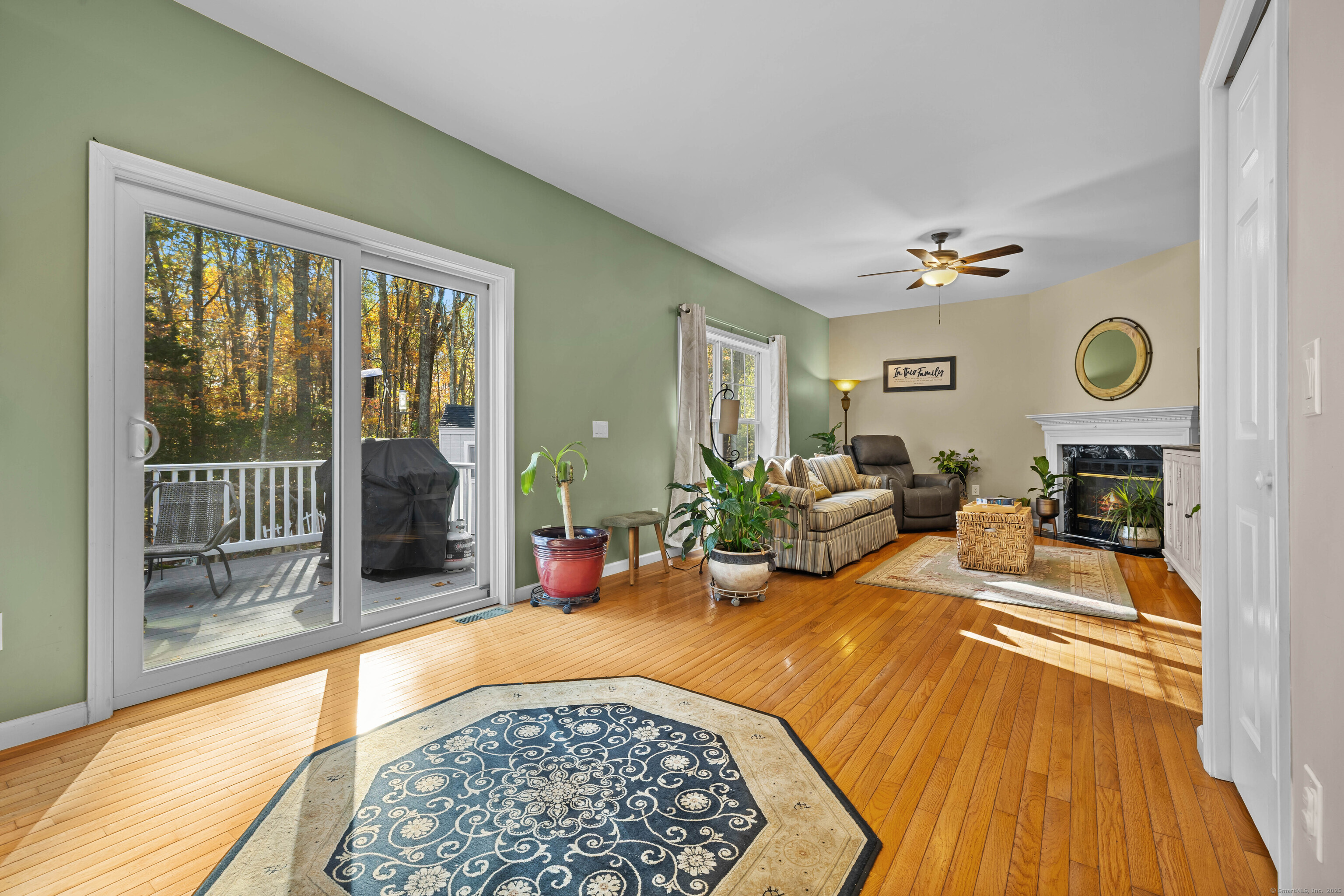 Welcome to this beautifully maintained colonial set on a private, wooded lot surrounded by the colors of every New England season. The home greets you with timeless curb appeal-double-door garage, a welcoming front porch, and a graceful arched window that fills the foyer with natural light. Inside, gleaming hardwood floors flow through an open-concept main level featuring a granite-topped kitchen with maple cabinetry, stainless steel appliances, and a center island that connects seamlessly to the family room and dining area. Enjoy cozy evenings by the fireplace or step outside through the sliding glass doors to a spacious deck overlooking peaceful wooded views. Upstairs, the primary suite features generous proportions, abundant sunlight, and hardwood flooring throughout. Additional bedrooms provide flexibility for guests, a home office, or creative space. The home includes a full basement, an attached two-car garage, and a paved driveway with extra parking. Surrounded by mature trees and landscaped grounds, this residence blends comfort, privacy, and everyday convenience in one exceptional setting.