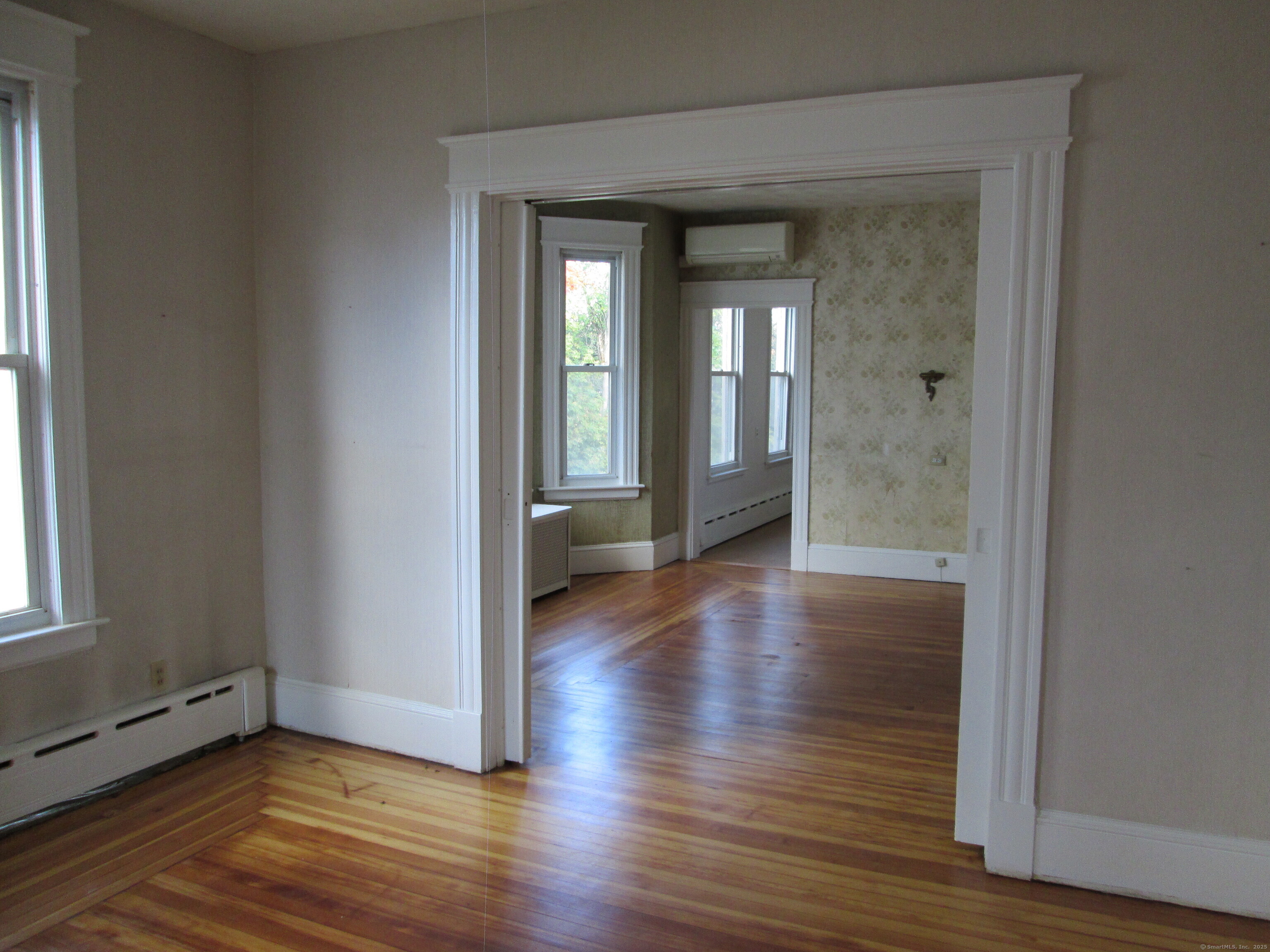 This two family is bright, spacious and comfortable and awaiting finishing touches. It is ideal for both owner occupants or investors. Conveniently located to shopping, parks, schools, highways and public transportation. First floor: 4 mini-splits for air conditioning, gas furnace, new laminate flooring in kitchen, hallway and one bedroom. Second floor: 4 new mini-splits for both heating and air conditioning, new laminate flooring in kitchen. Hardwood flooring refinished throughout. All trim painted. Three new electric meters and hardwired smoke detectors installed. Replacement windows on both floors. Each floor has a pantry and enclosed porch. Walkout basement divided into 2 sections. One gas hot water heater for both floors. Extended family had occupied this house for 67 years. The Town lists this property as a two family but there is no second egress. Property is being sold "as is."