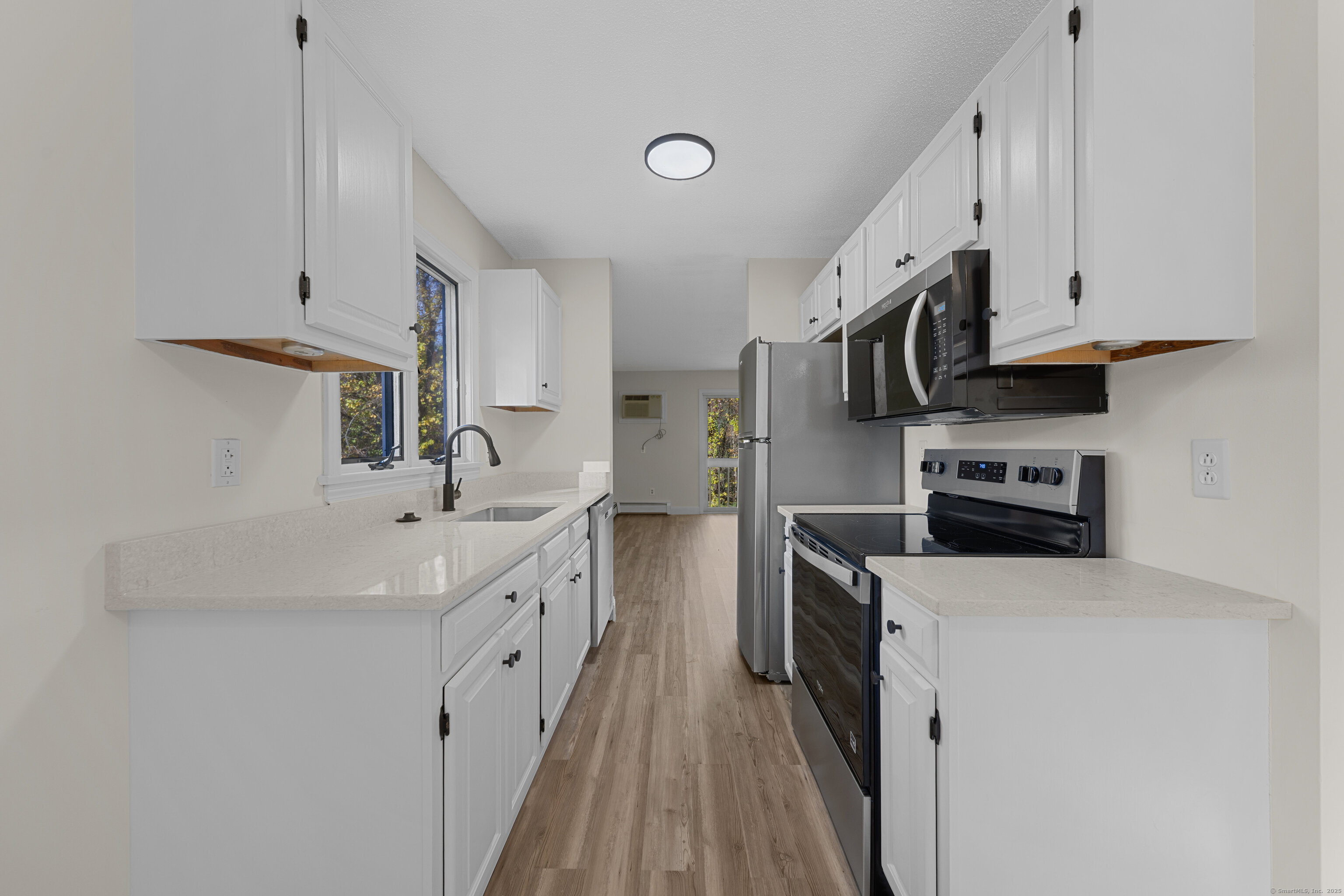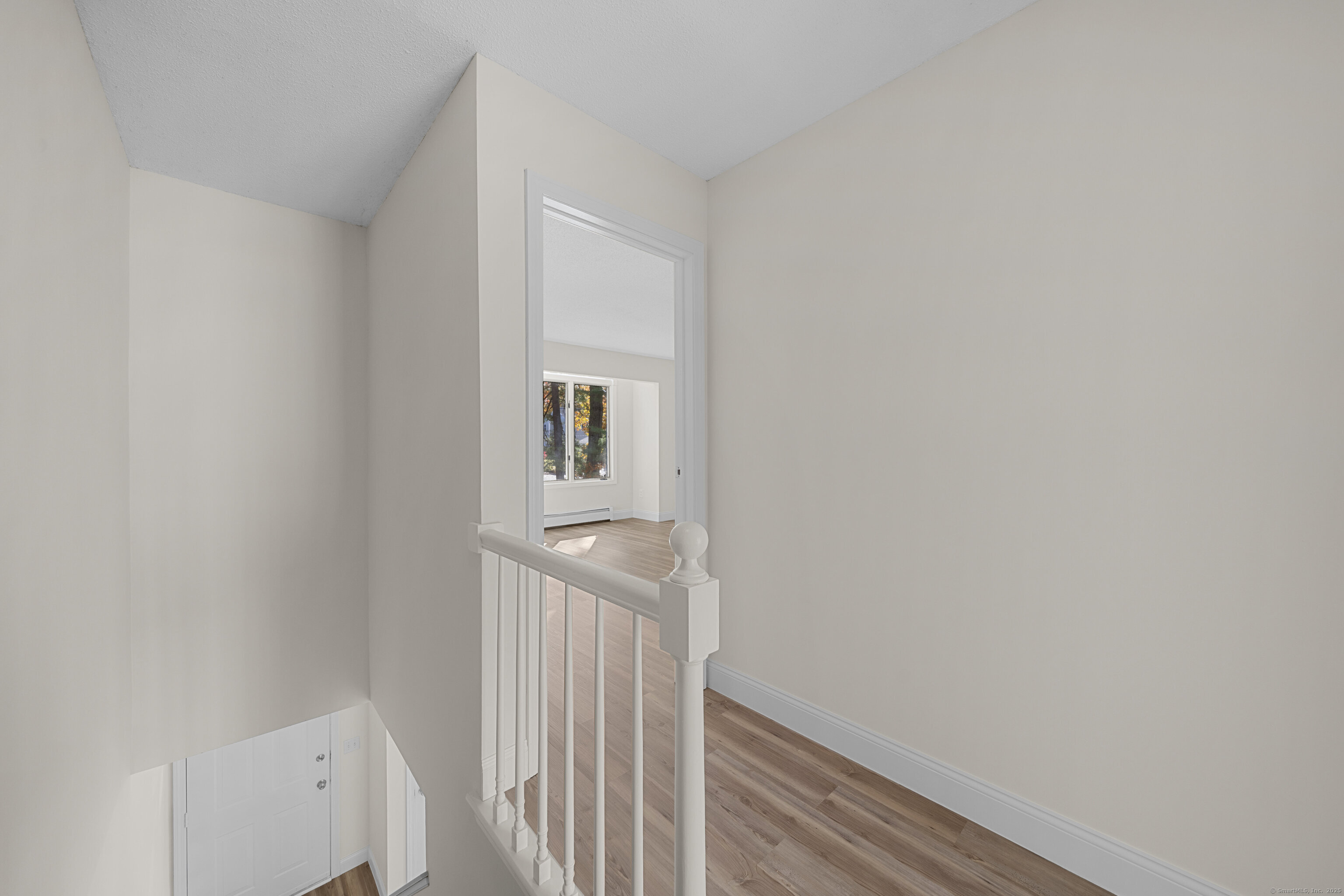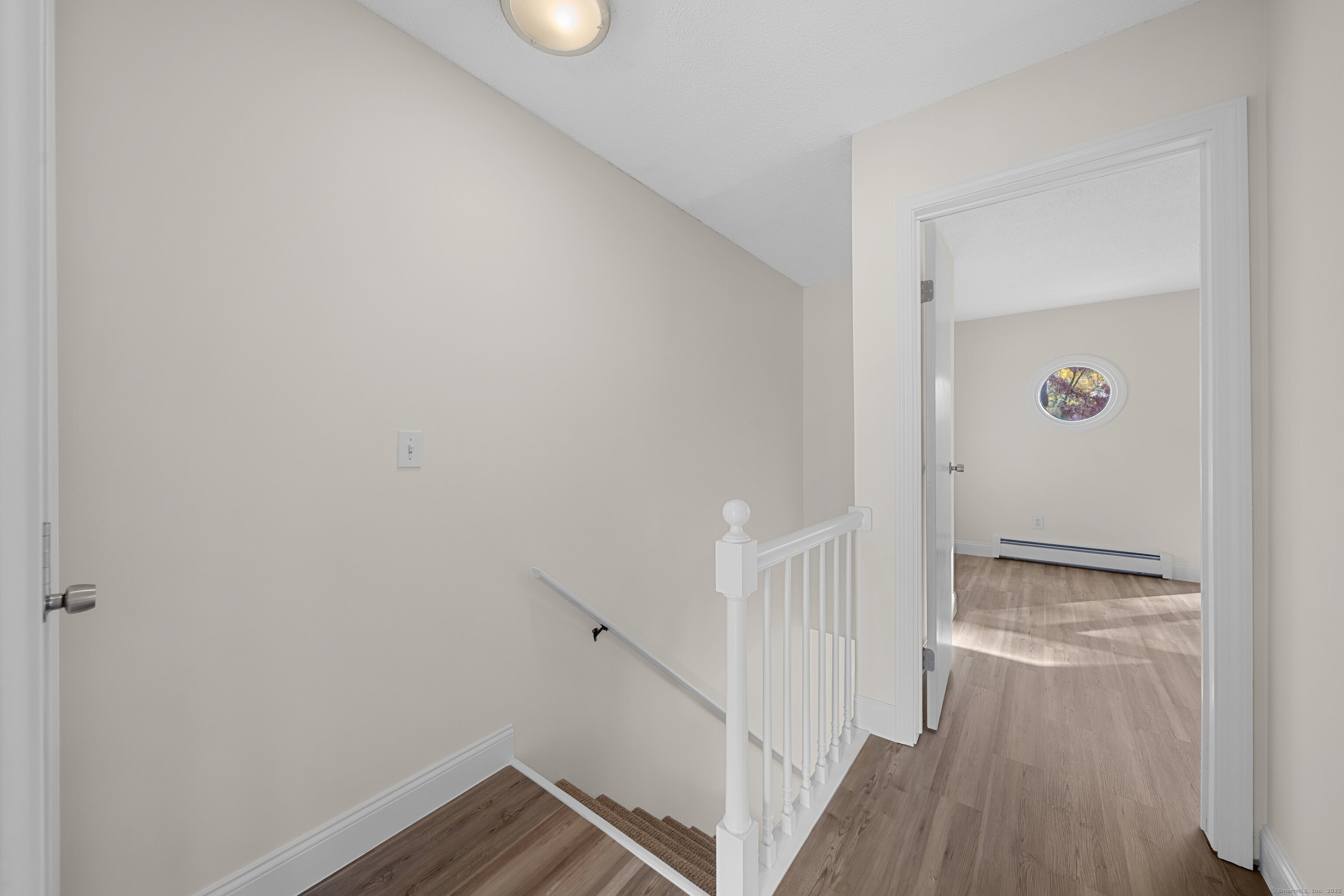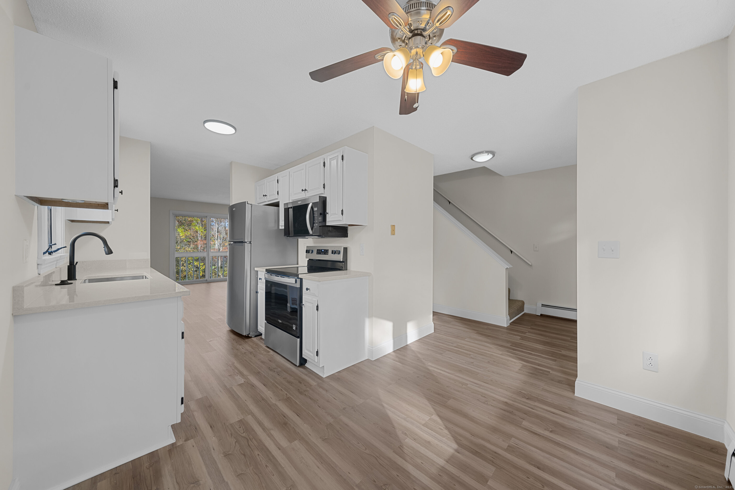 Fully renovated, bright end-unit townhouse! This sunny 2BR, 1.1BA condo features a spacious eat-in kitchen with bay window, open living room with vinyl floors, ceiling fan, and sliders to a private balcony with seasonal pond views. Upstairs, the primary bedroom offers another private balcony and ample closet space, plus an updated full bath and generous second bedroom. New carpet, fresh paint, newer windows, and decks-no future assessments! Enjoy a full basement with washer/dryer, low $259 condo fee, and plenty of parking. Quiet location, yet close to shopping, dining, and the lake.