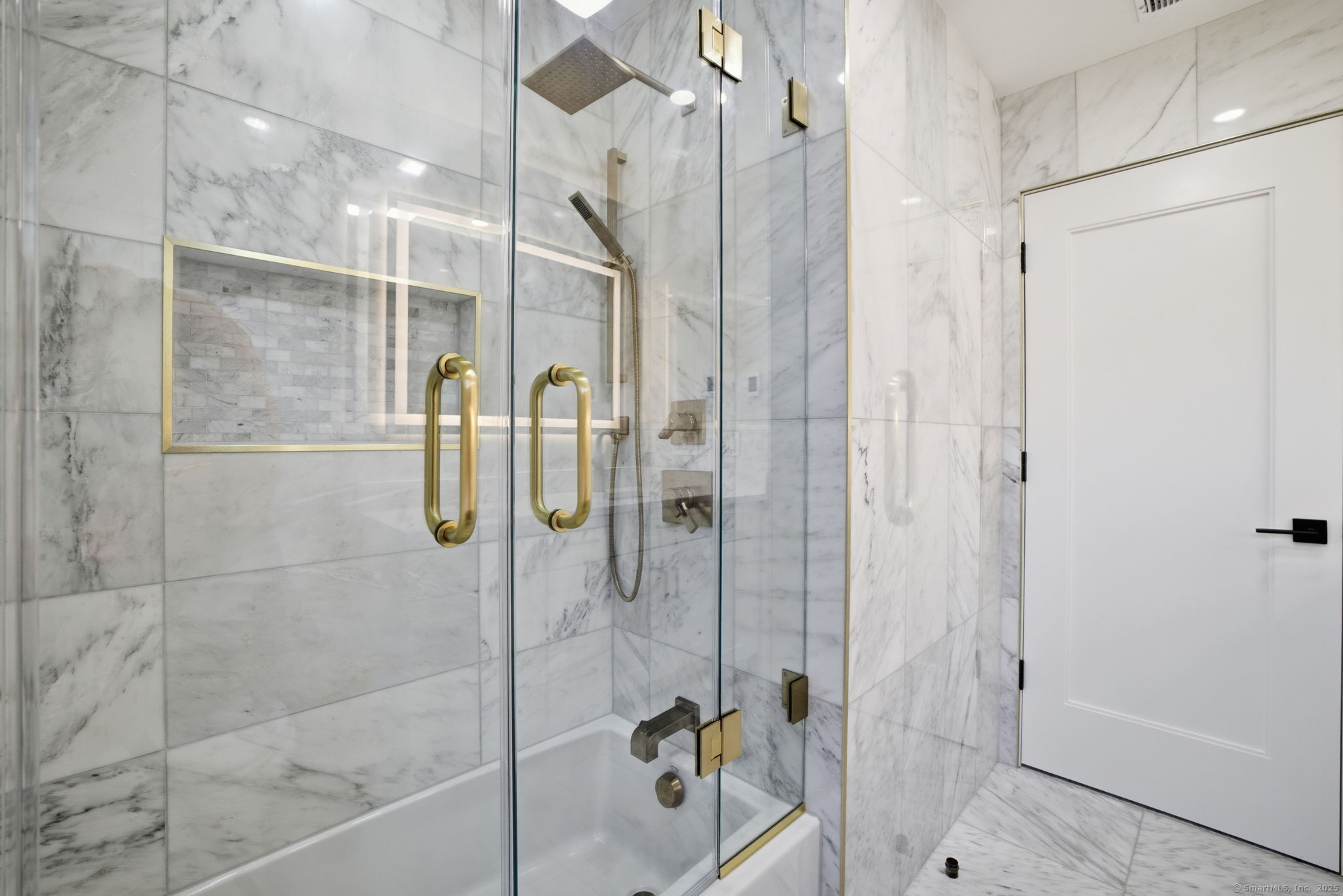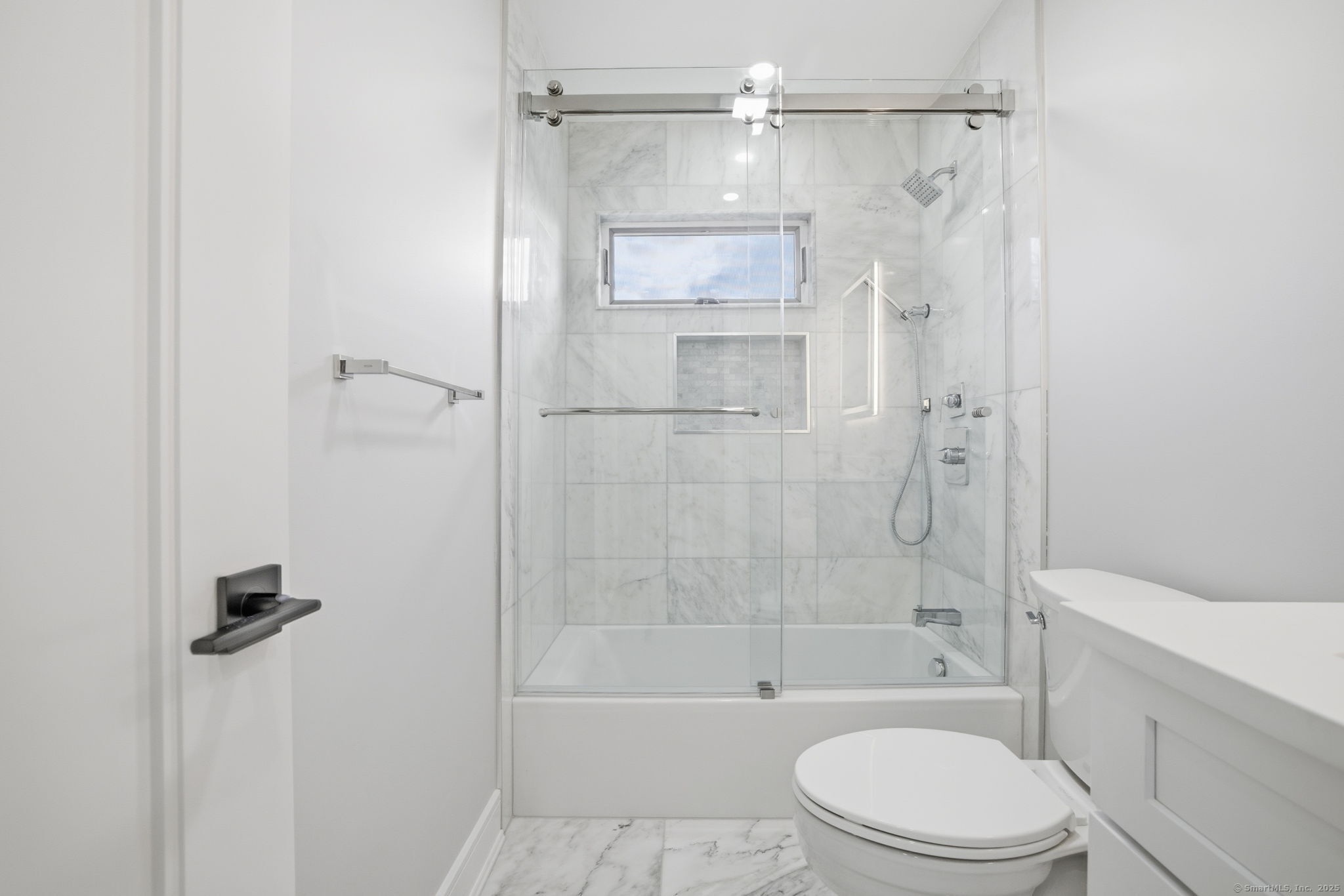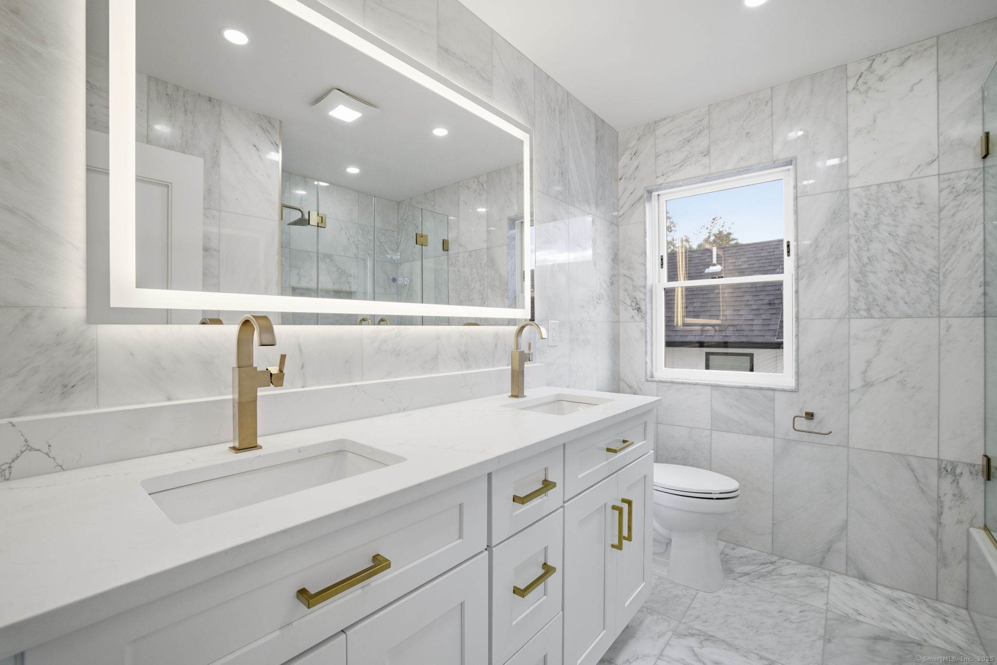 Welcome to this completely renovated 3-bedroom, 3.5-bath luxury home in Greenwich. This stunning residence has been fully updated from top to bottom, featuring a brand-new roof, plumbing, and electrical systems. Designed for modern living, the home offers high-efficiency appliances, Andersen windows, central air, gas furnace, and a tankless water heater-ensuring comfort, performance, and low utility costs. Ideal commuter location with easy access to shopping, dining, I-95. The main level showcases a beautifully appointed eat-in kitchen with direct deck access, perfect for entertaining. The kitchen features white shaker cabinets, granite countertops, a large island, stainless steel appliances, and a stylish backsplash. The sun-filled living room highlights elegant hardwood inlays, and a half bath completes this level. Upstairs, the primary suite offers a true spa-like retreat with marble walls, heated marble floors, and a walk-in closet. Two additional bedrooms share a full bath with a shower/tub combo, also finished with marble walls and heated floors. Beautiful hardwood flooring continues throughout the main and upper levels. The lower level provides exceptional versatility, featuring a full bath, bonus room, white shaker cabinets with sink, and washer/dryer hookups-ideal for an in-law suite, guest area, home office, or family/playroom. A detached oversized one-car garage adds convenience an additional storage. Schedule your private viewing today, this home won't last
