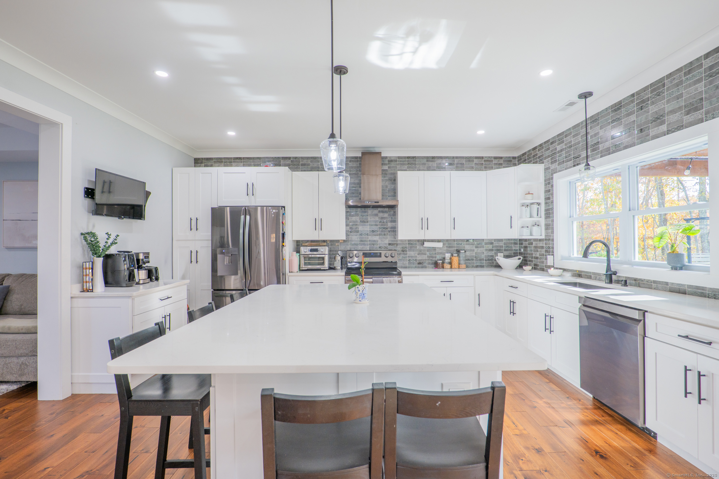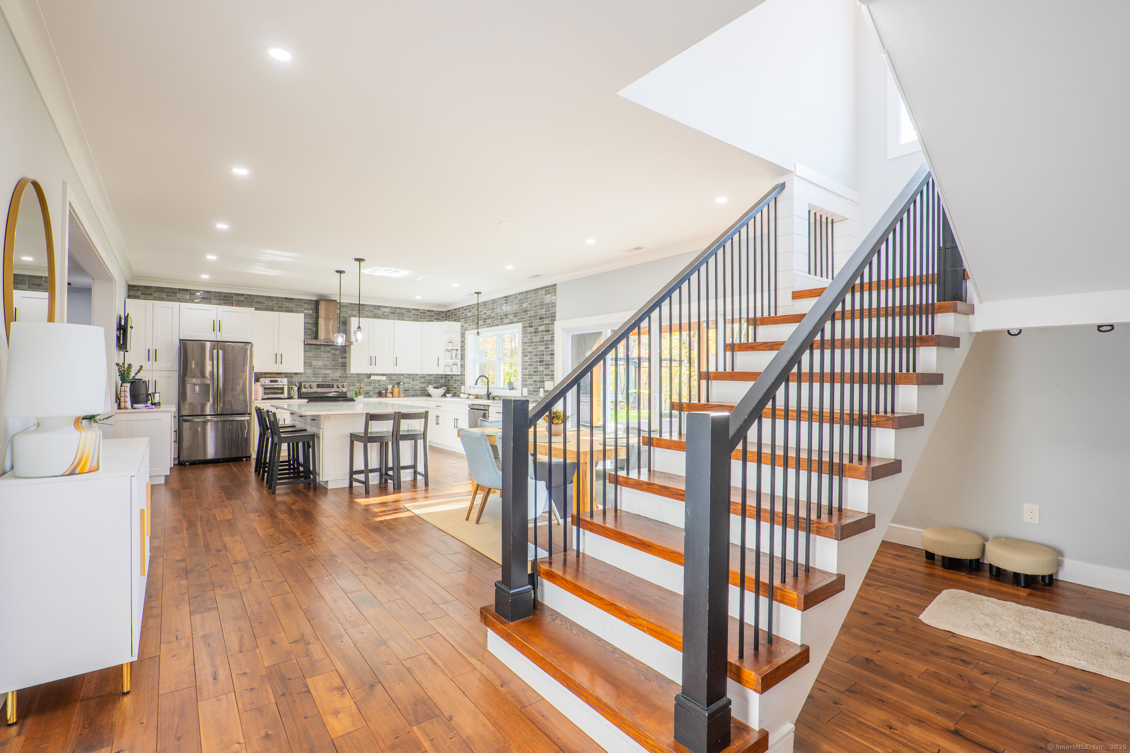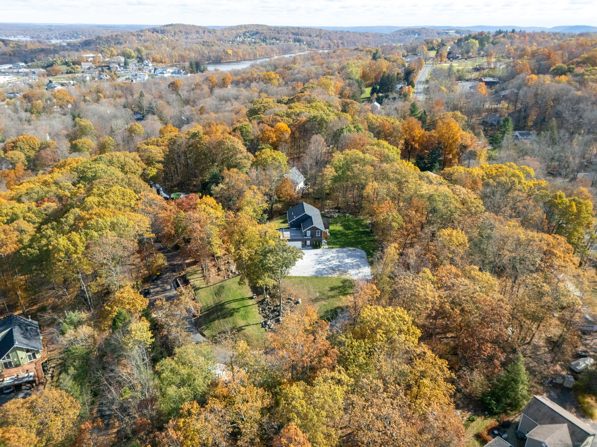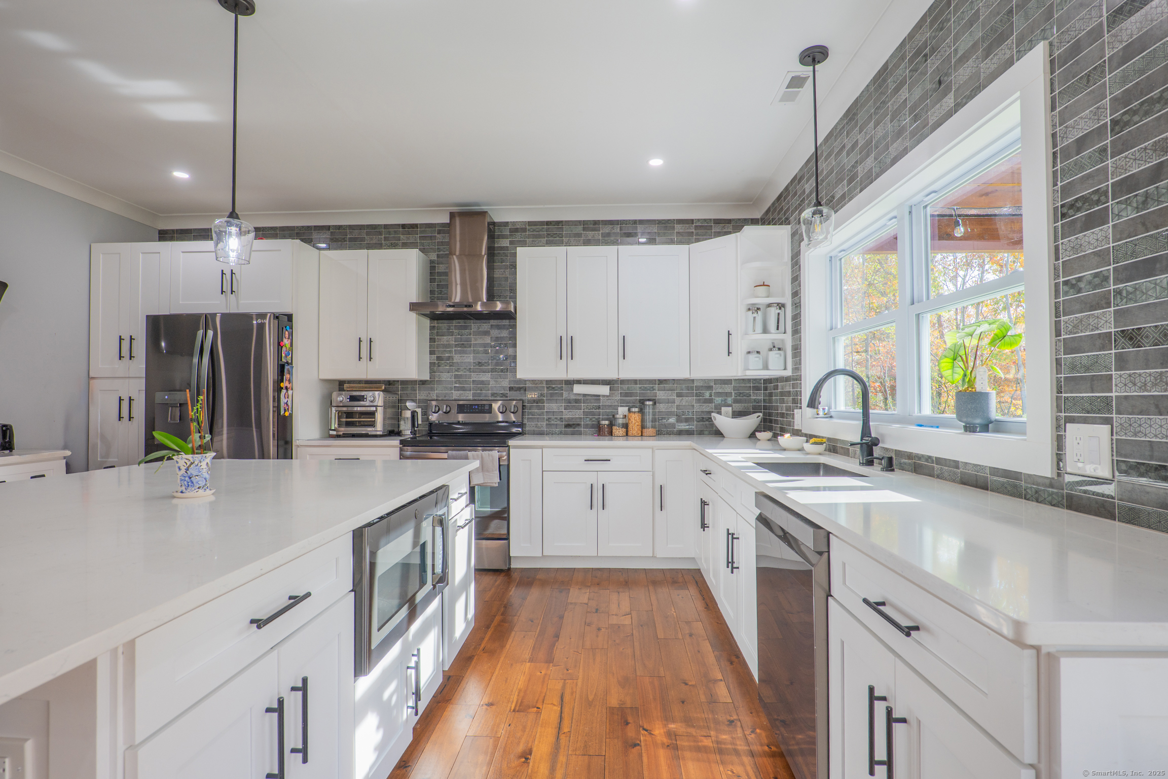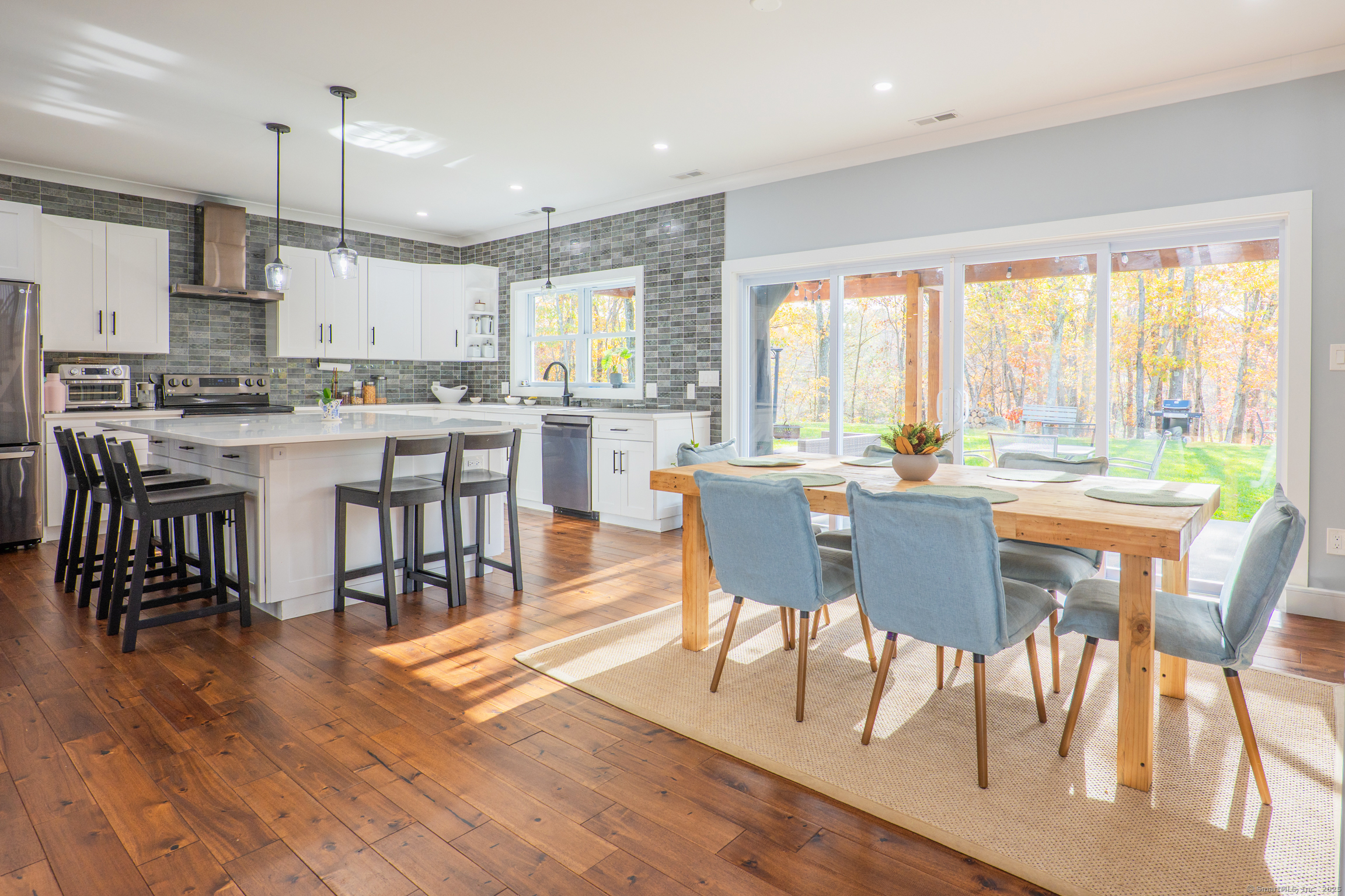 Modern 2020-built home set on a private, wooded acre with a long driveway and open lawn space. This property offers approximately 2,190 square feet of refined living space with an open concept layout designed for comfort and function. The main level features a spacious kitchen with a large center island, white shaker cabinetry, quartz countertops, tile backsplash, and stainless appliances. The kitchen flows directly into the dining and living areas, creating an easy, natural gathering space filled with daylight and views of the surrounding trees. A first floor office provides a quiet, dedicated workspace, along with a half bath and mechanical room on this level. The second floor includes four bedrooms and two full bathrooms. The primary suite features a walk-in closet and private bath. A dedicated laundry room is located on the bedroom level for added convenience. Outdoor living options include a ground level patio with pergola and a large rooftop deck above the garage. These areas offer space for outdoor dining, entertainment, or quiet relaxation while overlooking the natural landscape. The level backyard provides room for play, gardening, or future customization. Additional features include a two car garage, central air, efficient construction, and a peaceful setting near everyday amenities and major routes.