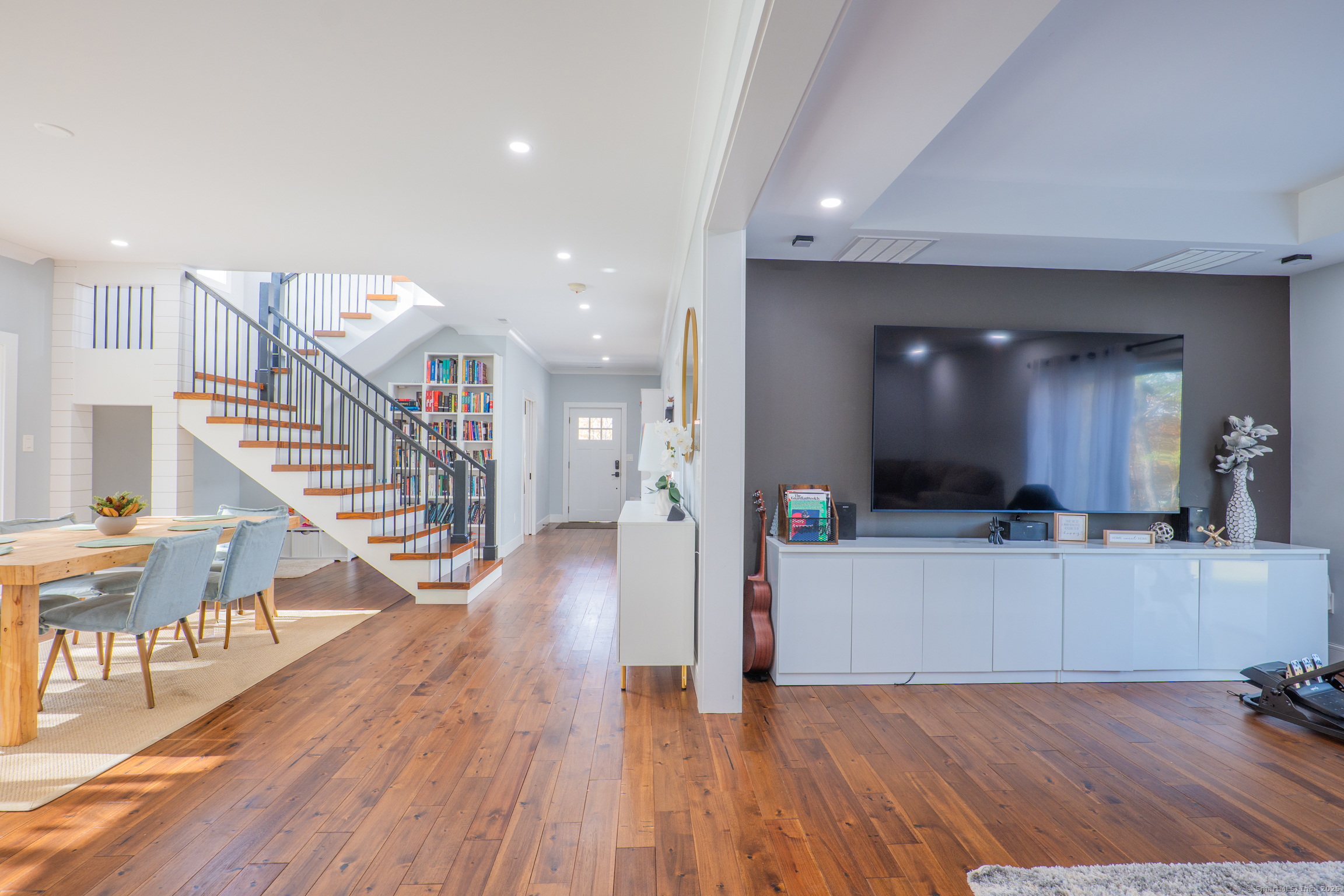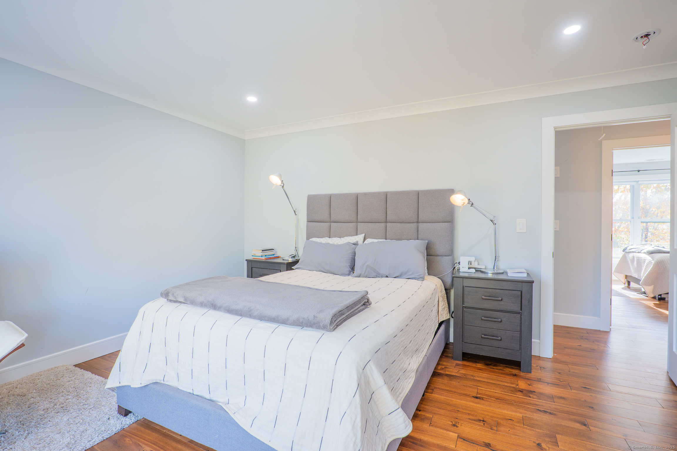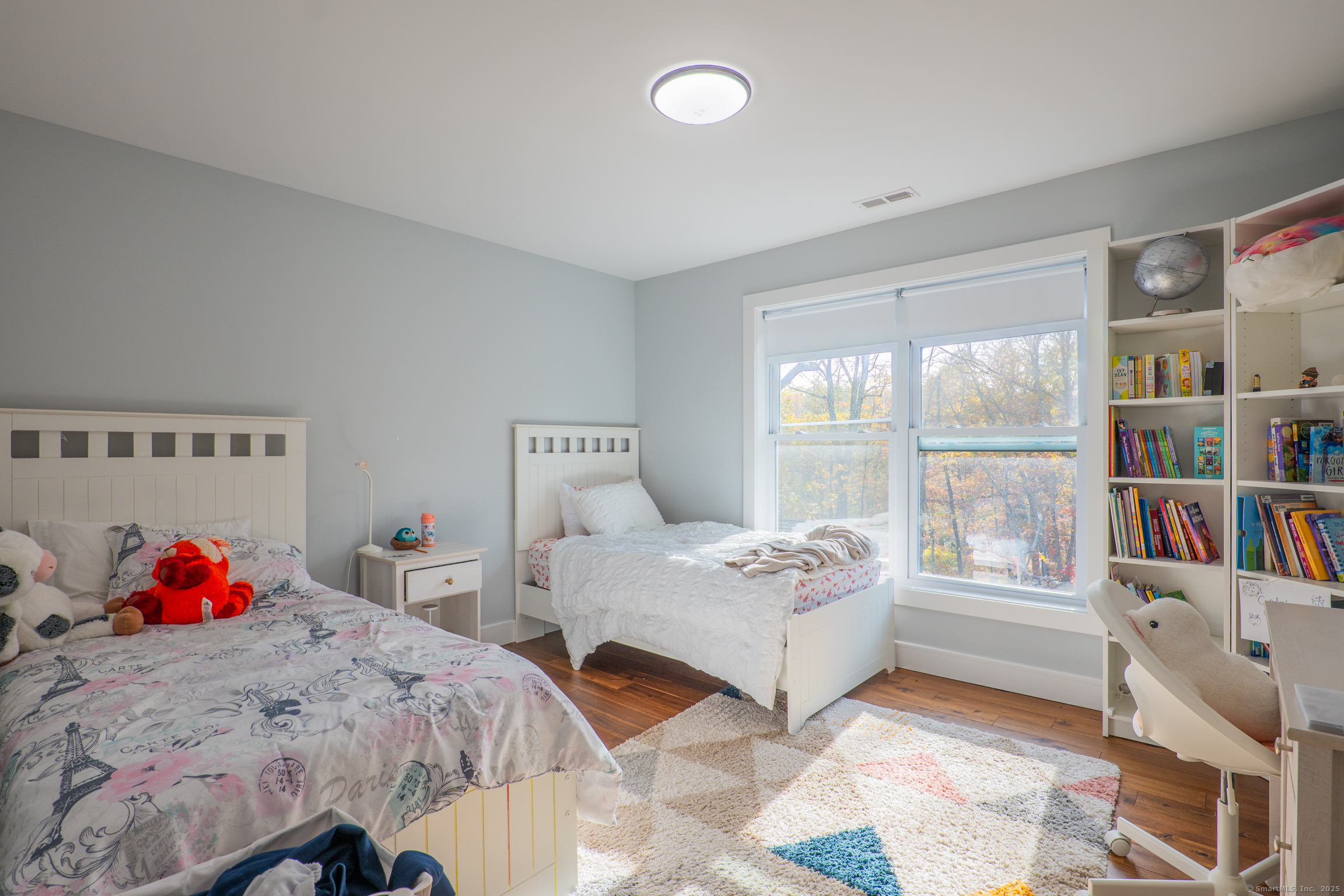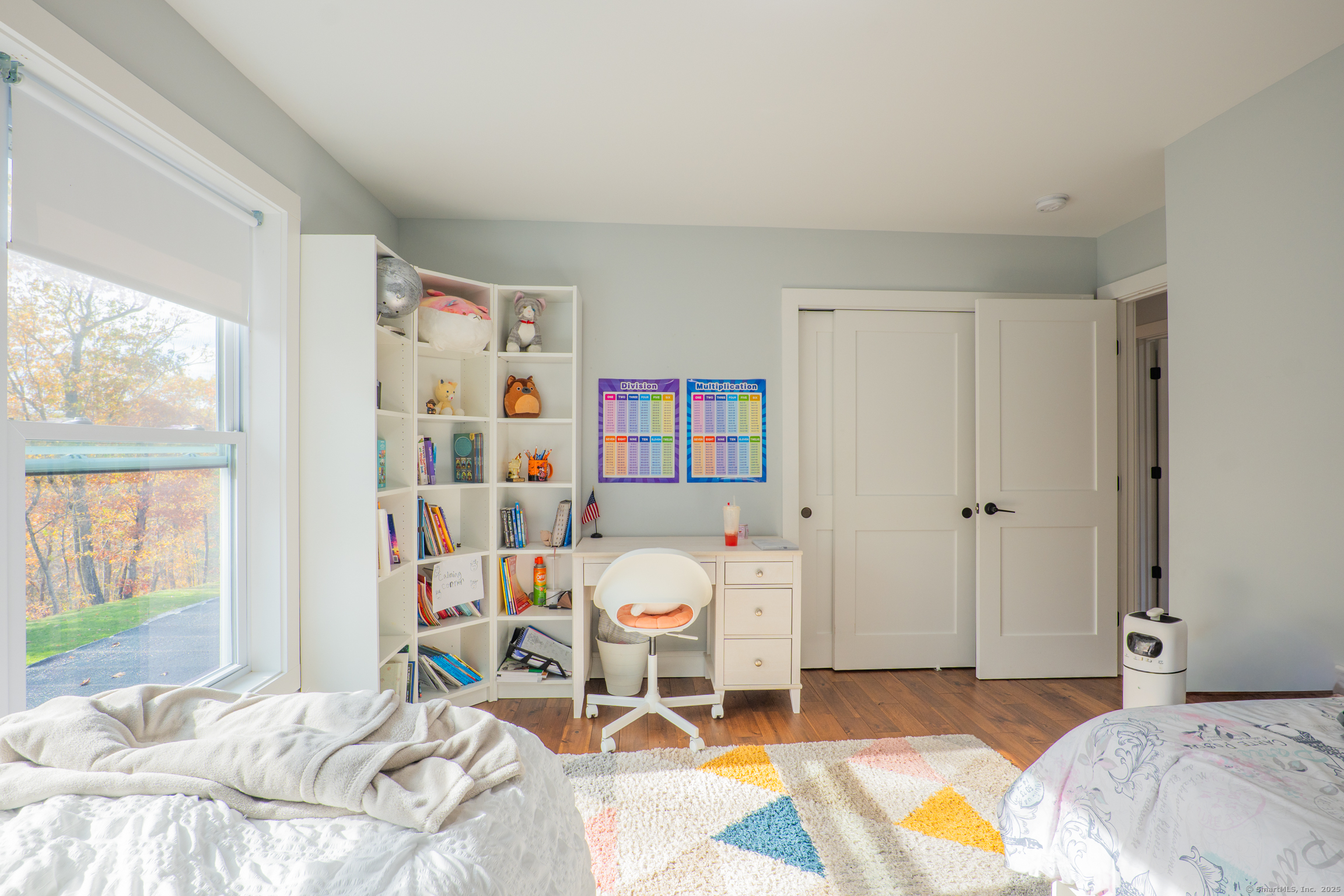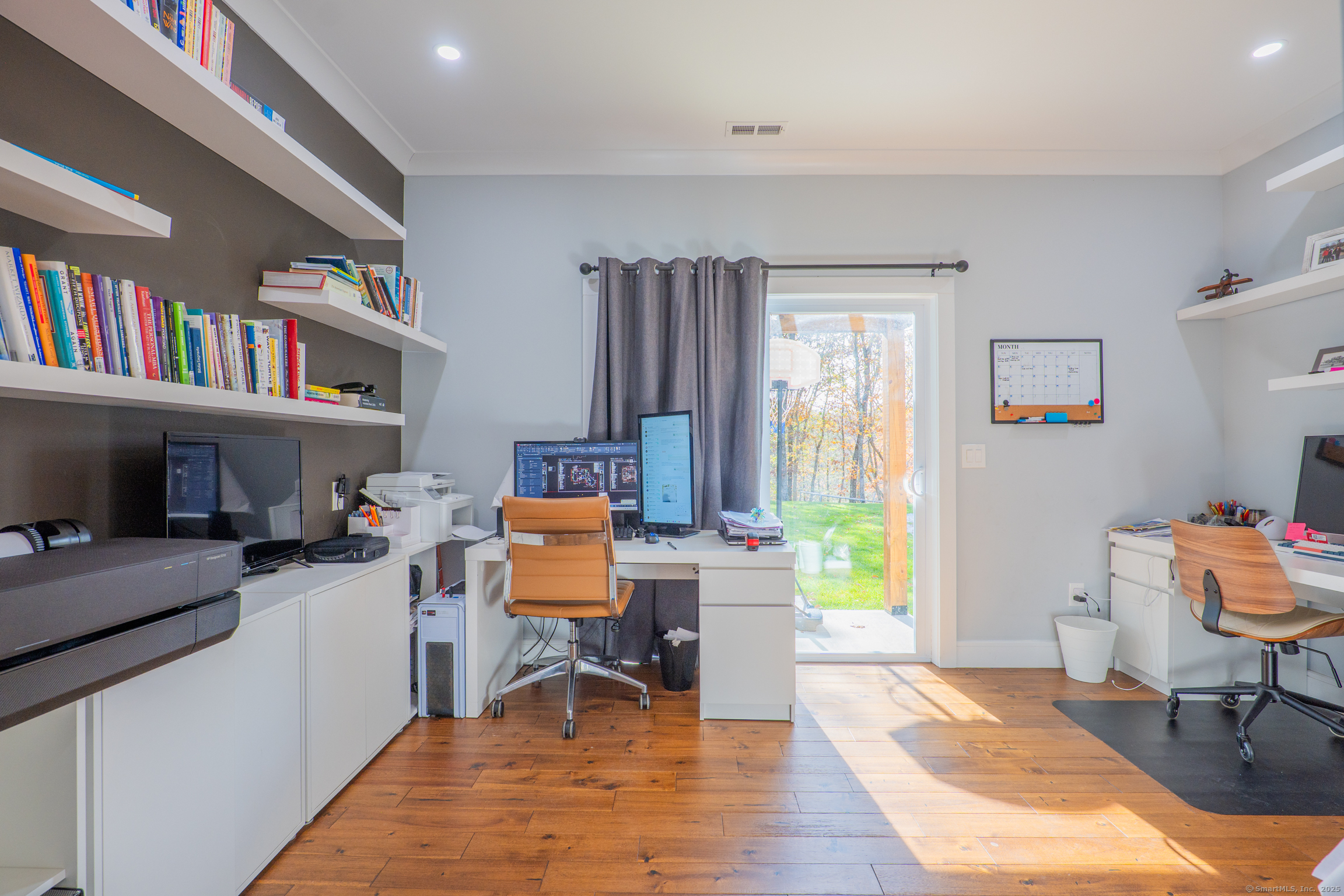 Modern 2020-built home set on a private, wooded acre with a long driveway and open lawn space. This property offers approximately 2,190 square feet of refined living space with an open concept layout designed for comfort and function. The main level features a spacious kitchen with a large center island, white shaker cabinetry, quartz countertops, tile backsplash, and stainless appliances. The kitchen flows directly into the dining and living areas, creating an easy, natural gathering space filled with daylight and views of the surrounding trees. A first floor office provides a quiet, dedicated workspace, along with a half bath and mechanical room on this level. The second floor includes four bedrooms and two full bathrooms. The primary suite features a walk-in closet and private bath. A dedicated laundry room is located on the bedroom level for added convenience. Outdoor living options include a ground level patio with pergola and a large rooftop deck above the garage. These areas offer space for outdoor dining, entertainment, or quiet relaxation while overlooking the natural landscape. The level backyard provides room for play, gardening, or future customization. Additional features include a two car garage, central air, efficient construction, and a peaceful setting near everyday amenities and major routes.