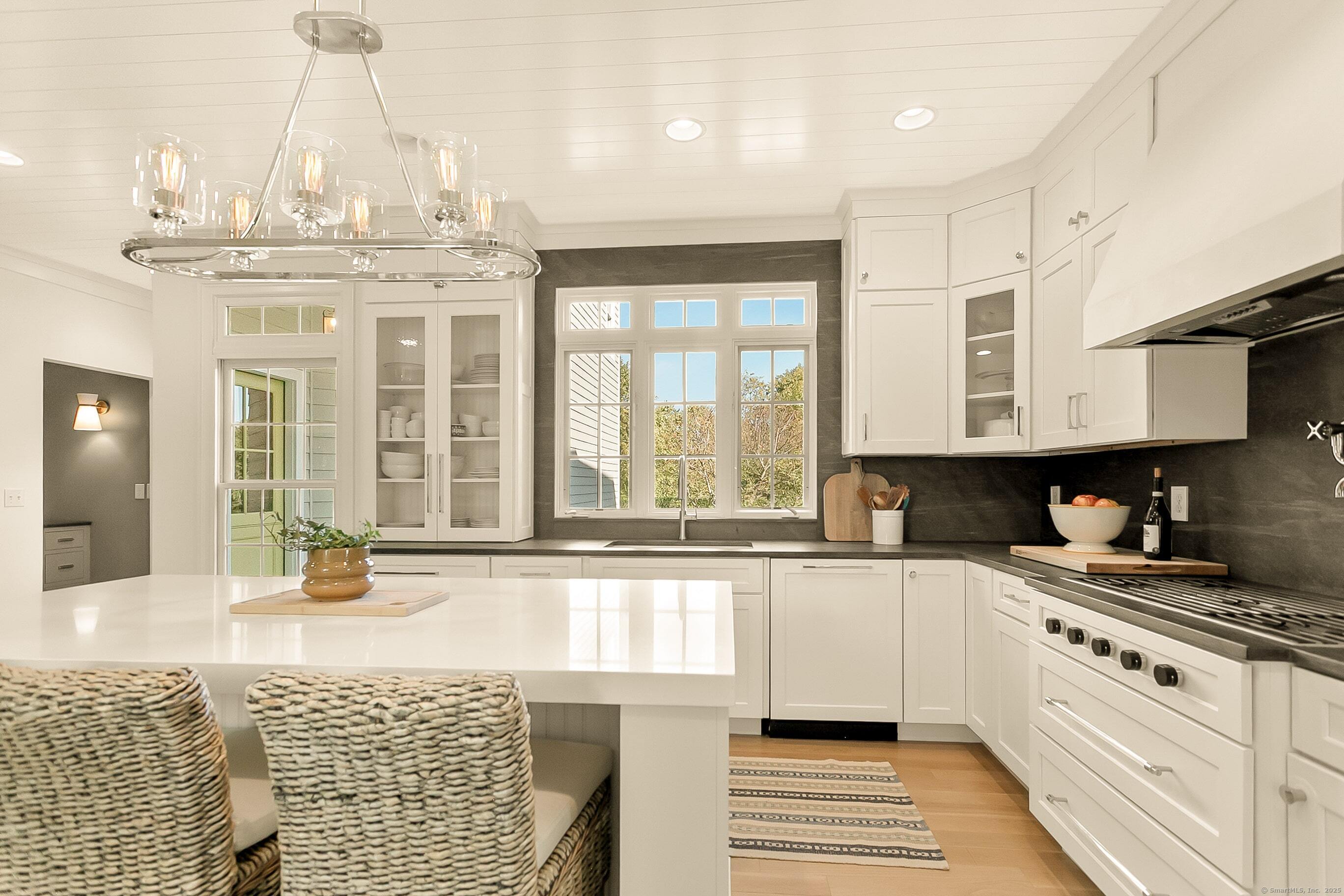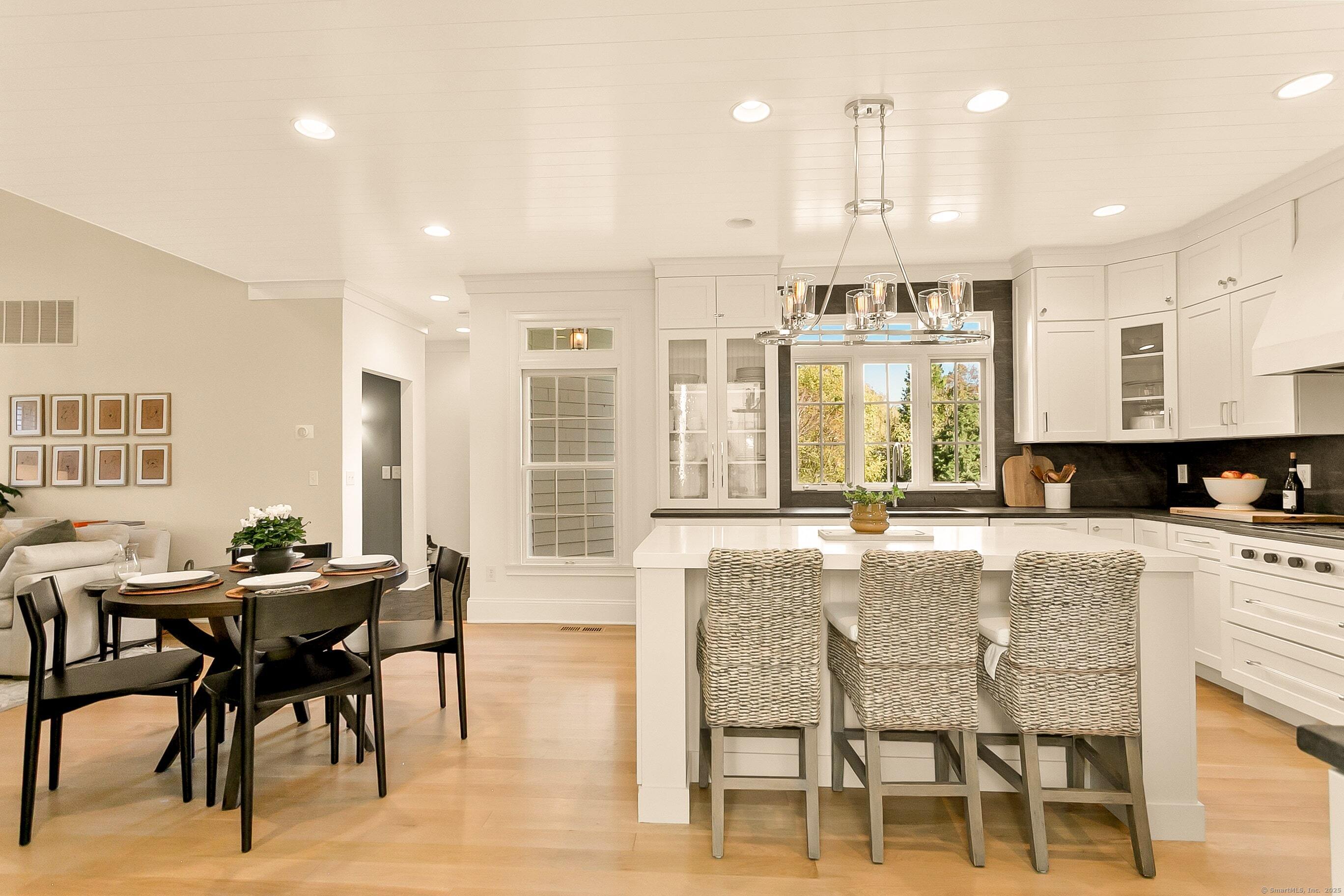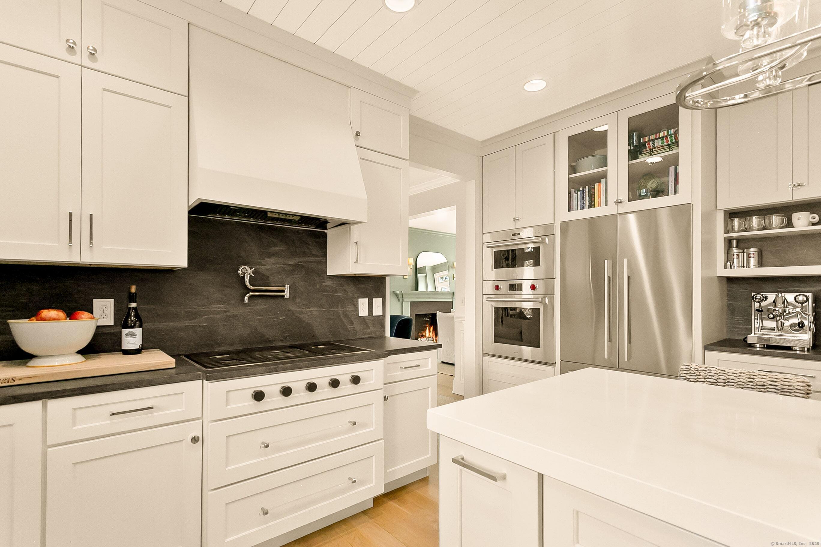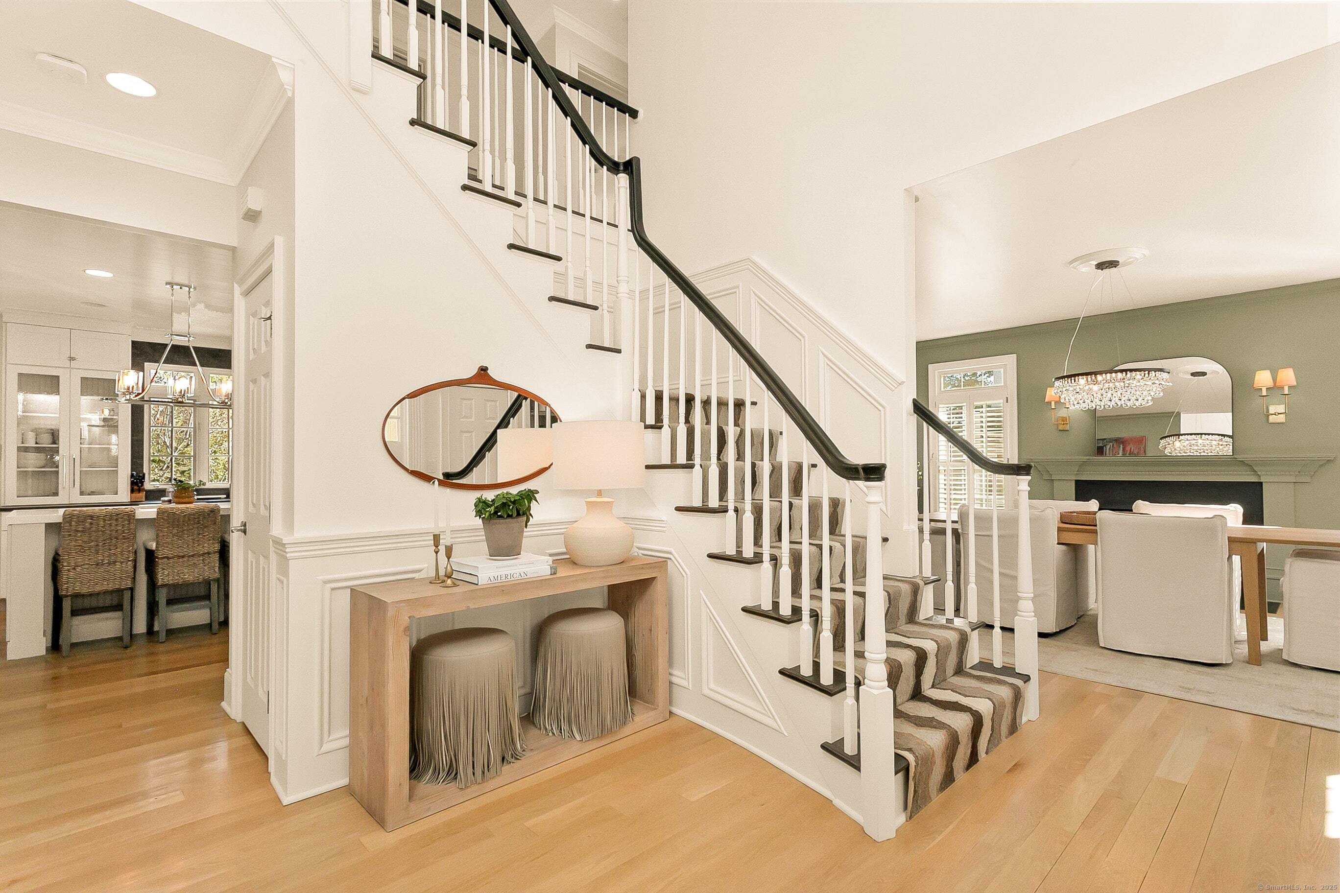 Inspired living meets coastal New England charm at 309 Birch Rd in Fairfield. This thoughtfully designed home in the beach area blends elegant millwork, hardwood floors, transom windows, plantation shutters and custom built-ins with natural light throughout. The two-story foyer welcomes you to superior craftsmanship, leading to a private office and front porch, formal dining with wood-burning fireplace and built-ins, and a serene living room overlooking lush grounds. The heart of the home, the eat-in kitchen, features Wolf appliances, Waterworks fixtures, honed Pietra Cardosa schist stone, white cabinetry with seeded glass, quartz island, and breakfast area opening to a two-story family room with vaulted ceiling, brick fireplace, and beverage nook. Upstairs, four bedrooms include a primary suite with tray ceiling, spa-like bath, and a walk-in closet. Three additional bedrooms on the second floor have unique attributes - custom built-ins, windowseats, stylish wallpaper, and gorgeous views. The finished third floor adds a 5th en-suite bedroom and bonus room. The fully fenced-in yard, bordered by beautiful landscaping offers space to relax, play, or dine al fresco. A two-car attached garage completes this home with 20 ft ceilings, plenty of storage, and the potential for a lift adding a desirable element for any car enthusiast. Perfectly positioned for the coastal lifestyle of your dreams, this home is just a short stroll to the beach, schools, train station & downtown Fairfield