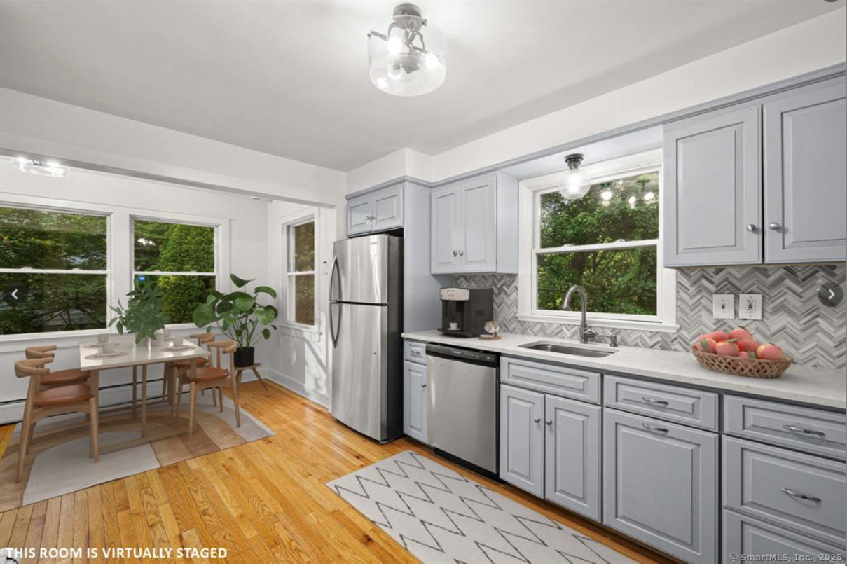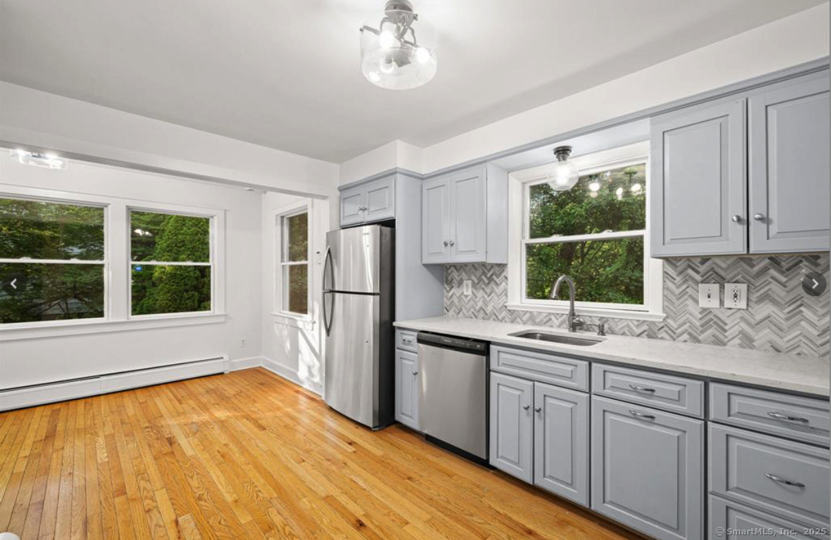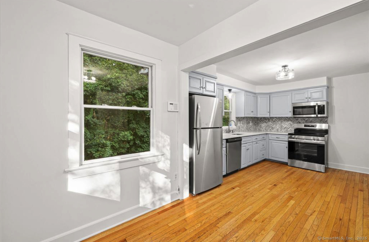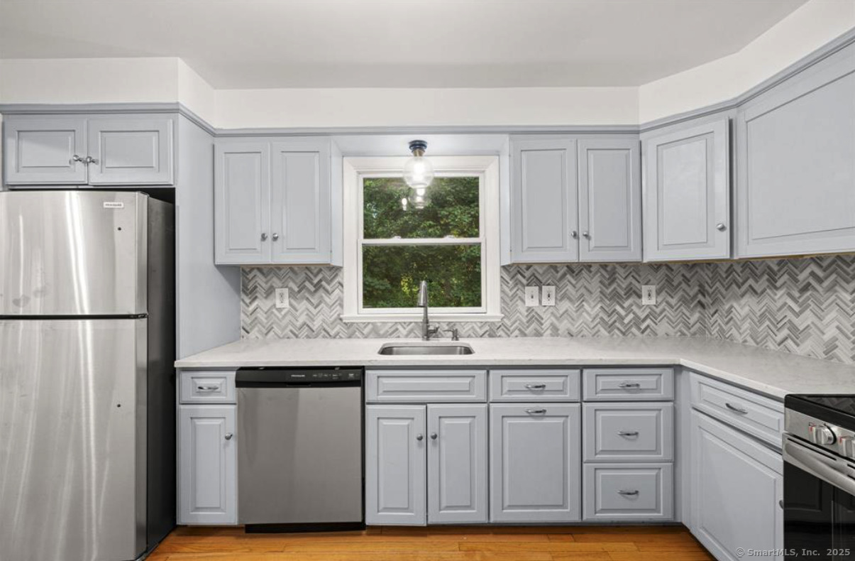 This well-maintained 5-bedroom, 2-bath ranch offers plenty of space and flexibility, featuring a fully finished walk-out lower level with its own entrance and kitchen - perfect for extended family, guests, or an in-law setup. The main level includes a bright eat-in kitchen with new stainless steel appliances, quartz countertops, and a tile backsplash. The cozy living room features a fireplace, while large windows fill the home with natural light. Freshly painted interiors and hardwood floors throughout enhance the warm, inviting feel. This level also includes three sunny bedrooms with ample closet space and a full bath. The lower level adds even more versatility with a second kitchen, living room, two spacious bedrooms, and a full bath. A separate laundry room offers extra storage space. Outside, enjoy two private patios and a level backyard - perfect for entertaining, play, or relaxing. Two separate driveways provide parking for up to six cars, and dual kitchens make this home easy to share while maintaining privacy and convenience. Located just a 15-minute walk to downtown and the train station, and a short drive to restaurants, shops, and I-95, this home offers comfort, space, and convenience in one great package. Move right in and make it yours today!