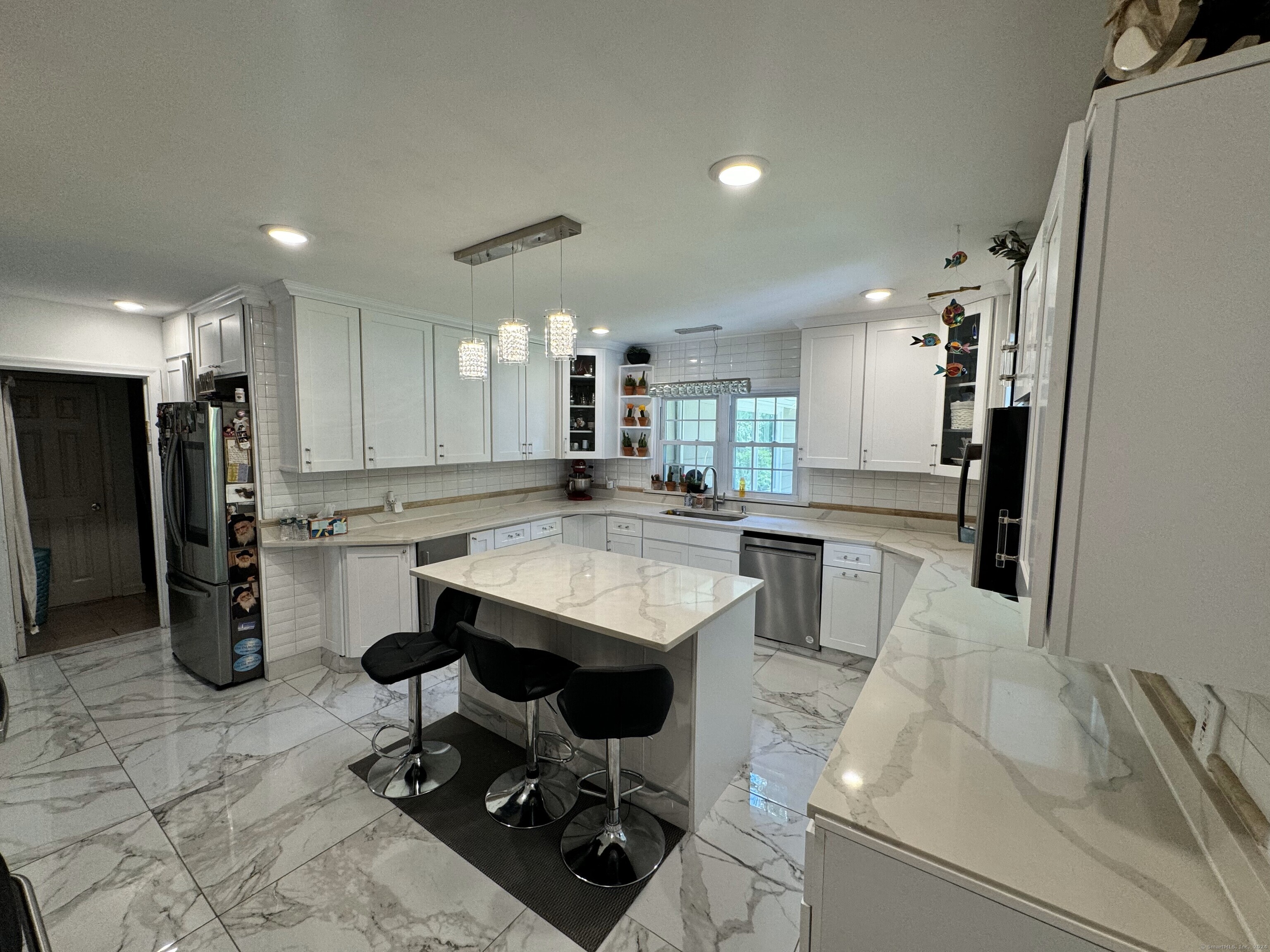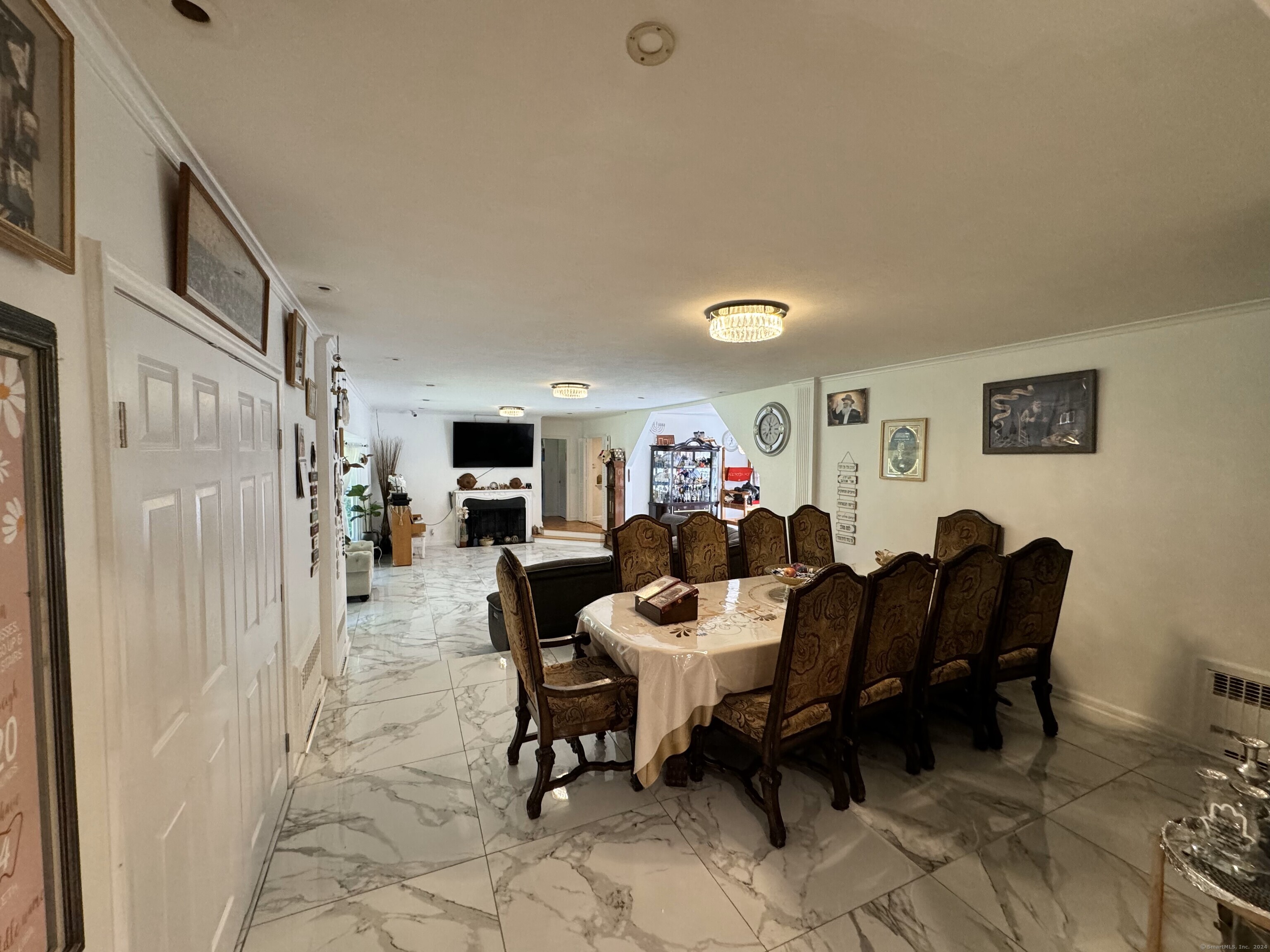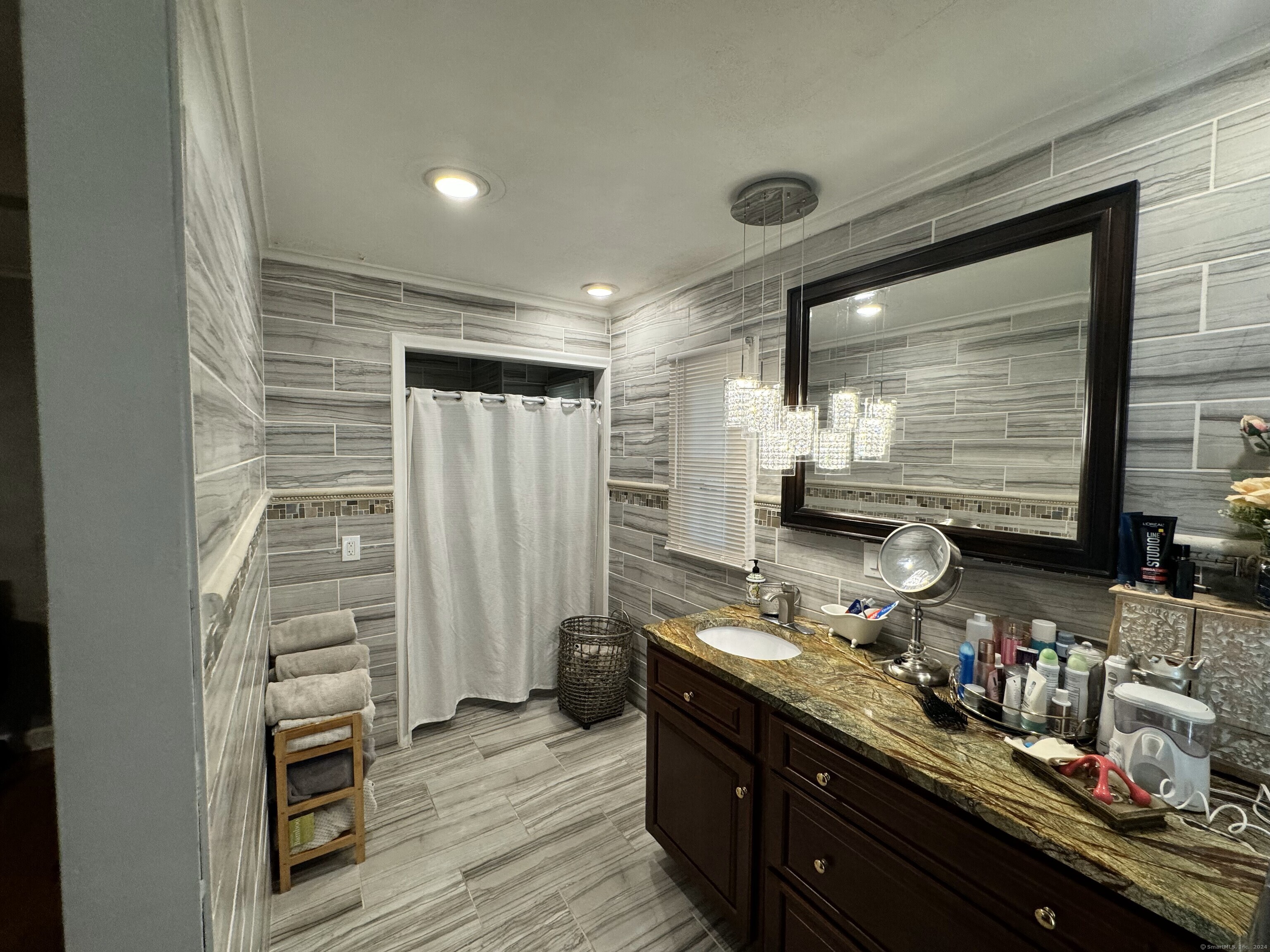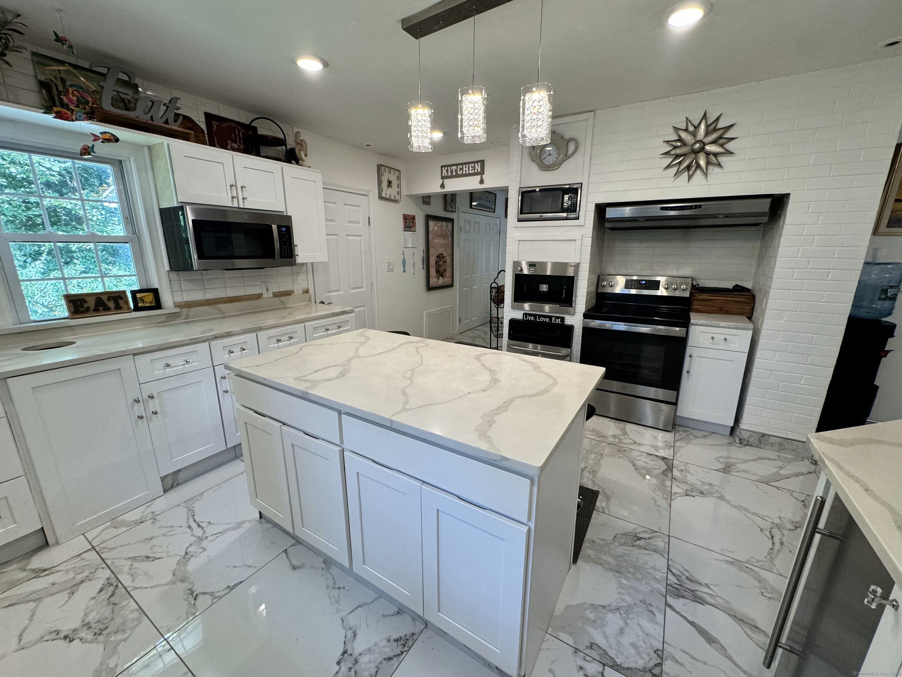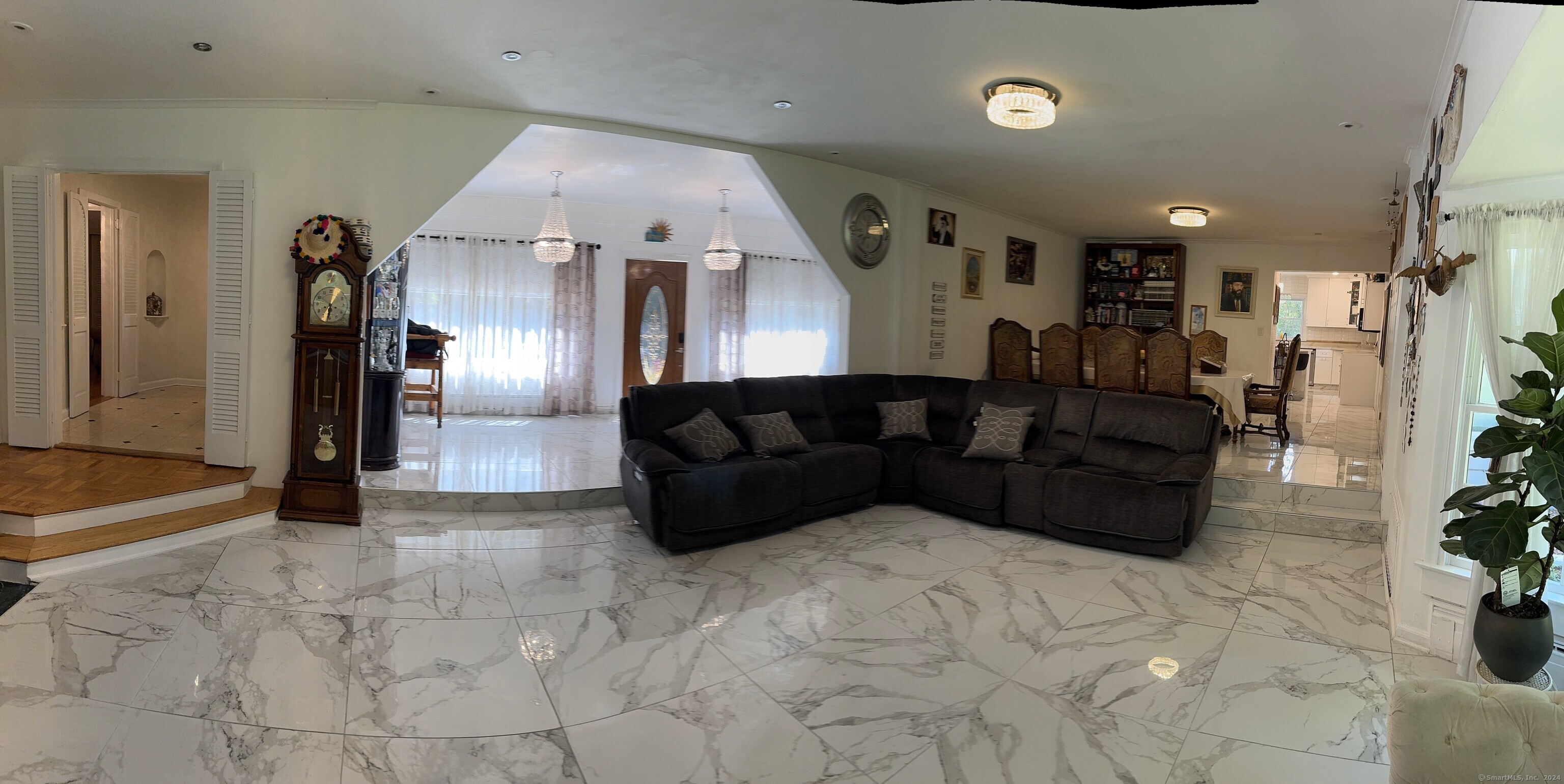 Situated on a quiet street, this one-level ranch-style home has nearly 2,800 SF of an open living area with modern luxury and space for everyone with 4 beds and 3 full baths. The front entrance opens to a bright and spacious foyer that leads to a large sunken living room with beautiful large-tile marble floors and one of two fireplaces. The marble flooring continues into the adjacent dining room with doors to the sun room and entrance to the kitchen. The remodeled kitchen boasts new cabinets, granite counters/island and extra storage/eating area, and a suite of stainless steel appliances. The primary bedroom, features hardwood floors and an fully updated primary bath, complete with a tub and tile work. Additional bedrooms are ample in size and there are another two fully remodeled full baths with updated tile work, tubs and vanities. There is also a sun room off the DR/kitchen for additional relaxing or entertaining. Plus, a full semi-finished basement with storage or options for additional living space. The exterior includes a patio, plenty of parking, and generous .49-acre yard to enjoy. New roof, and the other renovations were completed within the last year. The 2-car attached garage provides room for parking or additional storage and leads to an interior mud room/laundry area. All this, in proximity to West Hartford's greatest amenities, including Blue Back Square, golf courses, lakes & parks, shopping and so much more.