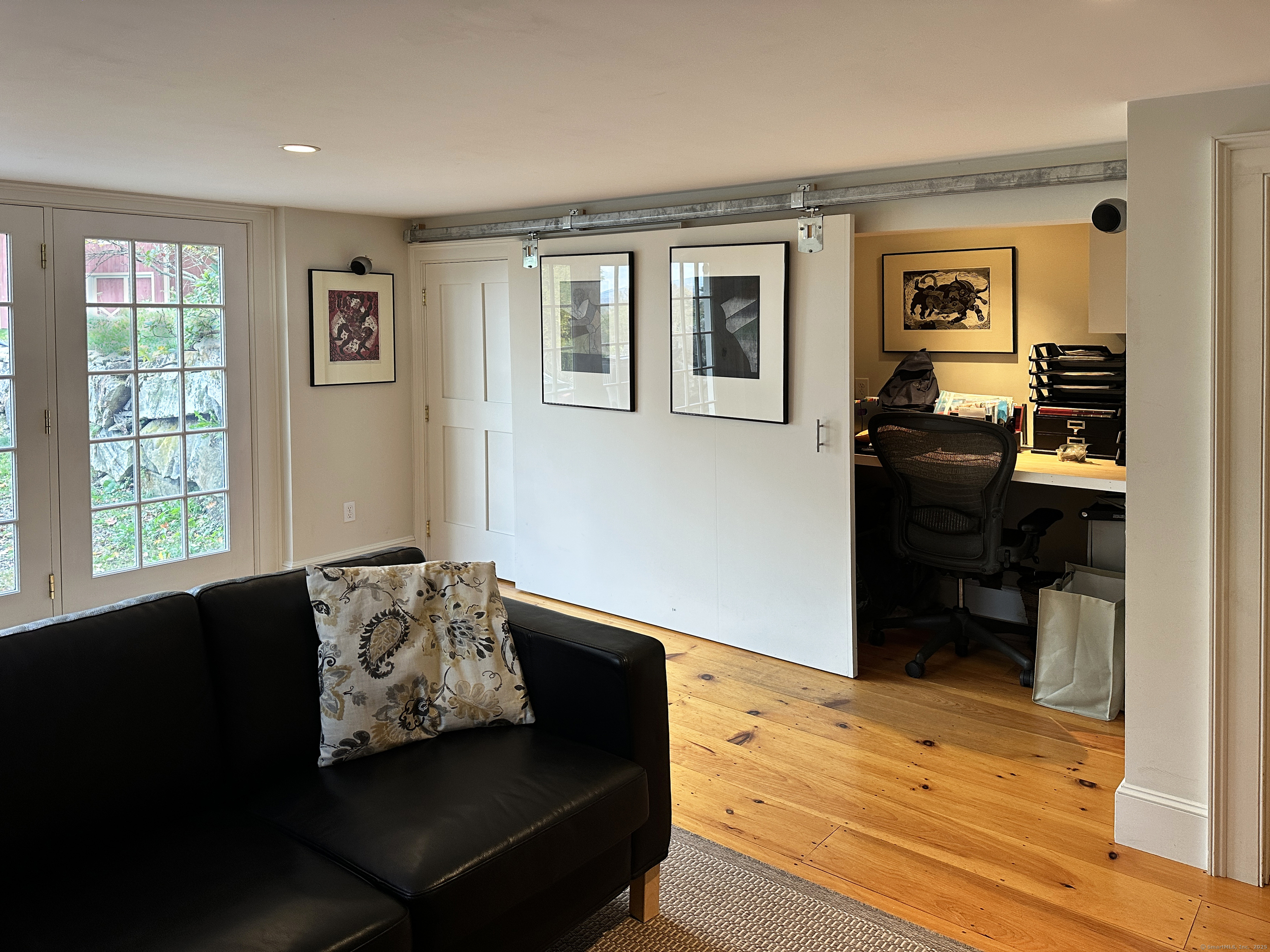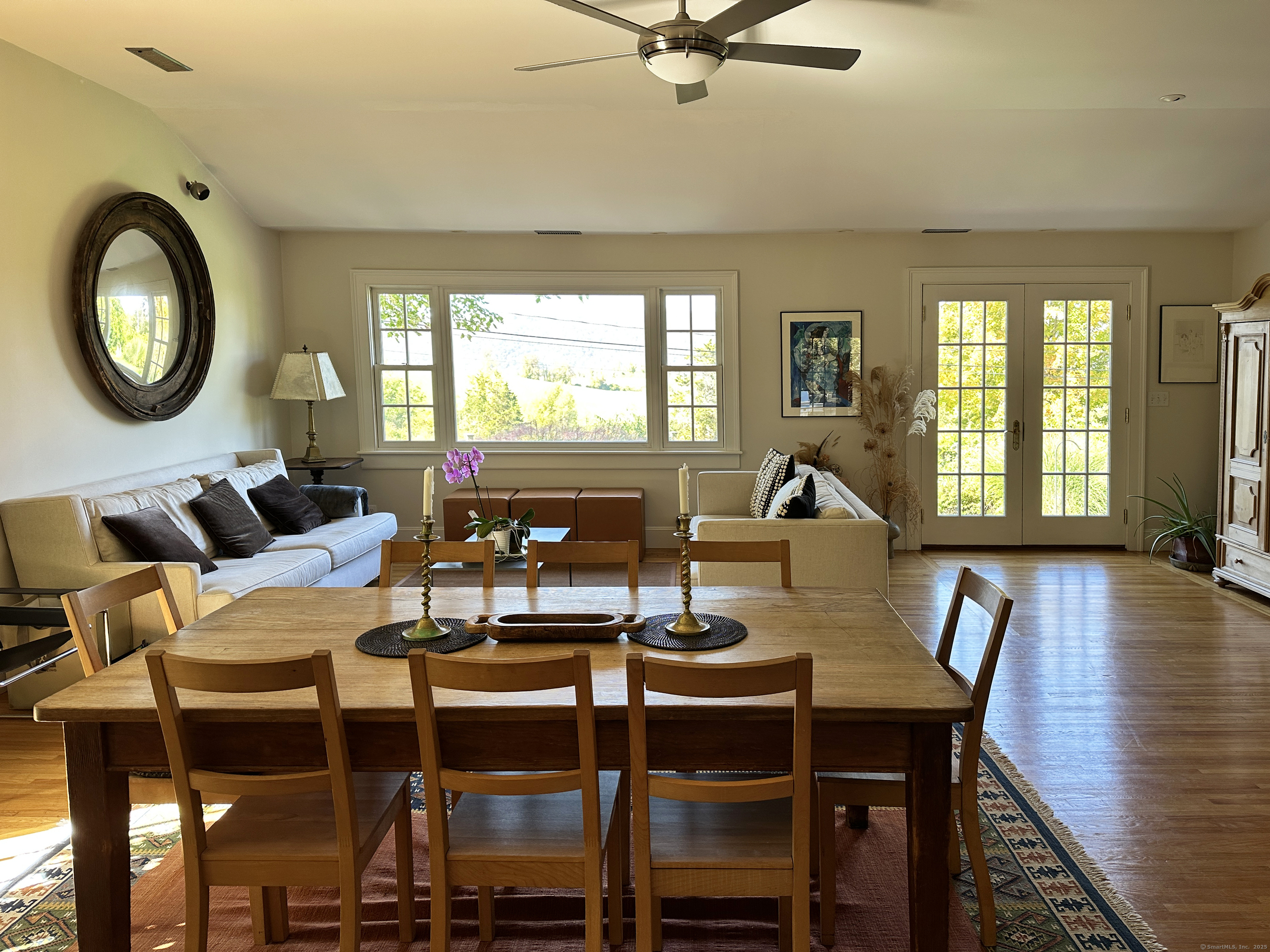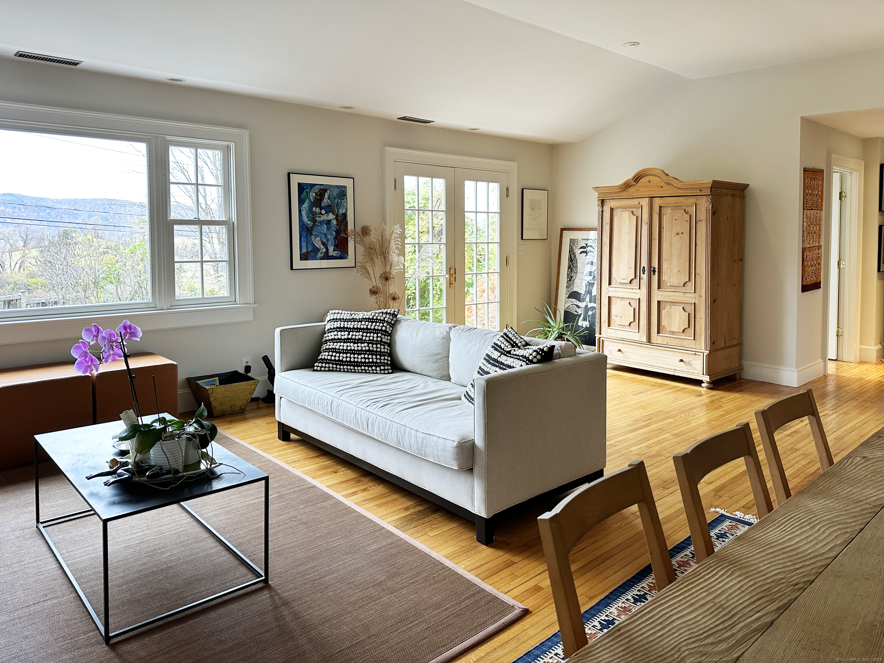Graceful Home with Views On 2+ Sharon, CT acres, this beautiful home offers single-floor living with the added bonus of a versatile Lower Level with walk-out. The bright and cheerful Great Room opens to a Front Deck and a rear Stone Terrace with Stone Fireplace. A fabulous Kitchen is open to the Dining Area and Living Room with all featuring a spectacular view through to rolling farmland. The 2 Bedrooms are bright and sunny and the 2 Full Bathrooms have been newly renovated. The Lower Level provides a space for a Family Room with Home Office, Exercise Room, and Storage. A classic Barn offers room for 4 vehicles. Close to trains to NYC, private schools, Sharon Hospital, Hotchkiss Library, and spectacular walks. A beauty!