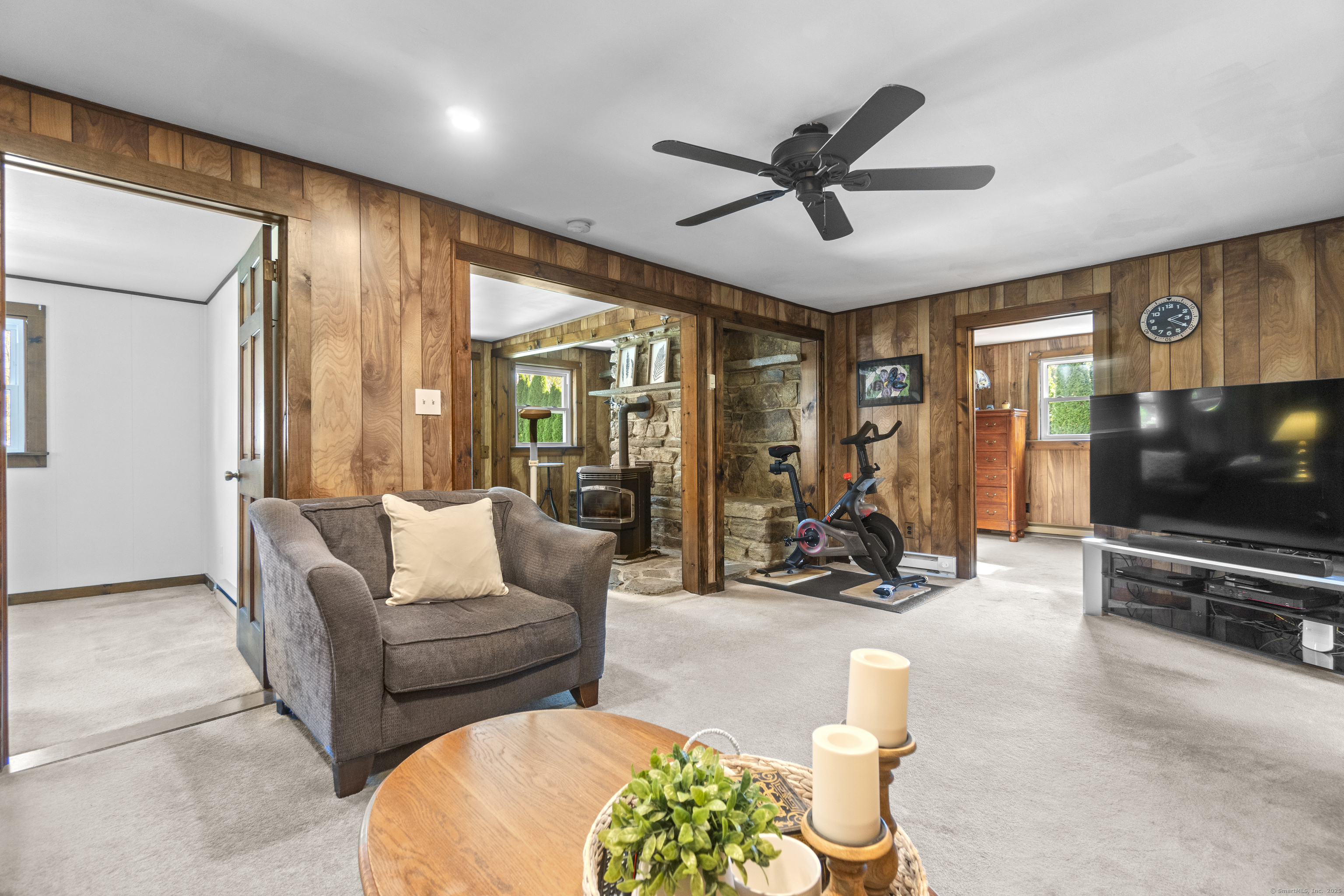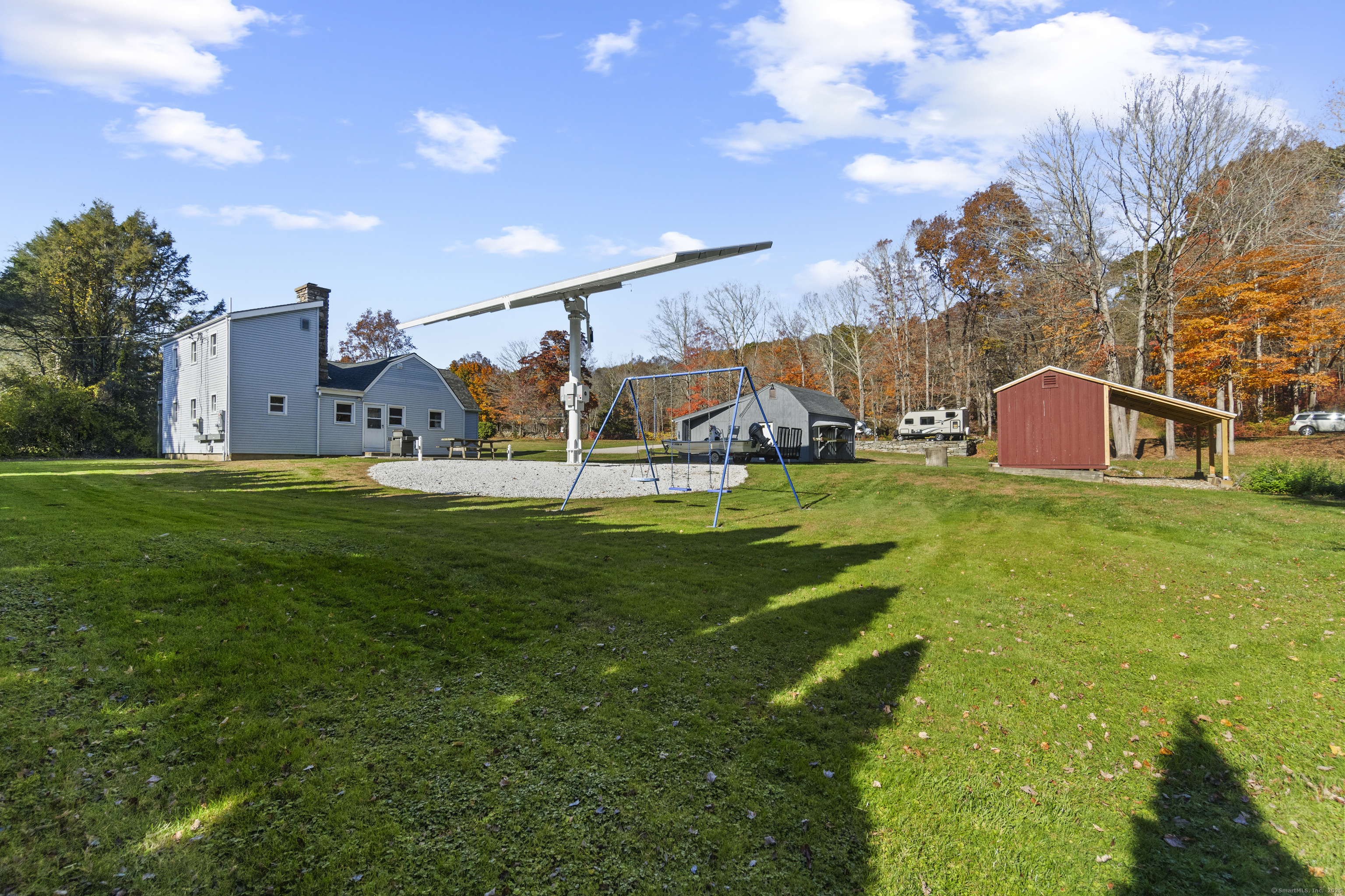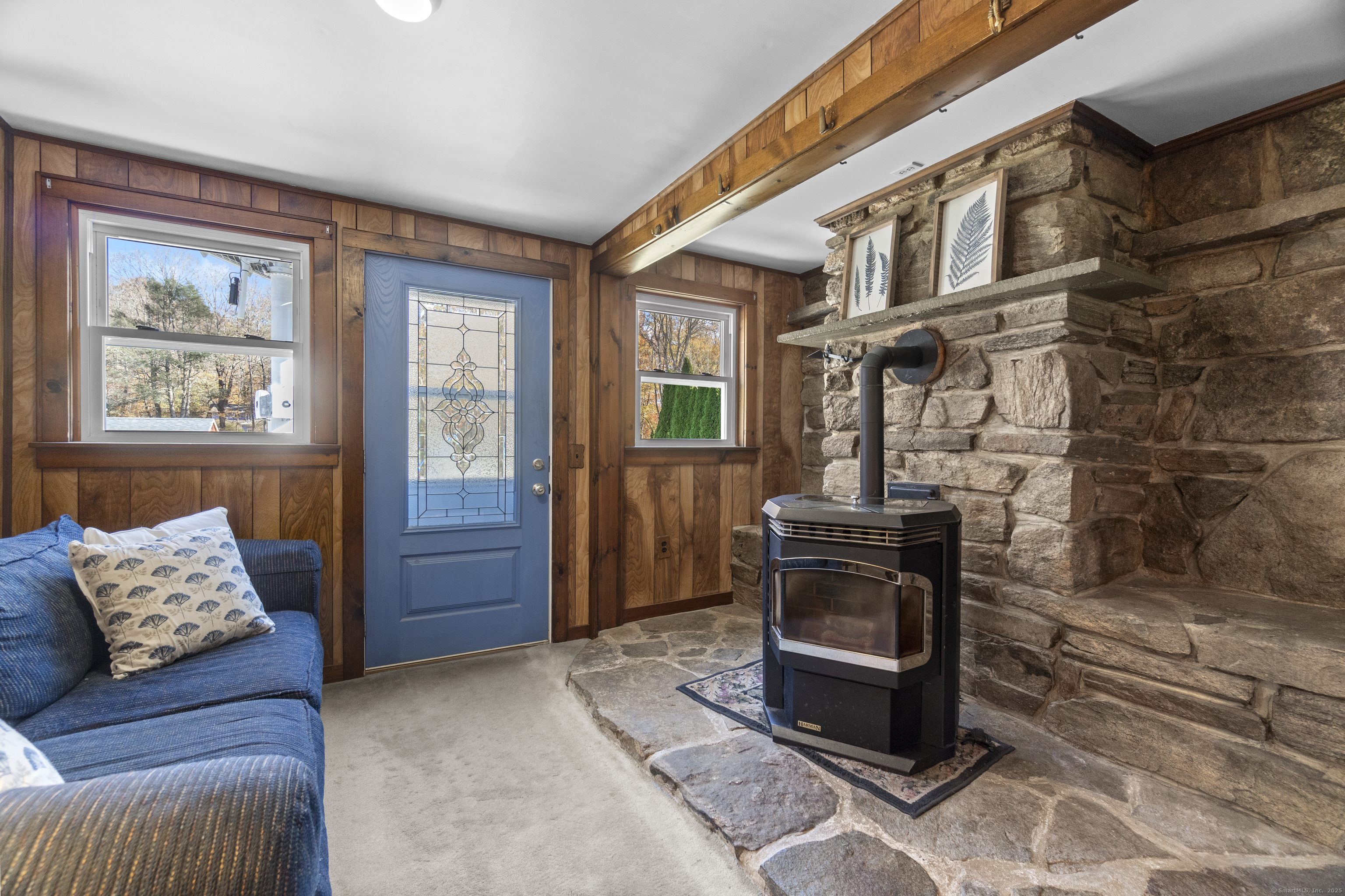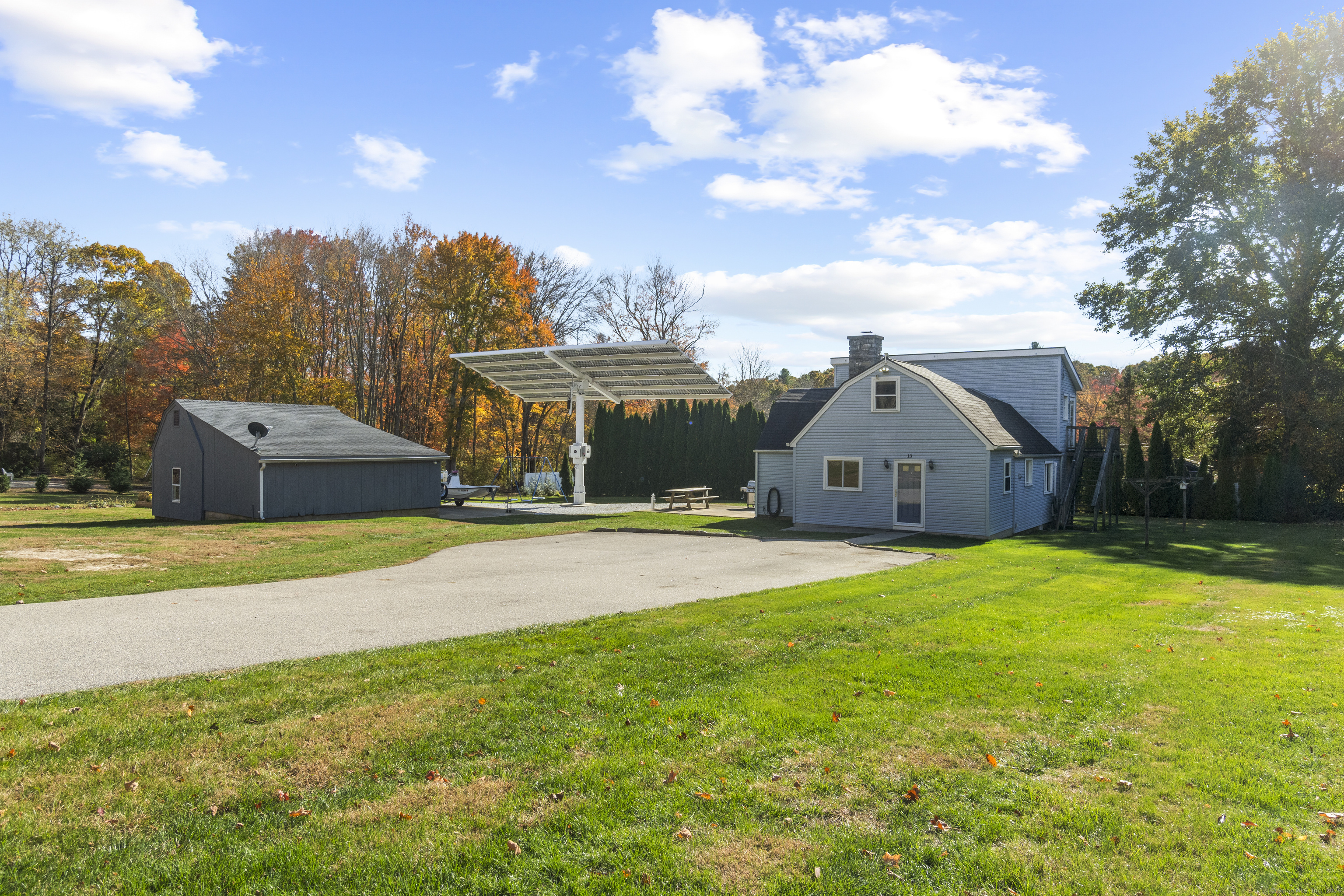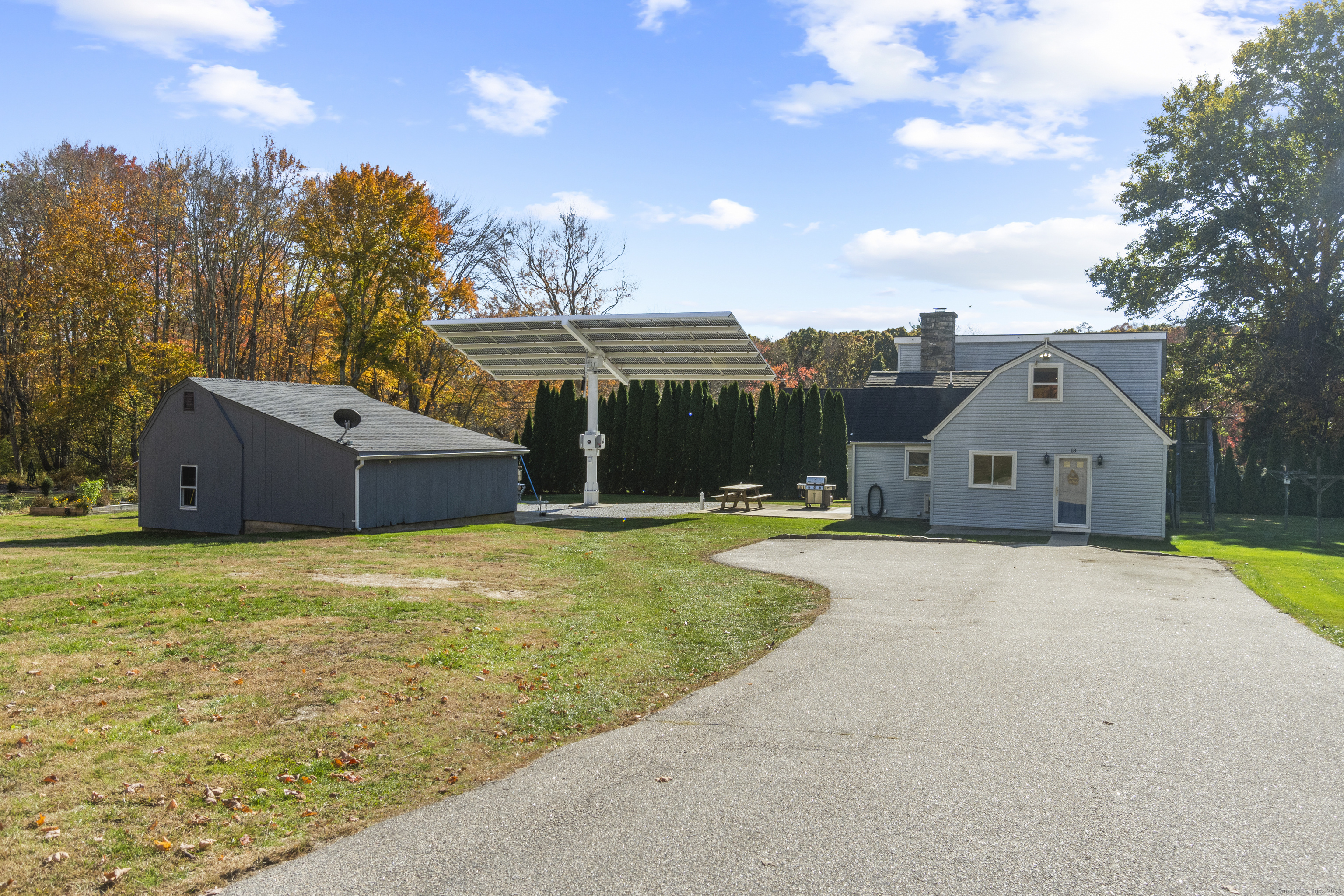 This charming cape has grown with this family in their 50+ years residing just 2 miles north of Old Lyme village. Well maintained and loved, enter a spacious and functional mudroom/laundry room. A well planned and updated granite/stainless kitchen opens to the dining area. There is a spacious family room with a large stone surround and wood pellet stove. There is a first floor office and a first-floor primary bedroom with full bath. Upstairs, find three additional bedrooms. The central bedroom is used as a den. Find a nicely remodeled full bath with heated marble basket weave floor and extensive closets. There is hardwood floor under carpets except for the two largest bedrooms - the primary and upper level BR. A Sun Tracker solar array was installed in 2024 providing all the electric necessary to operate the home-heat, lights, laundry, cooking. Electricity cost is $14 per month covering the connection fee. This is owned - paid in full. Outside offers incredible space on nearly an acre of open land perfect for gardening and pets. The barn offers great workshop, and the shed houses your garden/mowing equipment. Enjoy all of the Old Lyme amenities white sand beaches, Rogers Lake, endless hiking preserves, Florence Griswold Museum, Lyme Art Academy and the treasures of the lower Connecticut River Valley! 20/45/40 minutes to Groton/New London and Hartford and New Haven. Welcome home!