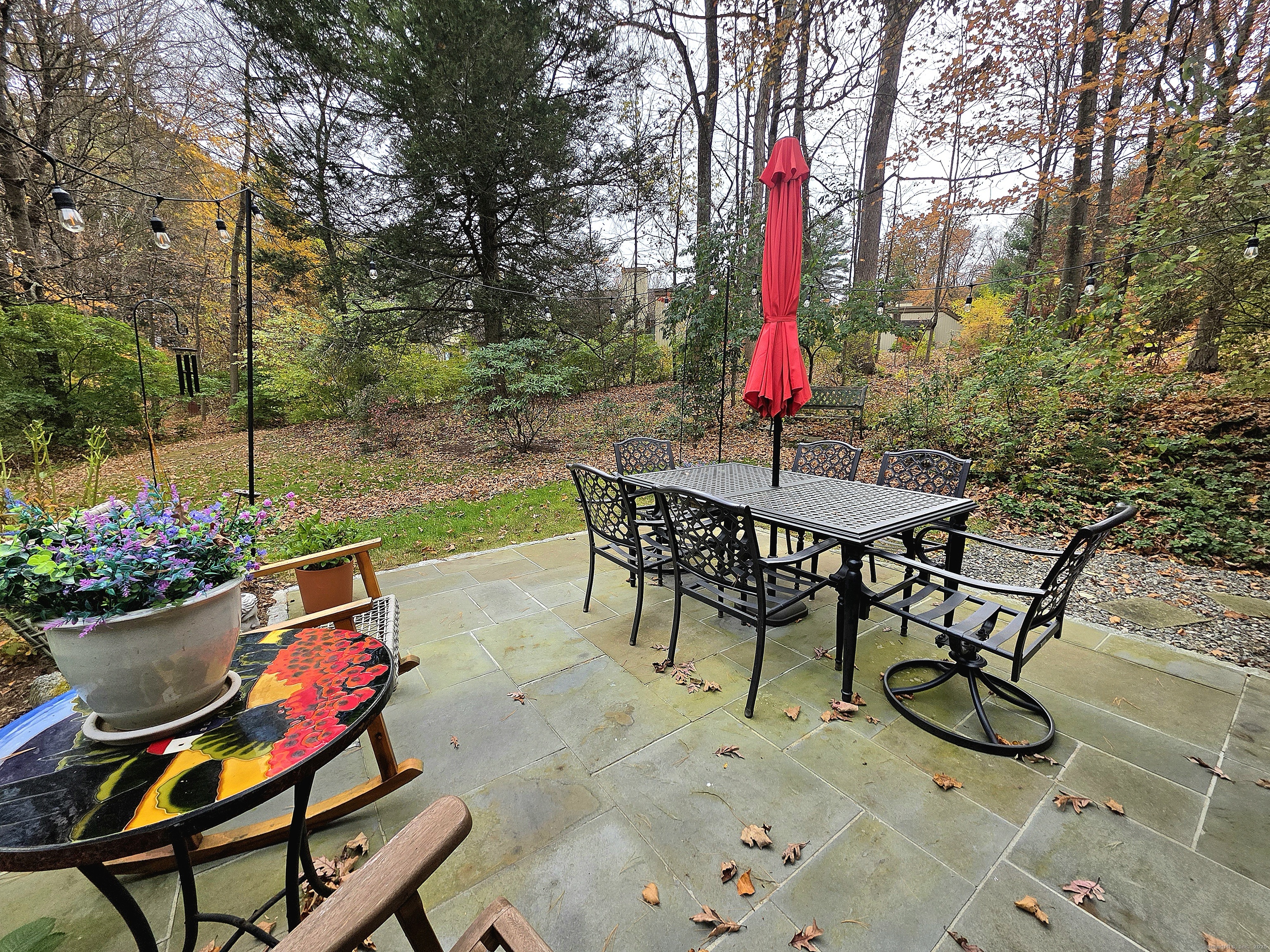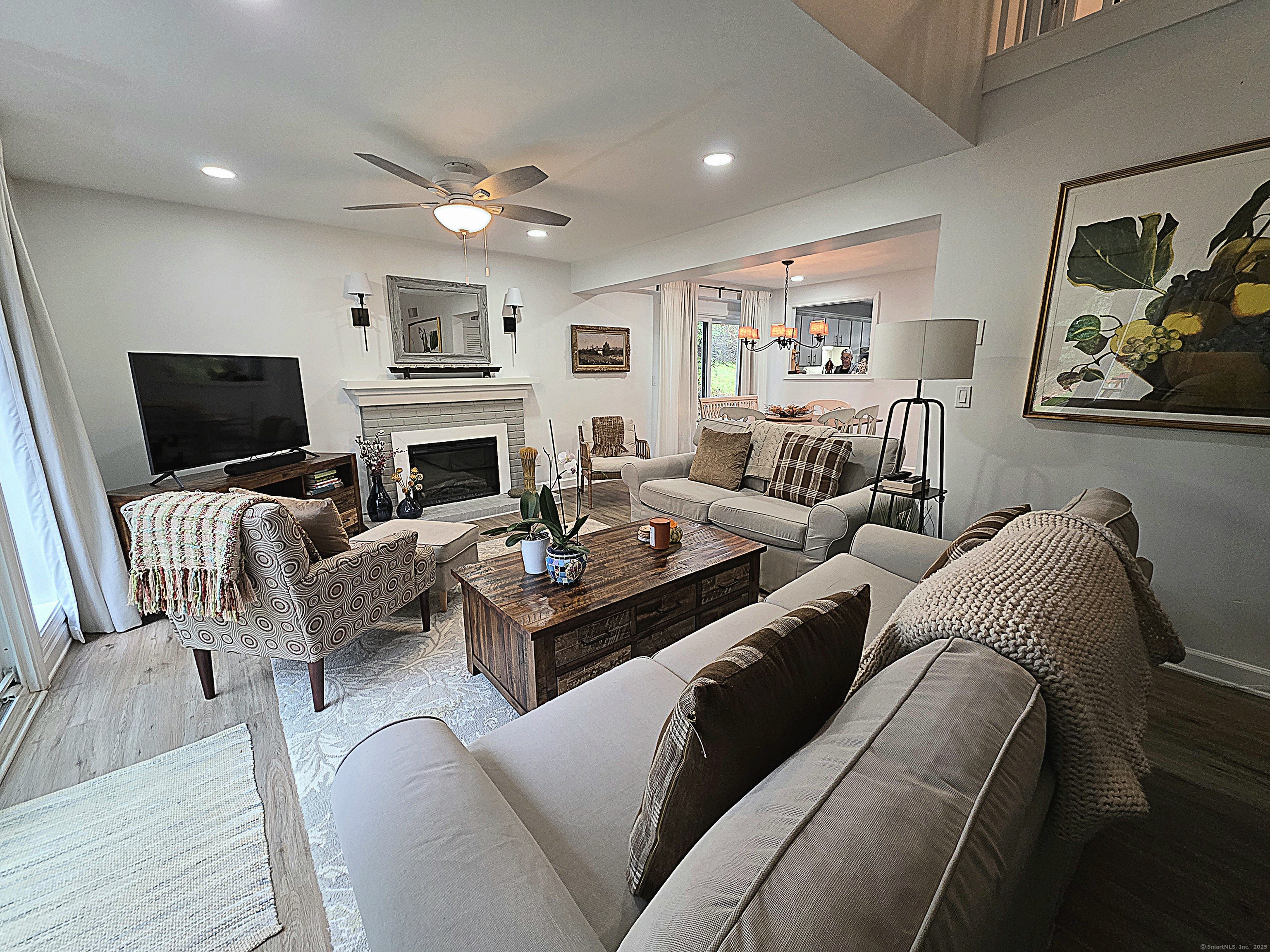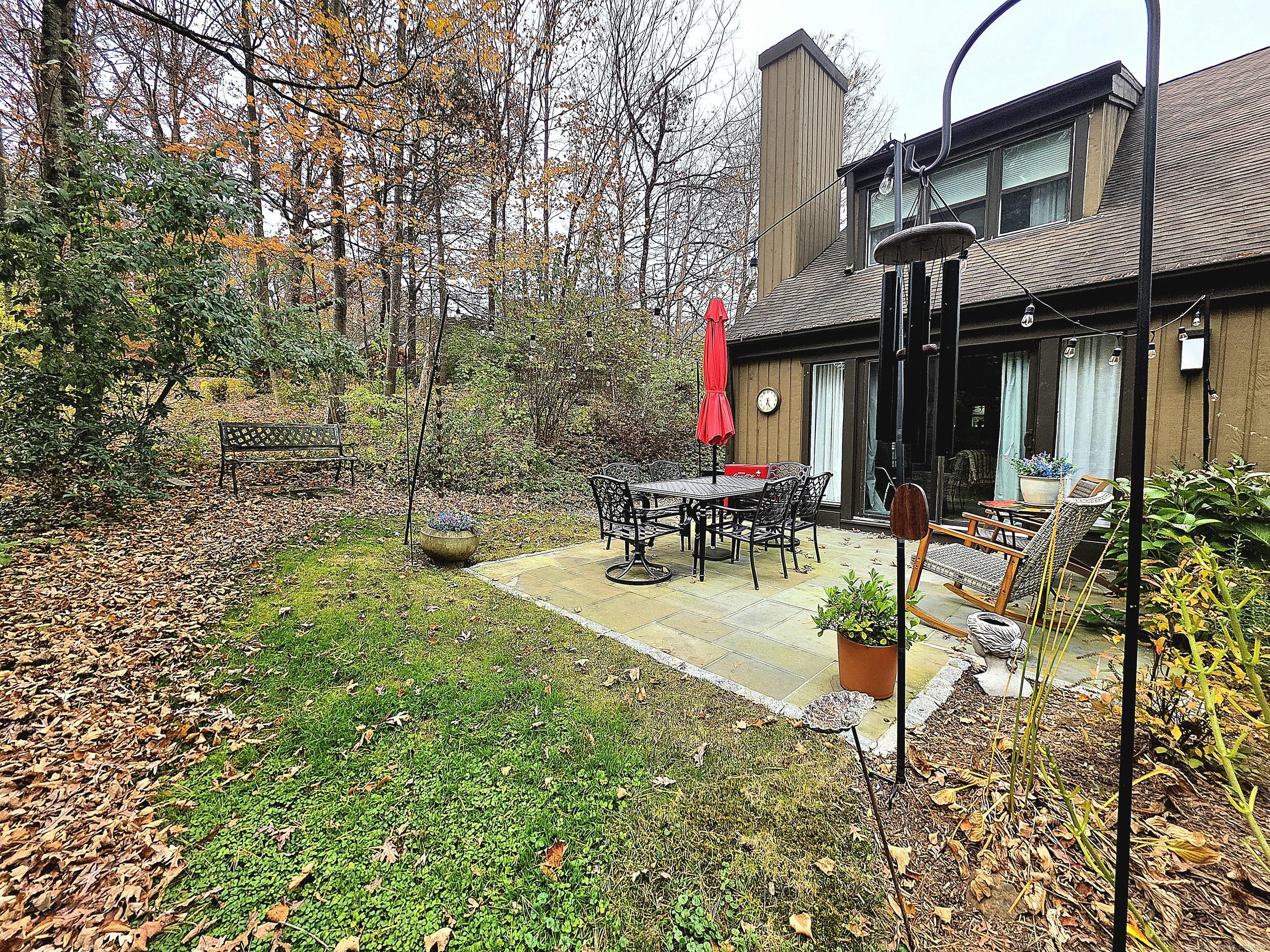 This chic, well maintained Franklin was originally renovated in 2023 but since then the current owner installed an economical HEAT PUMP, WATER METER, STORM DOOR, ADDITIONAL FIBERGLASS INSULATION IN THE ATTIC, and created a serene parklike setting when an oversized flagstone patio was installed beyond the back slider. Half of a duplex, the condo offers views of greenery from 3 of its 4 sides. Short, gentle walk, with no stairs, from the nearby garage to the private entrance plus walking distance to the ponds, pools 1 & 2 and most activity buildings. The new coat closet provides more storage and allows the old closet to be used as a pantry to supplement kitchen storage. Two sliders; one in the dining room & the other in the living room, provide ample opportunity to view passing wildlife & allow natural light to filter in. The open balcony lends a contemporary feel to the floorplan, brings natural light to the 2nd floor hallway & provides views of the living room & the green space beyond. Upstairs, the main bath was reimagined with a low step tiled shower that's no longer under the sloped eaves, and a laundry area that accommodates a full-sized front load washer & dryer, included in the sale. Uniform easy care luxury vinyl flooring throughout. Windows & sliders were replaced in 2023. Premium Cable, internet & pest control included in HOA. With so much to do, Heritage Village is where you'll live your best life. All buyers pay a 1-time equity fee of $5000 to HVF at closing