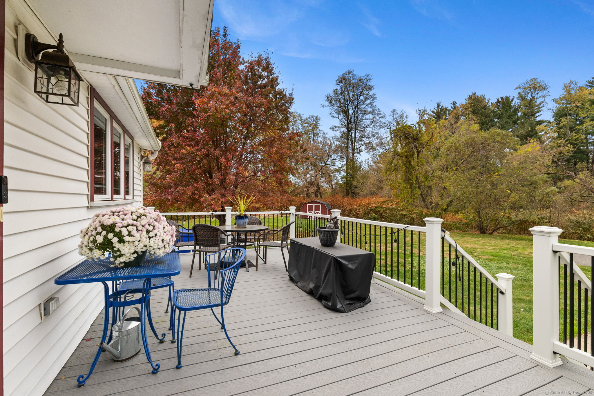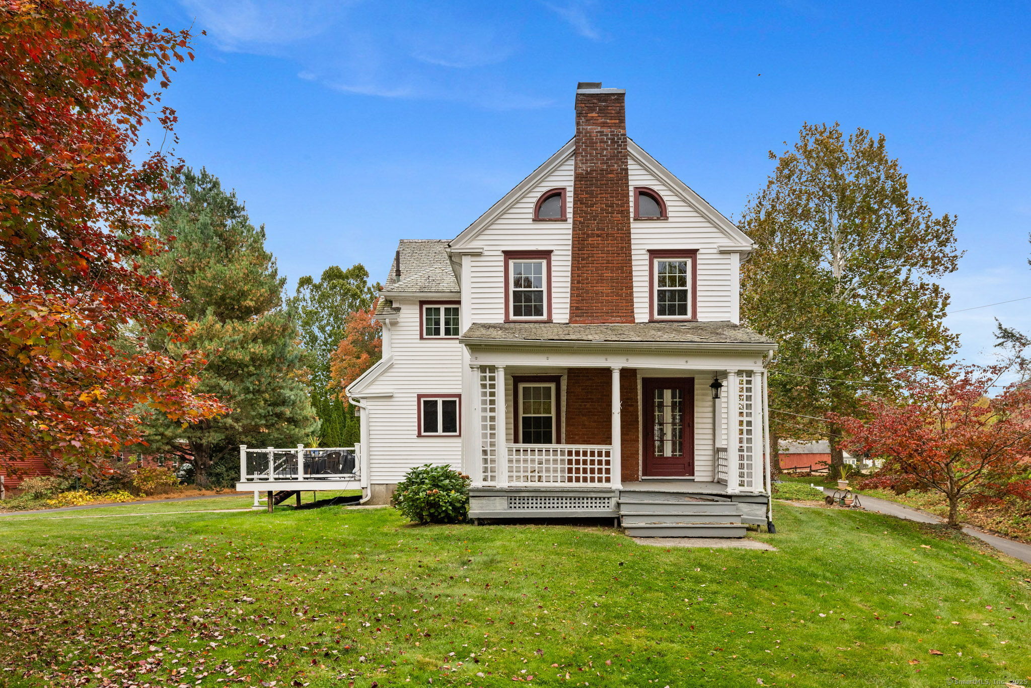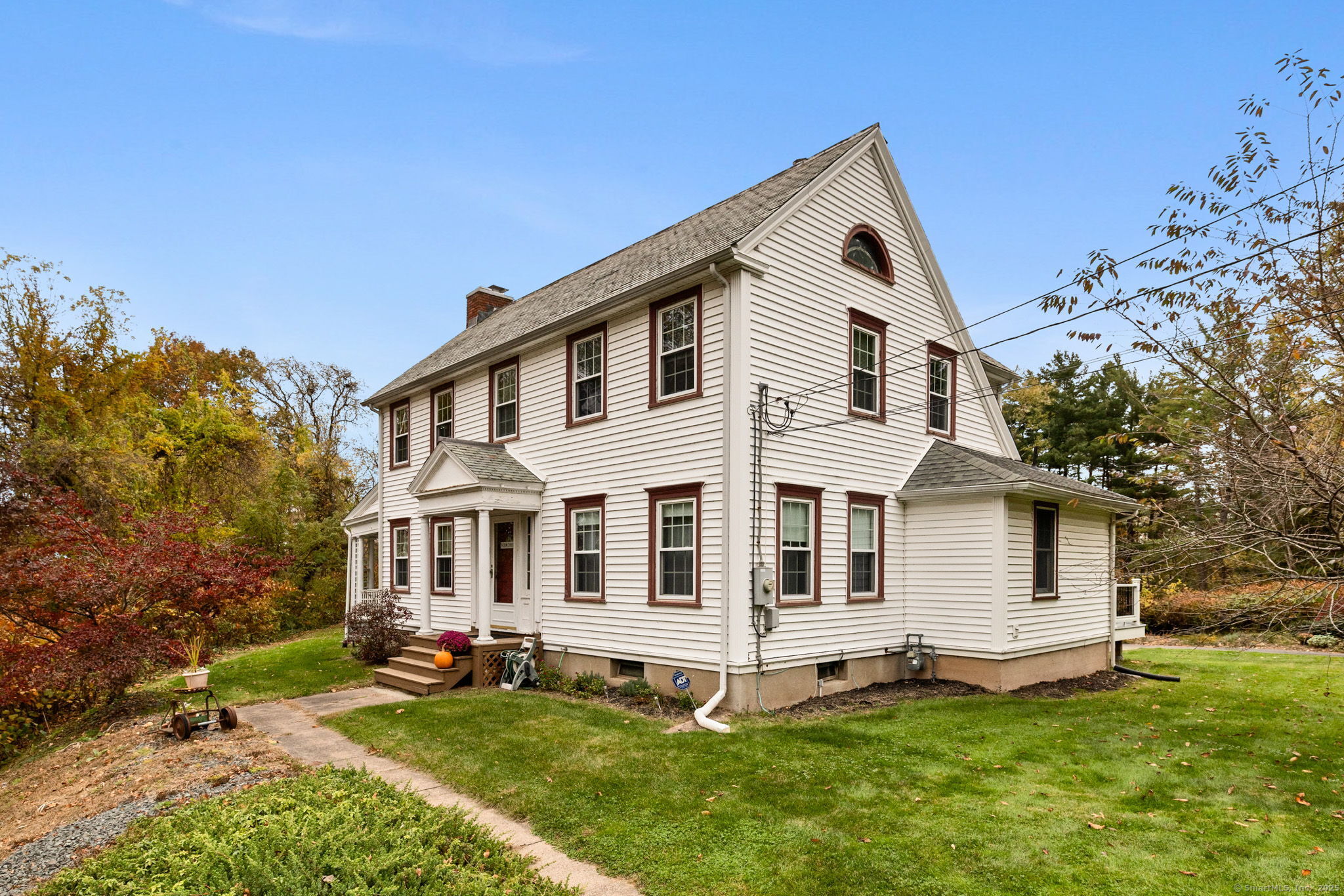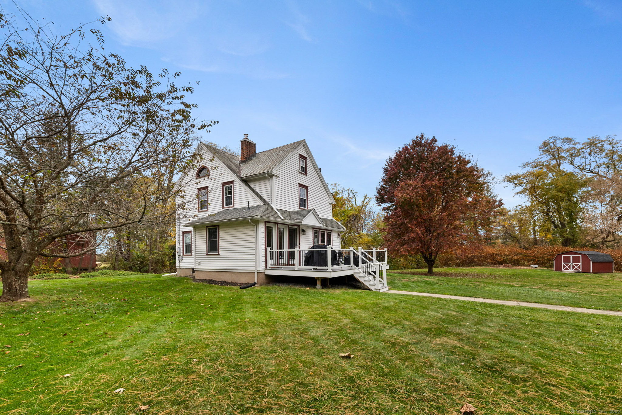 Welcome to this charming Colonial set on a picturesque .62-acre lot in the heart of South Windsor's historic district! Nestled on a quiet dead-end street and surrounded by peaceful farmland, this home offers a perfect blend of character and modern comfort. The first floor features a spacious eat-in kitchen with a center island, a full bath, convenient first-floor laundry, a formal dining room, and a cozy living room with a gas fireplace. Beautiful wood floors run throughout, adding warmth and timeless appeal. Upstairs, you'll find three inviting bedrooms, a full bath, and a walk-up attic offering great storage or potential for future expansion. Enjoy outdoor living on the large Trex deck overlooking the scenic backyard or relax on the charming side porch. Additional highlights include a brand-new septic system installed in 2025 and a storage shed for your outdoor equipment. A truly special home in a serene, historic setting!