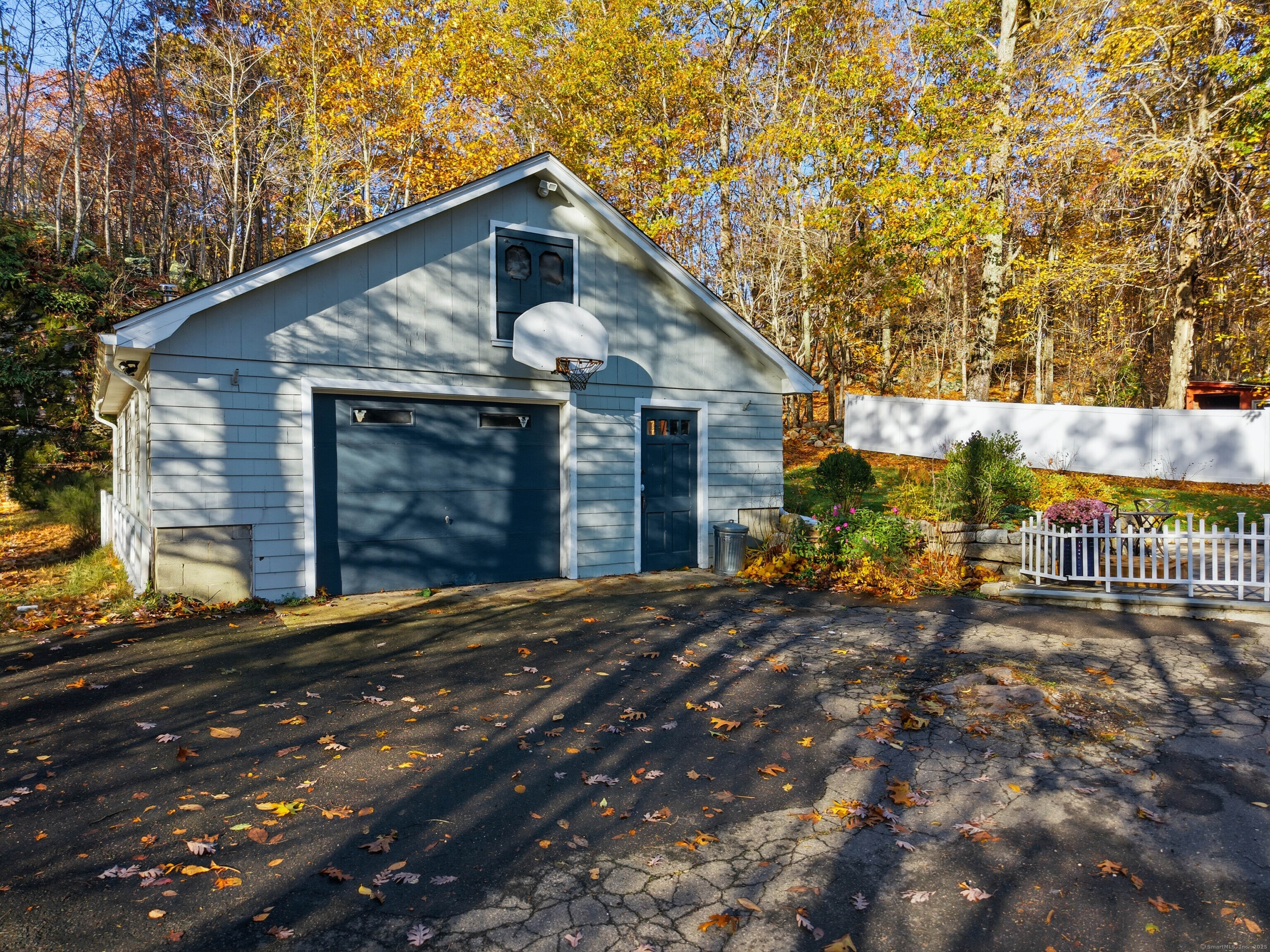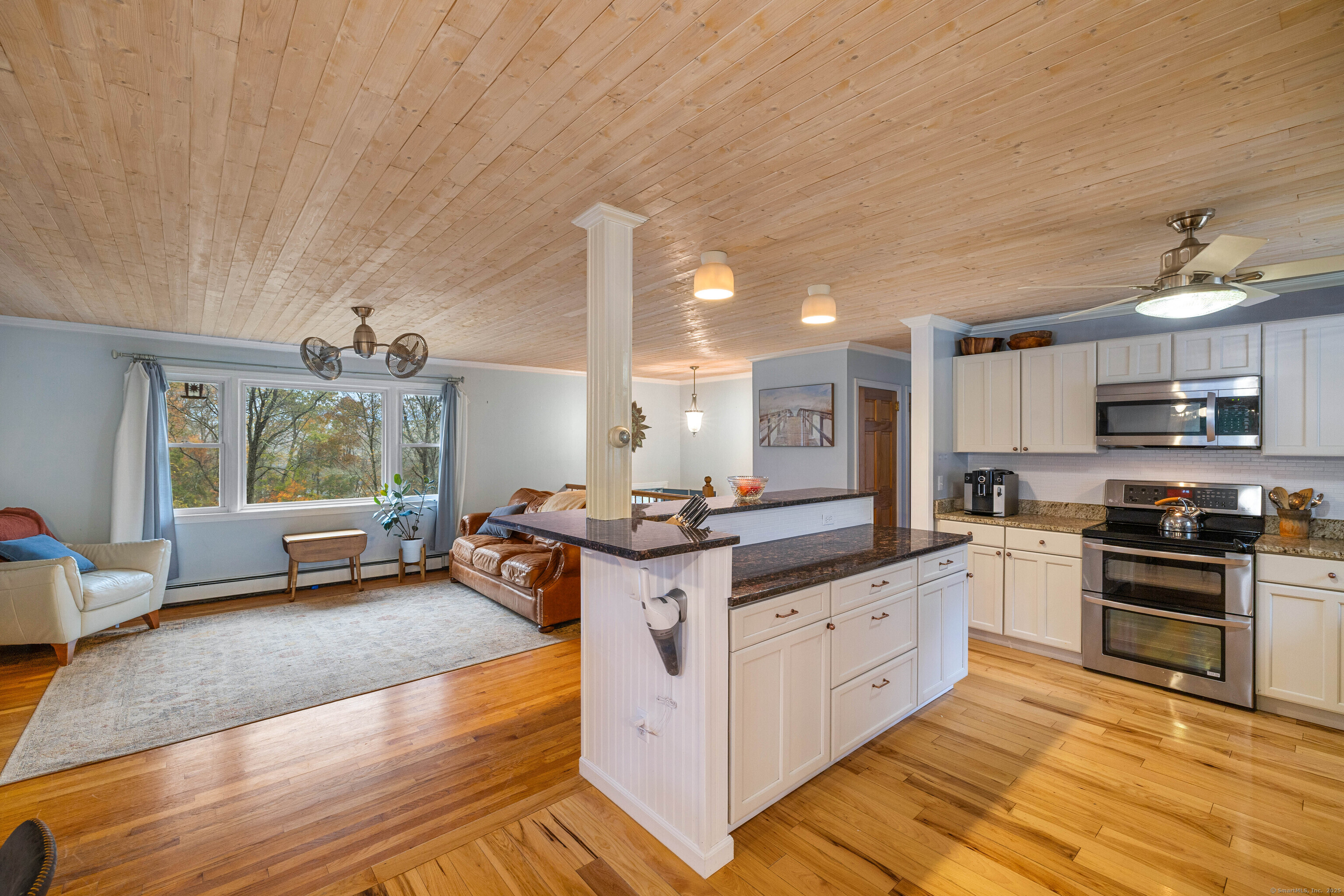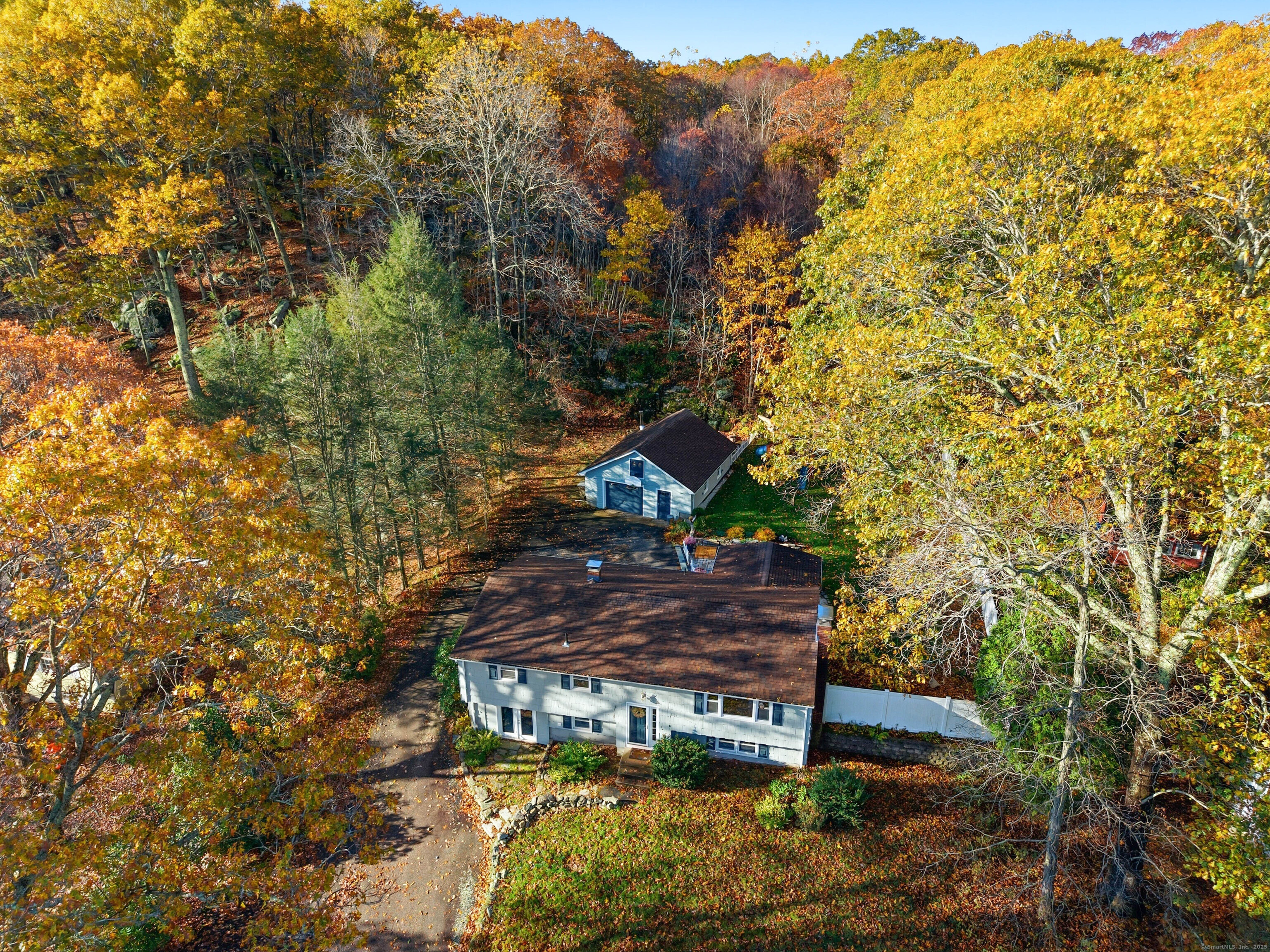 Shows Like New! Contemporary raised ranch loaded with space and style. This beautifully maintained home features a bright, open floor plan ideal for modern living. The living room with fireplace and wood stove insert flows seamlessly into the dining area and updated kitchen, complete with a center island, granite countertops, and newer appliances. A striking light wood ceiling adds warmth and architectural appeal. An additional rear room-perfect for a playroom, office, or sunroom-opens to a new patio overlooking private, wooded grounds with walking trails throughout the 3.7-acre lot. The main level offers three generous bedrooms and a full bath. The lower level includes another bedroom and bath, plus a spacious family room with fireplace and an extra room ideal for a home gym, hobby space, or media room, with a slider leading outside. A detached oversized one-car garage with loft storage provides plenty of extra room for tools, toys, or future workshop space. Enjoy privacy, nature, and modern comfort-all just minutes from Niantic's beaches, shops, and restaurants. Come see this move-in-ready gem today! Finished sunroom and lower level are listed as gross sq. ft on property card.
