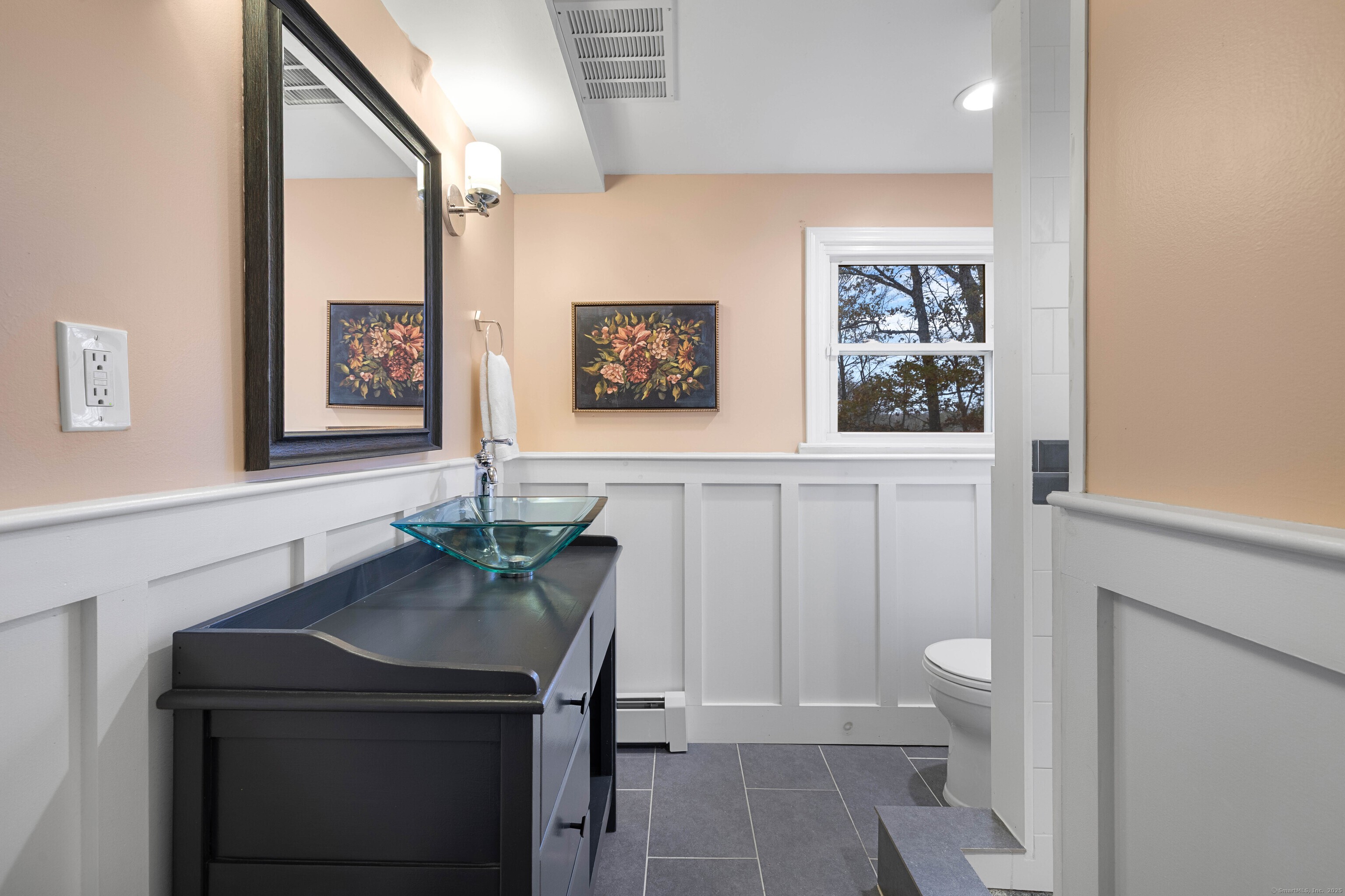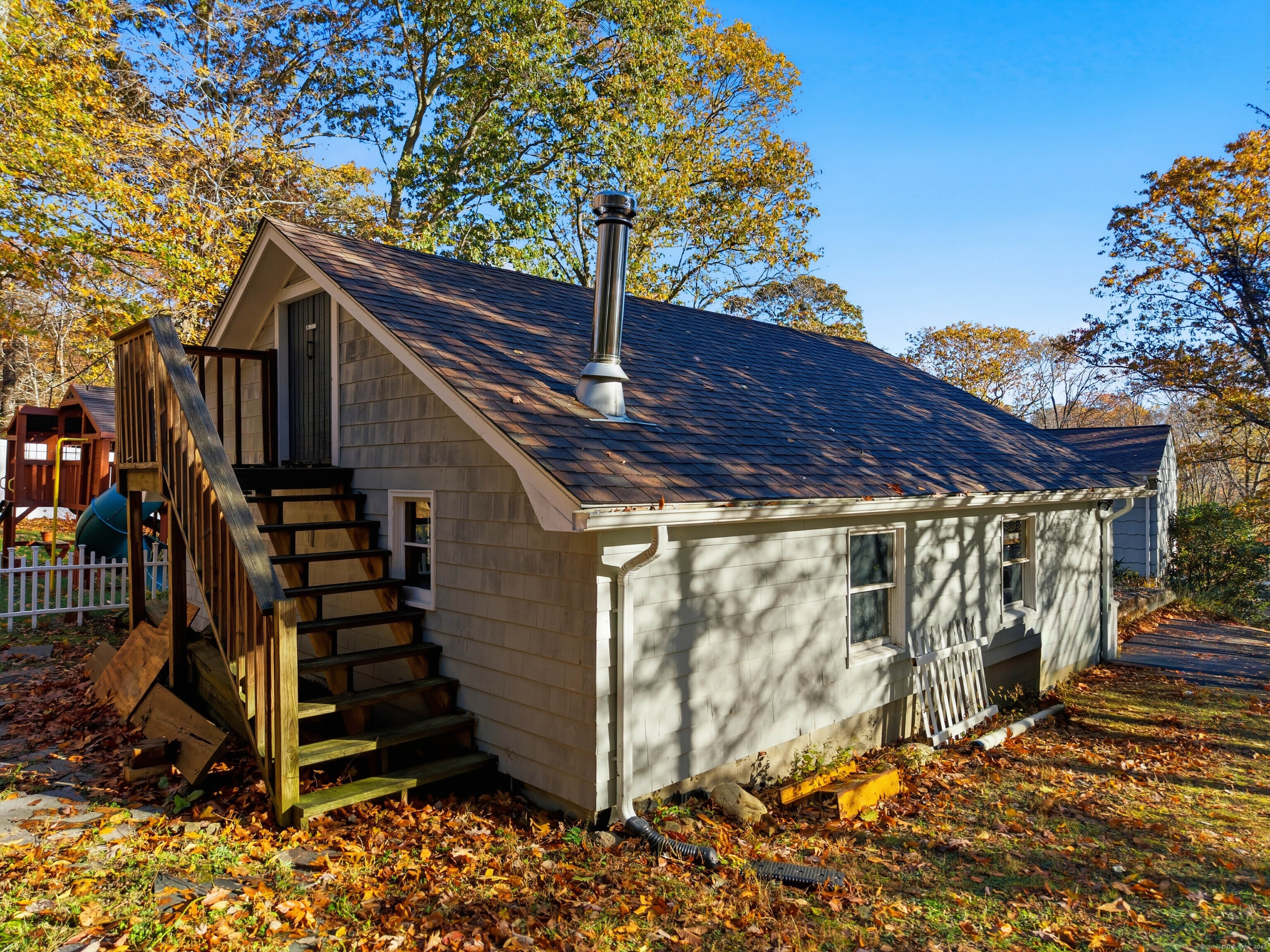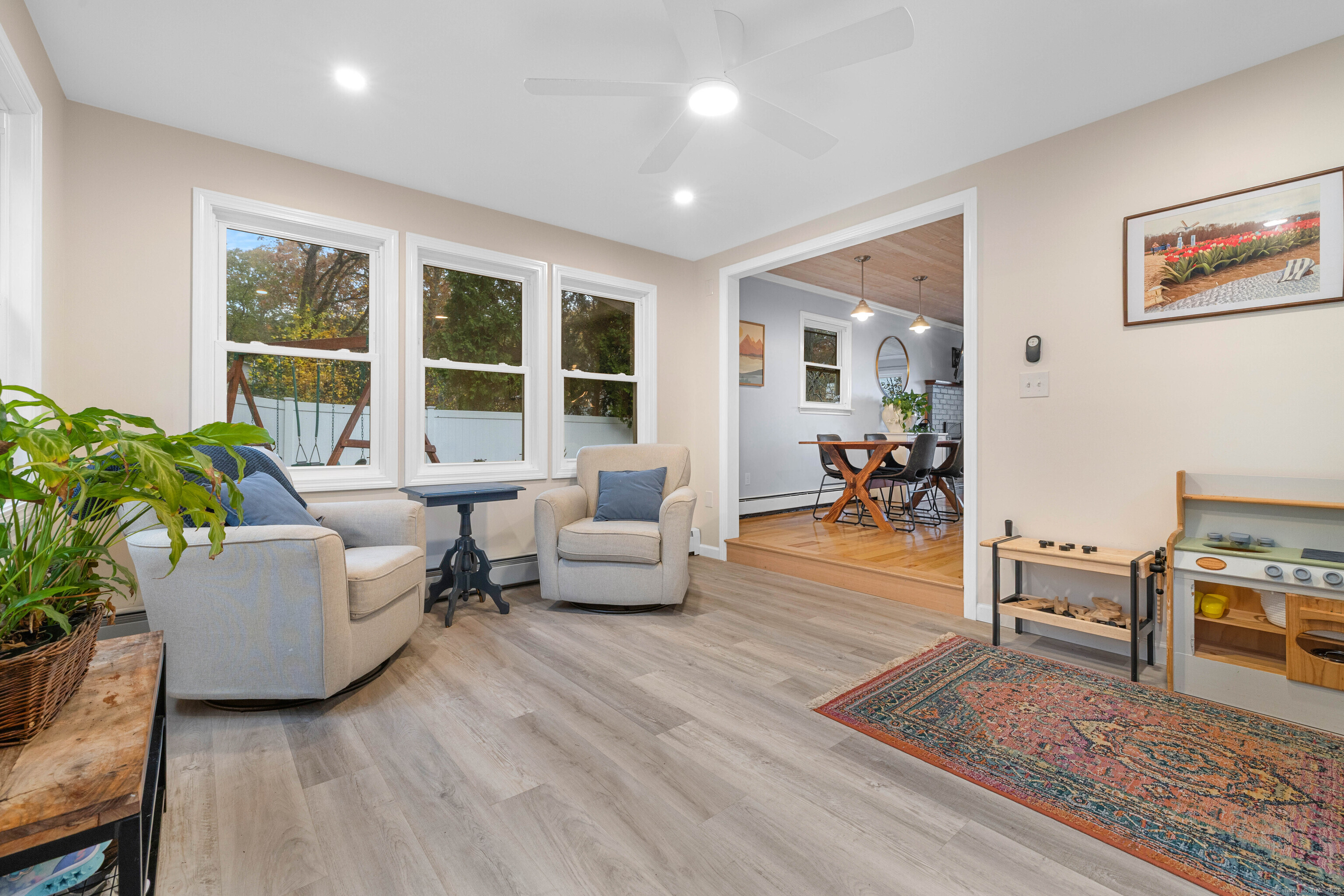 Shows Like New! Contemporary raised ranch loaded with space and style. This beautifully maintained home features a bright, open floor plan ideal for modern living. The living room with fireplace and wood stove insert flows seamlessly into the dining area and updated kitchen, complete with a center island, granite countertops, and newer appliances. A striking light wood ceiling adds warmth and architectural appeal. An additional rear room-perfect for a playroom, office, or sunroom-opens to a new patio overlooking private, wooded grounds with walking trails throughout the 3.7-acre lot. The main level offers three generous bedrooms and a full bath. The lower level includes another bedroom and bath, plus a spacious family room with fireplace and an extra room ideal for a home gym, hobby space, or media room, with a slider leading outside. A detached oversized one-car garage with loft storage provides plenty of extra room for tools, toys, or future workshop space. Enjoy privacy, nature, and modern comfort-all just minutes from Niantic's beaches, shops, and restaurants. Come see this move-in-ready gem today! Finished sunroom and lower level are listed as gross sq. ft on property card.