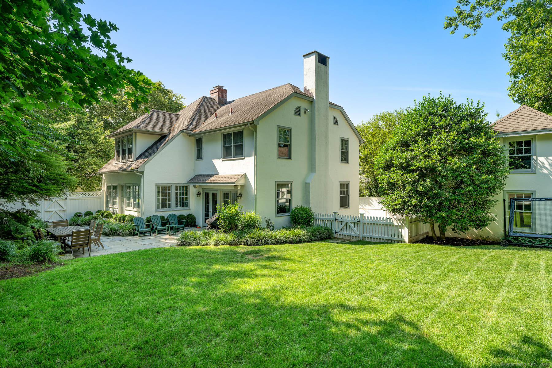 Perfectly positioned between conservation land and one of Greenwich's most prestigious roads, this five-bedroom home combines exceptional convenience with refined privacy. A tree-lined sidewalk provides direct access to downtown, while the property offers a serene, retreat-like setting. French doors open to a spacious terrace with outdoor lighting and a fully fenced yard, adjacent to an oversized two-car garage with bonus space above. The elegant family room showcases a grand stone fireplace and views of the manicured lawn, and don't miss the lower level complete with a playroom, laundry, and wine cellar.