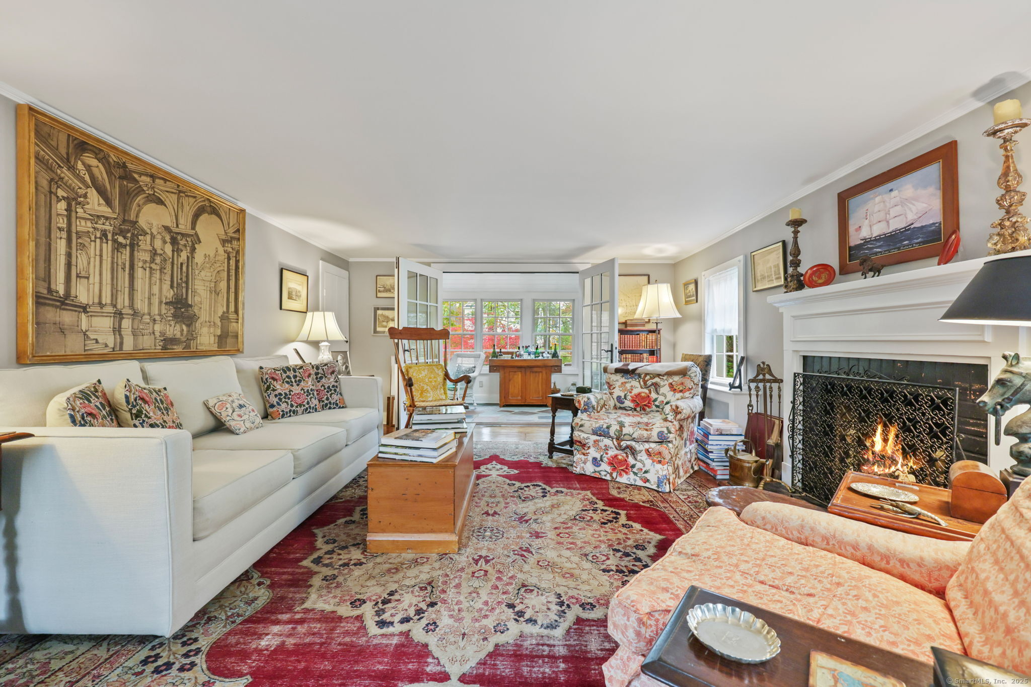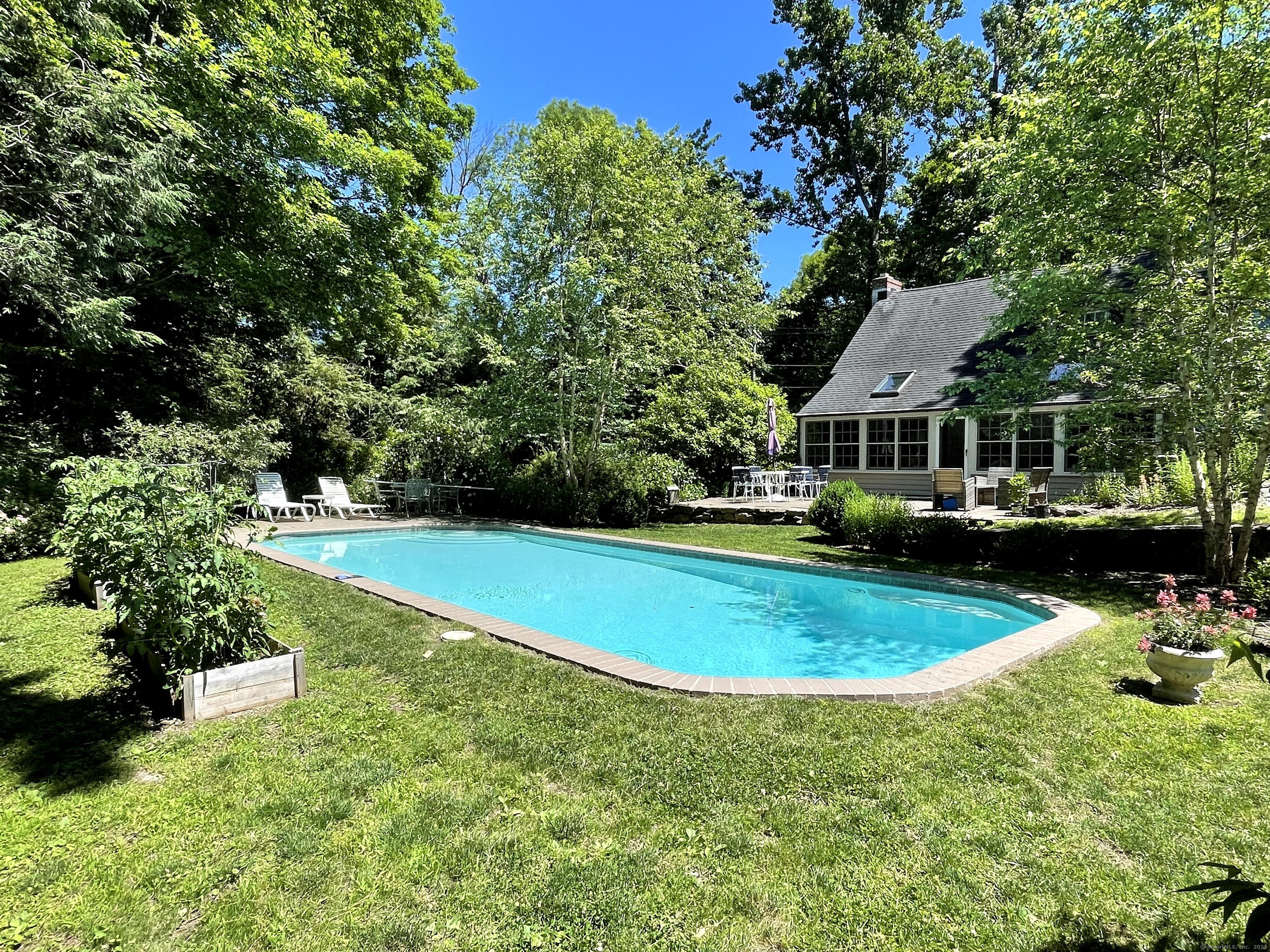 Exceptional three-bedroom antique Colonial exudes tremendous curb appeal on 1.51 pastoral acres with heated pool, inviting terrace, fenced-in level yard, meadow teeming with native plants surrounding pond in a peaceful country setting across from a horse farm. Enduring charm defines this well maintained, thoughtfully updated 1800 home rich in classic architectural details with wide plank wood floors, French doors and built-in cabinetry. Marble-clad kitchen offers a basketweave tiled backsplash, a nod to the home's history as a basket shop. Living room with fireplace, dining room and sunroom with pellet stove, skylights and outdoor access are great for relaxed living and entertaining. Primary suite with adjacent sitting room, office, nursery or additional bedroom; third bedroom and full bath complete the second floor.