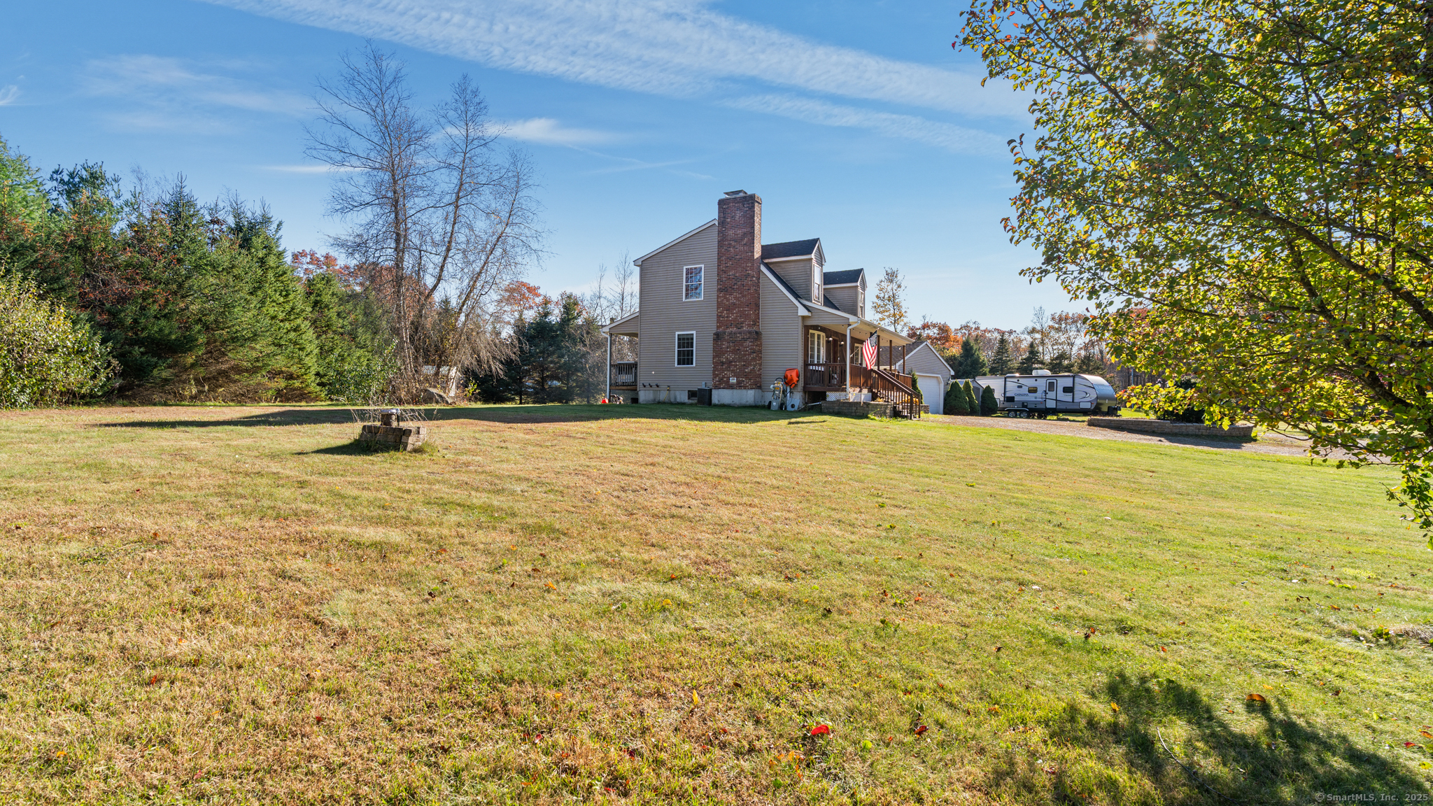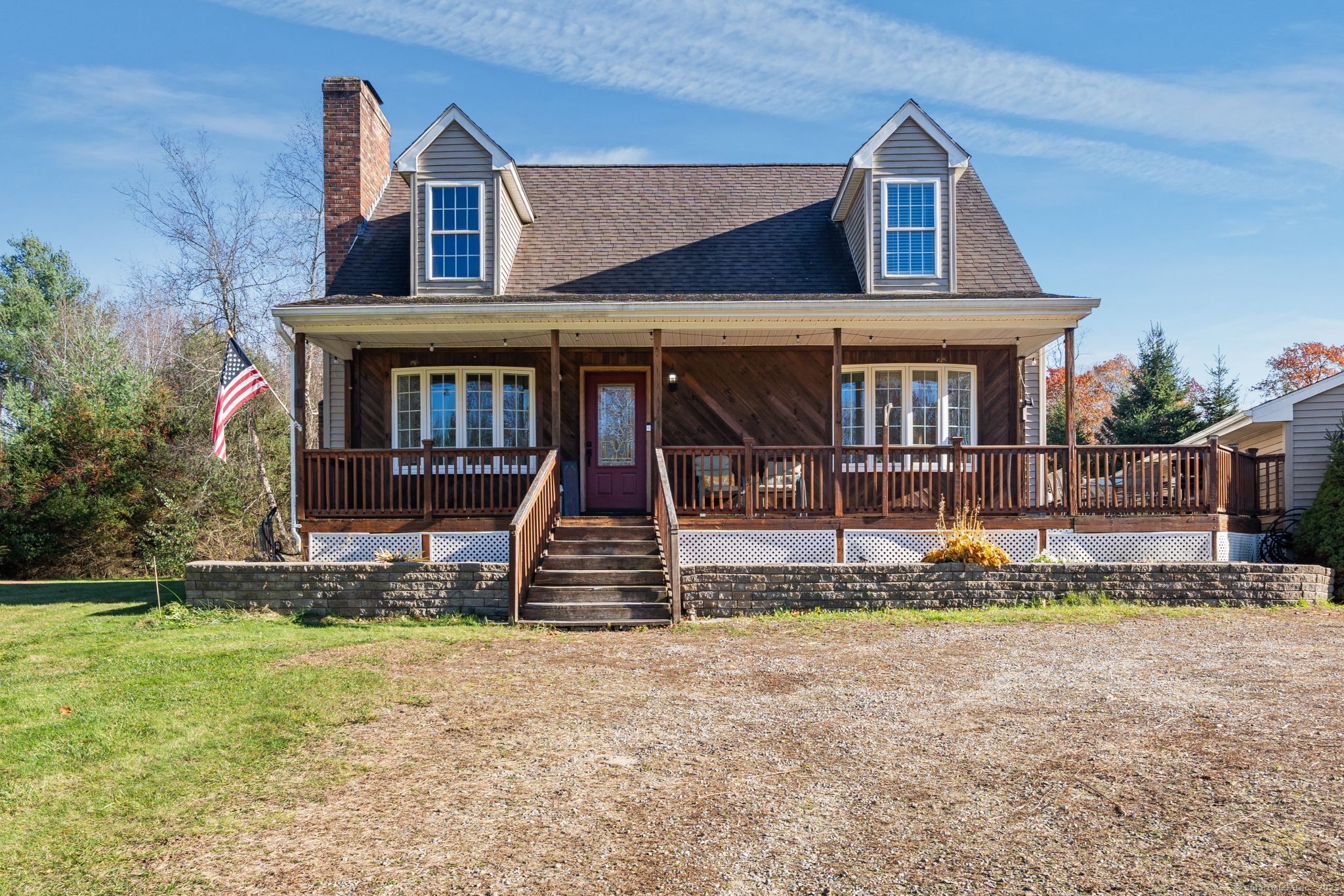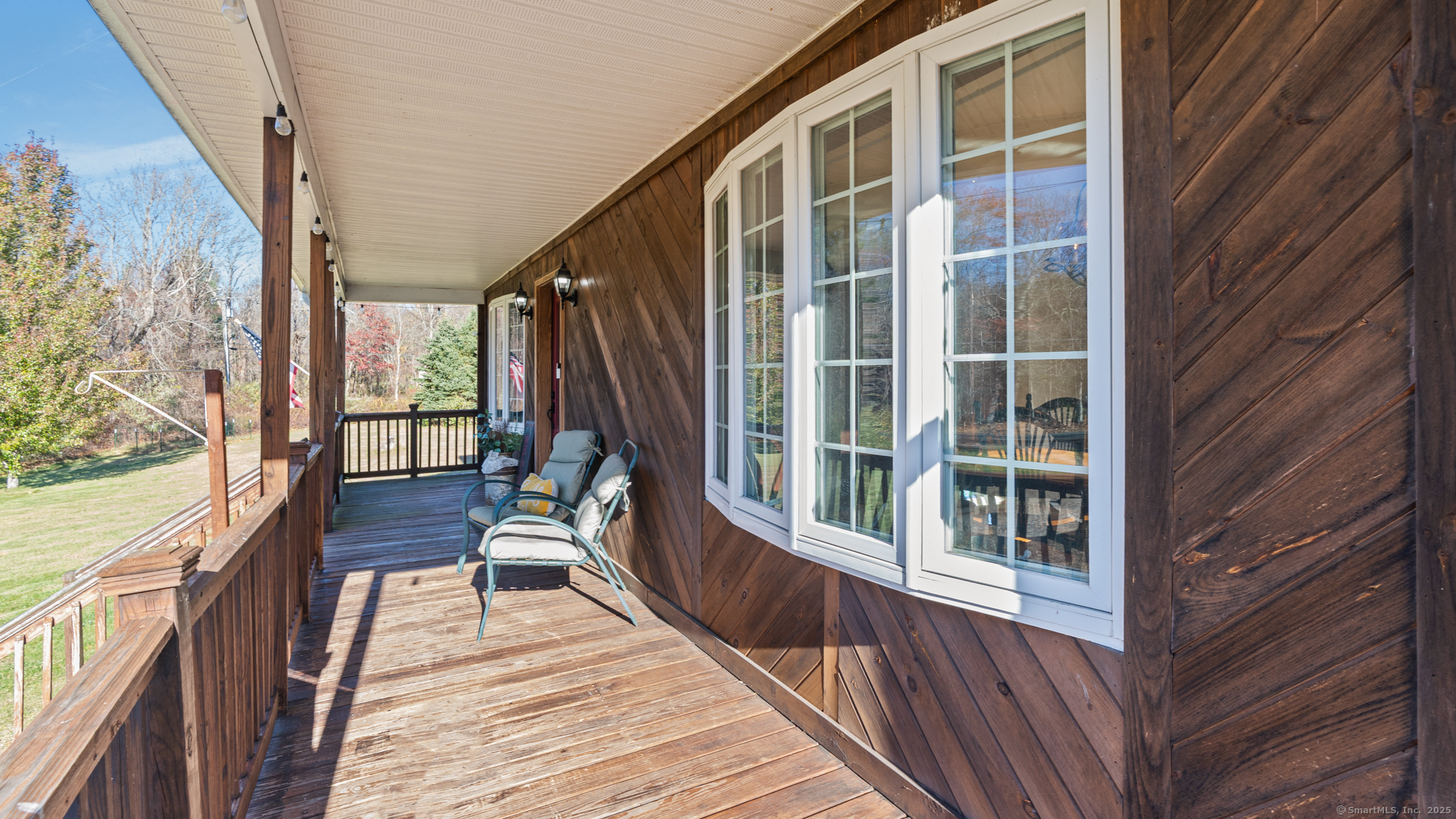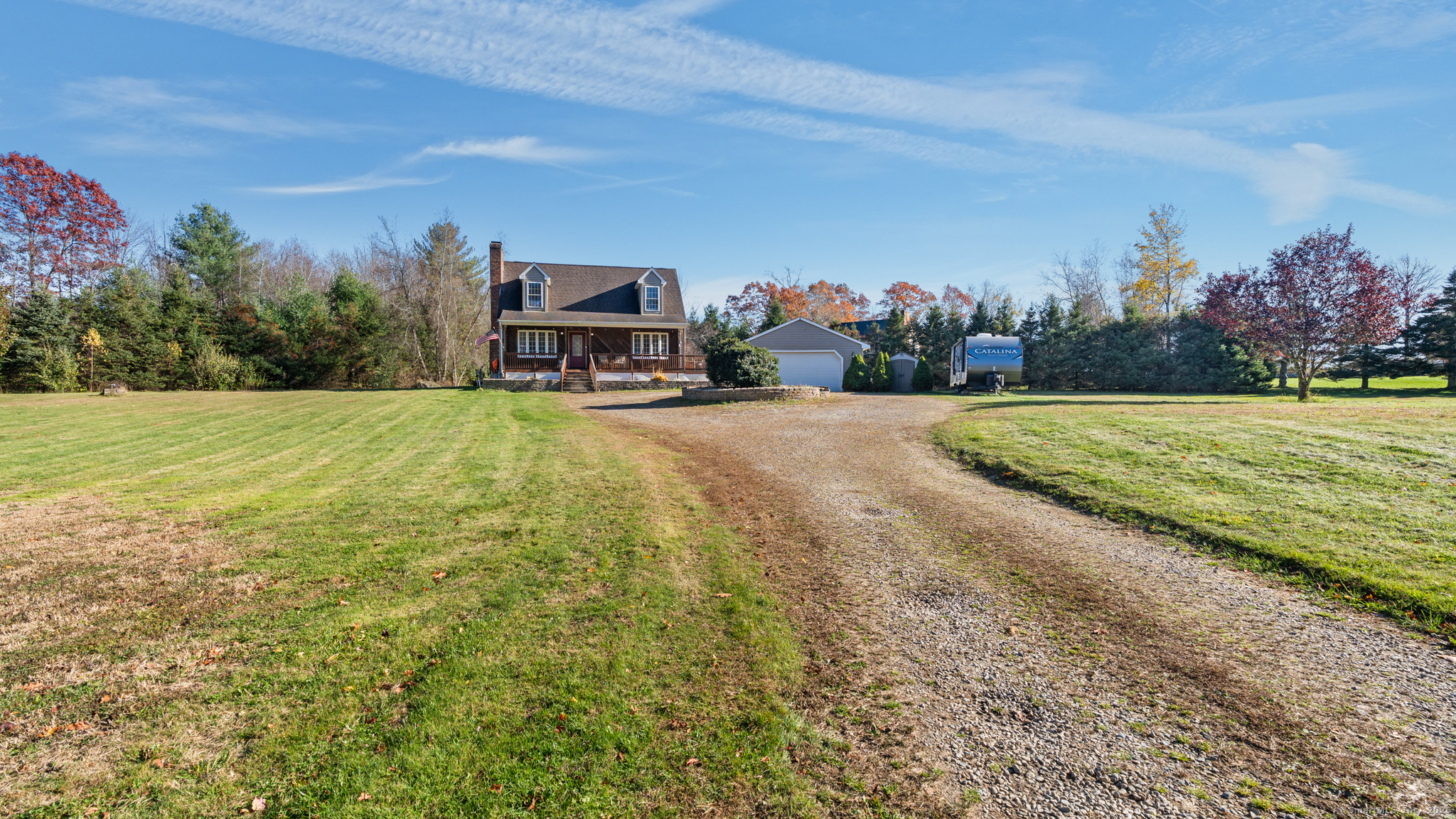 Charming Cape on a Beautiful Level Lot! Welcome home to this inviting Cape featuring a warm and welcoming fireplaced living room with Split rail balcony and vaulted ceiling, perfect for relaxing or entertaining. The spacious eat-in kitchen offers plenty of natural light and functionality for everyday living. Enjoy central air conditioning for year-round comfort and unwind on the classic farmers porch front and back overlooking the picturesque yard. The property also includes a detached oversized two-bay garage, ideal for vehicles, hobbies, or extra storage. Set on a nice level lot, this home combines New England charm with modern conveniences-ready for you to move right in and make it your own!