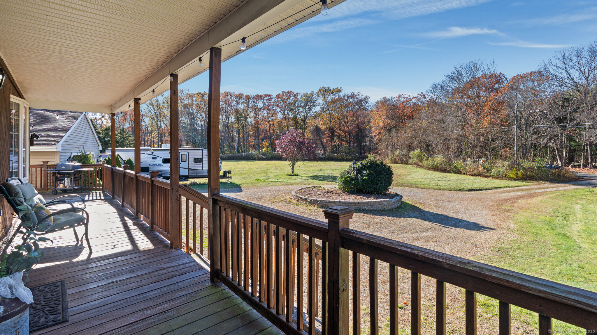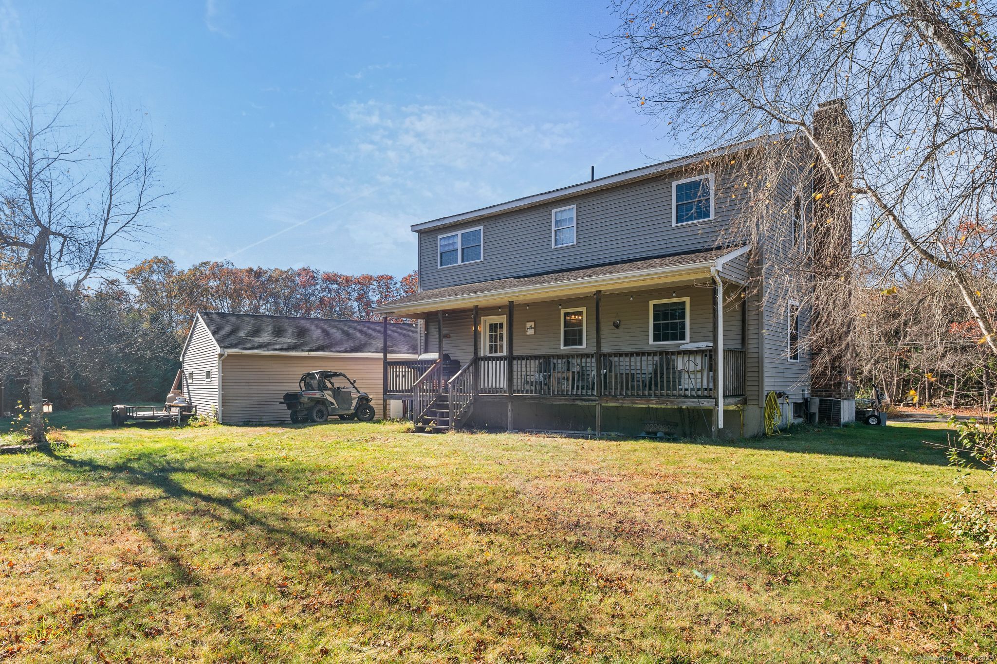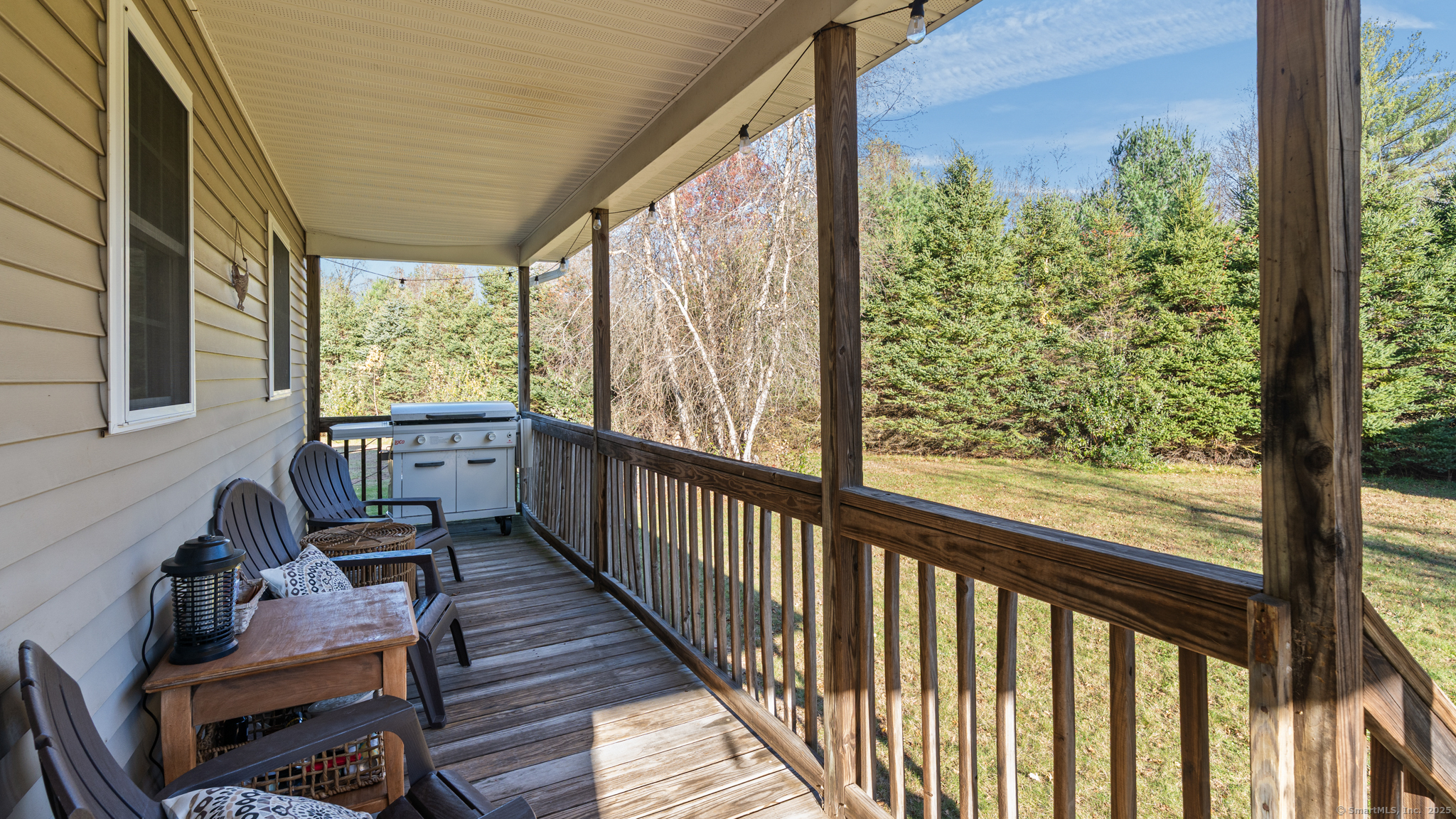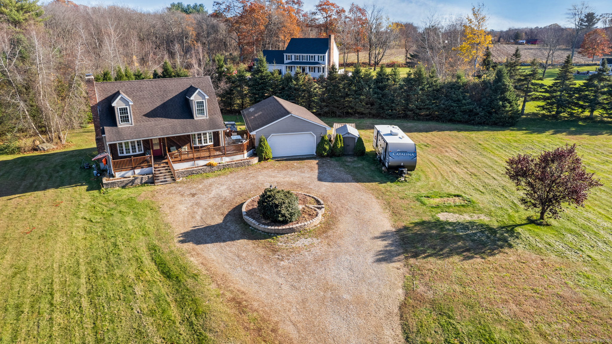 Charming Cape on a Beautiful Level Lot! Welcome home to this inviting Cape featuring a warm and welcoming fireplaced living room with Split rail balcony and vaulted ceiling, perfect for relaxing or entertaining. The spacious eat-in kitchen offers plenty of natural light and functionality for everyday living. Enjoy central air conditioning for year-round comfort and unwind on the classic farmers porch front and back overlooking the picturesque yard. The property also includes a detached oversized two-bay garage, ideal for vehicles, hobbies, or extra storage. Set on a nice level lot, this home combines New England charm with modern conveniences-ready for you to move right in and make it your own!