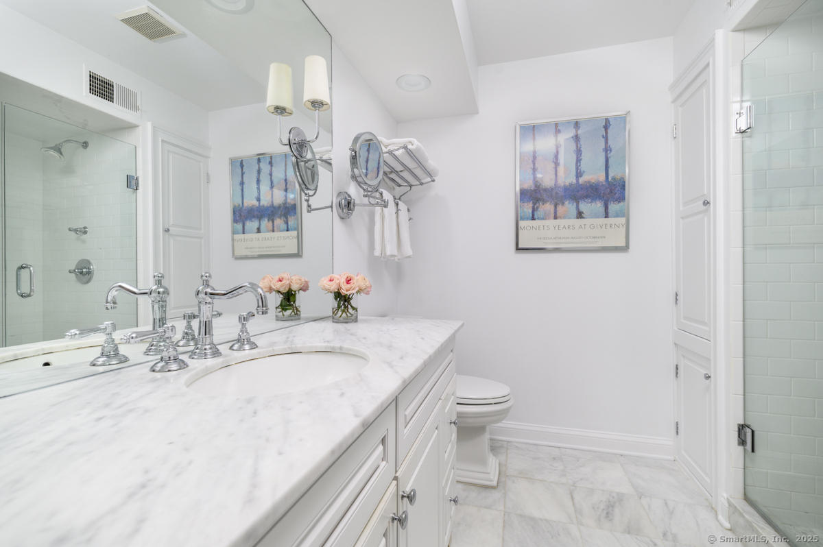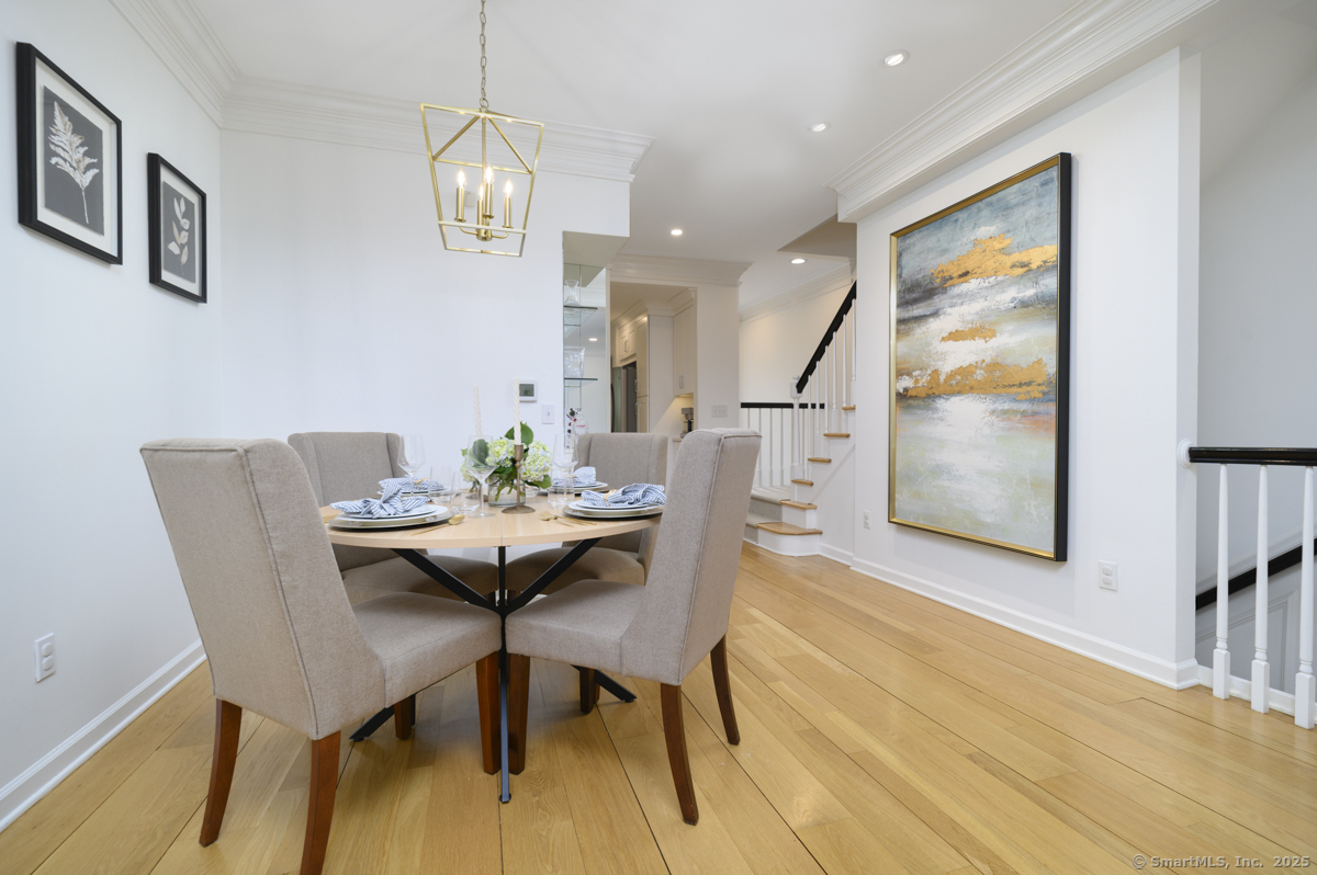 Walk to town or train from this elegant and fresh brownstone-style townhome in Darien. Enjoy three levels of living space with a clean, contemporary flair. The main floor features a sleek eat-in kitchen renovated in 2020 with hardwood floors, marble backsplash and new countertops. Also on the main level is a spacious and bright living/dining area with a fireplace, custom bookshelves, handsome moldings, upgraded lighting as well as a chic powder room. Additional living space is available outside on a private terrace off the living room. The upper level has two spacious bedrooms bathed in light with architectural windows and cathedral ceilings. Both bedrooms have en suite bathrooms updated with classic fixtures and finishes. The lower level includes laundry and additional finished space with a custom office niche and a wet bar that is suitable for work-from-home, play room or additional guest quarters. You'll love the convenience and sophistication that Pine Brook offers in the heart of Darien. This 20-unit complex is professionally managed and well-maintained. Common charges are reasonable. Recent capital improvements include roof replacement less than four years ago and driveway repaving in the past year. There are no outstanding assessments for these projects.