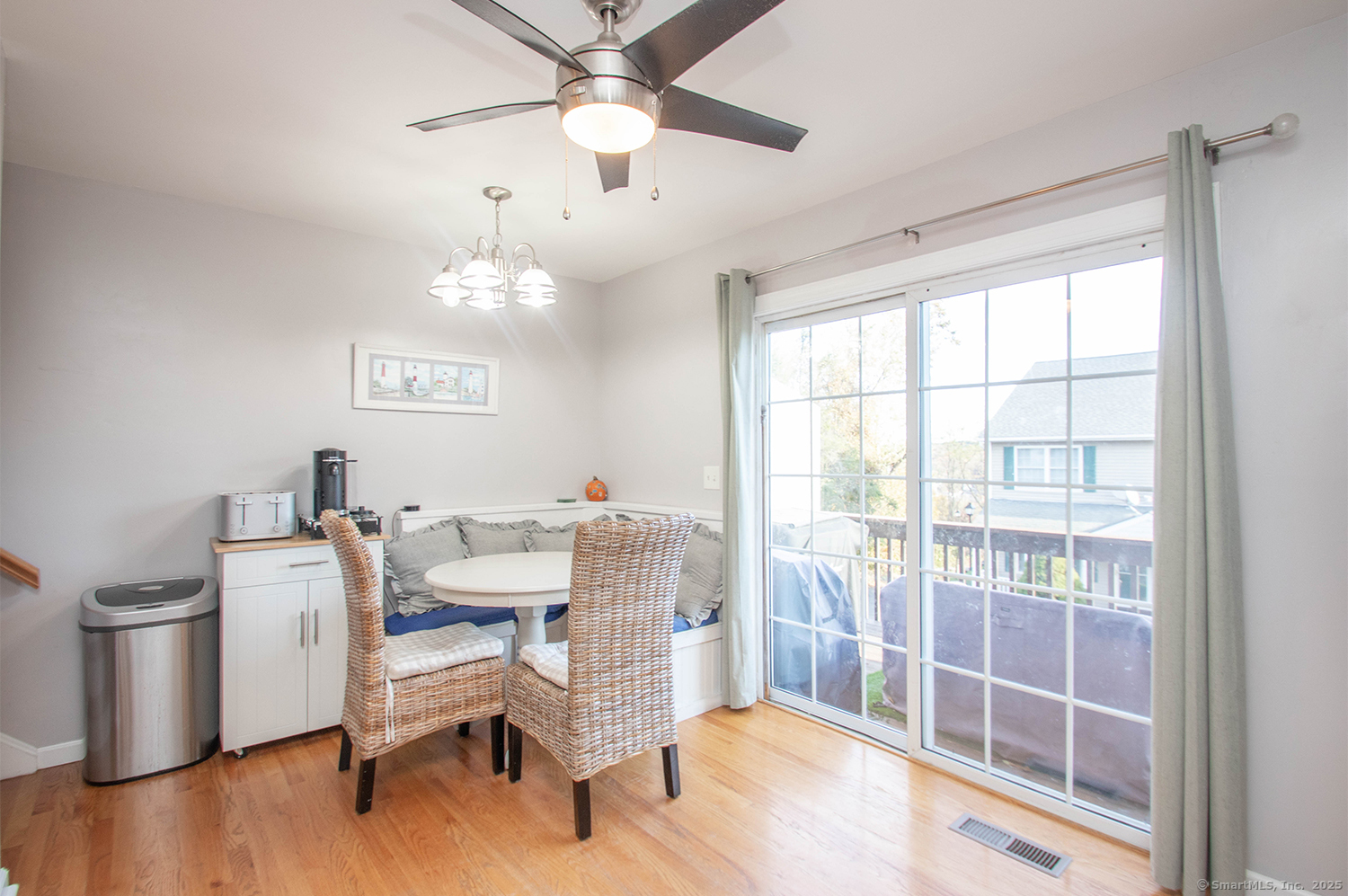 Move right into this beautifully maintained townhouse-style condo! The main level offers a spacious living room and an updated eat-in kitchen with sliders leading to a private balcony-perfect for relaxing or entertaining. A convenient half bath completes the first floor. Upstairs, you'll find two generously sized bedrooms that share a full bath. The lower level includes a garage and an additional room, ideal for storage or a home gym. This unit features tasteful updates, abundant natural light, and a charming built-in breakfast nook. Don't miss the chance to live in a vibrant community close to major highways, shopping, and restaurants!
