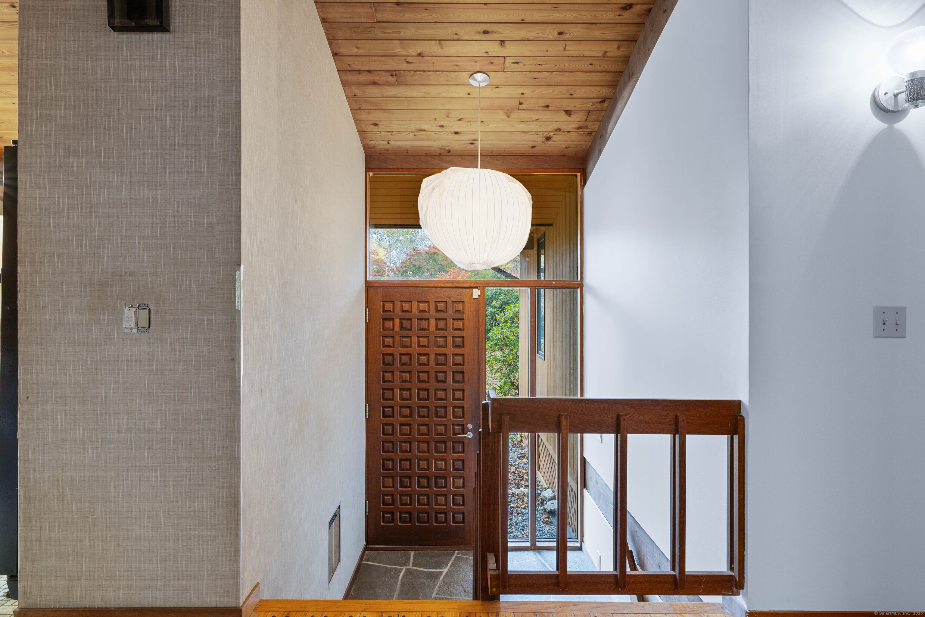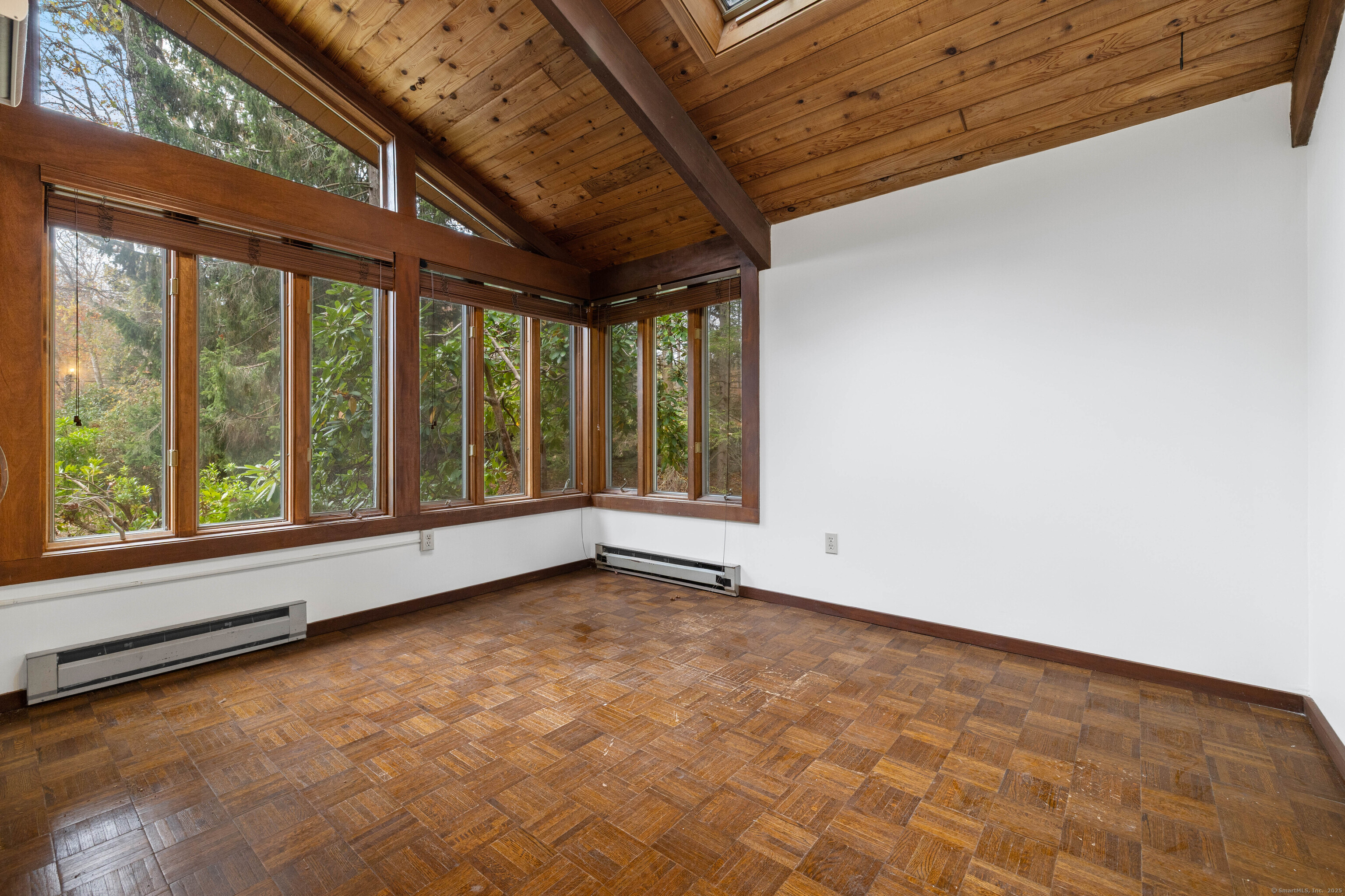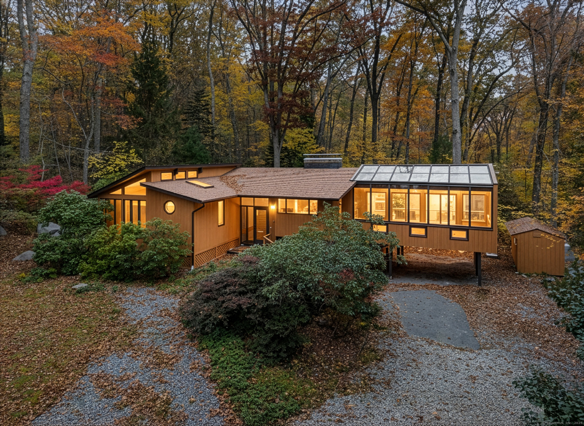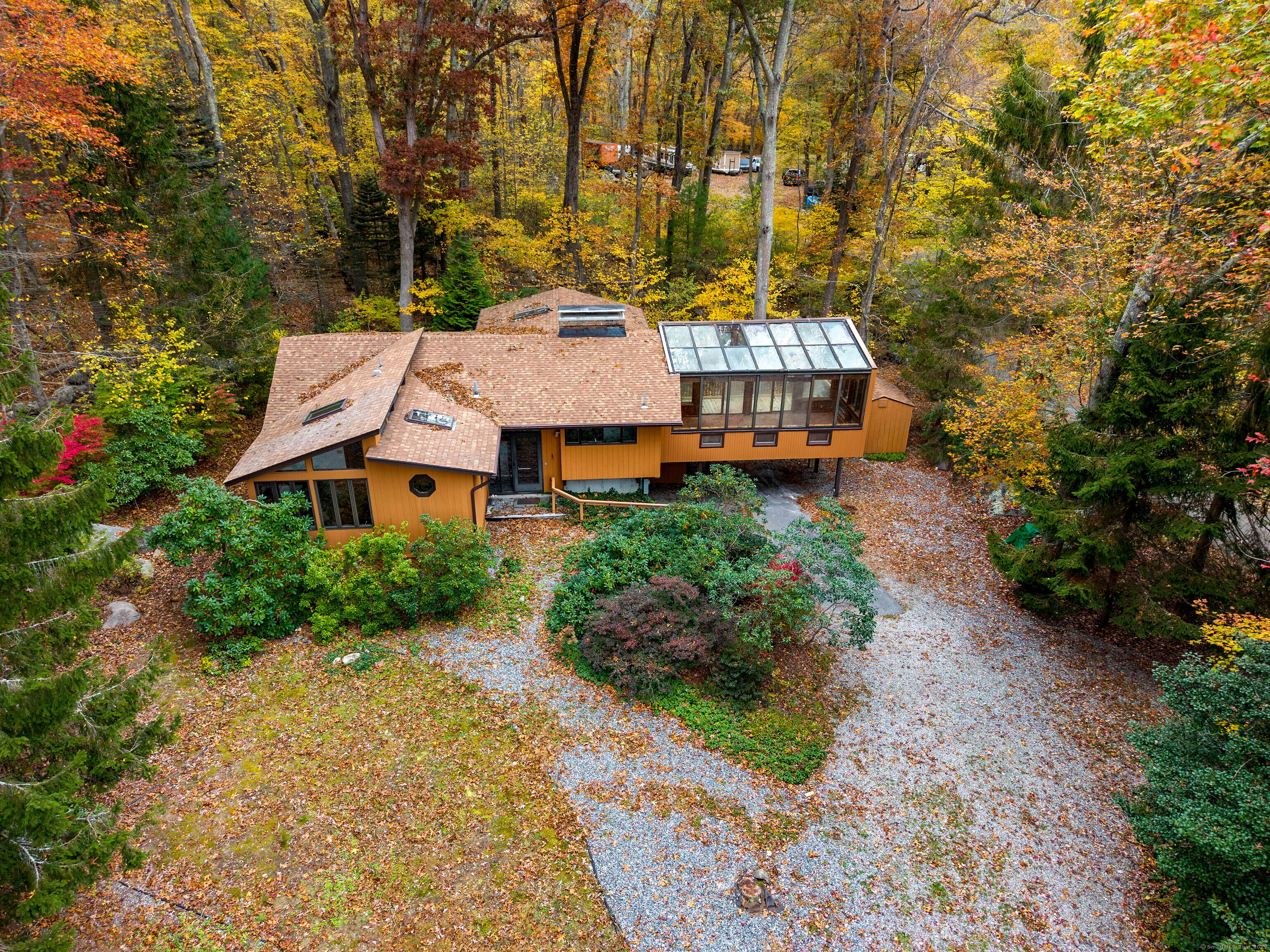 Designed by the renowned Acorn Deck House Company, this striking mid-century contemporary blends timeless craftsmanship with modern warmth. Vaulted cedar ceilings, exposed beams, and walls of glass invite nature inside, filling the home with natural light and serenity. The kitchen opens to a glass-enclosed sunroom and a screened porch-ideal for morning coffee or quiet evenings surrounded by trees. A double-sided brick fireplace anchors the open living area, complemented by hardwood floors and a seamless connection to the outdoors. Set against a backdrop of vibrant woodlands, this home embodies architectural character and peaceful living.