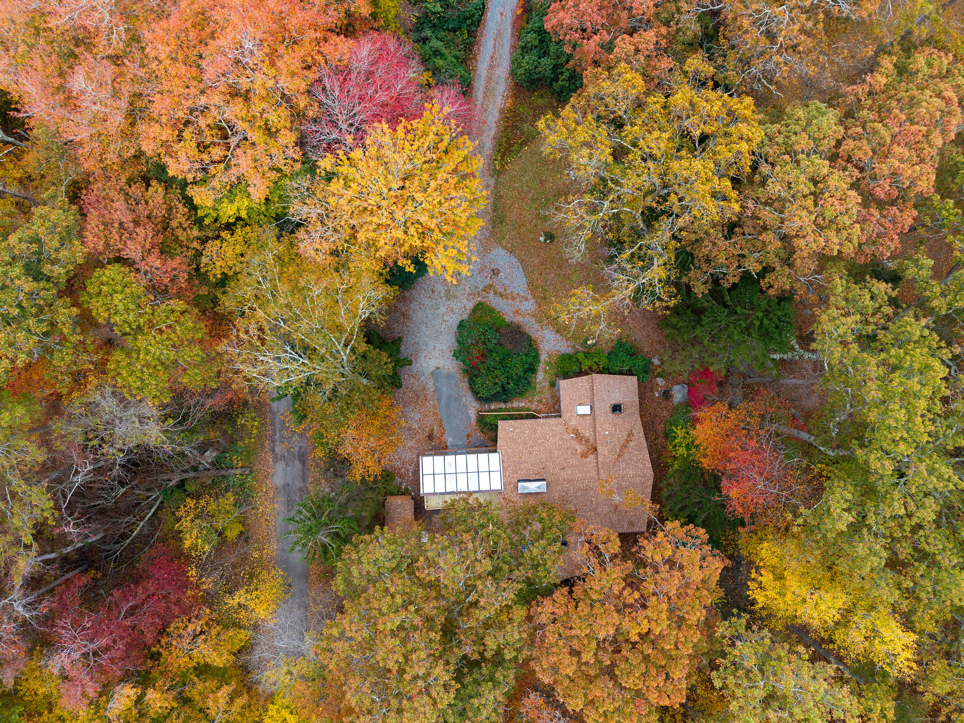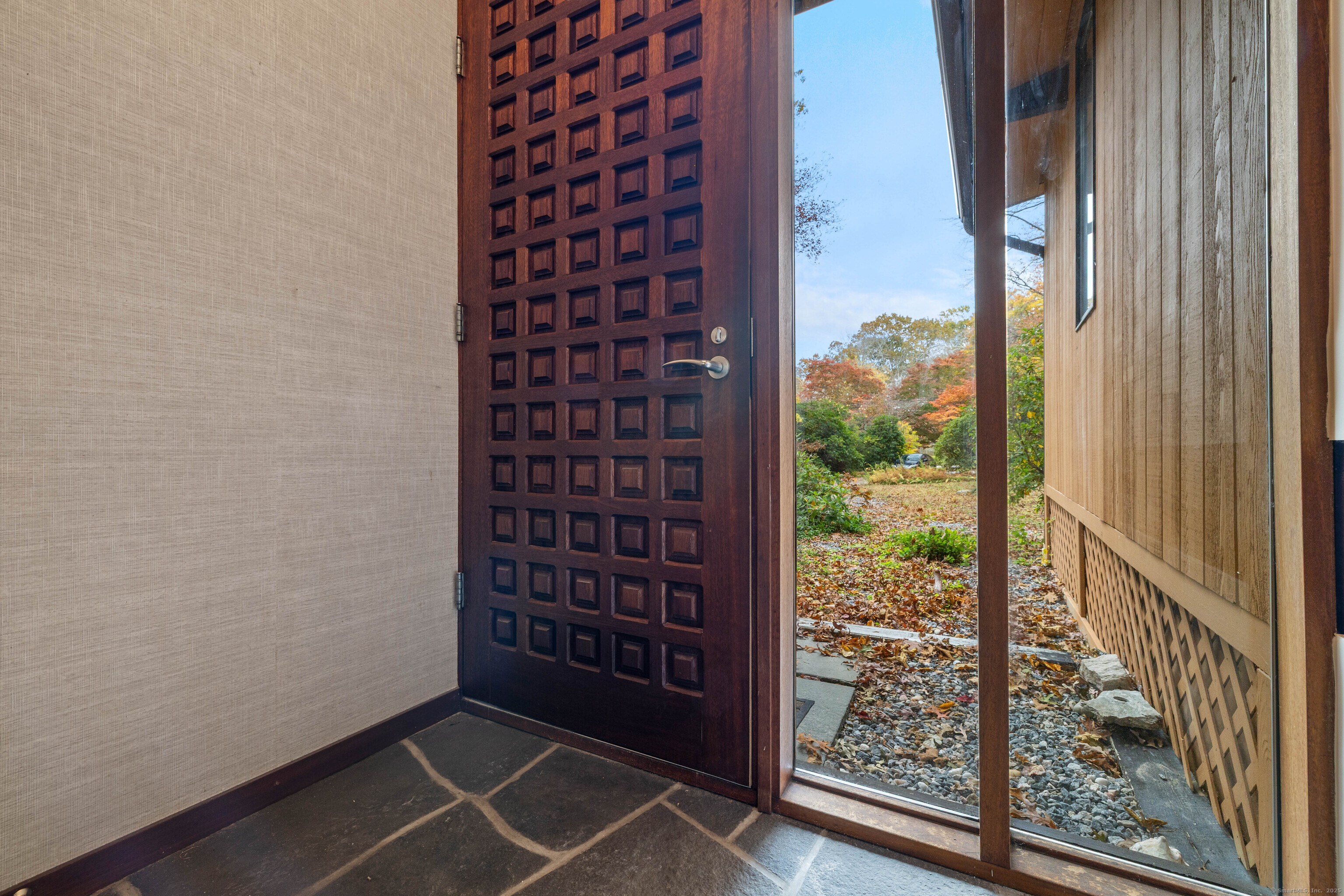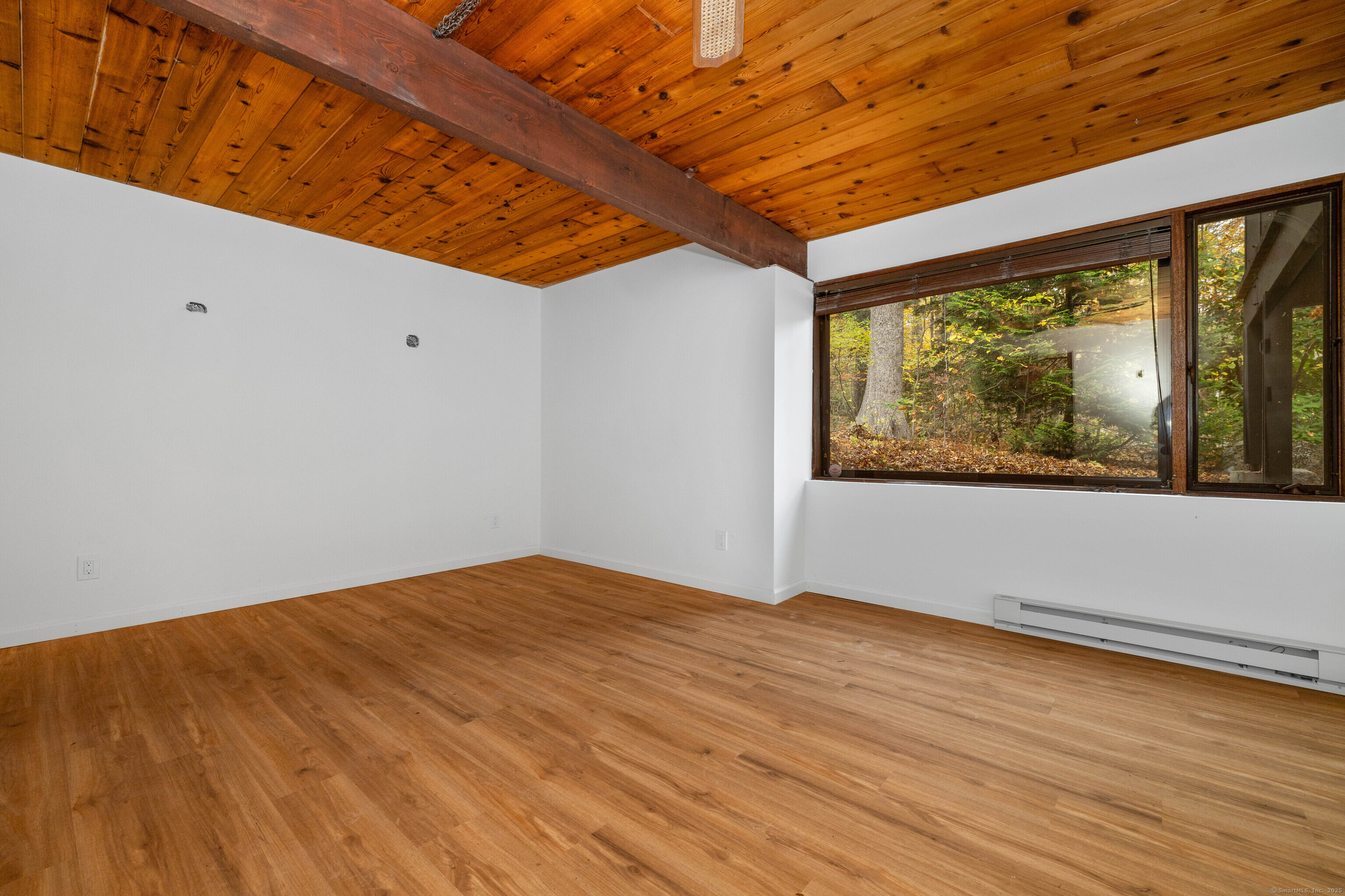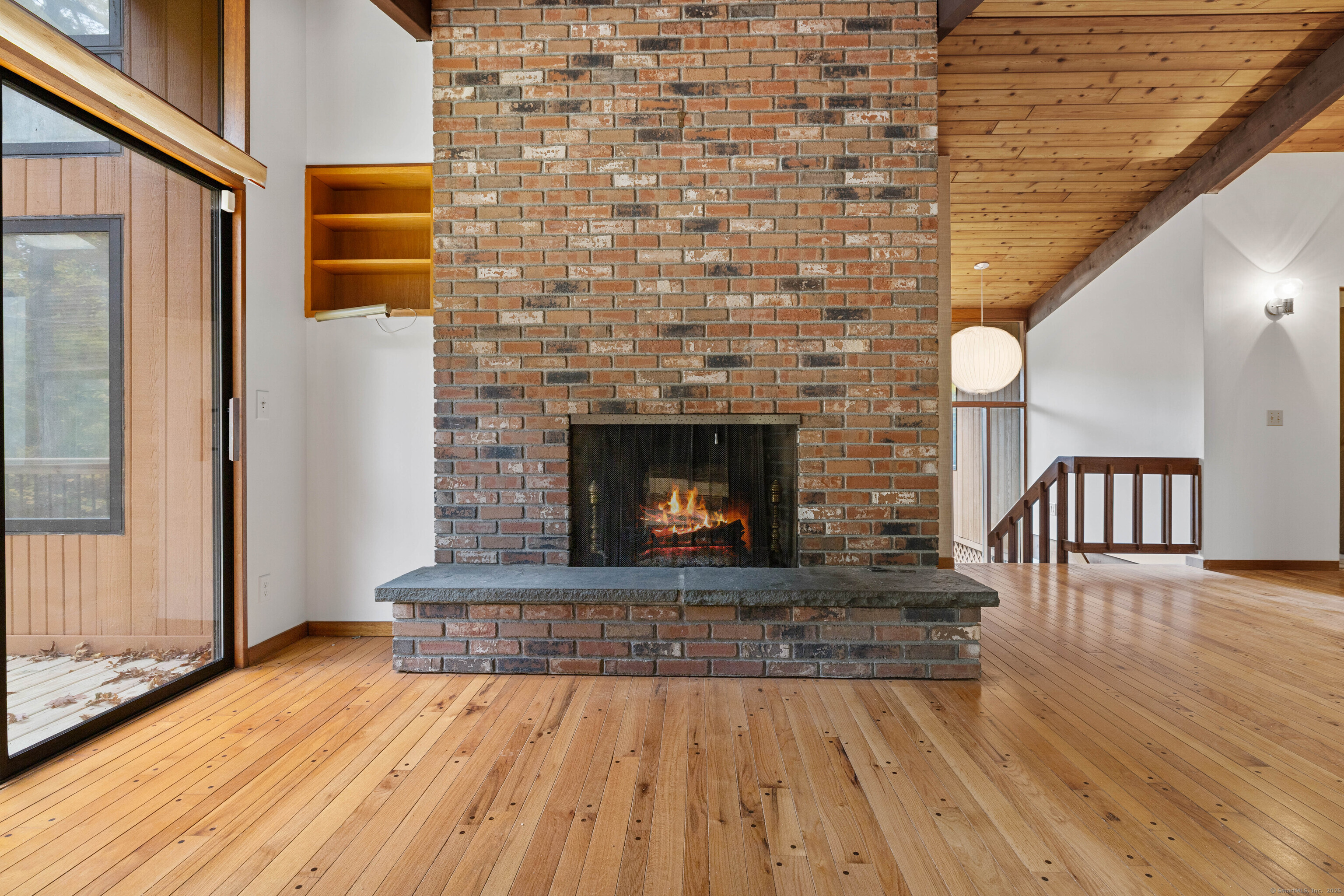 Designed by the renowned Acorn Deck House Company, this striking mid-century contemporary blends timeless craftsmanship with modern warmth. Vaulted cedar ceilings, exposed beams, and walls of glass invite nature inside, filling the home with natural light and serenity. The kitchen opens to a glass-enclosed sunroom and a screened porch-ideal for morning coffee or quiet evenings surrounded by trees. A double-sided brick fireplace anchors the open living area, complemented by hardwood floors and a seamless connection to the outdoors. Set against a backdrop of vibrant woodlands, this home embodies architectural character and peaceful living.