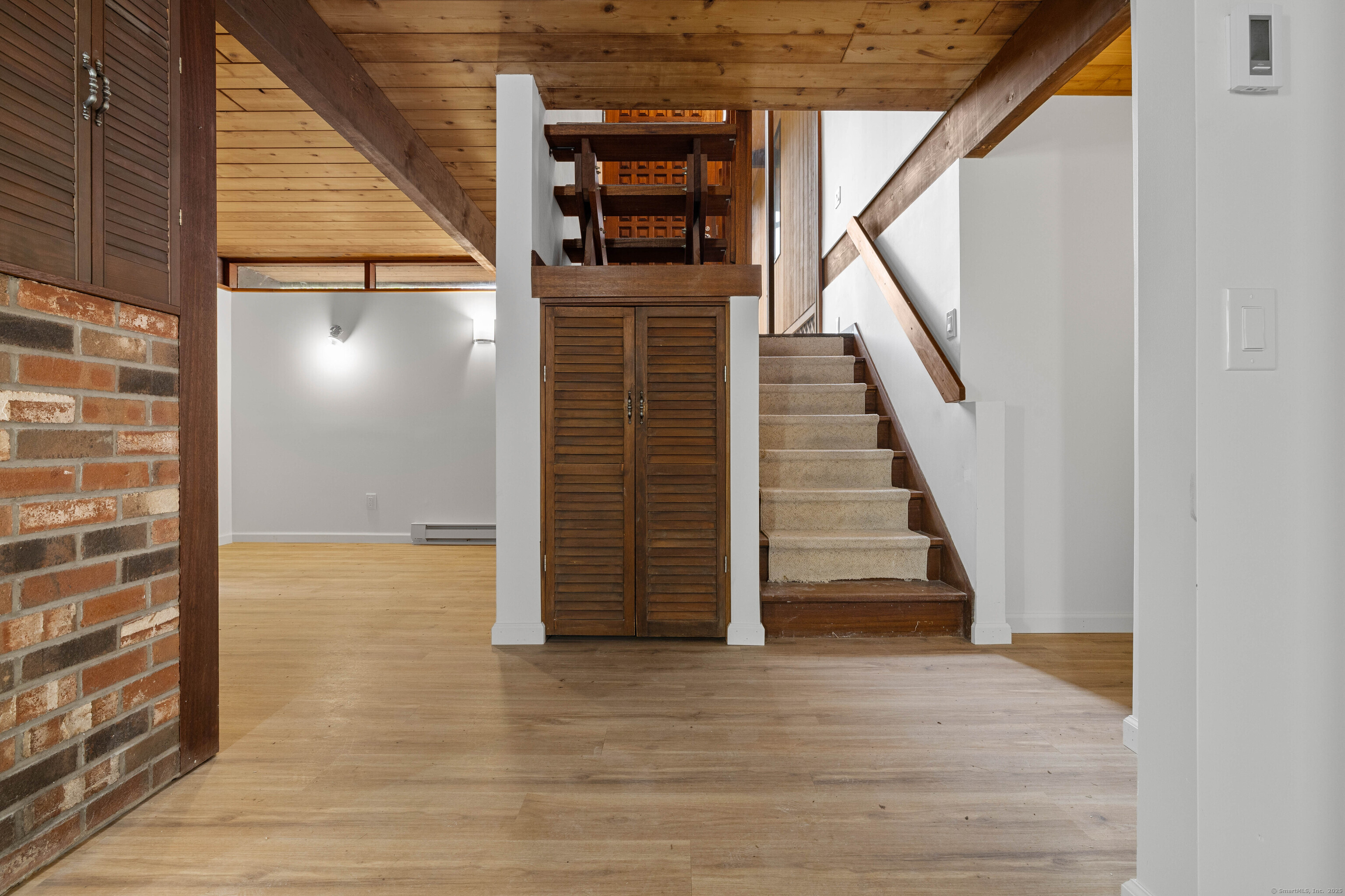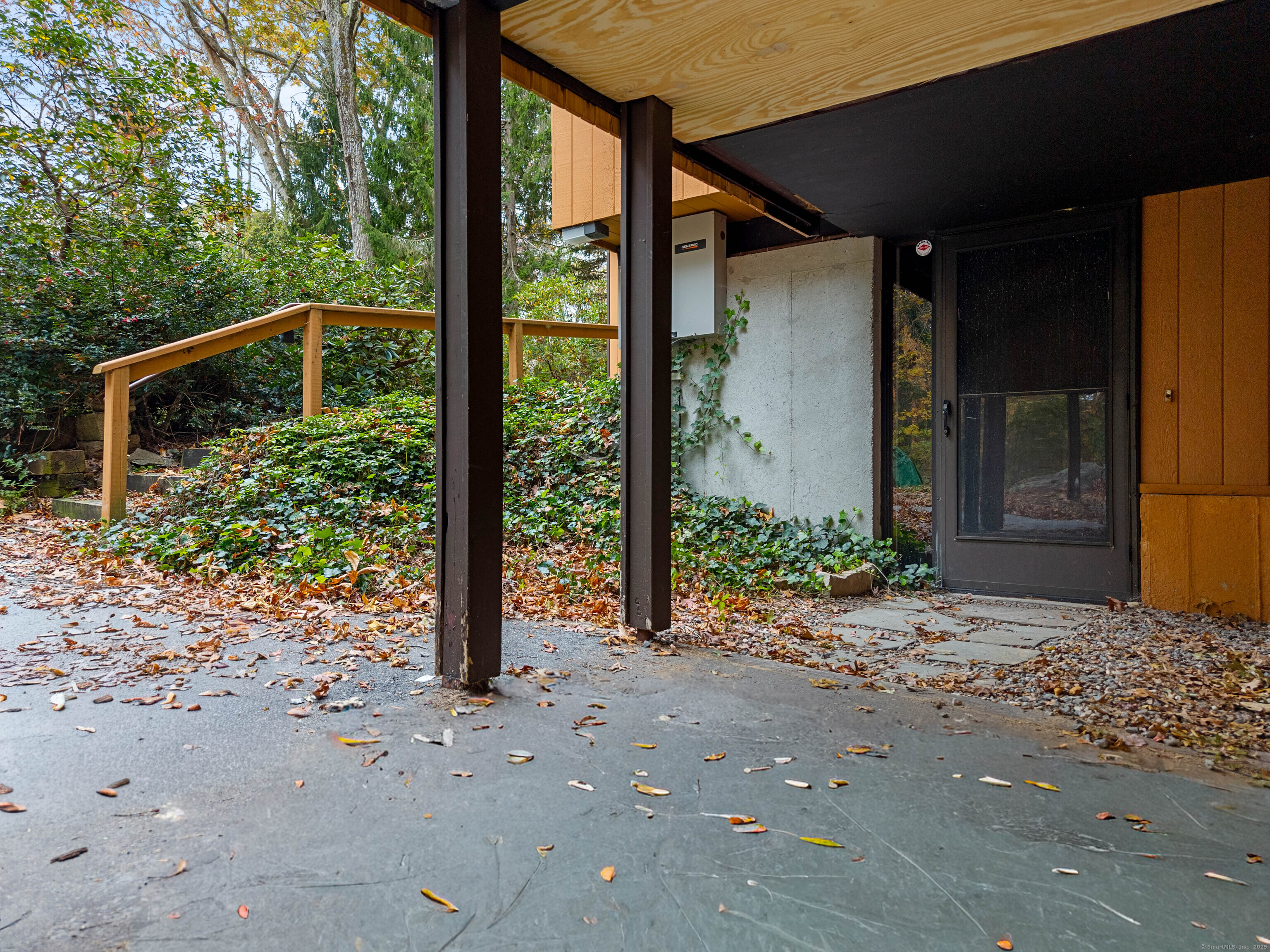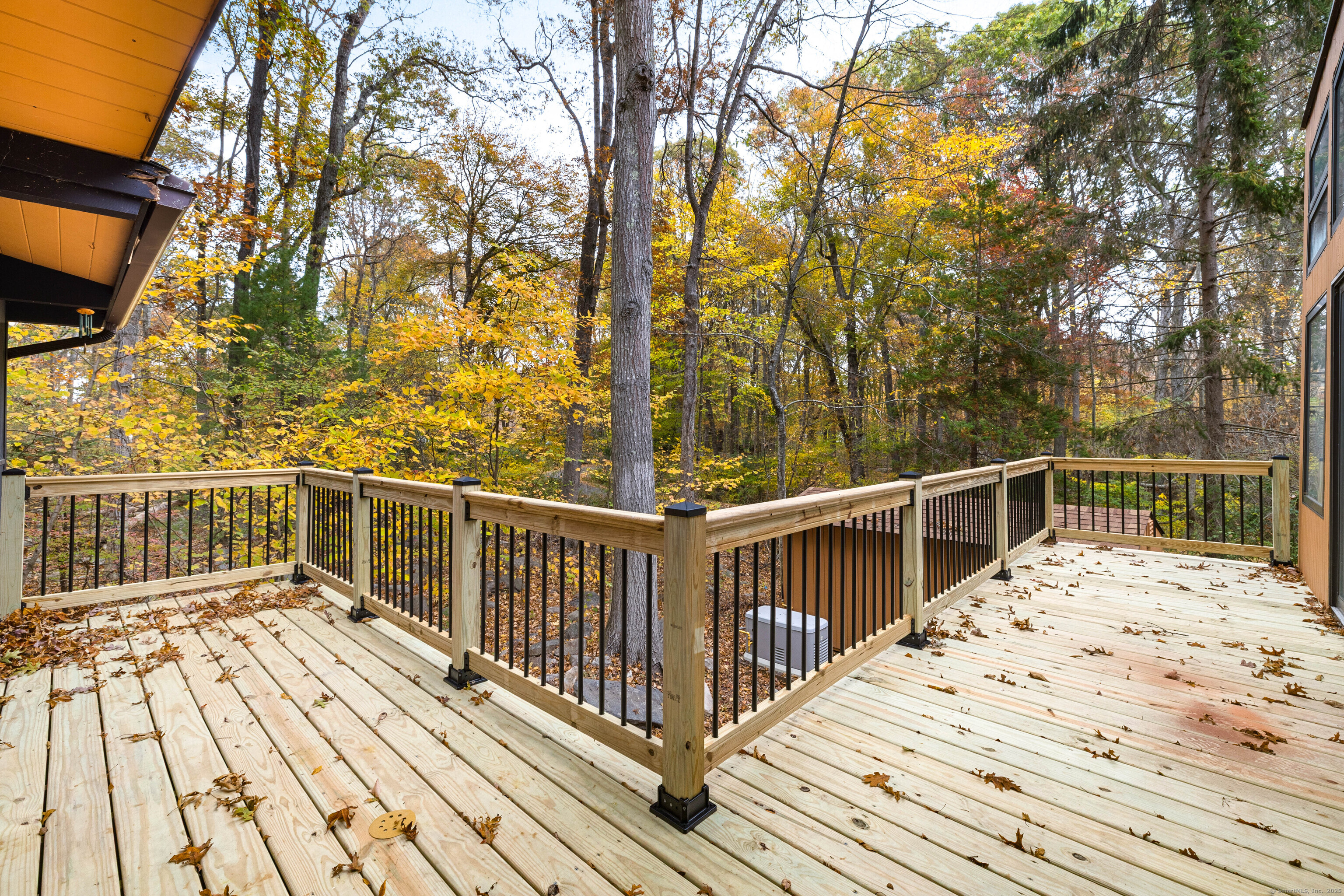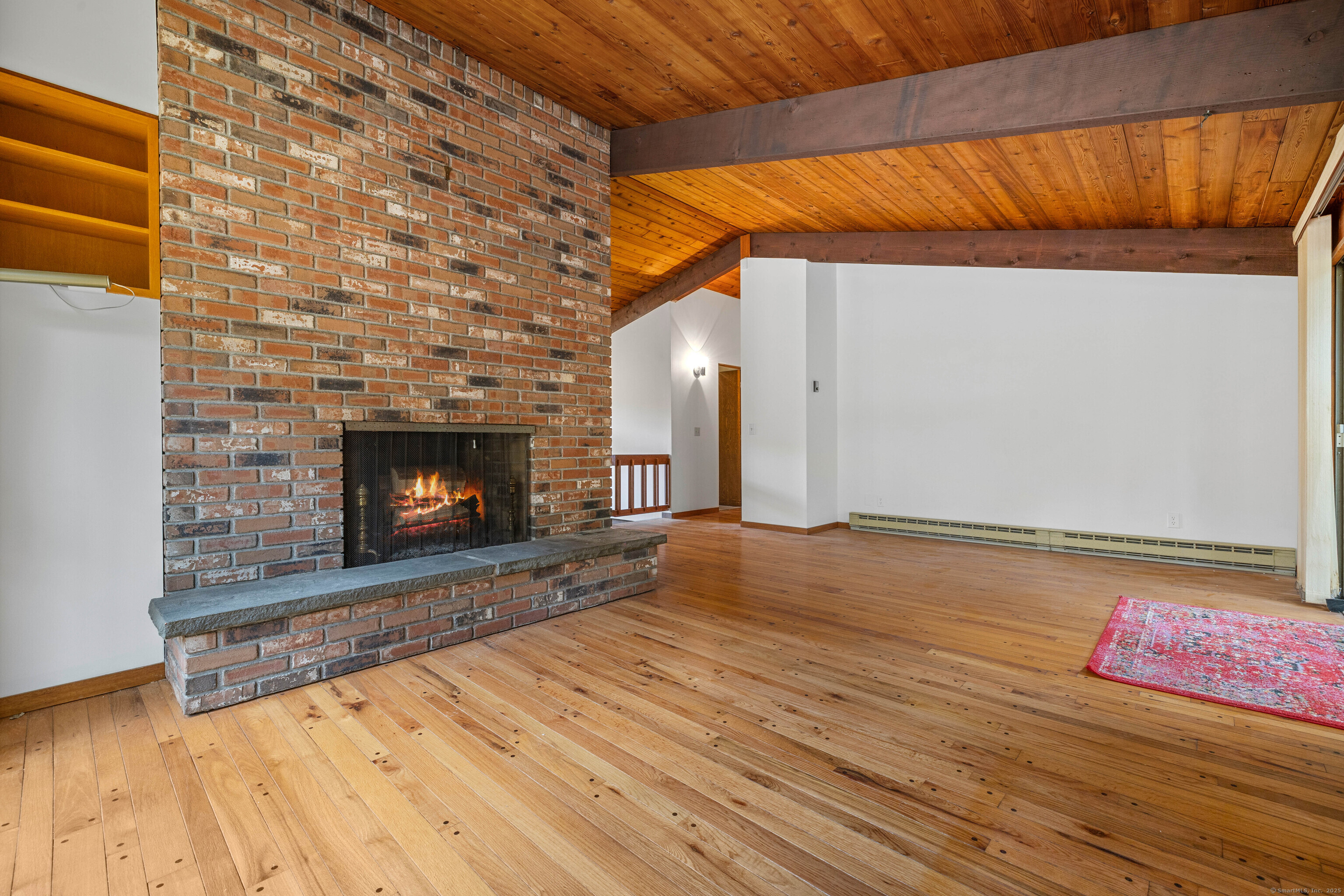 Designed by the renowned Acorn Deck House Company, this striking mid-century contemporary blends timeless craftsmanship with modern warmth. Vaulted cedar ceilings, exposed beams, and walls of glass invite nature inside, filling the home with natural light and serenity. The kitchen opens to a glass-enclosed sunroom and a screened porch-ideal for morning coffee or quiet evenings surrounded by trees. A double-sided brick fireplace anchors the open living area, complemented by hardwood floors and a seamless connection to the outdoors. Set against a backdrop of vibrant woodlands, this home embodies architectural character and peaceful living.