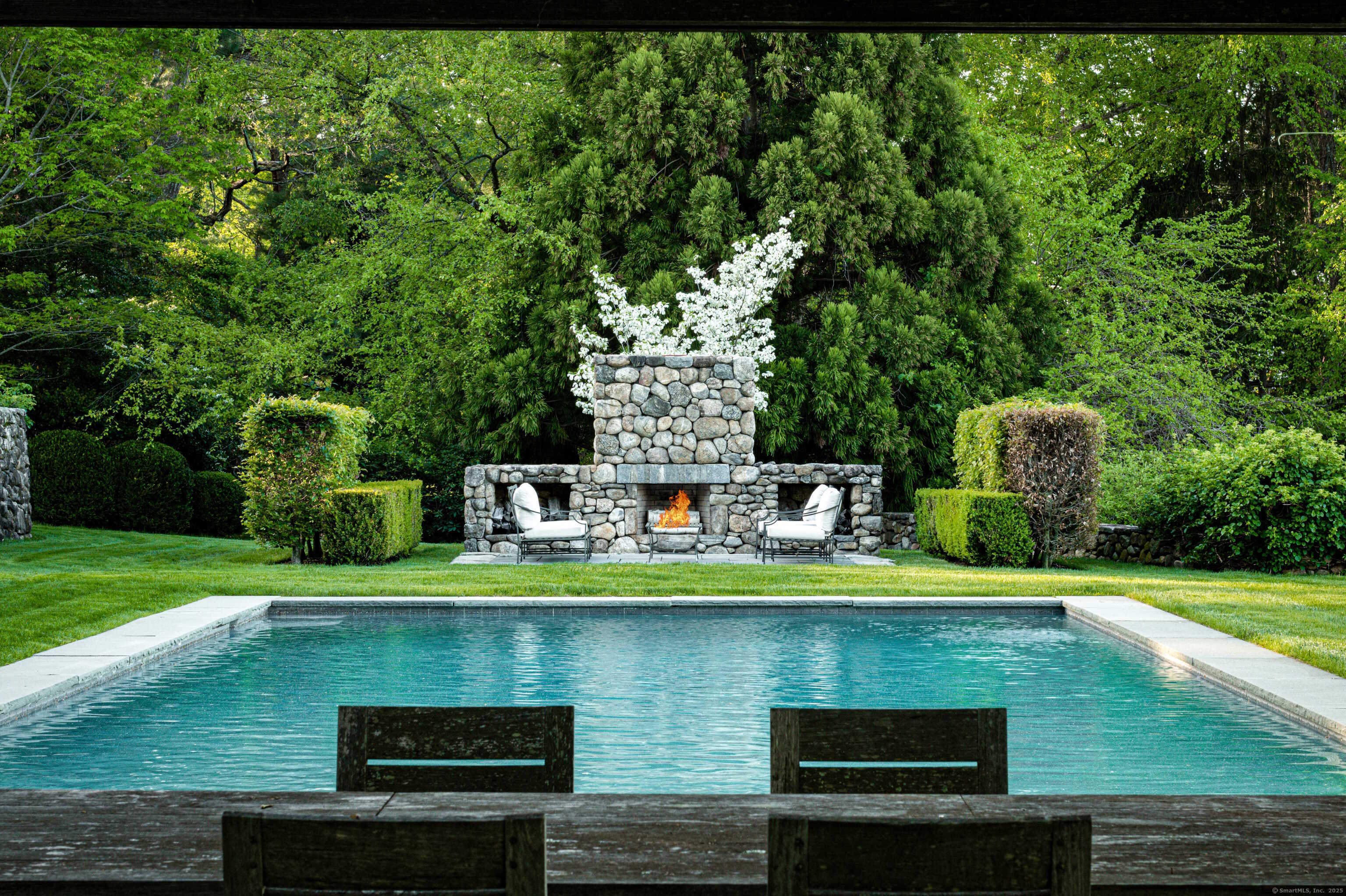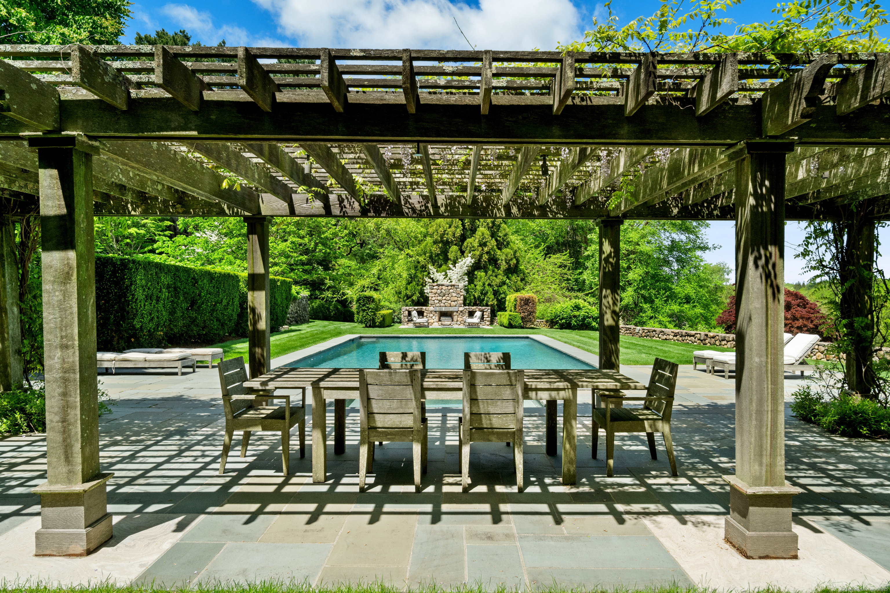 Nestled on over five private acres along one of New Canaan's most distinguished streets, this estate perfectly balances historic character with modern luxury. Originally constructed in the 1890s and artfully transformed, the residence showcases timeless craftsmanship, thoughtful updates, and serene natural surroundings. A tree-lined driveway and landscape lighting lead to a home filled with warmth, character, and style. Inside, a dramatic two-story great room with a soaring stone fireplace, exposed beams, and antique pine floors creates a stunning focal point. The sunlit gourmet kitchen opens to a charming breakfast room and flows seamlessly into elegant dining and entertaining spaces designed for everyday living and special occasions alike. The home features six bedrooms, including a first-floor primary suite with a sitting room-ideal for a nursery or home office. The walk-out lower level includes a wine cellar, playroom, bedroom, and full bath. A detached three-car garage offers a private guest apartment with its own entrance, living room, bedroom, and bath. Outdoors, resort-style amenities include a heated gunite pool overlooking the reservoir, outdoor fireplace, meditation pool, and hidden garden path. The result is an idyllic landscape that offers exceptional privacy and tranquility-just moments from the heart of New Canaan. Available Unfurnished for a 6-Month Lease Beginning December 1st (with Option to Extend)