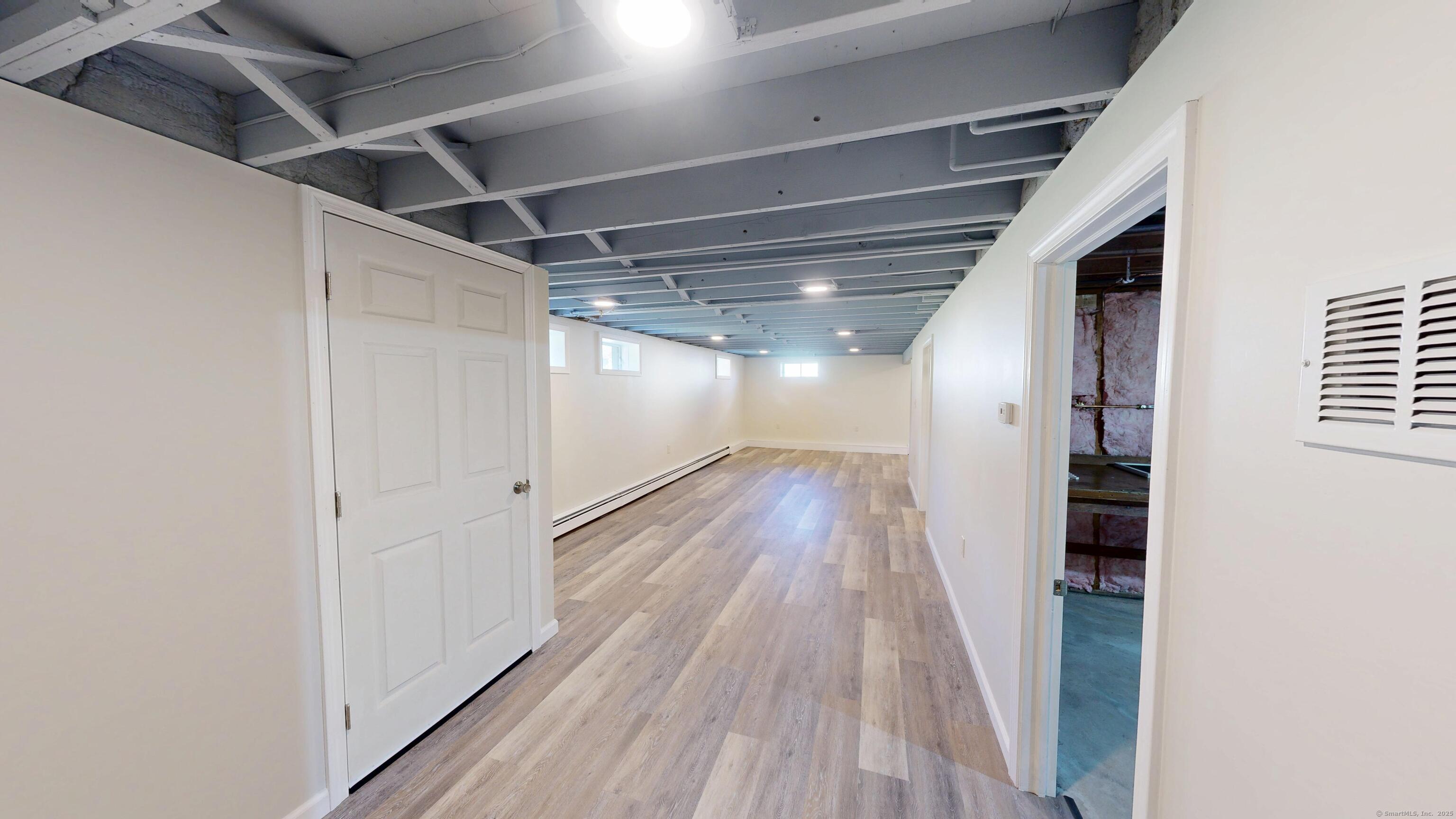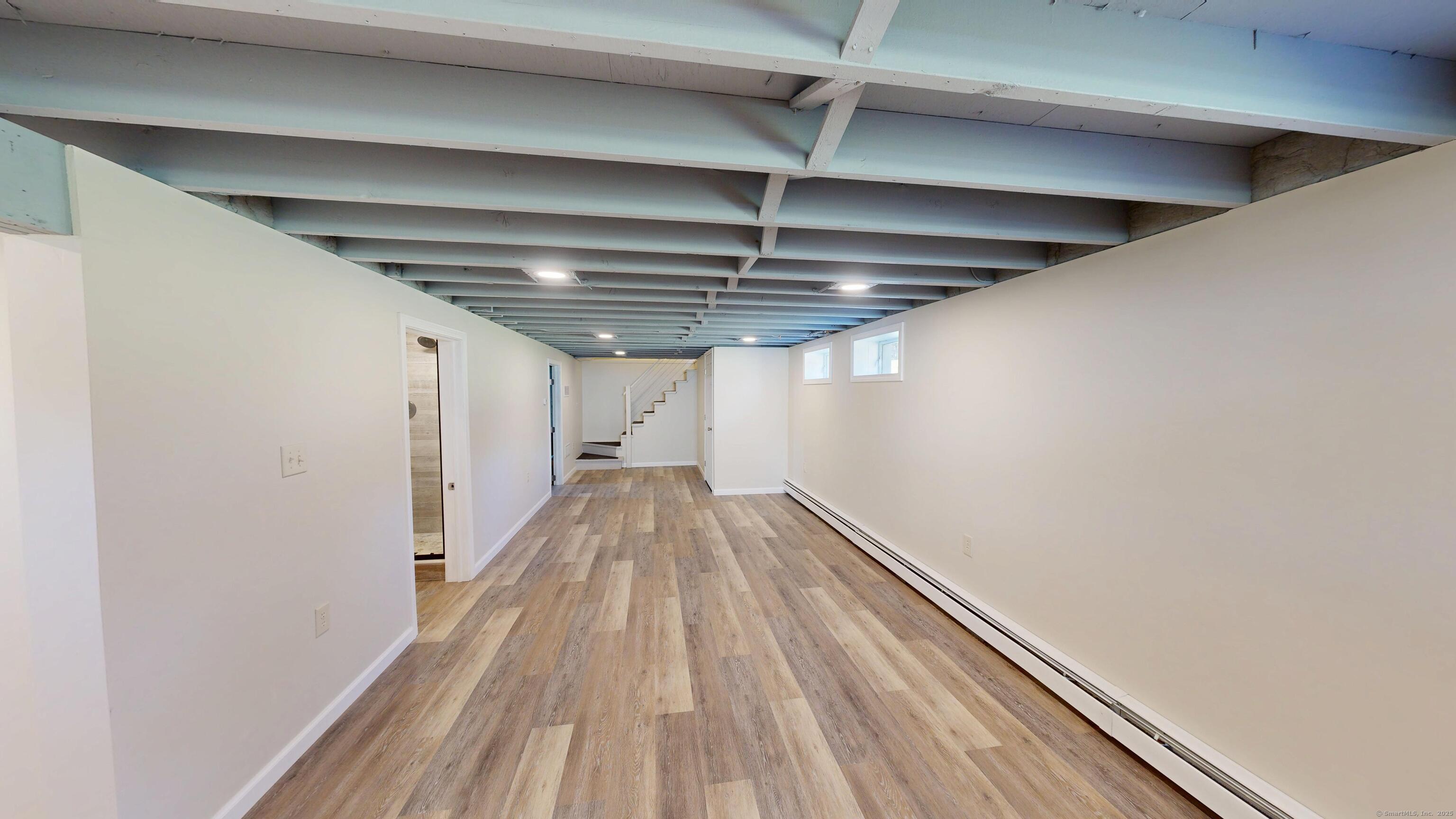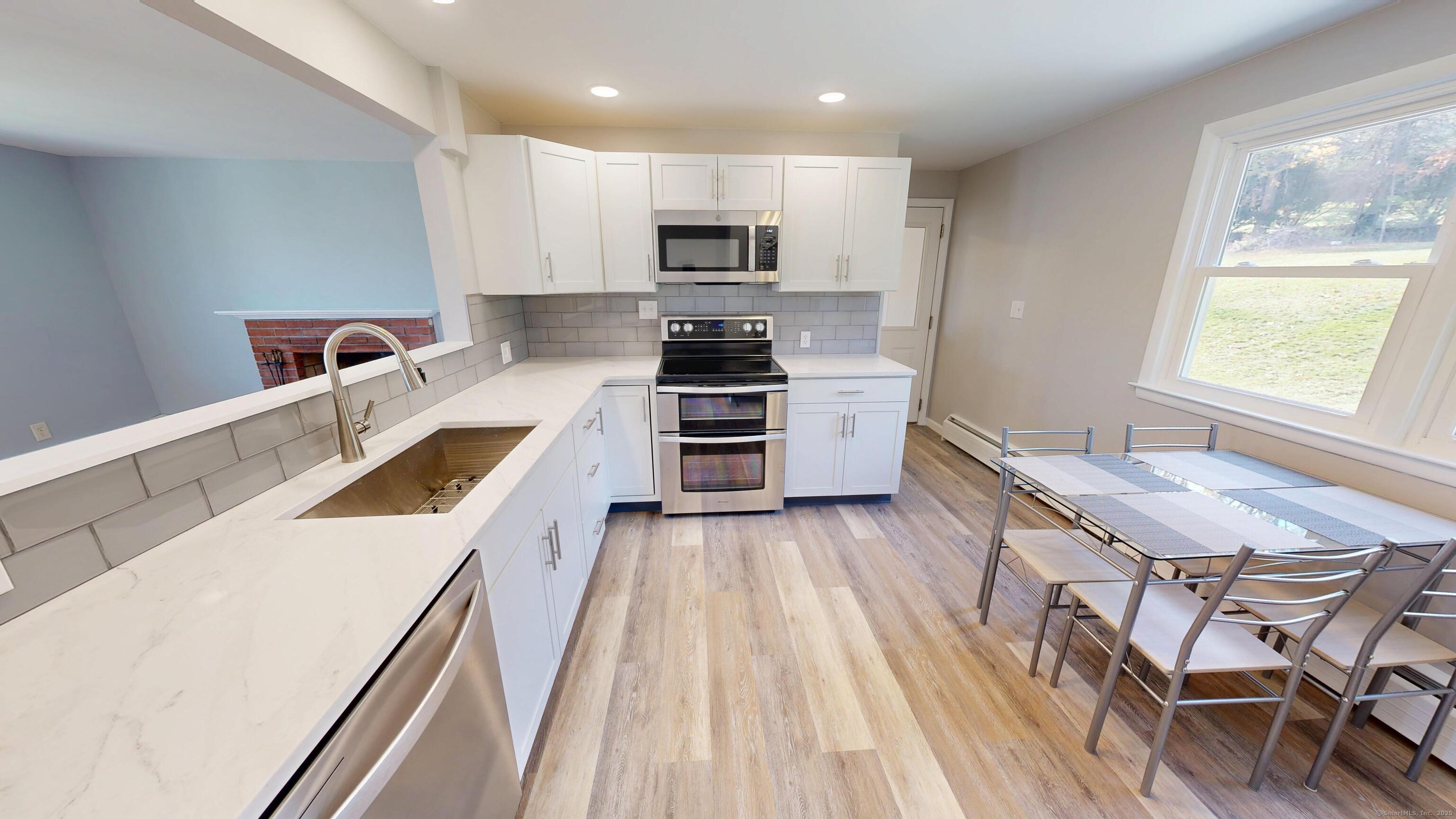 This beautifully remodeled three-bedroom, two-bath ranch sits on a spacious half-acre lot in a quiet, sought-after neighborhood. This home has been thoughtfully renovated with quality craftsmanship and attention to detail. The main level features a stunning new kitchen with white shaker cabinets, quartz countertops, a glass tile backsplash, and high-end stainless steel appliances. The living room (complete with a cozy wood-burning fireplace) and all three bedrooms showcase refinished hardwood floors, ceiling fans, and a soothing contemporary color palette. The fully updated main bathroom includes custom tilework and designer finishes. The lower level offers a brand-new, fully-permitted oversized family/playroom, a full bath with laundry area, and a versatile flex space with a storage closet - perfect for a home office. Additional updates, ensuring peace of mind for years to come, include upgrades to the plumbing and electric, and all new over the past year: roof with full 10-year warranty, premium Roth oil tank, freshly paved and widened driveway, energy-efficient Pella double-hung windows, patio with breezeway access, all interior doors and trim (solid-core doors on bedrooms and baths for sound privacy), and high-quality Delta plumbing fixtures throughout. This move-in-ready home is the one you've been waiting for.