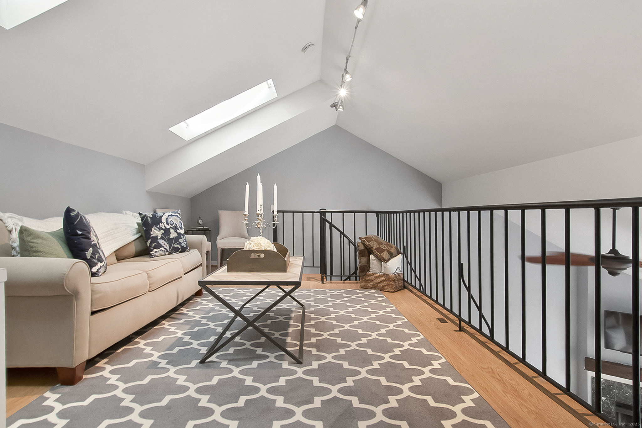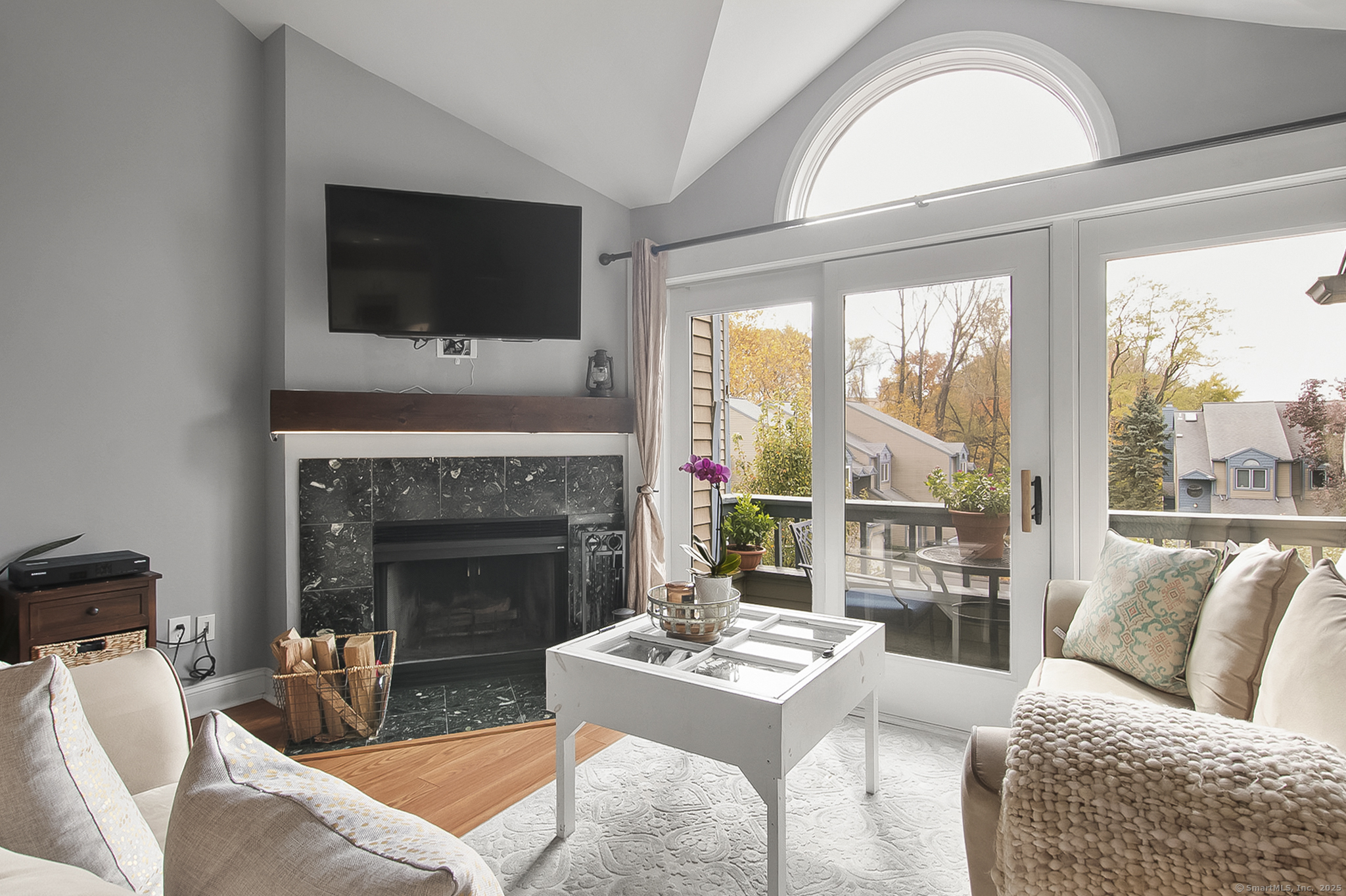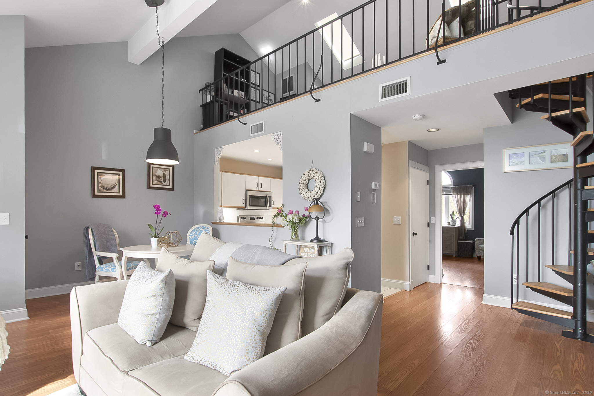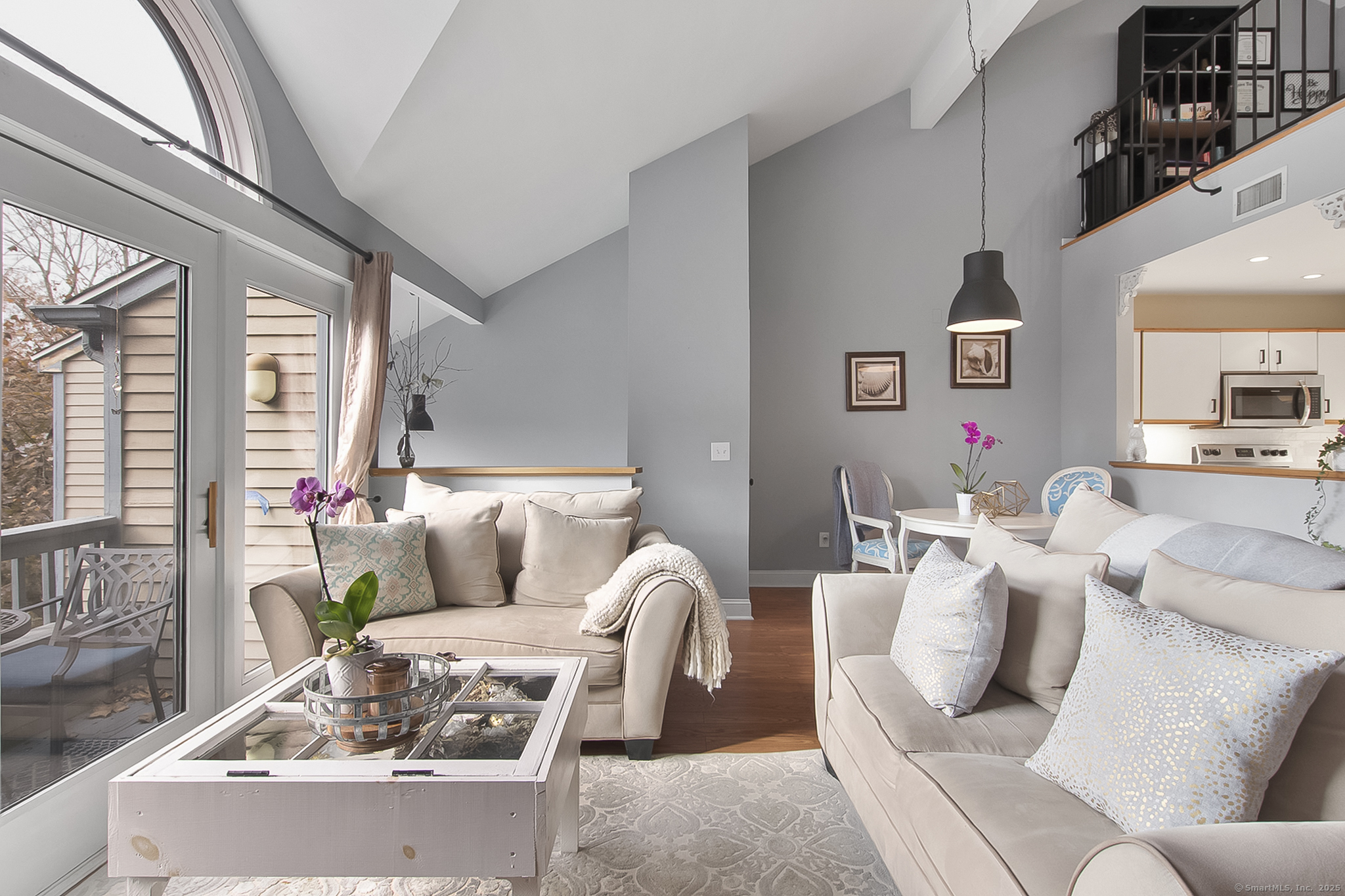 Welcome to Riverbend Common and this beautifully updated 1-bedroom + loft, 2-bath townhome tucked quietly away in one of Norwalk's most convenient locations. Set within a boutique, well-maintained community, this residence delivers modern effortless living: the main level showcases a sun-soaked, south facing living room with dramatic vaulted ceilings, wood-burning fireplace, powder room, and seamless indoor/outdoor flow to a private deck - perfect for morning coffee, evening wine, or laptop work days. The recently renovated galley kitchen features new sleek quartz countertops, new designer tile backsplash, and new stainless steel appliances. Off the living room, a spiral staircase leads to a spectacular loft with two skylights - ideal for home office, den, or guest quarters. The spacious primary suite offers two oversized closets, soaring ceilings, and updated full bath. Lower level includes private in-unit laundry, abundant storage, and direct access to your own private garage. Minutes to Silvermine Tavern, Tavern at Gray Barns, SONO, Metro North, I-95, Cranbury Park, Calf Pasture Beach, wellness, retail, The Sono Collection, Whole Foods, Stew Leonard's, Stamford + Westport line. Ultra commutable in every direction. Low HOA. Pet friendly. Incredible value. Turn key. Move right in and enjoy!