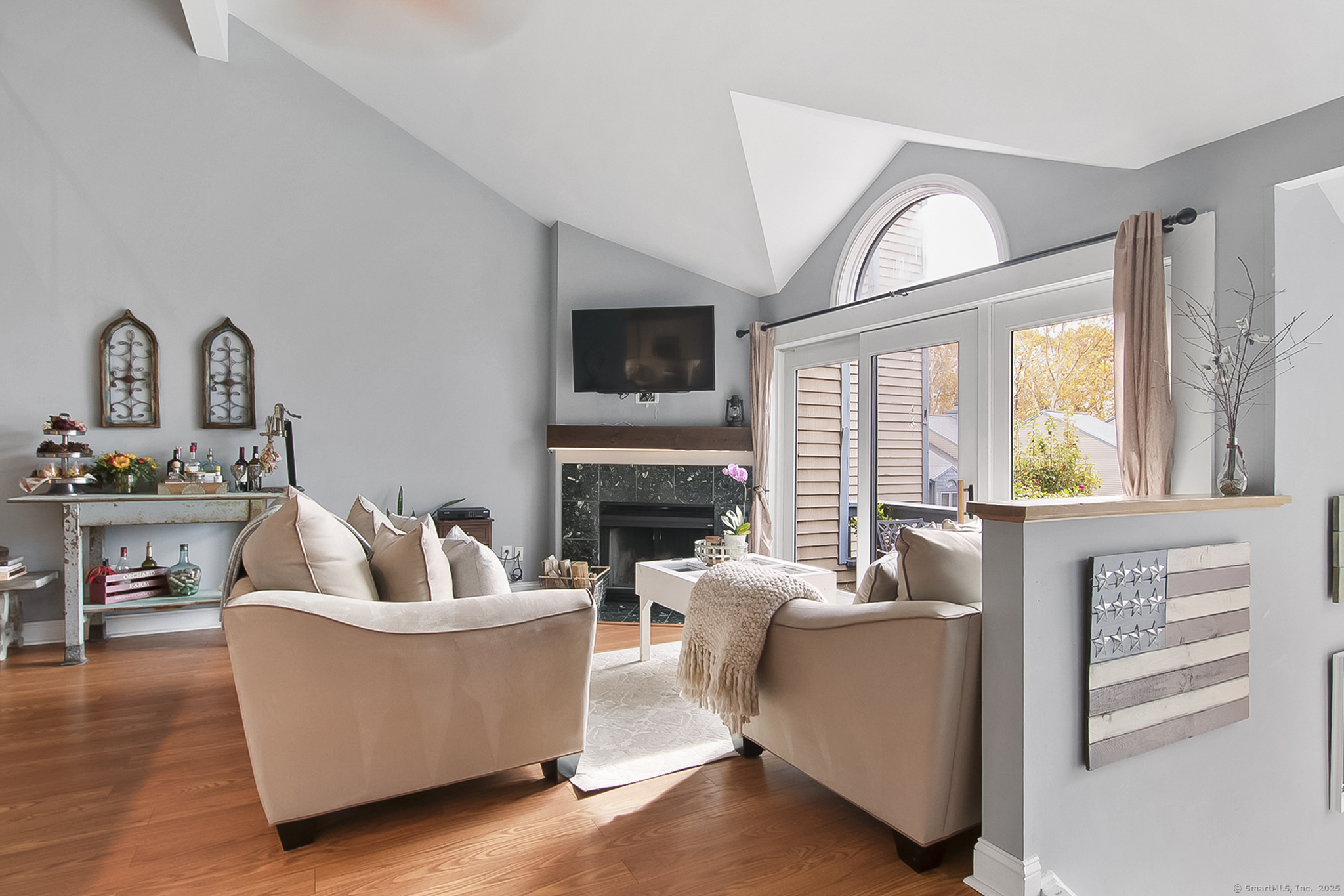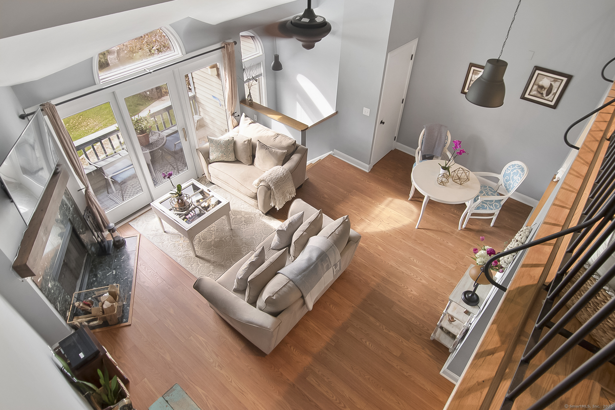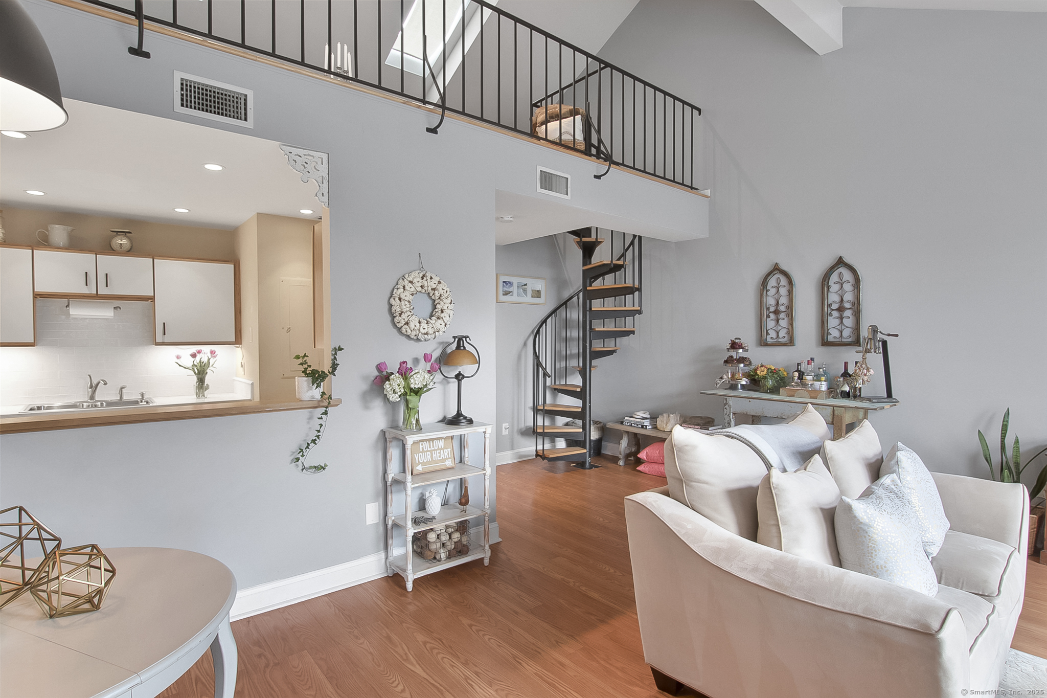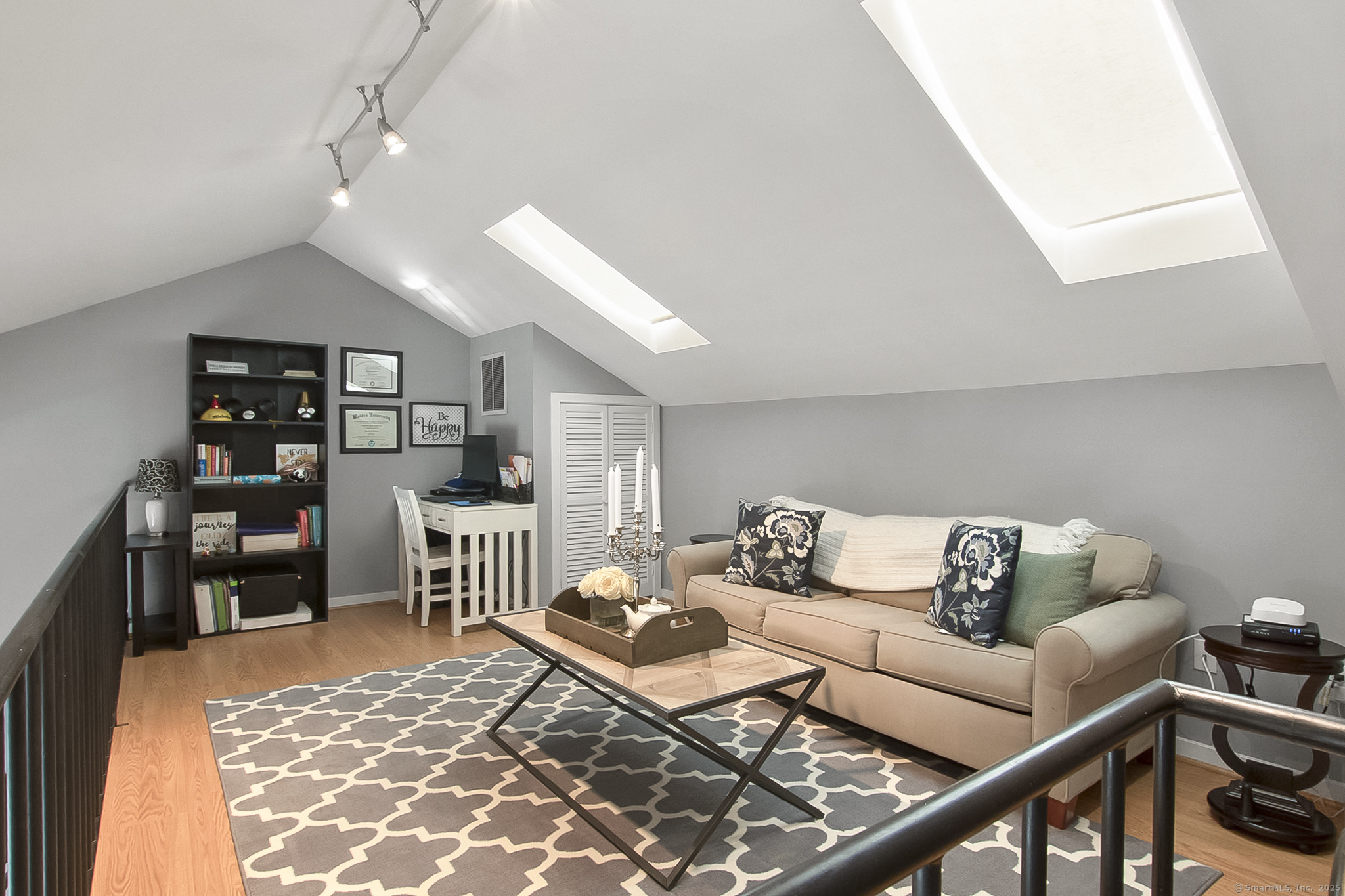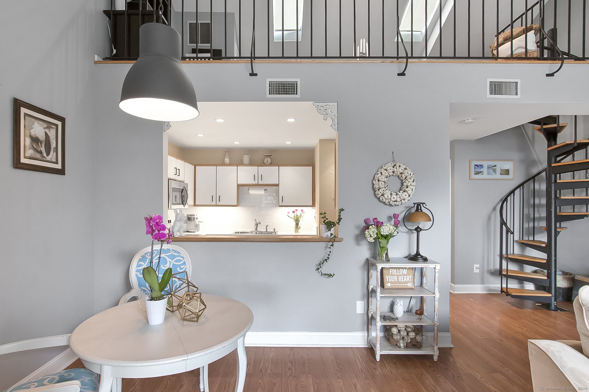 Welcome to Riverbend Common and this beautifully updated 1-bedroom + loft, 2-bath townhome tucked quietly away in one of Norwalk's most convenient locations. Set within a boutique, well-maintained community, this residence delivers modern effortless living: the main level showcases a sun-soaked, south facing living room with dramatic vaulted ceilings, wood-burning fireplace, powder room, and seamless indoor/outdoor flow to a private deck - perfect for morning coffee, evening wine, or laptop work days. The recently renovated galley kitchen features new sleek quartz countertops, new designer tile backsplash, and new stainless steel appliances. Off the living room, a spiral staircase leads to a spectacular loft with two skylights - ideal for home office, den, or guest quarters. The spacious primary suite offers two oversized closets, soaring ceilings, and updated full bath. Lower level includes private in-unit laundry, abundant storage, and direct access to your own private garage. Minutes to Silvermine Tavern, Tavern at Gray Barns, SONO, Metro North, I-95, Cranbury Park, Calf Pasture Beach, wellness, retail, The Sono Collection, Whole Foods, Stew Leonard's, Stamford + Westport line. Ultra commutable in every direction. Low HOA. Pet friendly. Incredible value. Turn key. Move right in and enjoy!