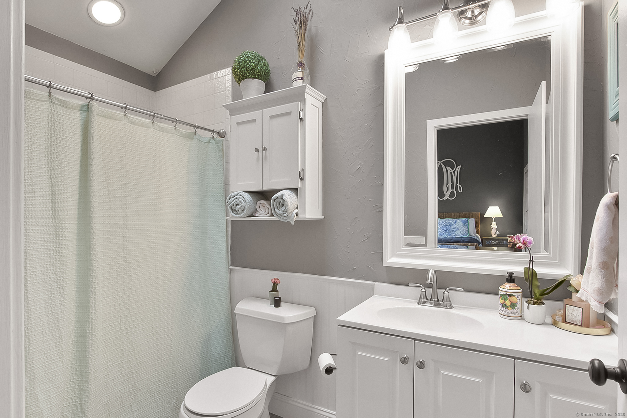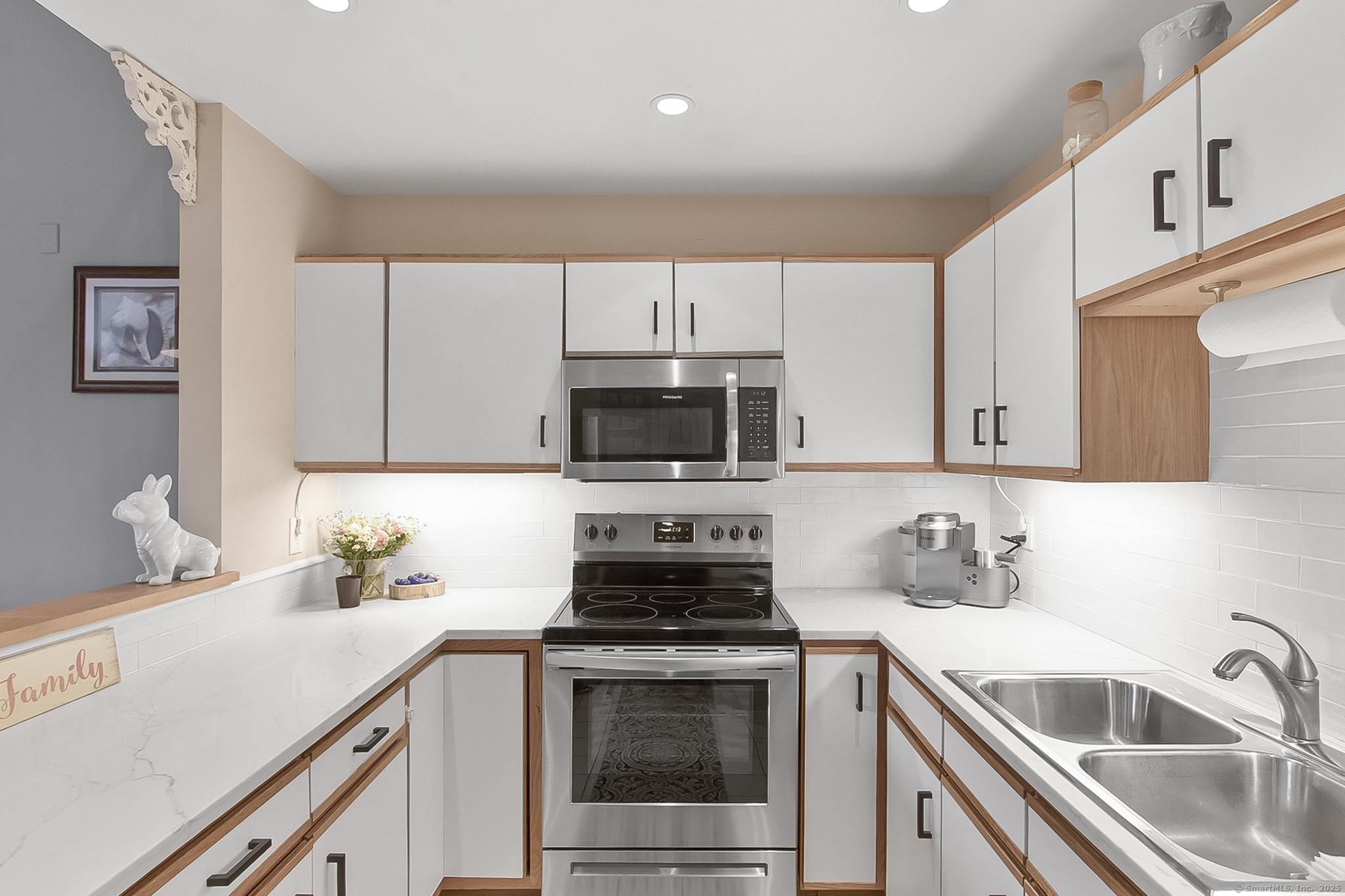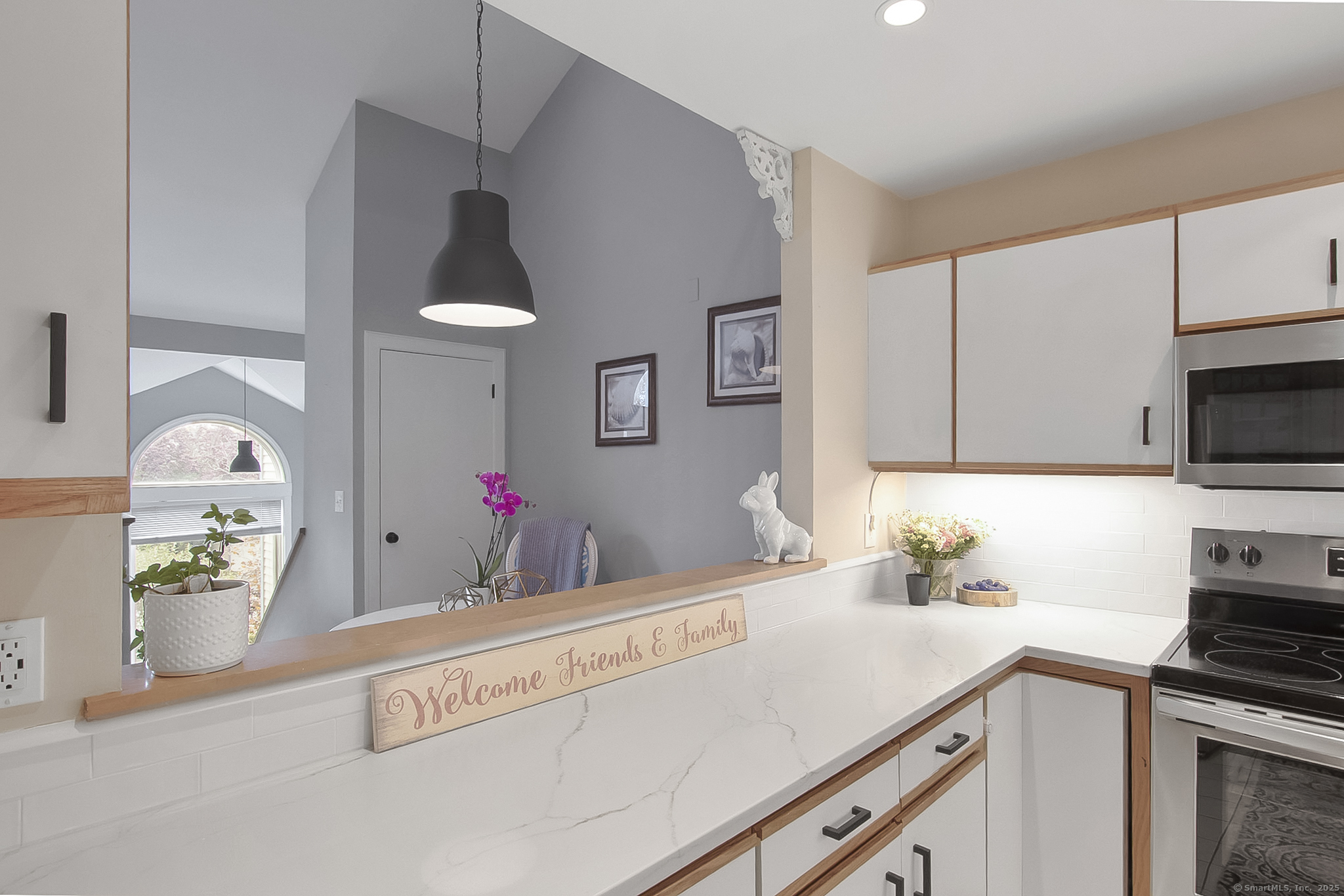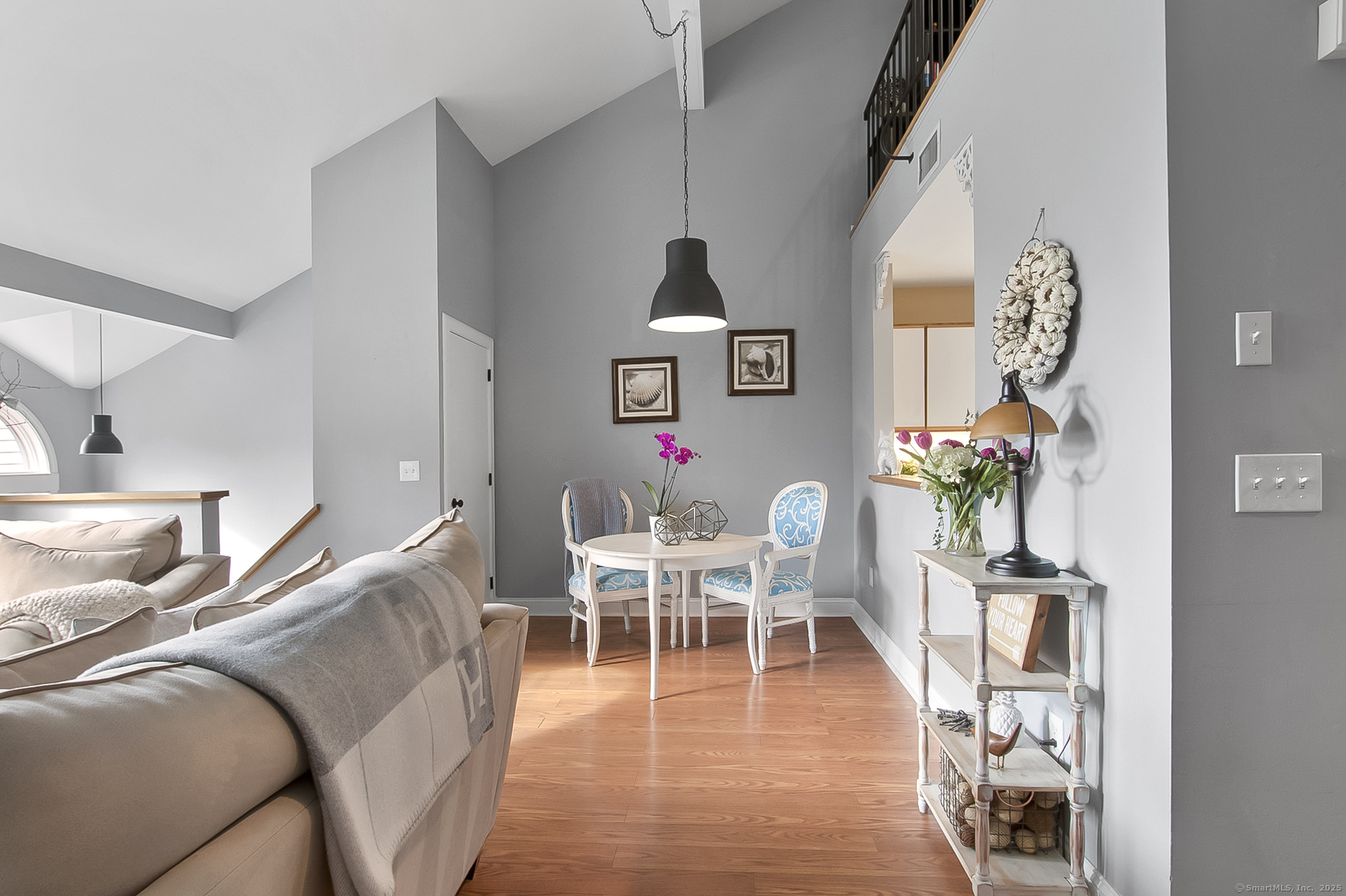 Welcome to Riverbend Common and this beautifully updated 1-bedroom + loft, 2-bath townhome tucked quietly away in one of Norwalk's most convenient locations. Set within a boutique, well-maintained community, this residence delivers modern effortless living: the main level showcases a sun-soaked, south facing living room with dramatic vaulted ceilings, wood-burning fireplace, powder room, and seamless indoor/outdoor flow to a private deck - perfect for morning coffee, evening wine, or laptop work days. The recently renovated galley kitchen features new sleek quartz countertops, new designer tile backsplash, and new stainless steel appliances. Off the living room, a spiral staircase leads to a spectacular loft with two skylights - ideal for home office, den, or guest quarters. The spacious primary suite offers two oversized closets, soaring ceilings, and updated full bath. Lower level includes private in-unit laundry, abundant storage, and direct access to your own private garage. Minutes to Silvermine Tavern, Tavern at Gray Barns, SONO, Metro North, I-95, Cranbury Park, Calf Pasture Beach, wellness, retail, The Sono Collection, Whole Foods, Stew Leonard's, Stamford + Westport line. Ultra commutable in every direction. Low HOA. Pet friendly. Incredible value. Turn key. Move right in and enjoy!