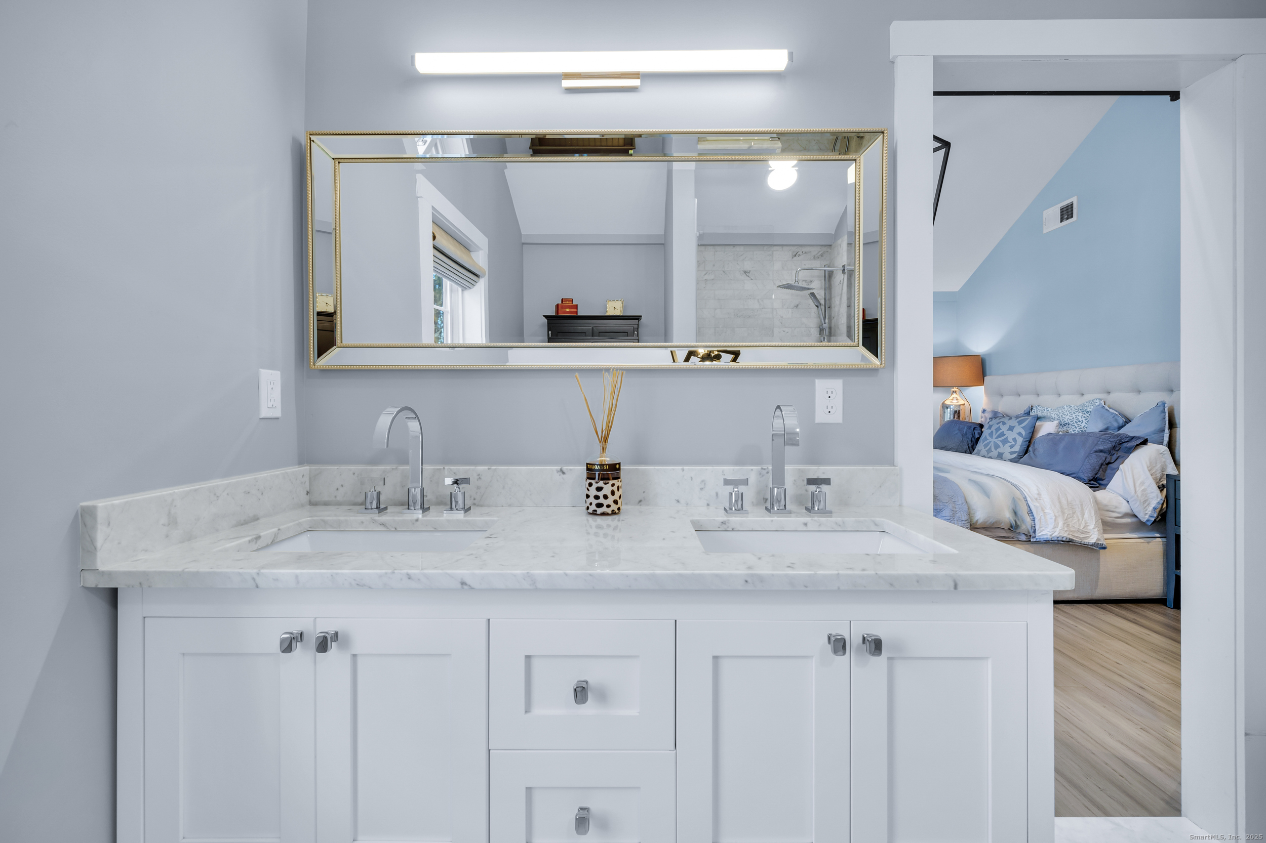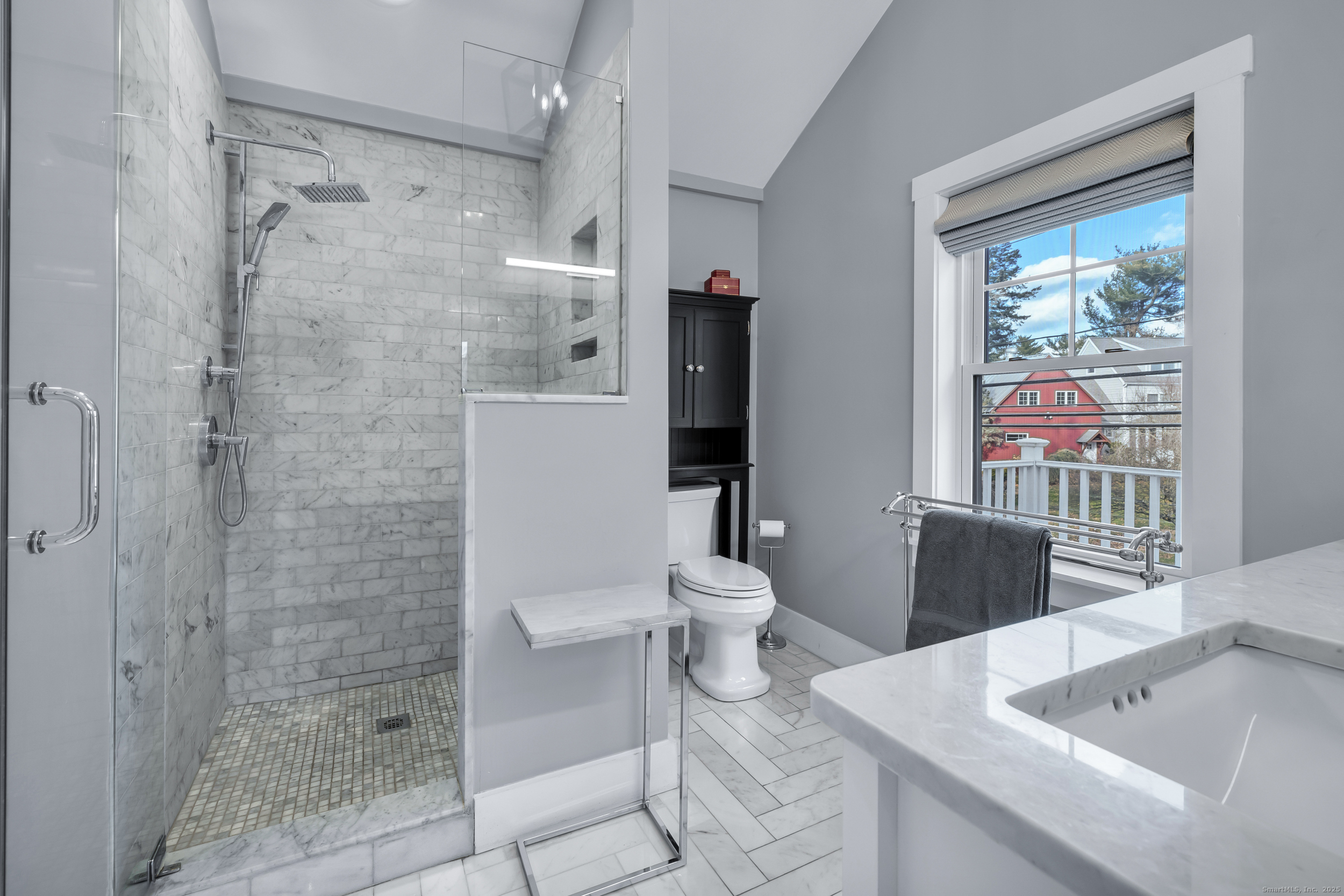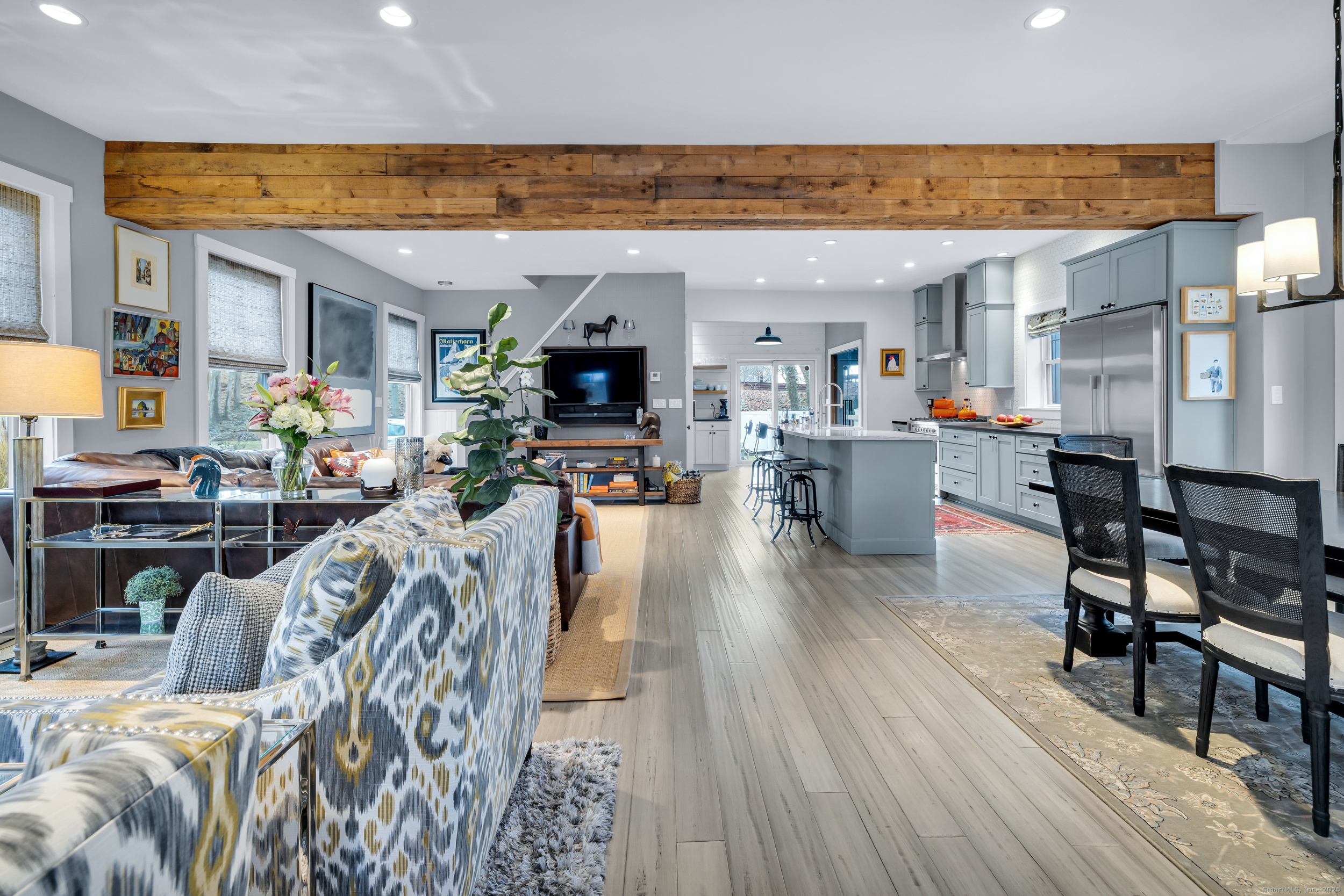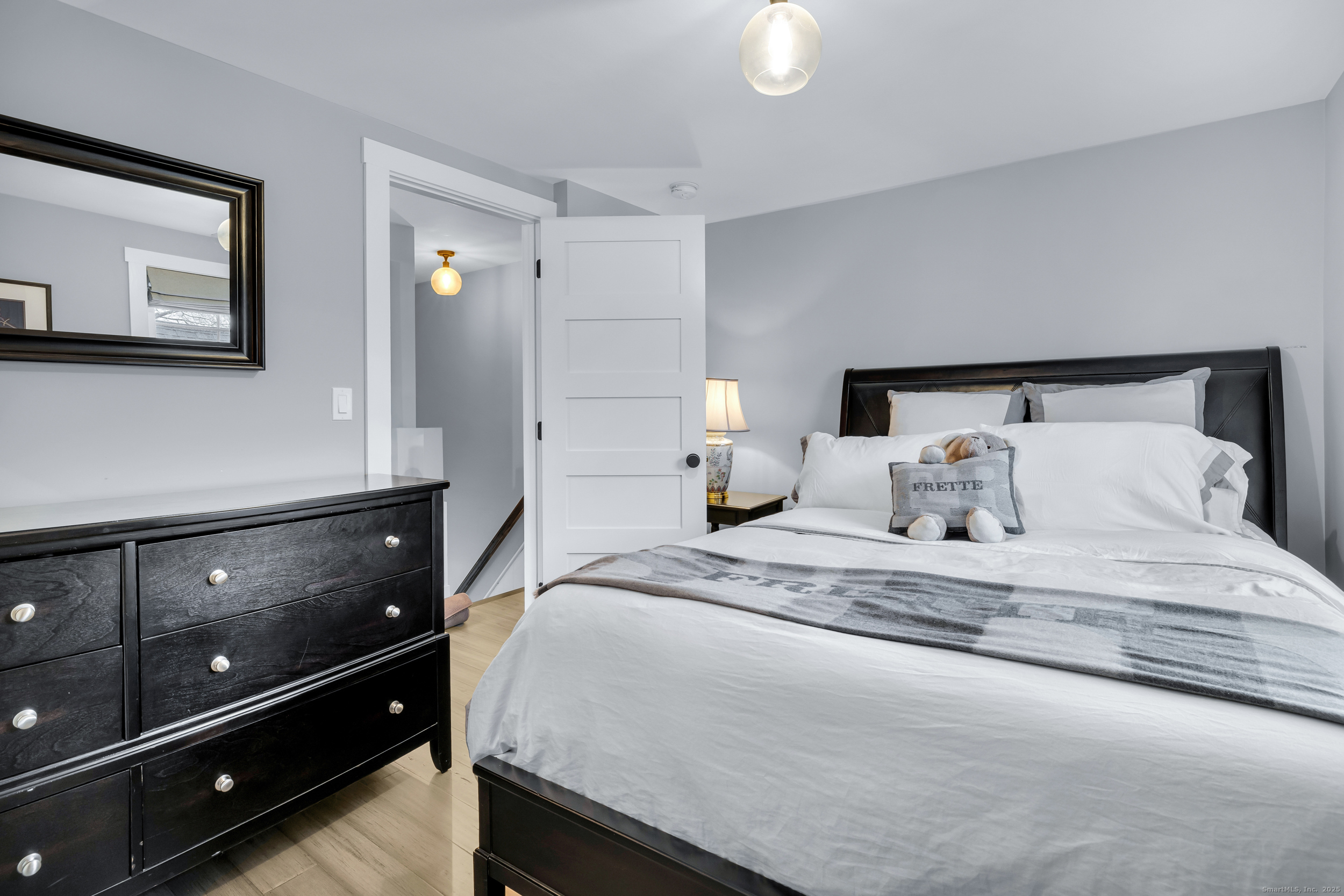Beautifully rebuilt circa 1900 farmhouse offering the perfect blend of character and modern convenience. This light-filled home features an open floor plan with 9' ceilings, central air, bamboo flooring, and updated lighting throughout. A large covered front porch welcomes you into the living and dining area, seamlessly connected to the kitchen. The kitchen provides a center island with farm sink, stone countertops, Fisher & Paykel appliances, and custom soft-close cabinetry w/dovetail design. Thoughtful built-ins include a dry bar, floating shelves, pantry, and a temperature-controlled wine cellar; perfect for the enthusiast. A powder room with a large storage closet completes the main level. Upstairs, the master suite features a walk-in closet with built-ins, a full bath with barn-door entry, and a private balcony. Two additional bedrooms, a full bath with tub/shower combination, an open office area, and a convenient laundry space complete the second floor. A ladder in the office leads to a cozy loft; ideal for extra guest space or additional storage. Glass sliders open to a fenced in level yard with a stone patio, built-in fire pit and access to the detached two-car garage. Conveniently located just steps from Guilford's vibrant town center, train station, yacht club, marina and town beach. This truly turn-key home is being offered fully furnished, making it ready to enjoy immediately. Perfect for year-round living, vacation or weekend getaway or as in investment property.