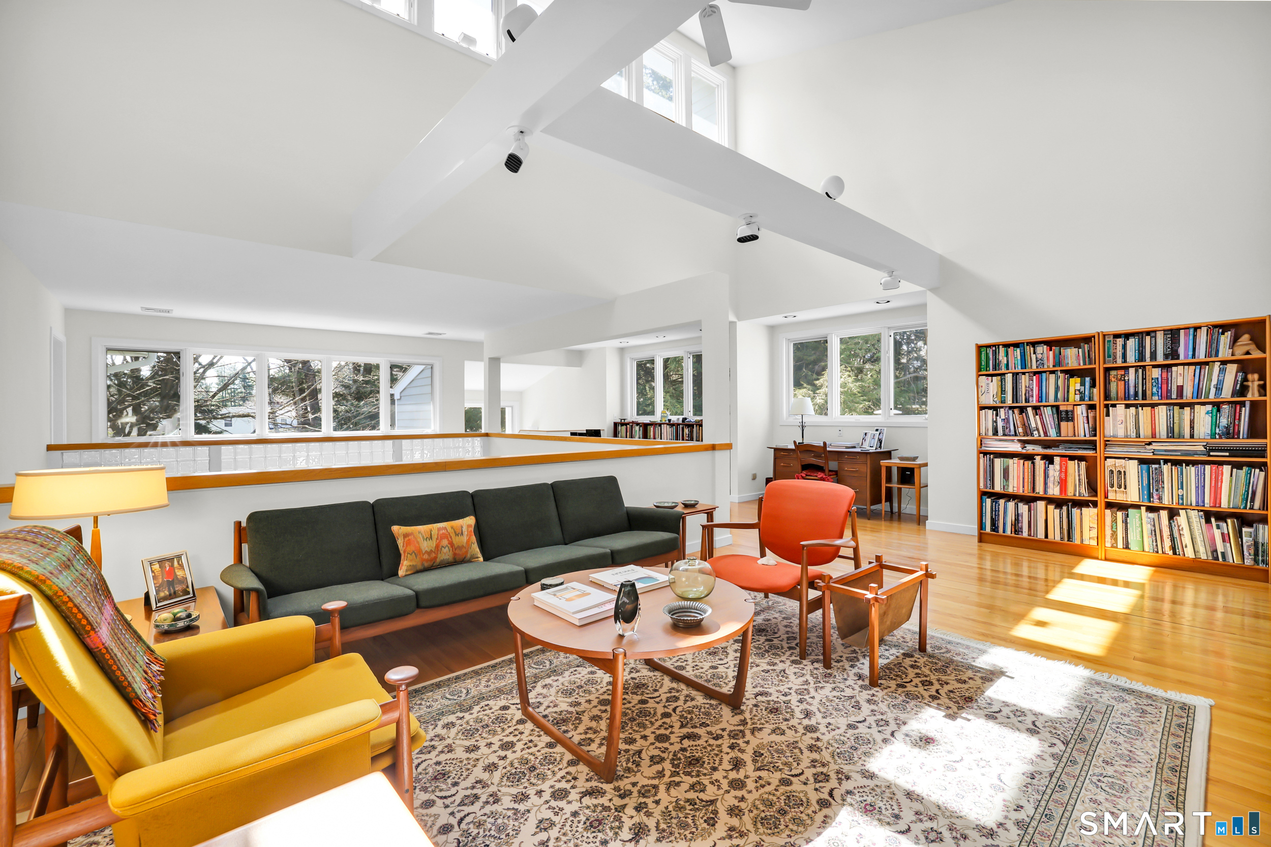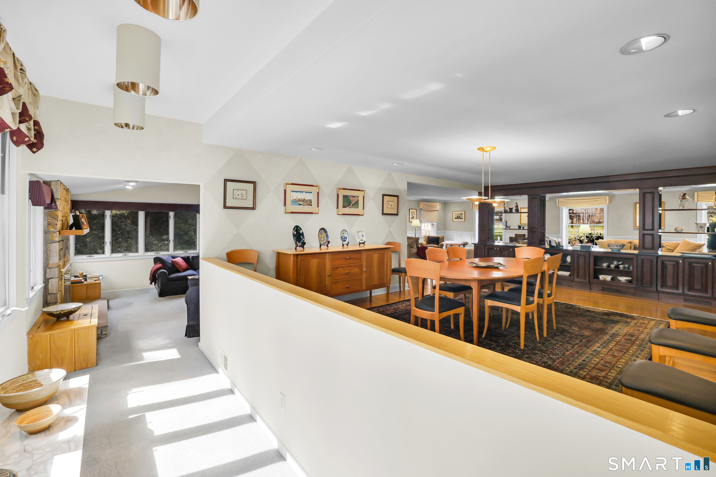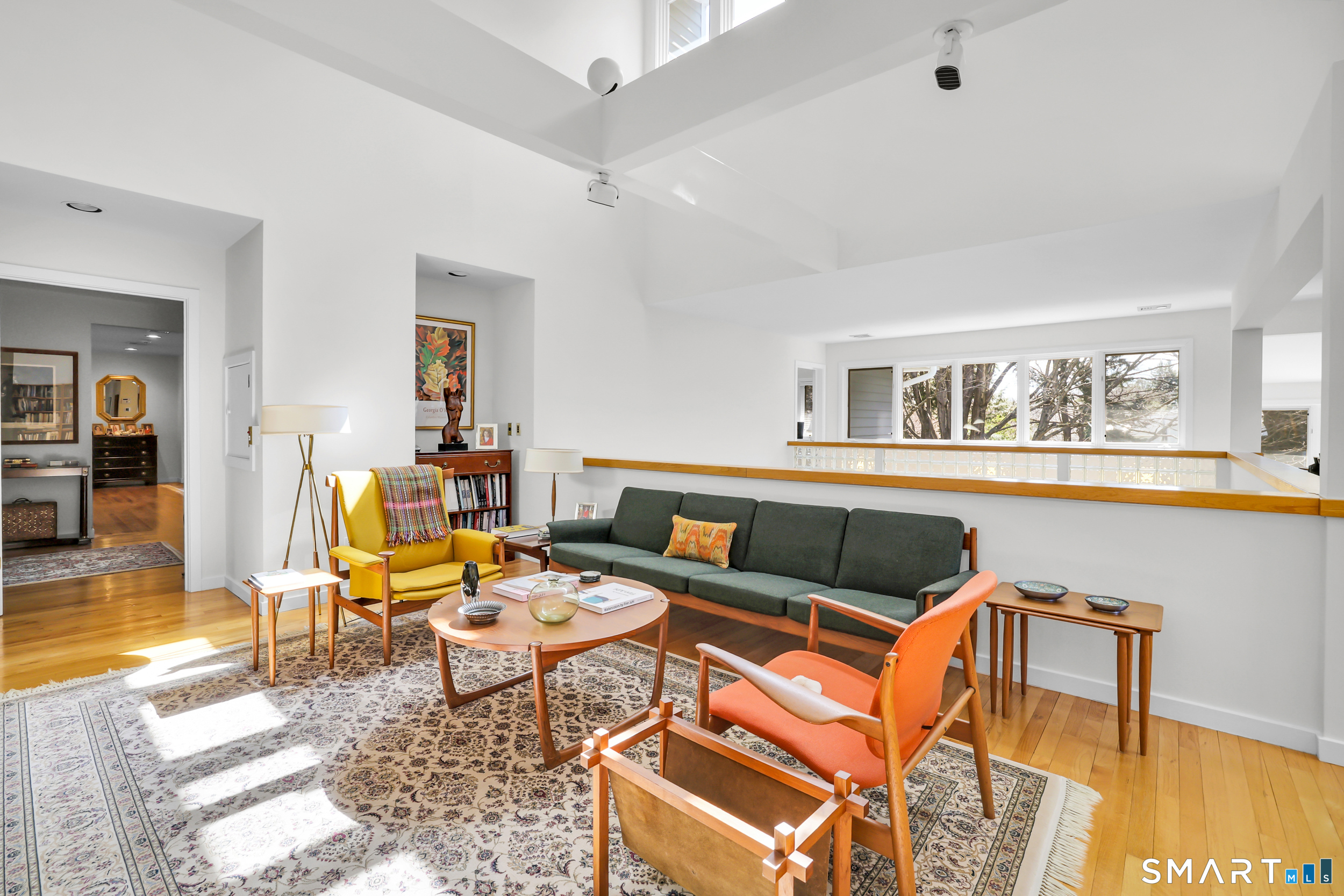 Nestled in the highly sought-after Old Orchard enclave of North Haven, this expanded 1930s Colonial seamlessly blends classic charm with a thoughtfully designed 1990s contemporary addition. Filled with natural light, the home features a stunning double-height great room and an expansive open-concept kitchen-complete with a large center island, abundant workspace, and an easy flow ideal for both everyday living and entertaining. Integrated audio wiring throughout supports Sonos or other whole-home sound systems. The second floor offers a spacious primary suite with en-suite bath, complemented by a separate study, a dedicated exercise room or additional office, and a private mezzanine-level family space overlooking the great room. Three additional bedrooms and two full baths-one en-suite-are thoughtfully positioned at the front of the home, providing excellent separation and privacy for family members and guests. The professionally designed grounds are equally impressive, showcasing formal gardens and expansive rear flower beds created by Keith Phipps of Carlton Gardens. An automatic irrigation system services the entire property for effortless upkeep. Recent mechanical upgrades include a new furnace (with a second existing unit), two new air filtration systems, two new humidification systems, and a new water heater. Additional features include a central vacuum system with a new motor, a dumbwaiter, and recently cleaned ductwork.