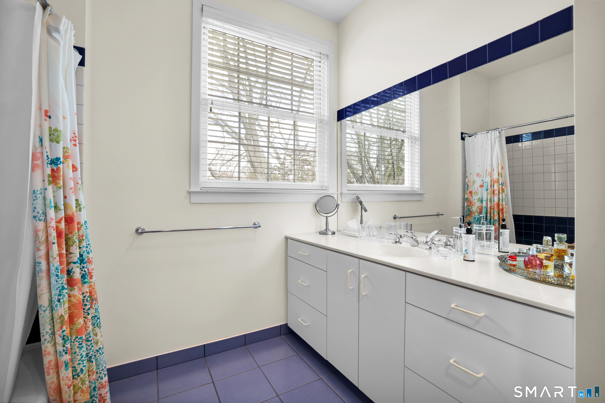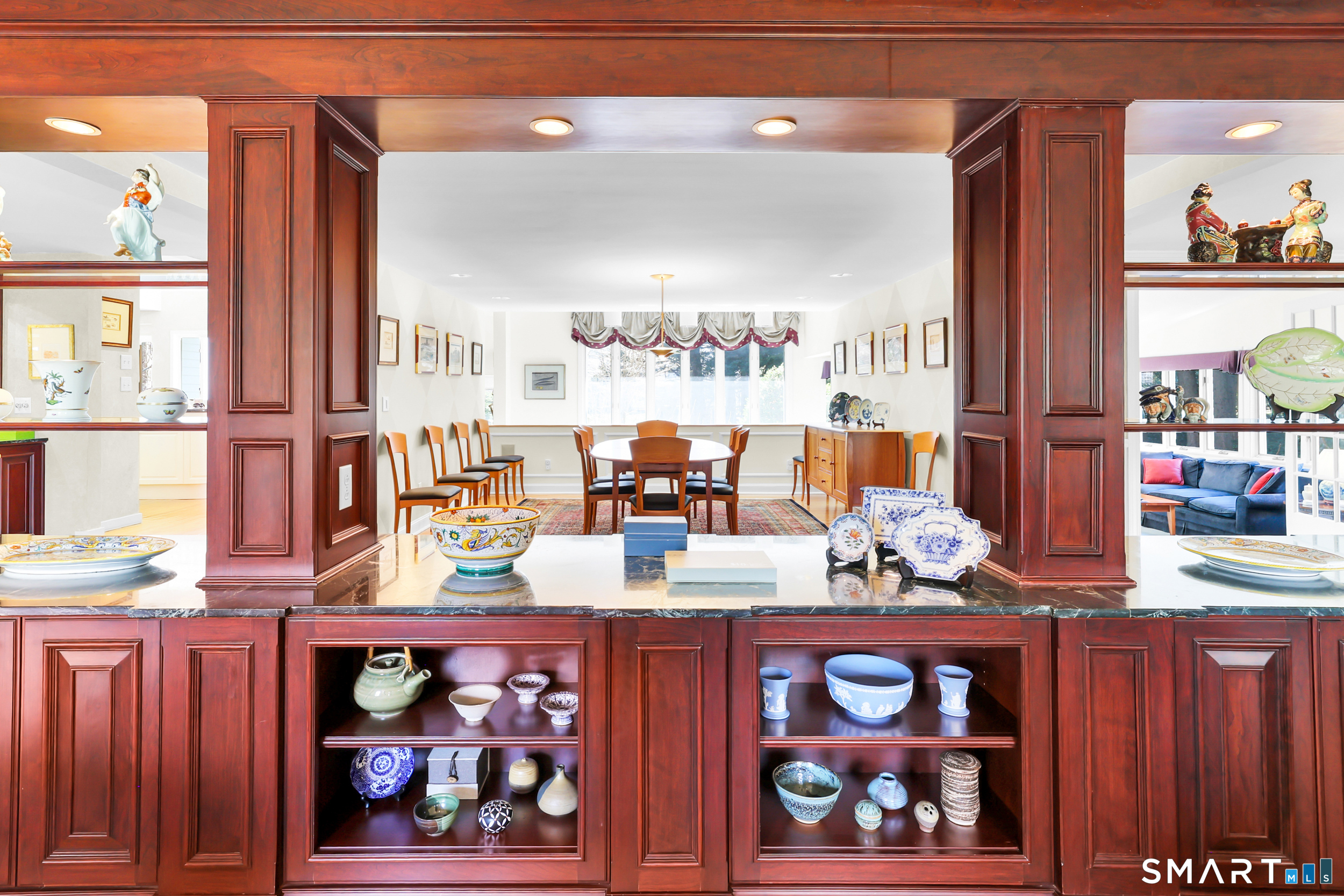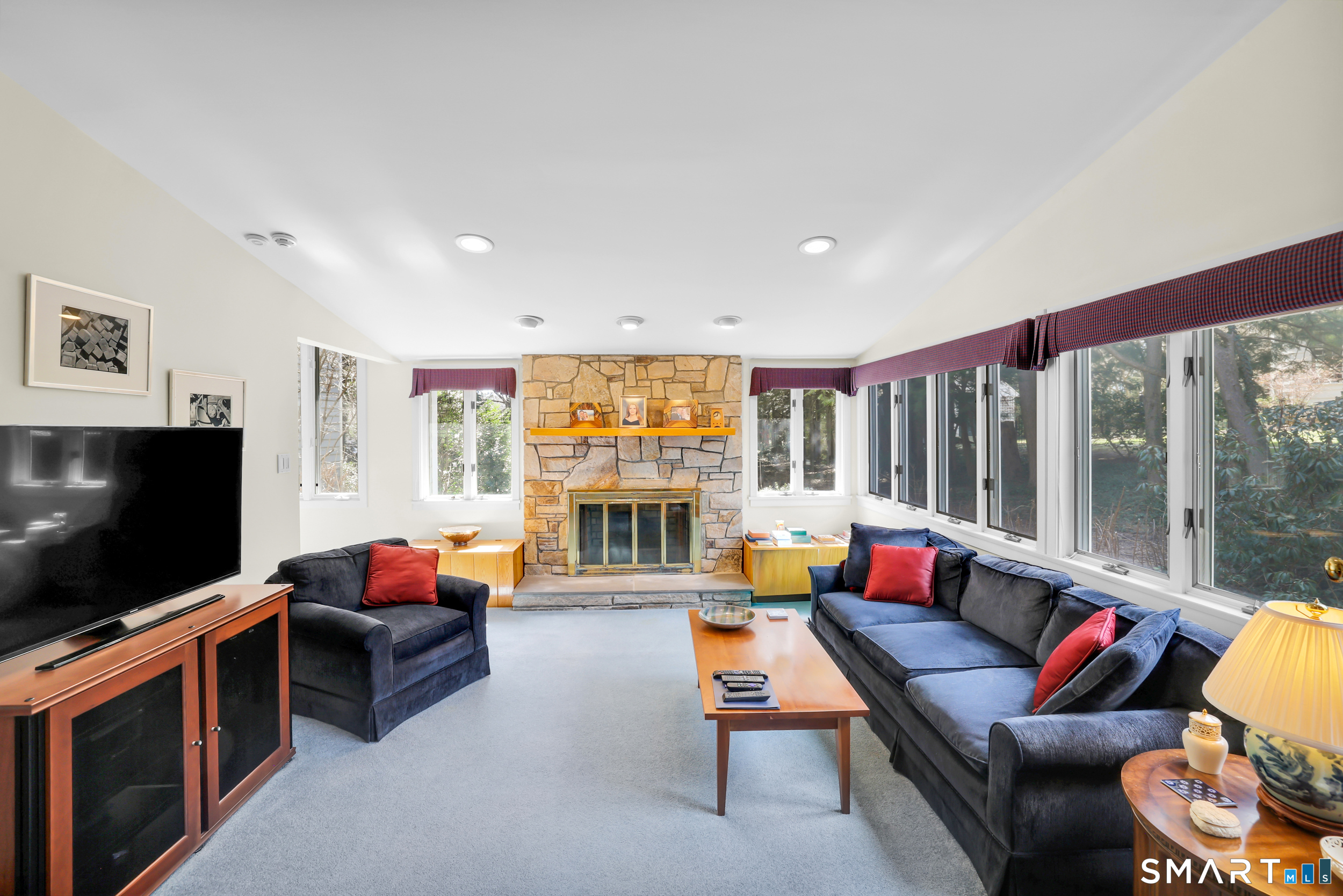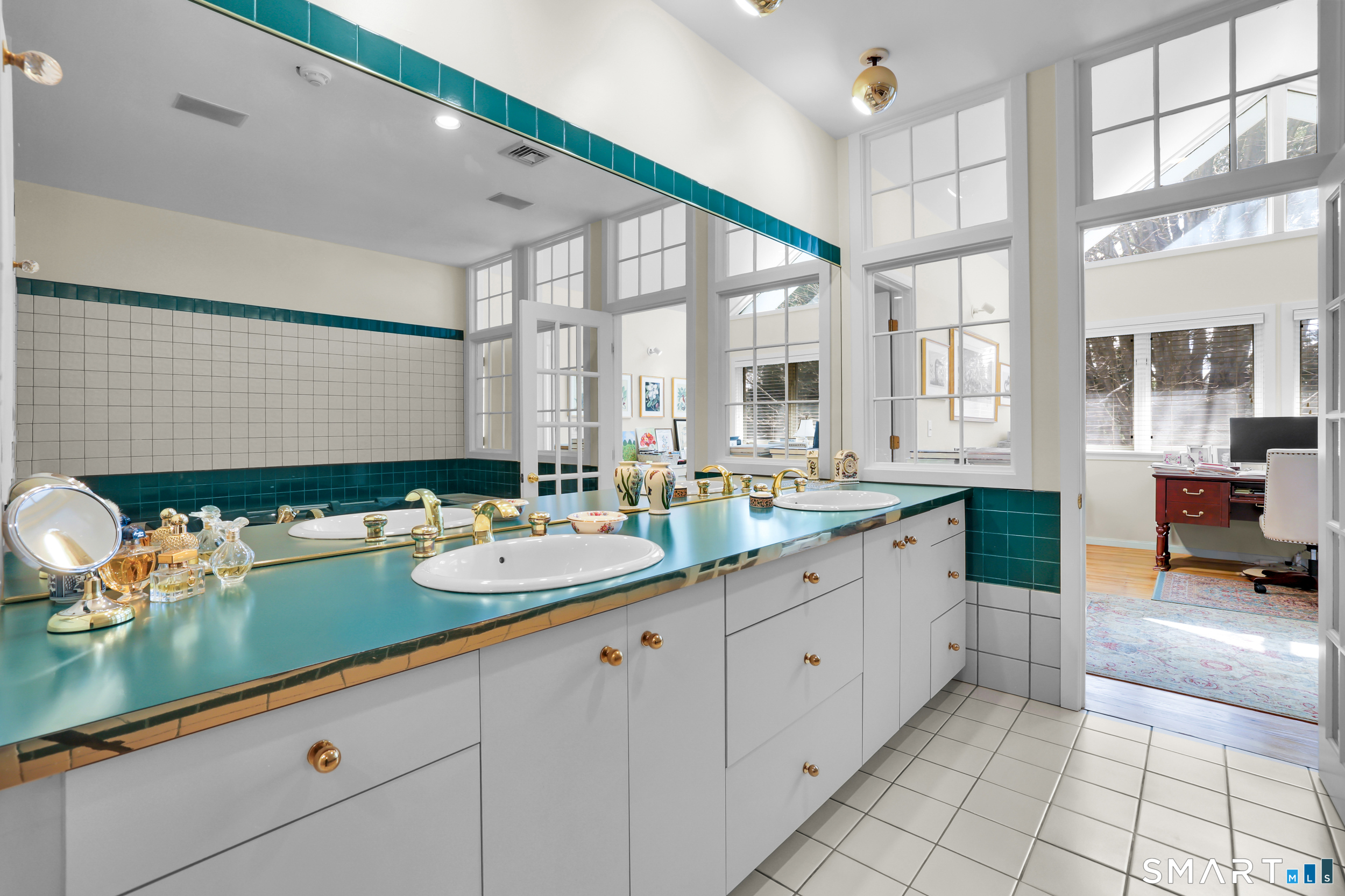 Nestled in the highly sought-after Old Orchard enclave of North Haven, this expanded 1930s Colonial seamlessly blends classic charm with a thoughtfully designed 1990s contemporary addition. Filled with natural light, the home features a stunning double-height great room and an expansive open-concept kitchen-complete with a large center island, abundant workspace, and an easy flow ideal for both everyday living and entertaining. Integrated audio wiring throughout supports Sonos or other whole-home sound systems. The second floor offers a spacious primary suite with en-suite bath, complemented by a separate study, a dedicated exercise room or additional office, and a private mezzanine-level family space overlooking the great room. Three additional bedrooms and two full baths-one en-suite-are thoughtfully positioned at the front of the home, providing excellent separation and privacy for family members and guests. The professionally designed grounds are equally impressive, showcasing formal gardens and expansive rear flower beds created by Keith Phipps of Carlton Gardens. An automatic irrigation system services the entire property for effortless upkeep. Recent mechanical upgrades include a new furnace (with a second existing unit), two new air filtration systems, two new humidification systems, and a new water heater. Additional features include a central vacuum system with a new motor, a dumbwaiter, and recently cleaned ductwork.
