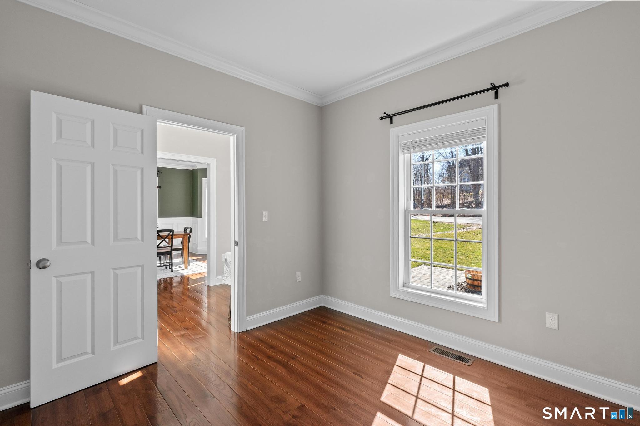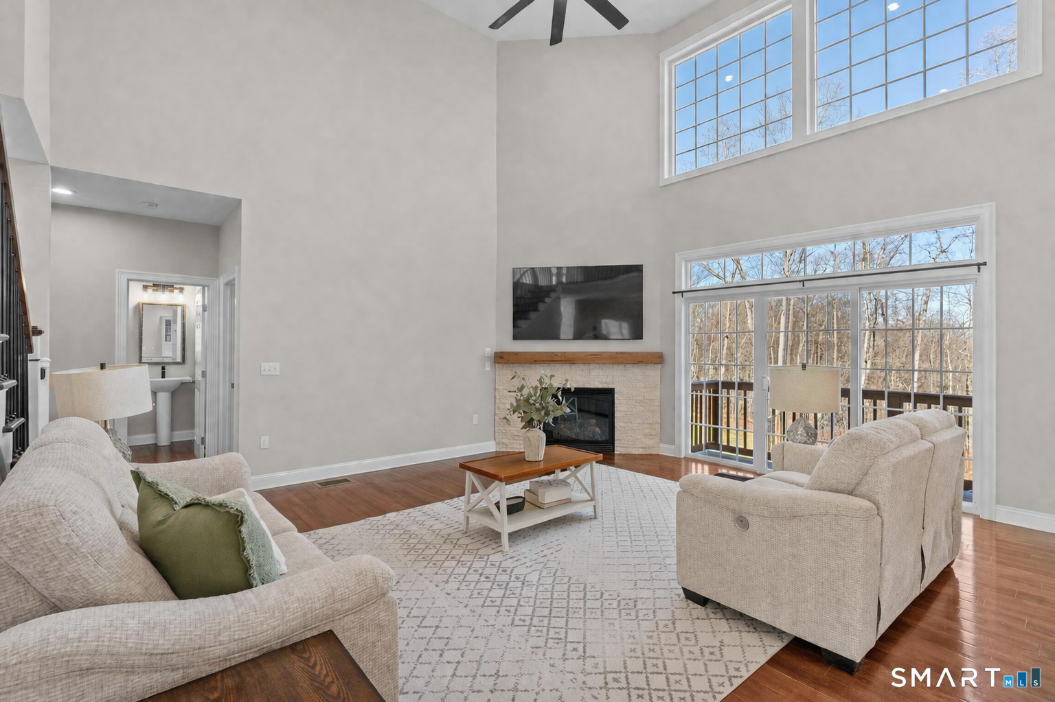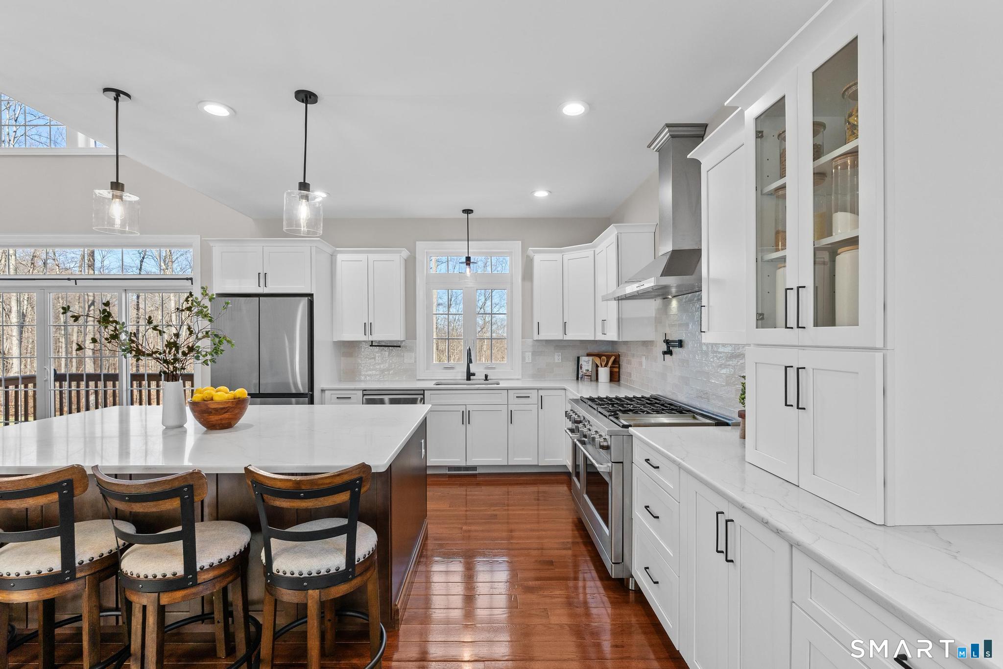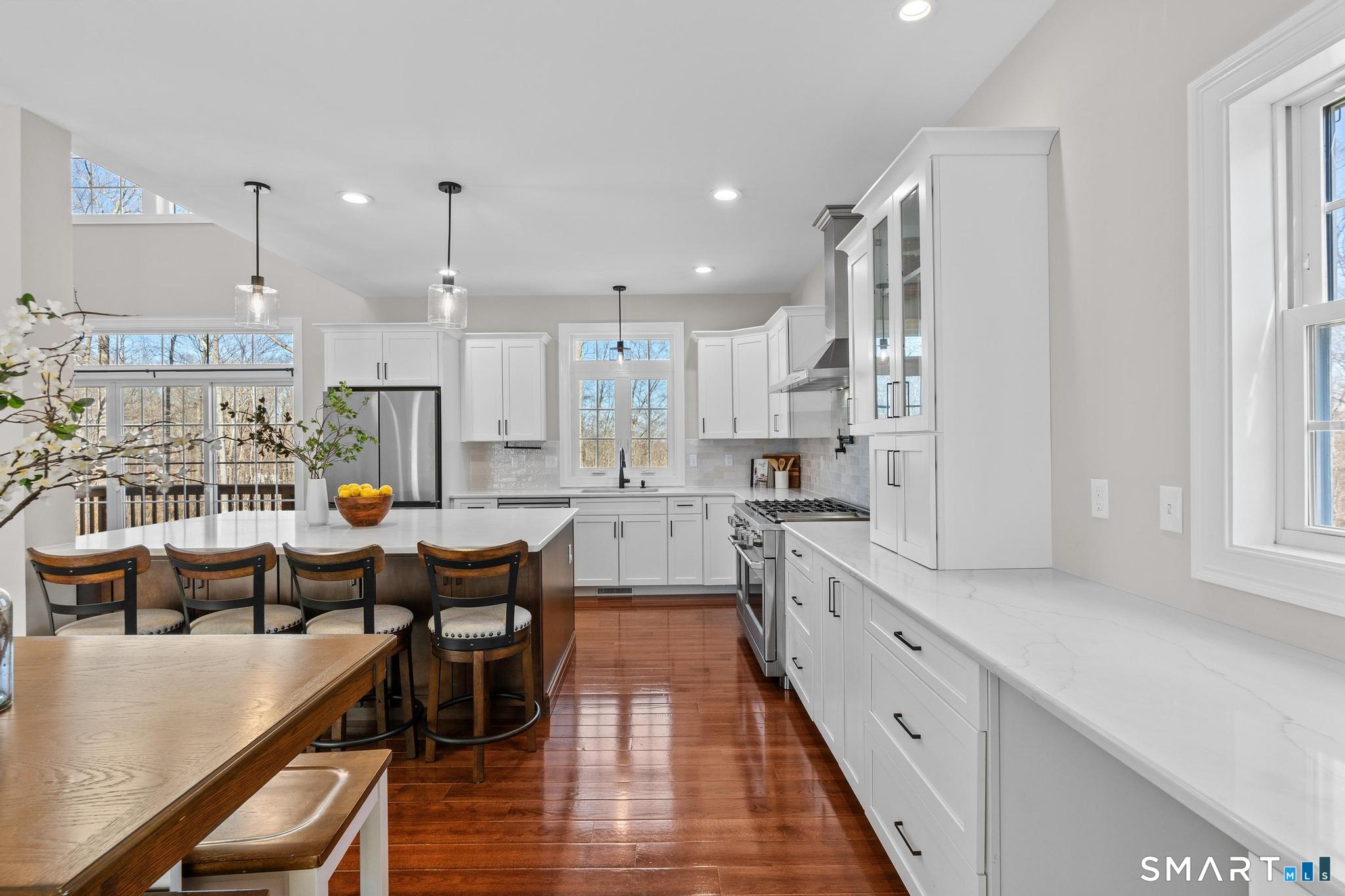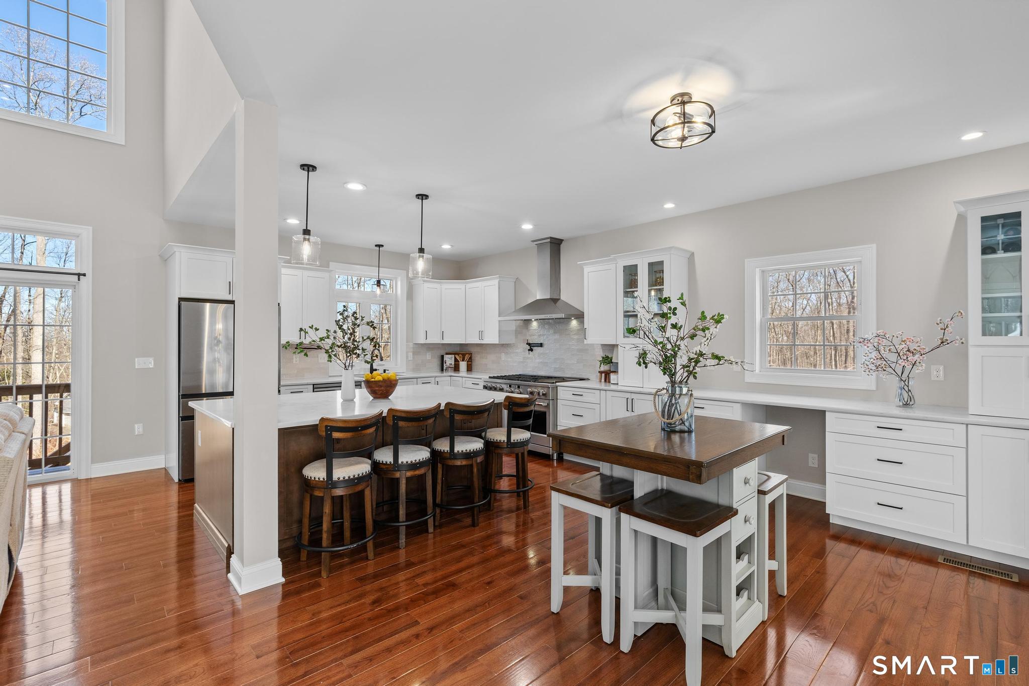 Privately set at the end of a quiet cul-de-sac on 1+ picturesque acres, this exceptional 2022-built residence offers a rare combination of privacy, scenic surroundings & a true neighborhood setting. Known for its breathtaking sunsets, the property enjoys a peaceful backdrop while remaining part of a desirable East Hampton community. Inside, the home is filled with natural light, high ceilings & an intentional layout designed for both everyday living & effortless entertaining. The impressive 2 story family room anchored by a dramatic stone fireplace, creates a striking focal point & inviting gathering space. The expansive kitchen is designed to be the heart of the home, offering extensive cabinetry, abundant storage & an impressive oversized island, providing both beauty & function, while opening seamlessly to the surrounding living spaces. A dedicated dining room with tray ceiling provides an elegant setting for hosting, while a 1st floor study or flexible living space offers the perfect environment for a home office, library, or additional sitting room. The 1st floor primary suite serves as a private retreat with generous proportions & a beautifully appointed bath. Upstairs, 3 additional bedrooms provide comfortable accommodations for family or guests. Throughout the main living areas, hardwood flooring, expansive windows & soaring ceilings enhance the sense of space & light, while a rear tucked staircase adds both convenience & thoughtful design. HIGHEST AND BEST DUE 4/12-